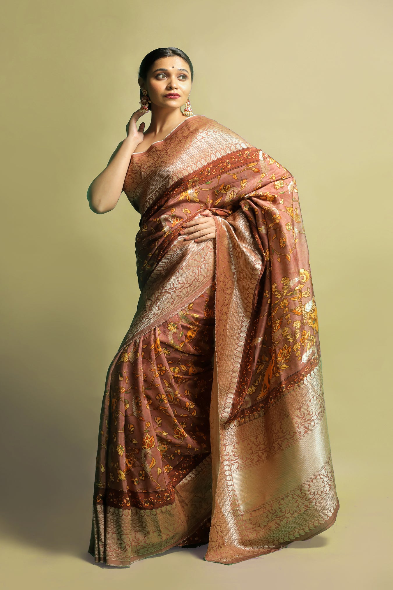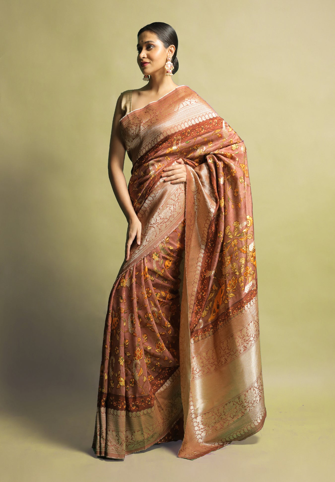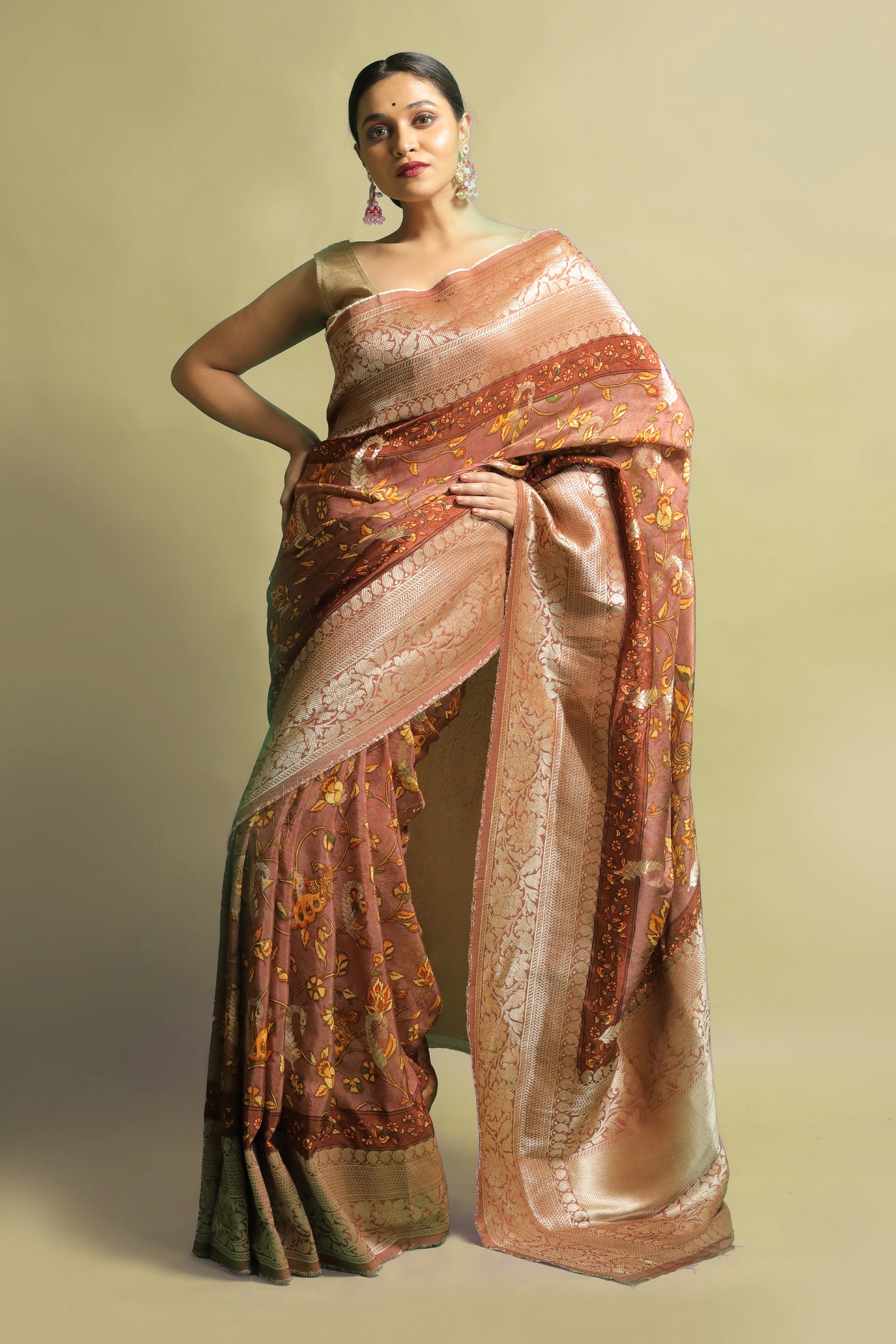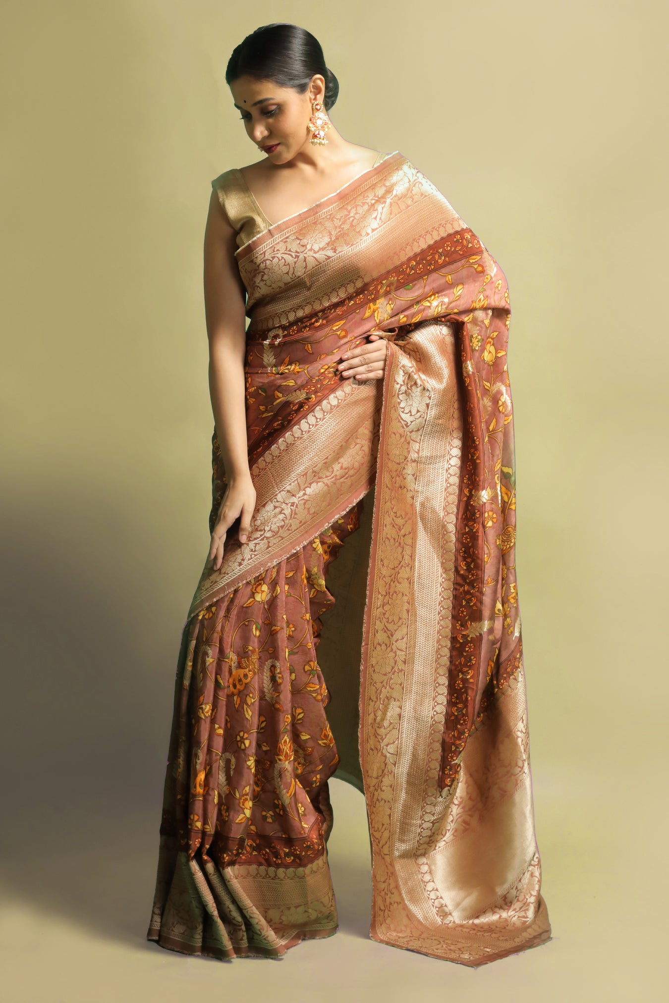 Colour: BrownFabric: KHADDI ZARI SILKPattern and print: Step into elegance with our Khaddi Silk Saree. Adorned with delicate zari work, it radiates regal charm. The soft fabric gracefully envelops feminine curves, while traditional kalamkari prints add a touch of heritage. Perfect for celebrating Indian artistry, this saree's detailed pallu and playful tassels complete the look with finesse. Embrace the beauty of tradition in every fold."Care instructions:Â Dry wash