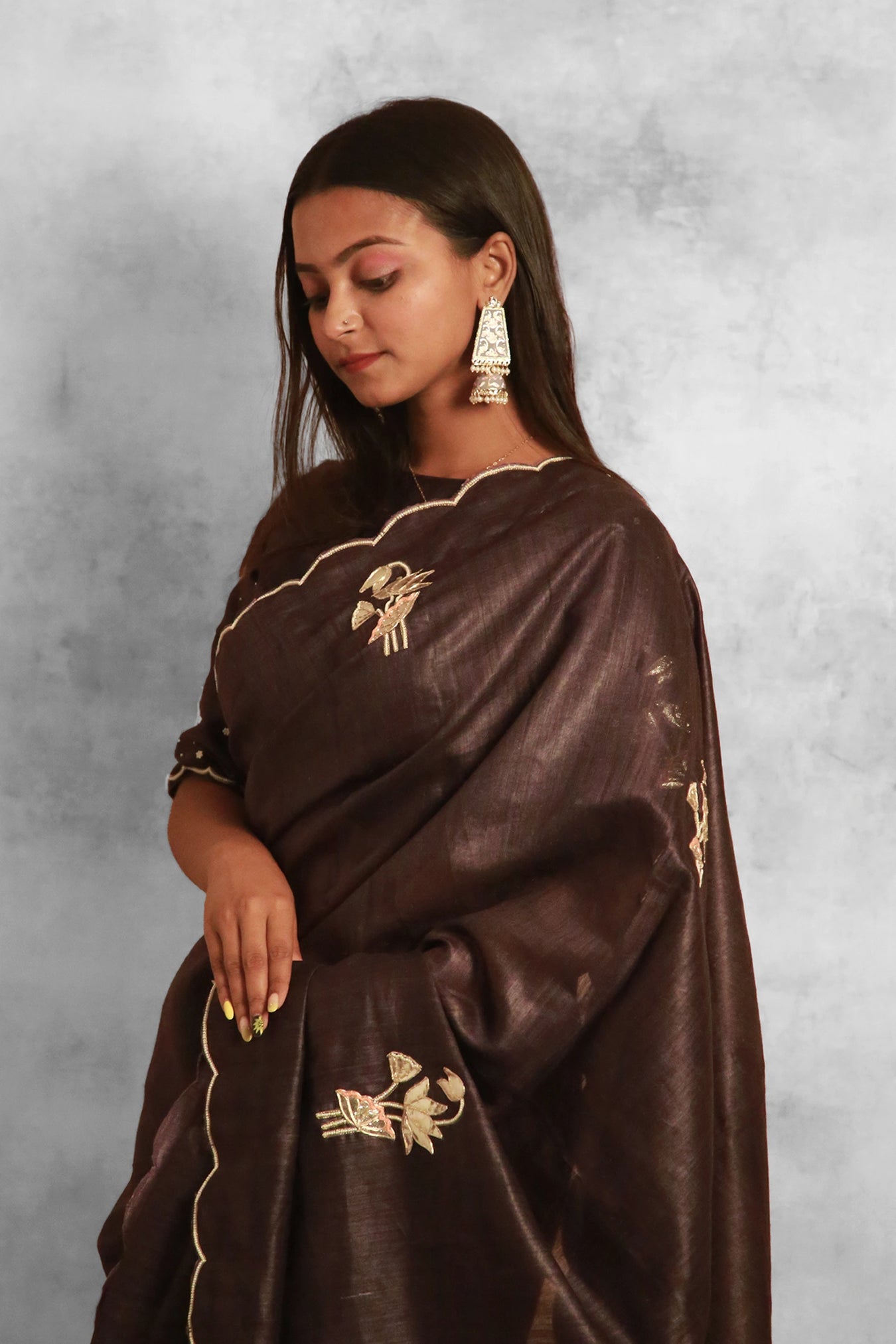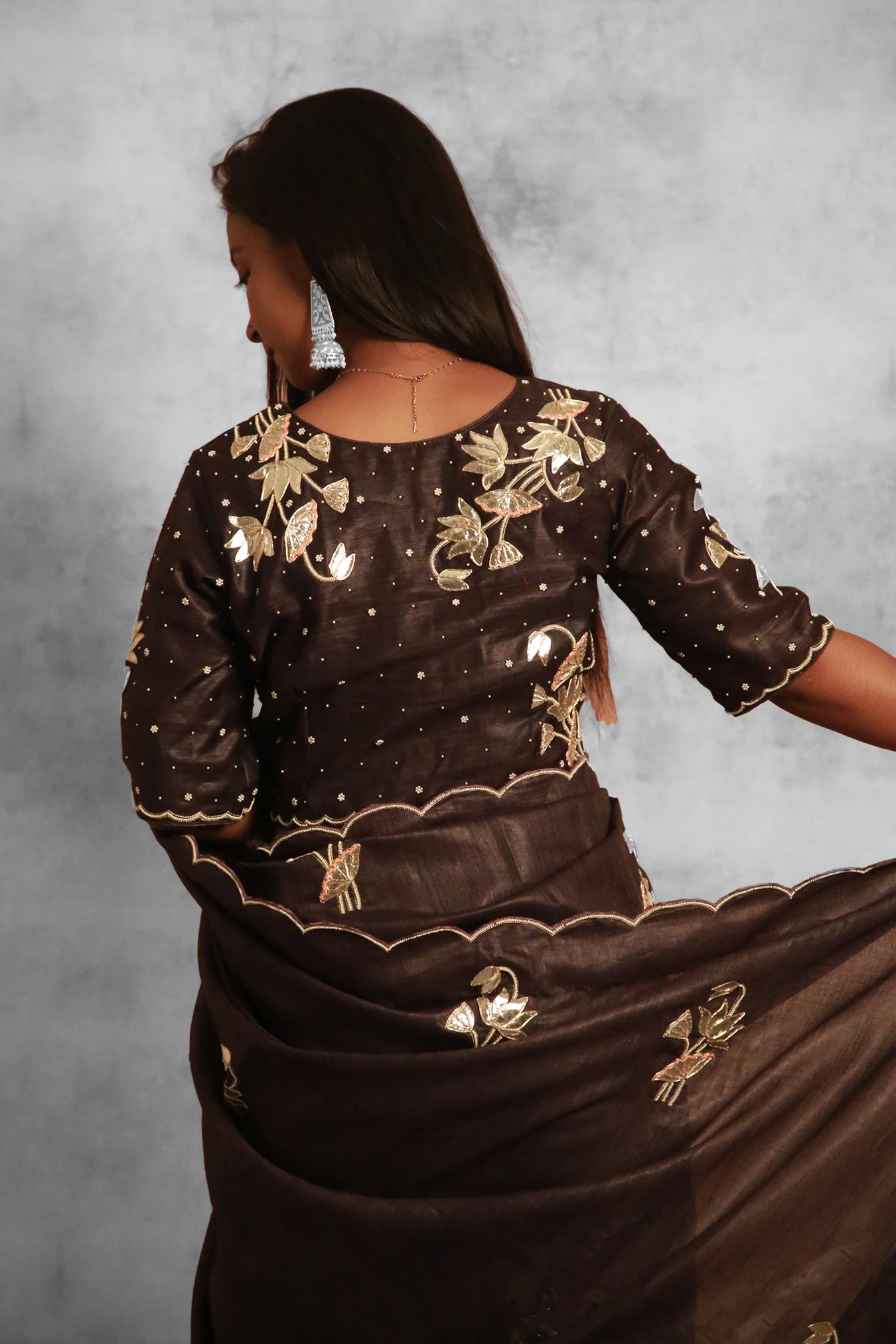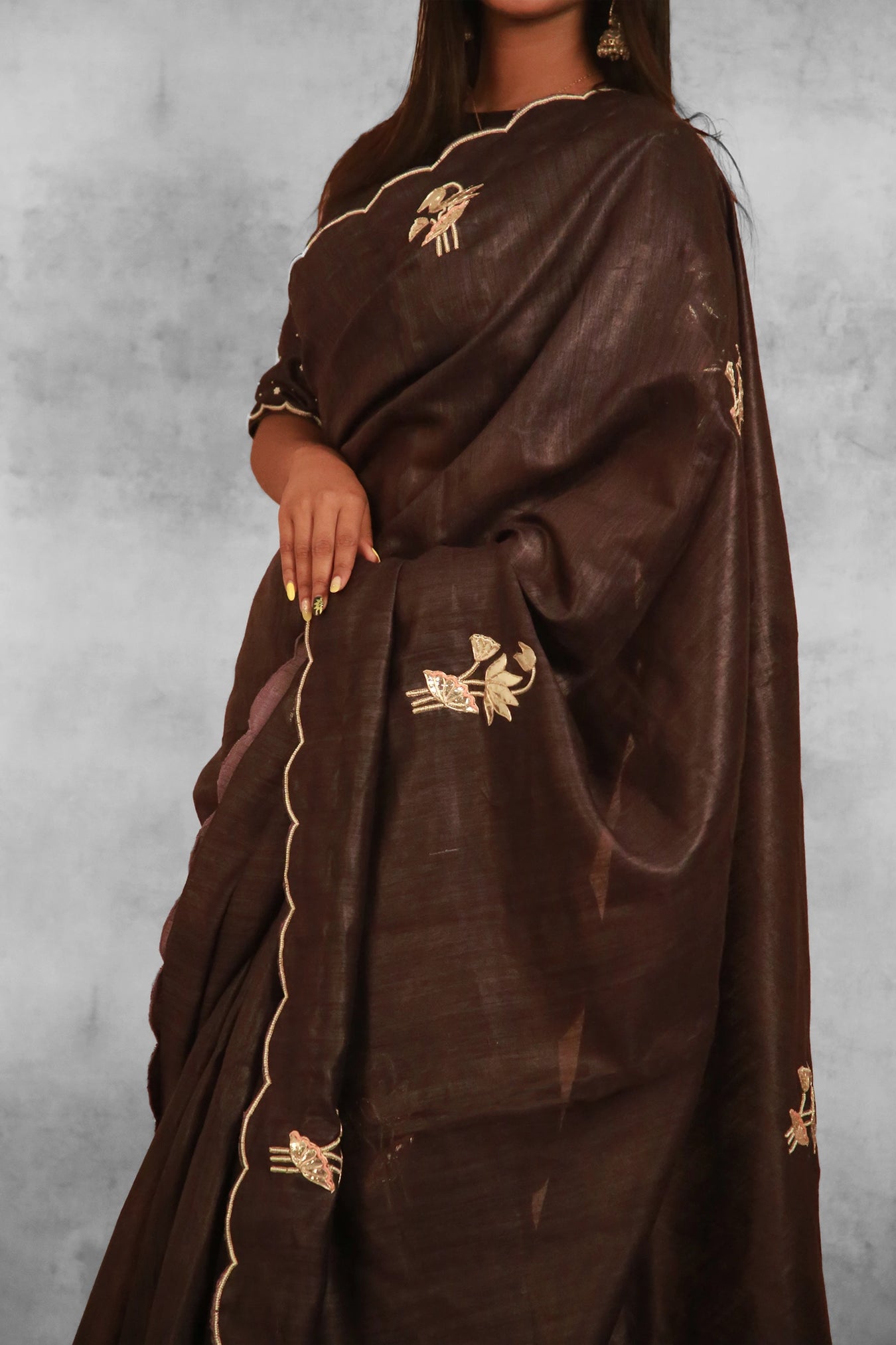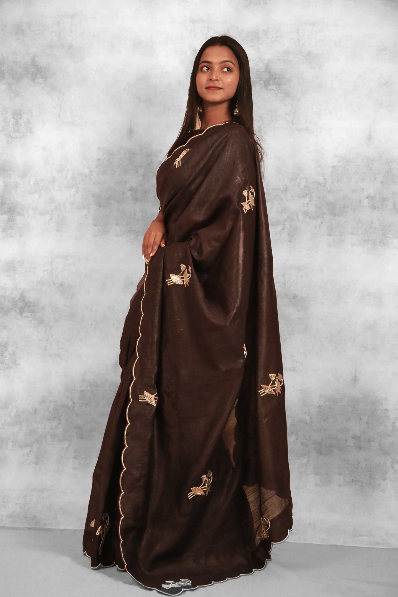 Size: Saree: 5.50Mtr Blouse: 0.80MtrFabric: Tasar SilkColor: BrownPattern and Print: Zardozi hand work all over Lotus buta of Gota Applique in all over body with ready blouse embroidedSilk Purity: Pure TasarPack Contains: 1 Saree, 1 BlouseCare Instructions: Dry wash