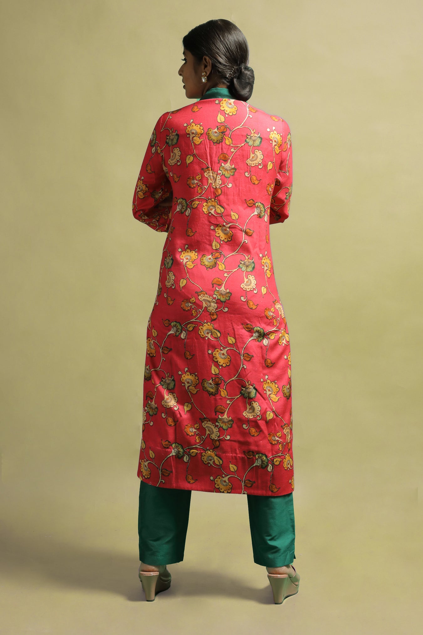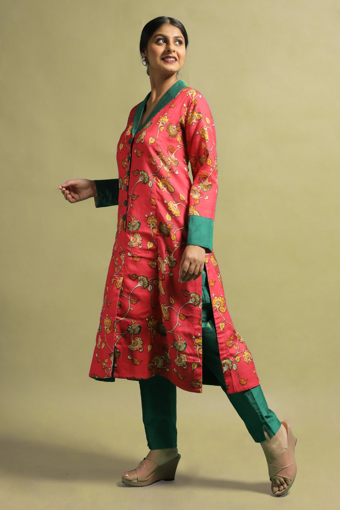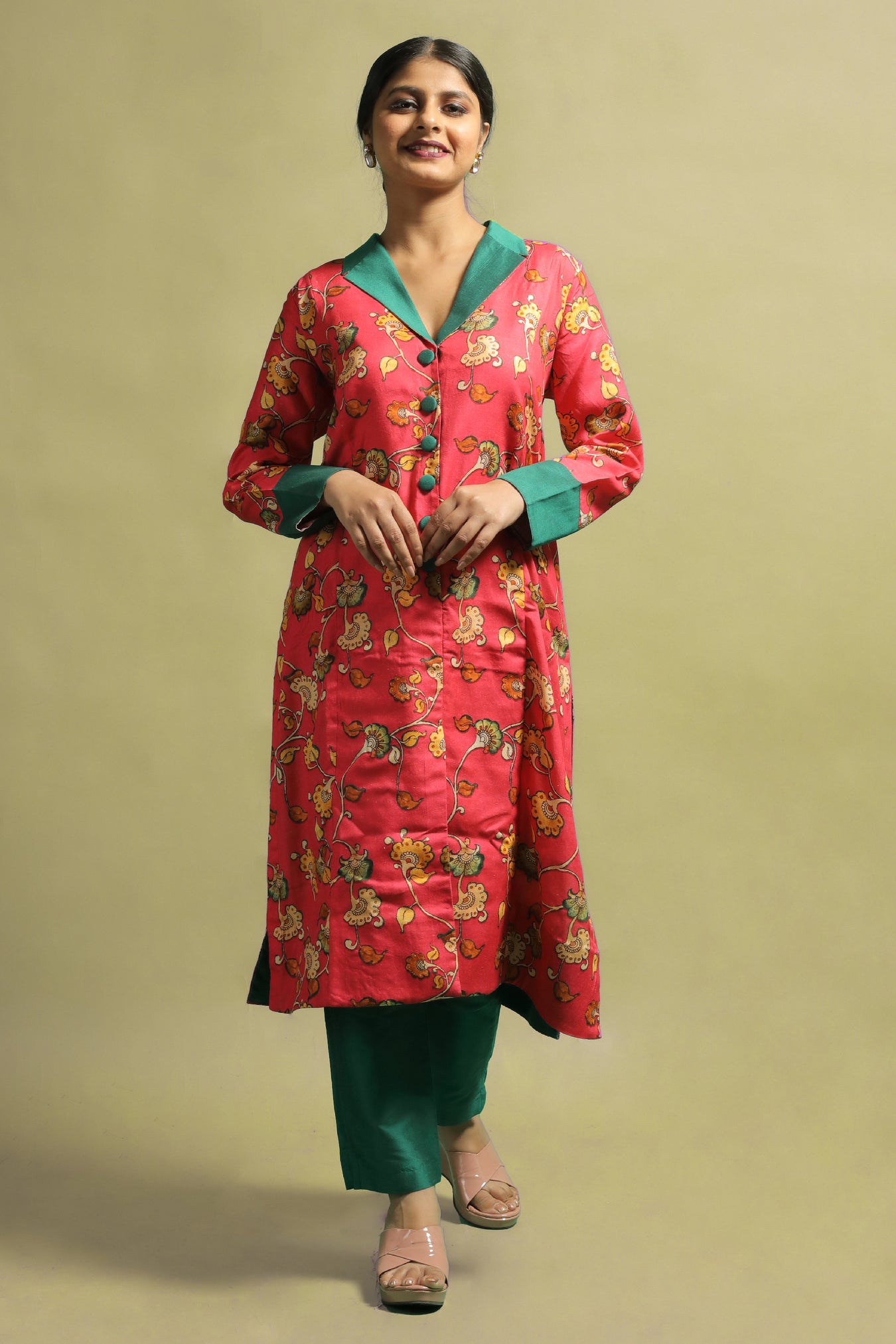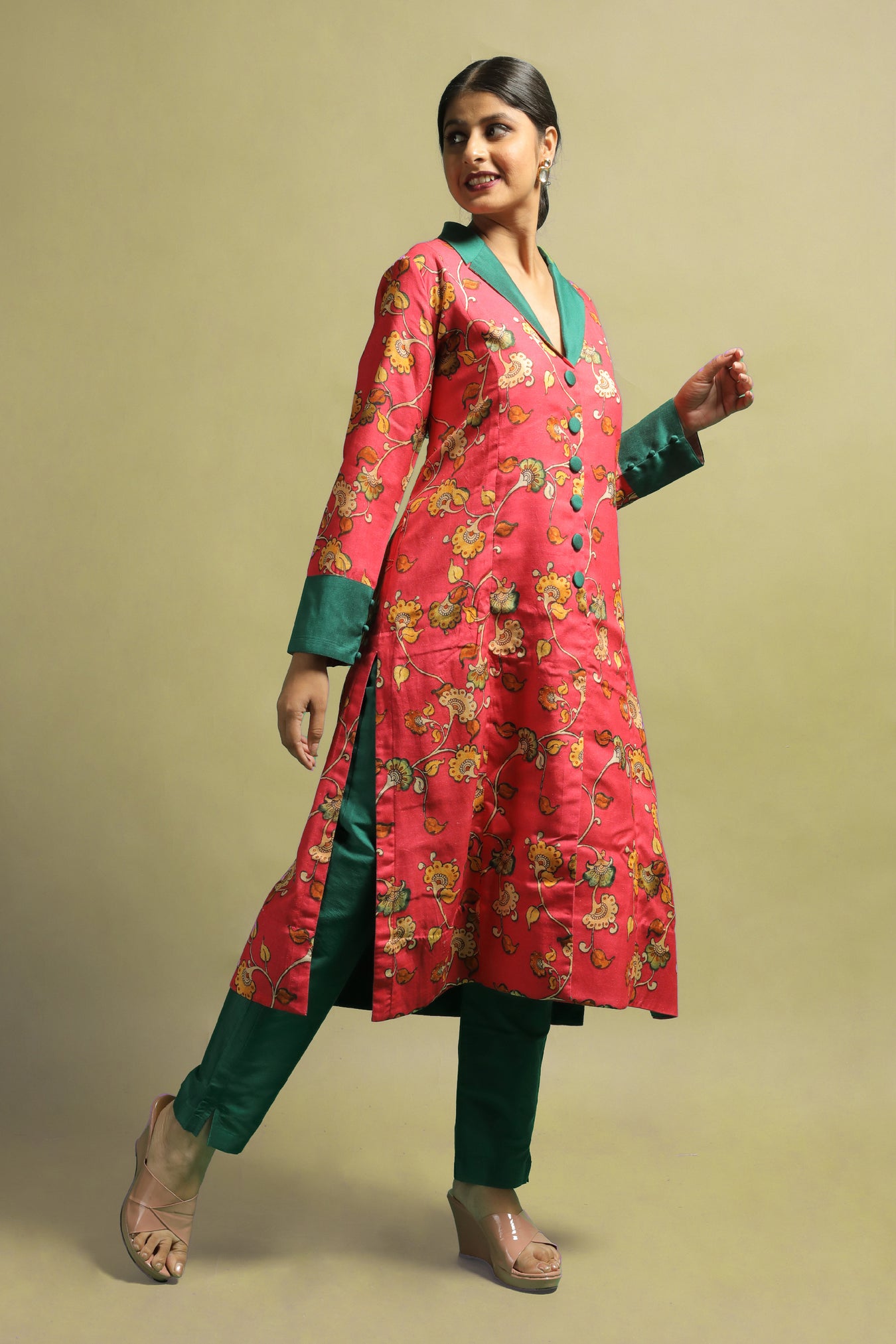 Cotton fabric was transformed into a sophisticated ethnic kurti. With its stylized Kalamkari floral motifs printed in pastel tones on a bright vibrant base, the piece makes a statement while also adding a touch of elegance and authenticity. The pastel toned motifs on a bold bright shade make this piece one-of-a-kind. The piece is highlighted by a V-shaped neckline, long cuffed sleeves, and a sailor collar. The collar and cuffs are a contrasting green color. Own and style this piece to highlight your inner beauty and elegance, as well as to flaunt the traditional look with confidence and pride.
