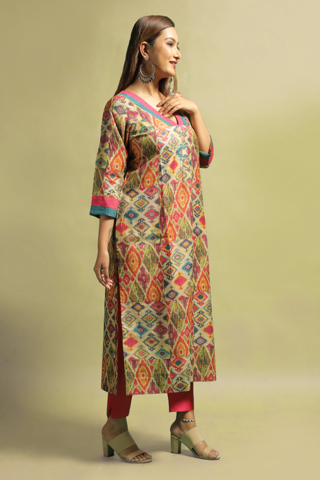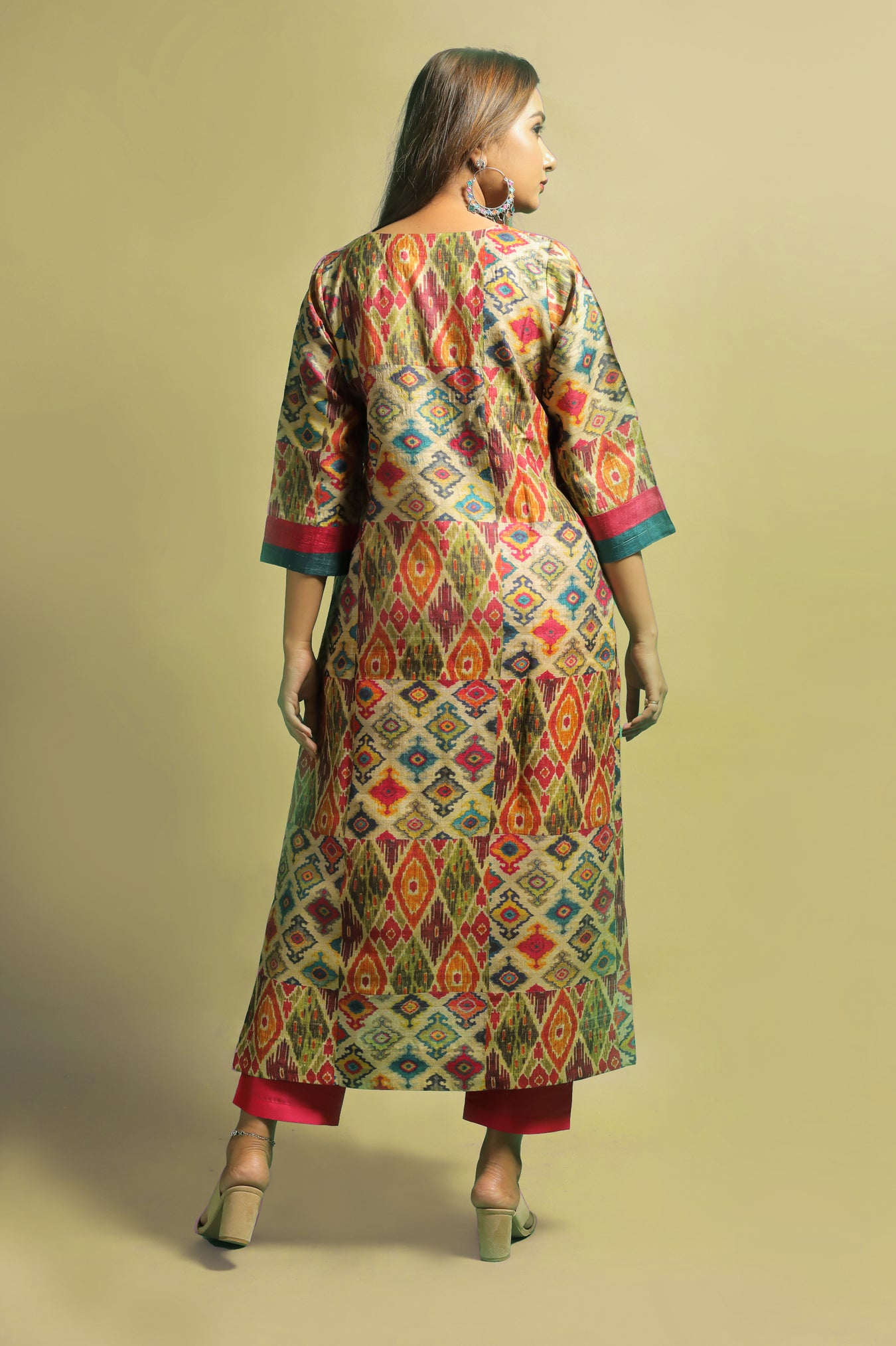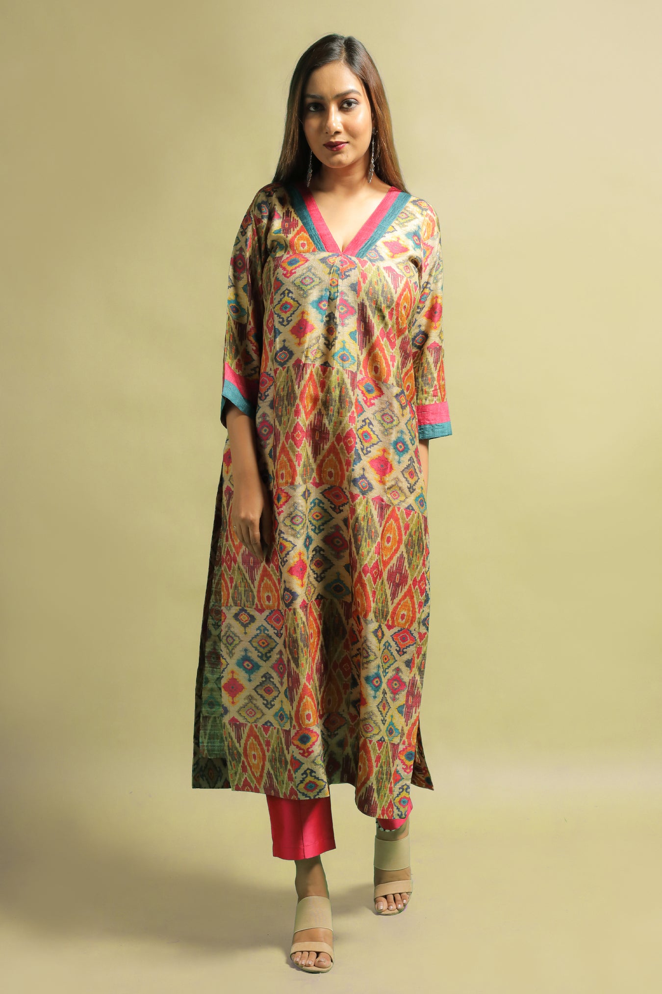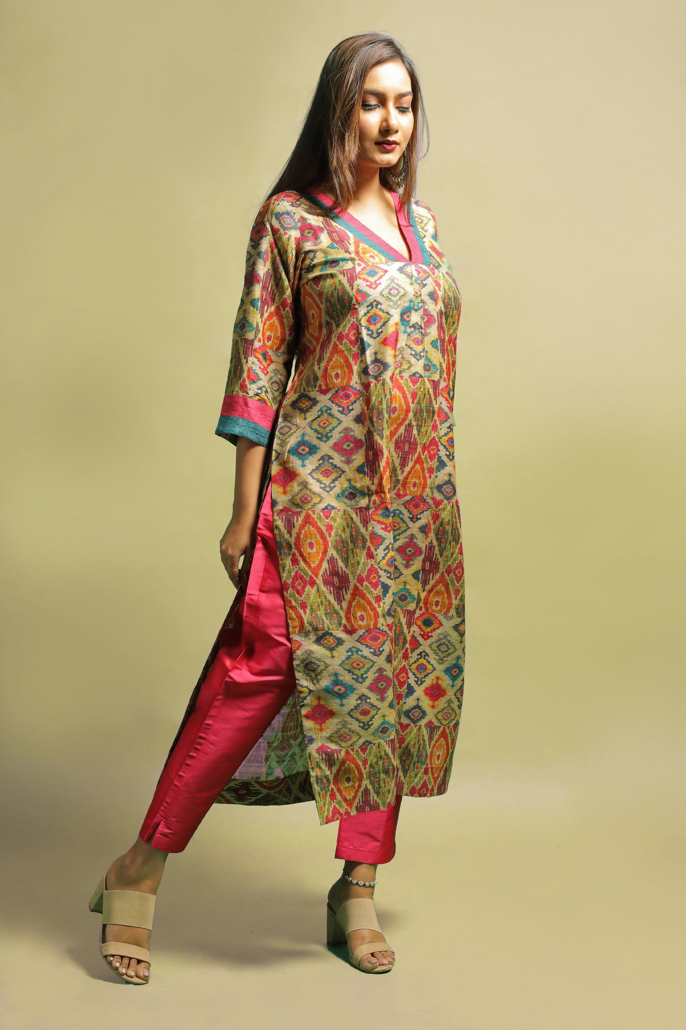Tussar fabric transformed into an elegant ethnic kurti. The piece sets a statement look with it's traditional Ikat motifs printed in colorful tones, adding a touch of contemporisation. Bright colorful motifs with a subtle shine makes this piece unique. Contrasting bright hued stripes done on the sleeves and a V shaped neckline, sets the whole look apart. Own this piece and style it to highlight your inner beauty and elegance and flaunt the traditional look with confidence and pride.