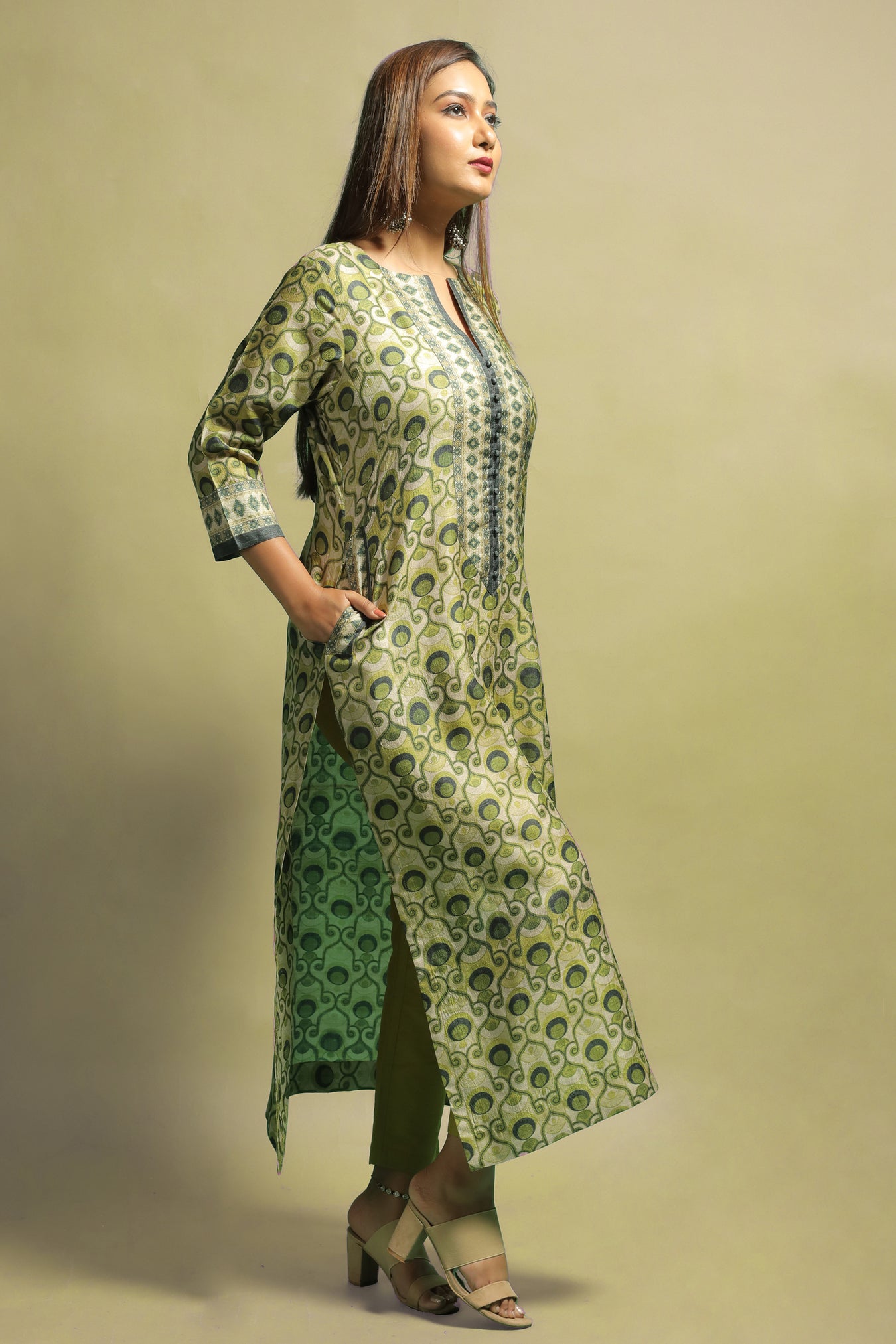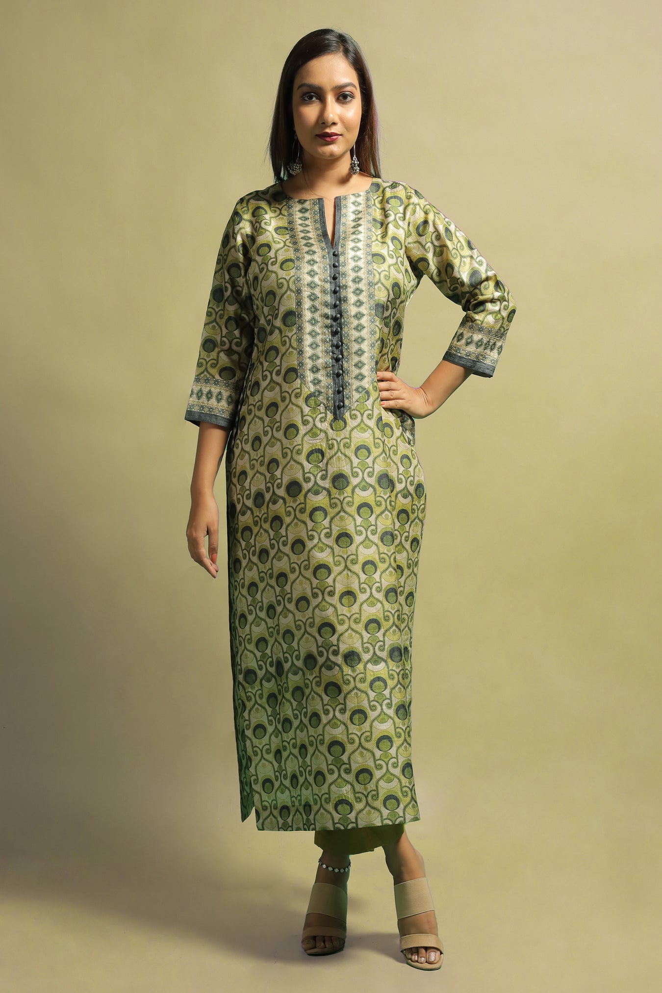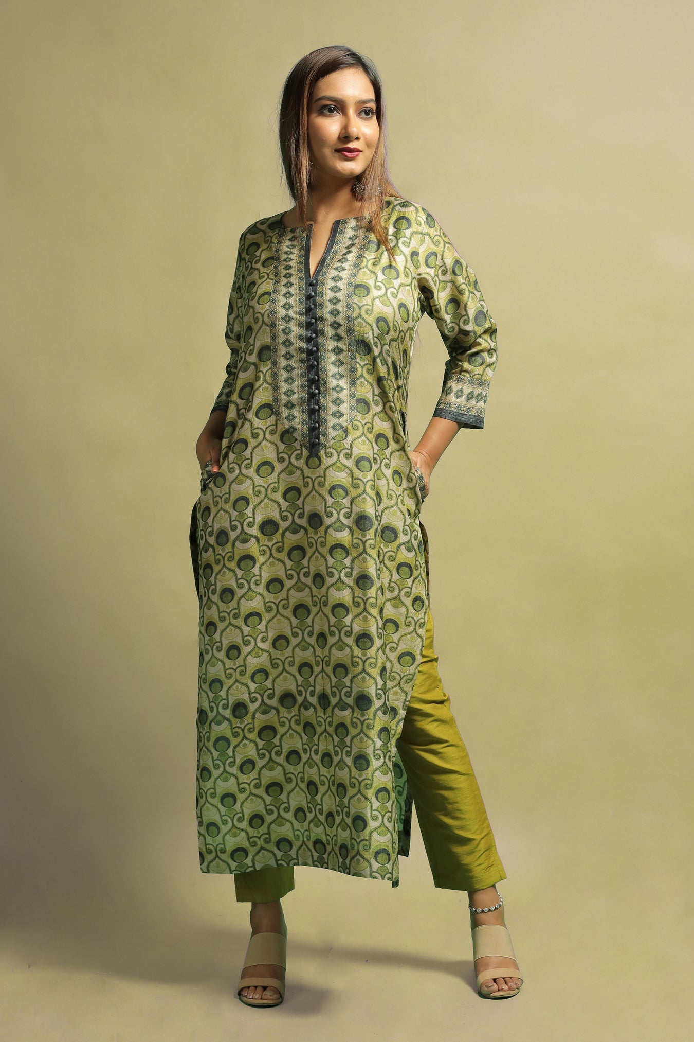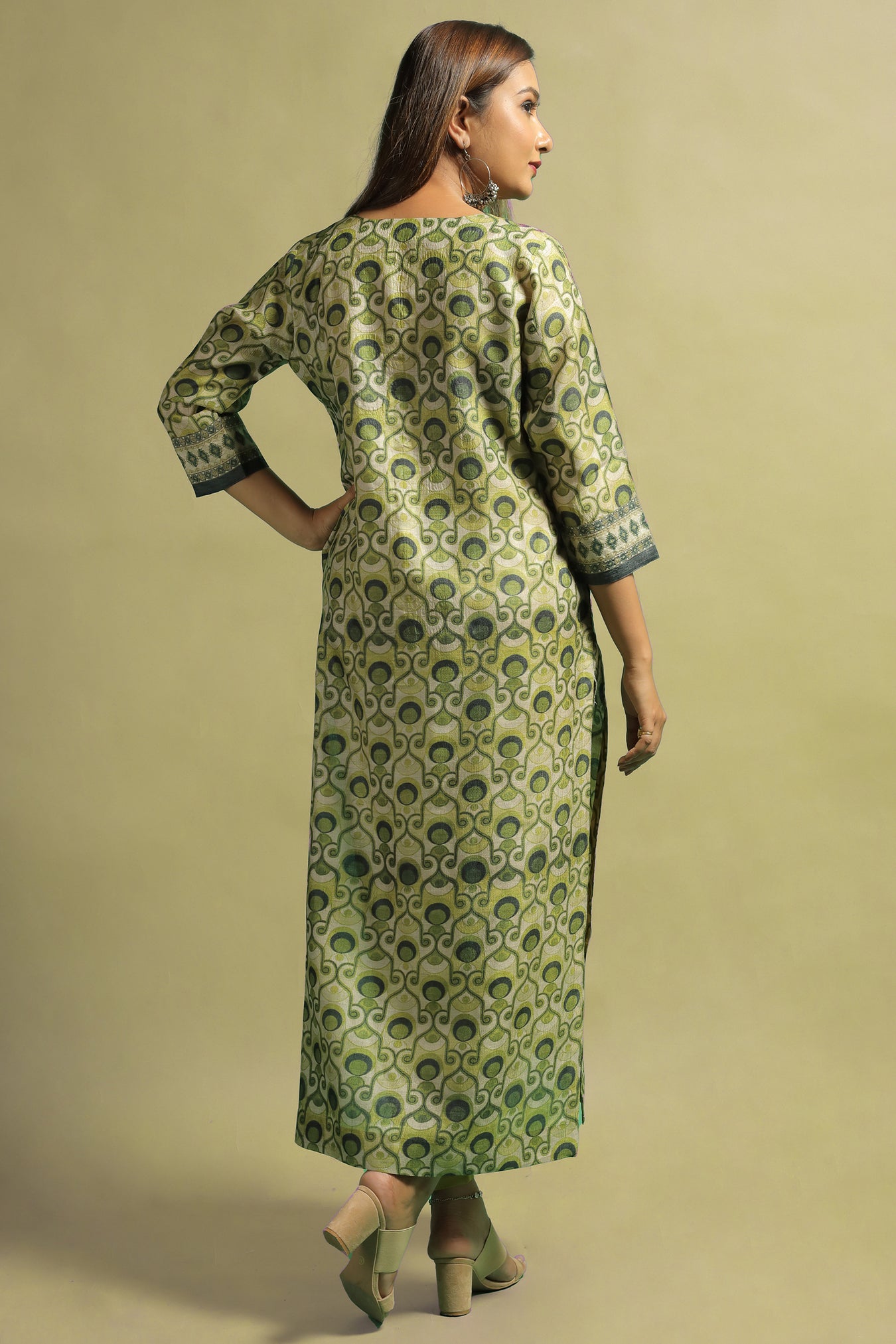A sophisticated ethnic kurti was created using tussar fabric. The garment makes a statement while also bringing a sense of refinement and authenticity with its traditional Geometric designs printed in earthy tones. This necklace is one-of-a-kind because of the subtle toned designs with a sheen. The neckline is adorned with detailed, delicate design, which sets the outfit apart. Own and dress this piece to bring out your inner beauty and elegance, as well as to proudly wear the traditional appearance.