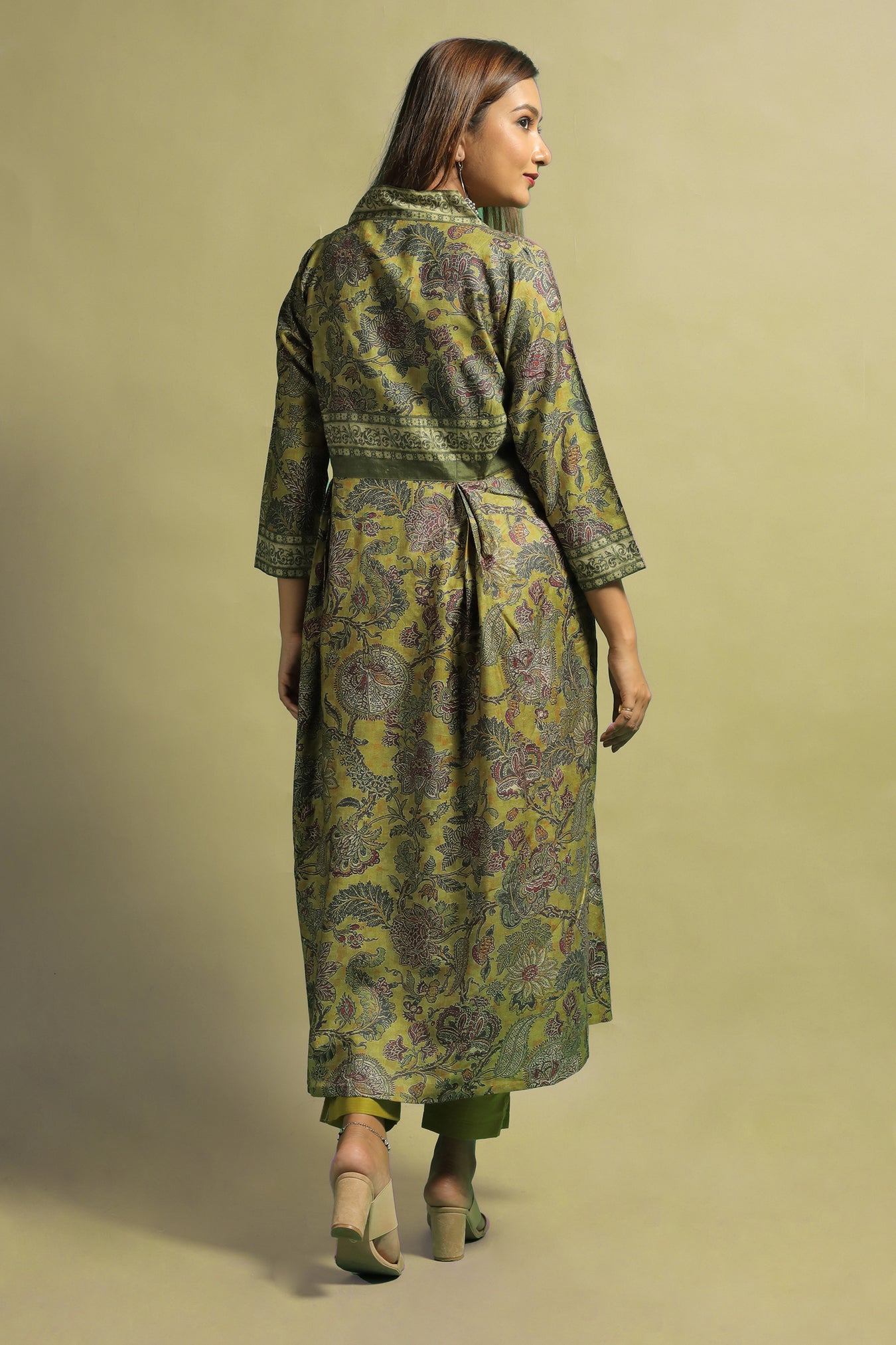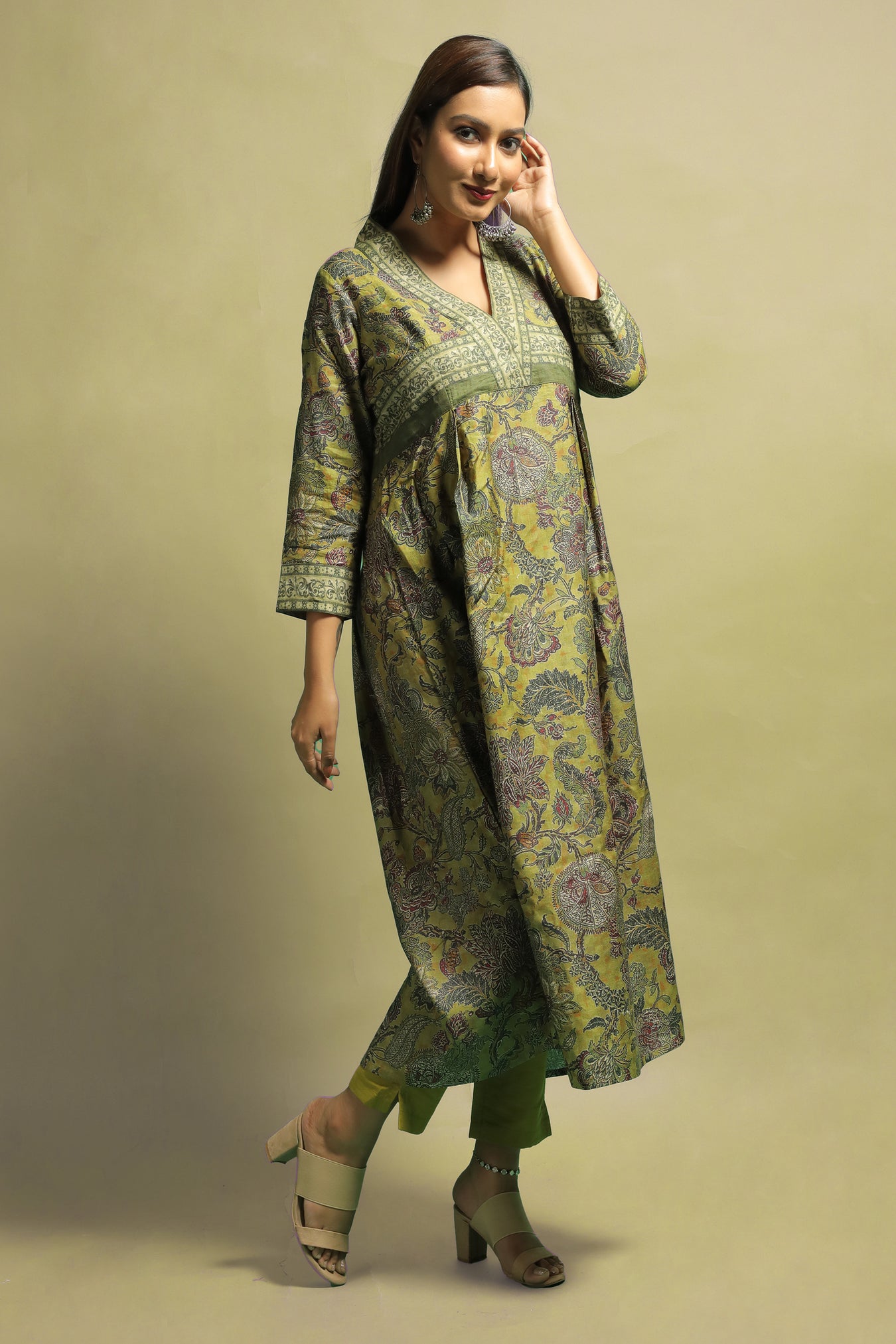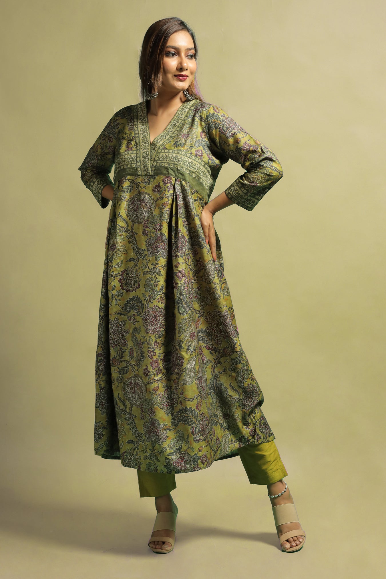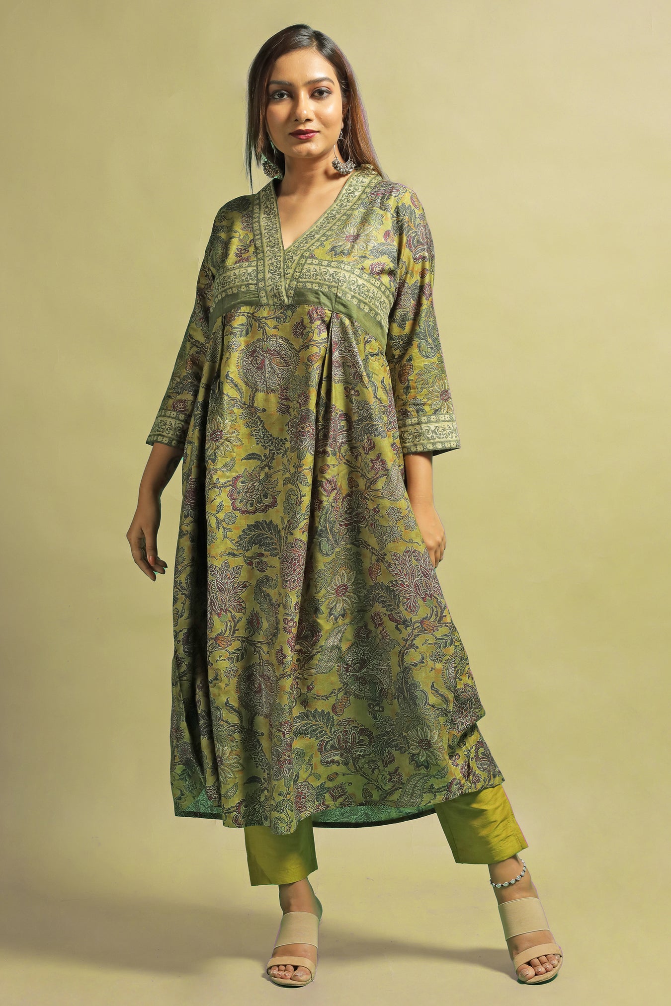 A sophisticated ethnic kurti was created using tussar fabric. The garment makes a statement while also bringing a sense of refinement and authenticity with its traditional floral motifs printed in an earthy tone on a pastel contrasting tint. This artwork is one-of-a-kind due to the subtle toned designs with a gleam. The kurti's style is elevated by its V-shaped neckline. The piece's modern style is complemented by its long sleeves and wide border. The front of the piece has a unique pattern that gives it a fresh appeal. Own and style this piece to bring out your inner beauty and elegance, as well as to confidently and proudly display the traditional appearance.
