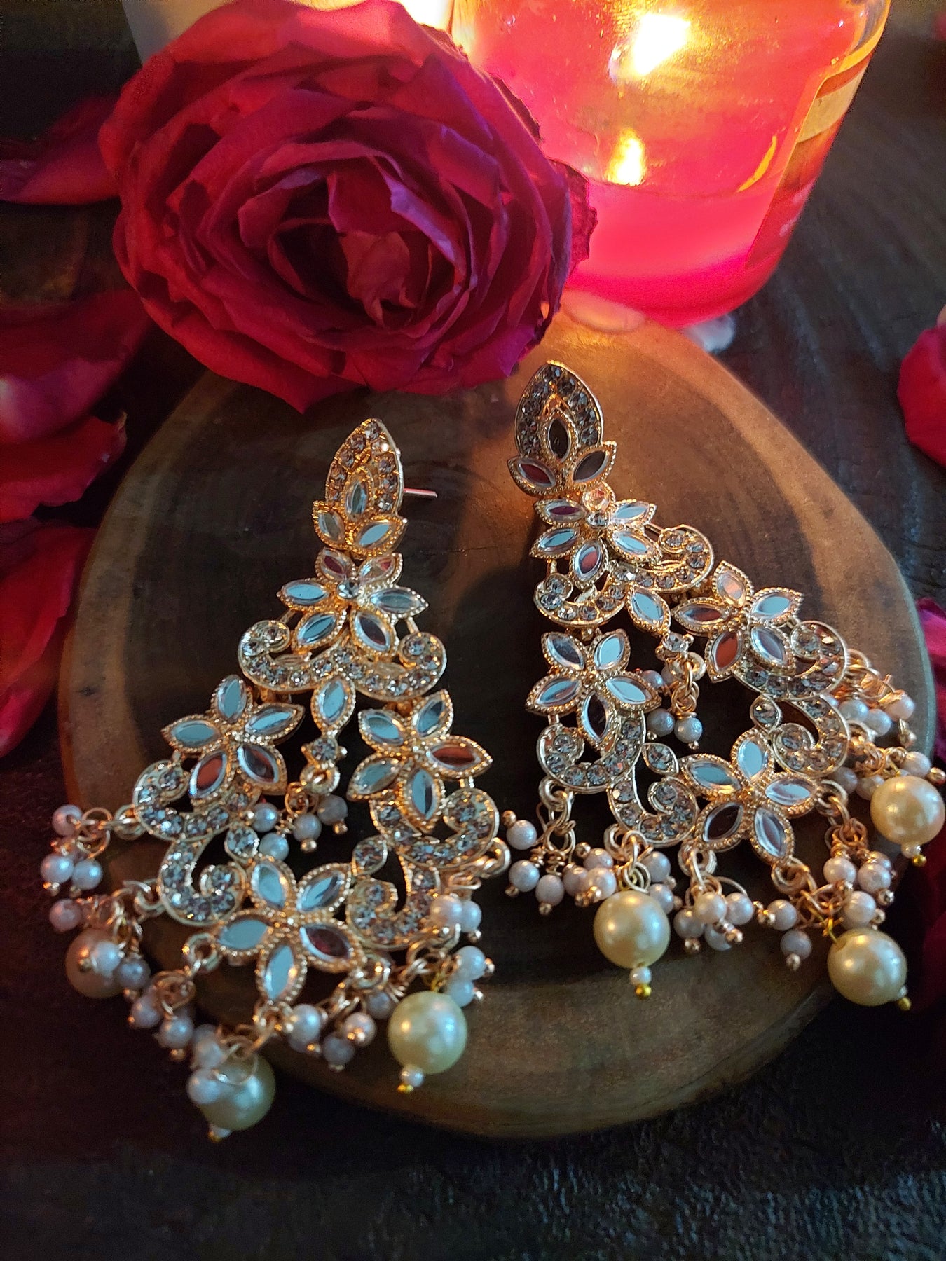 White beaded, traditional layered kundan earrings with a gold finish. A regal-style wedding earring that adds bling to your appearance and draws attention to your ensemble.