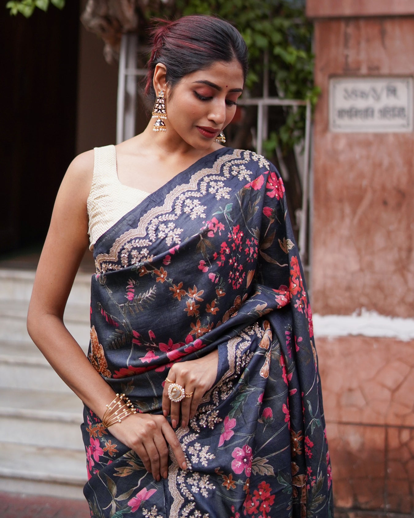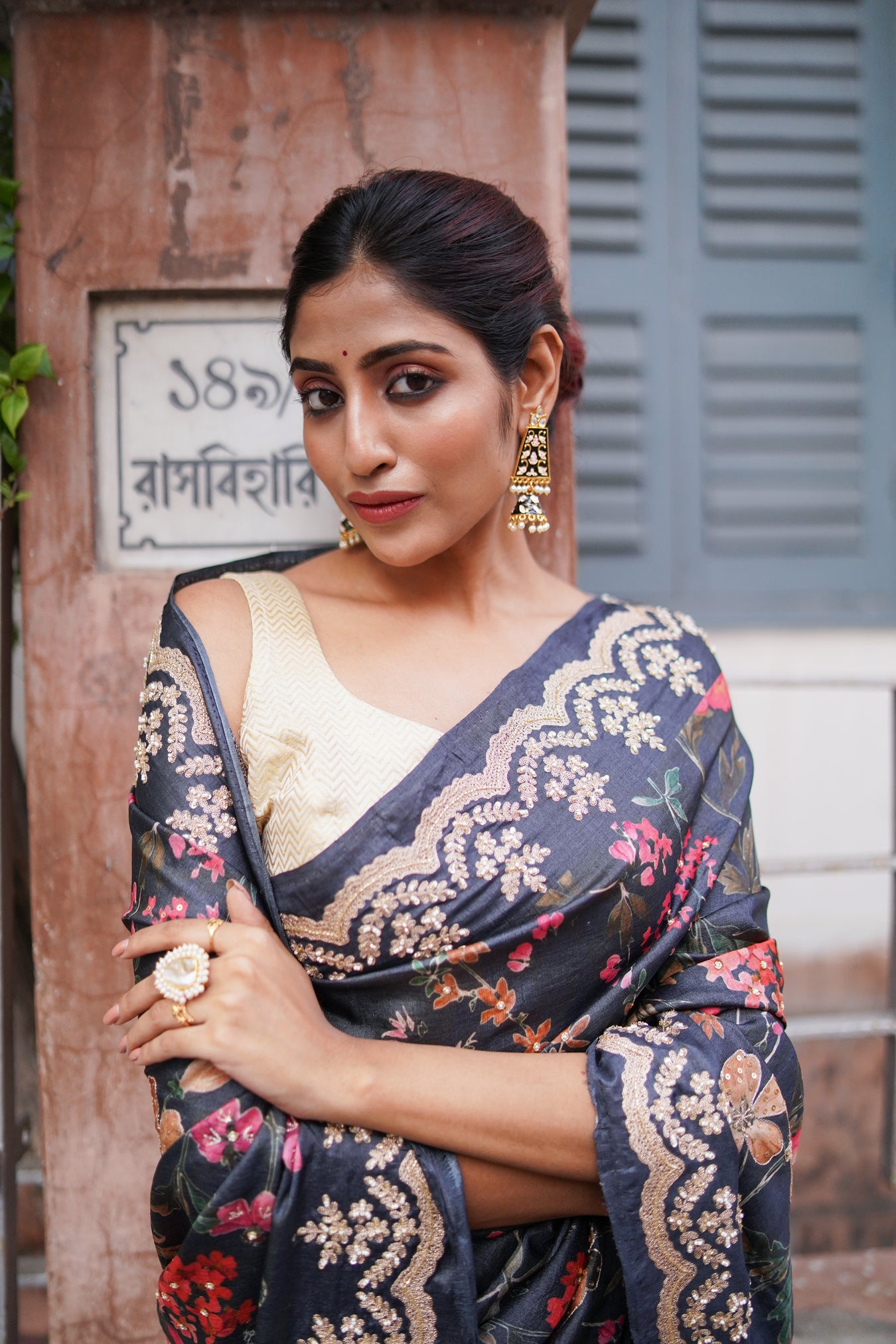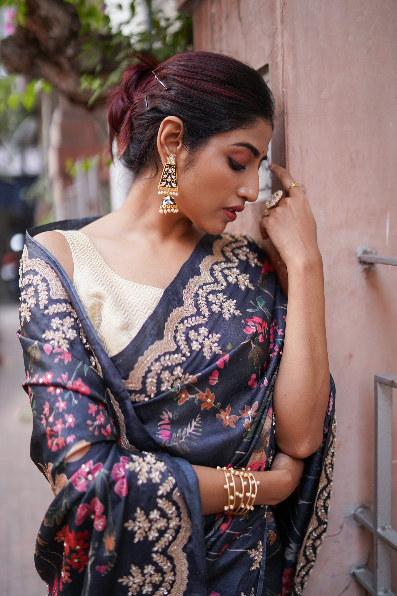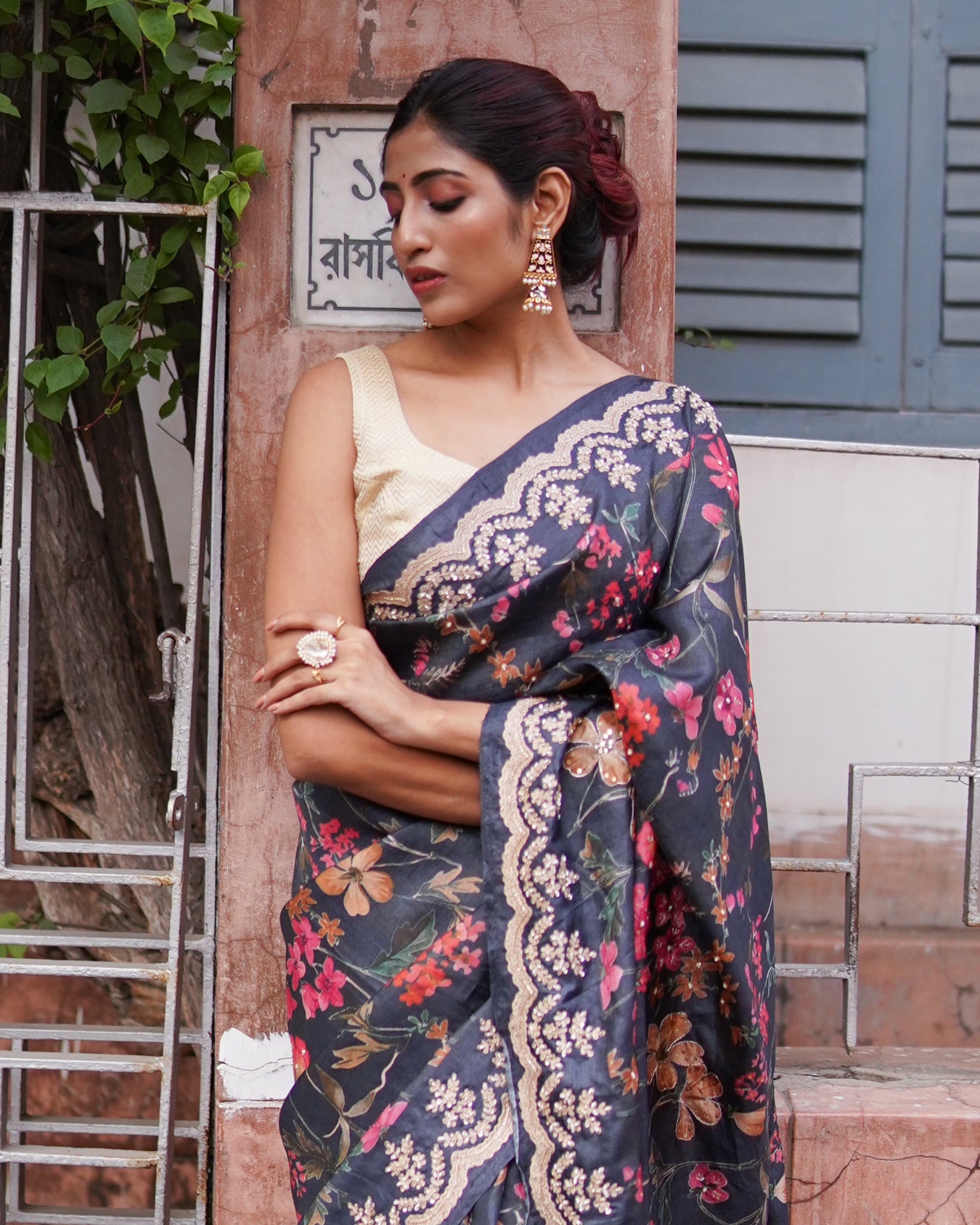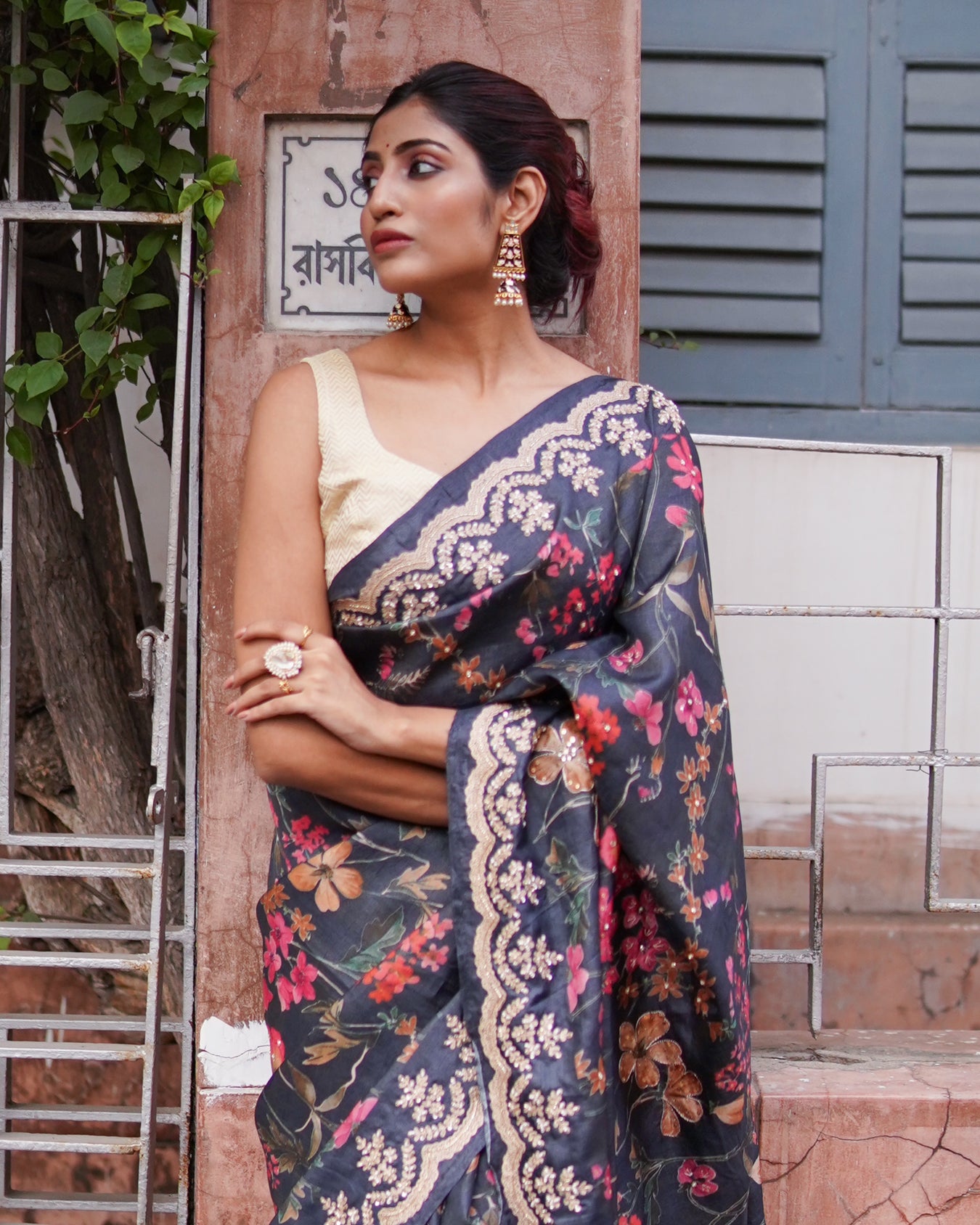 Size: 5.50Mtr B: 0.80MtrColor: BlackFabric: Tussar Silk Attributes: Hand Embroidery & Digital Print