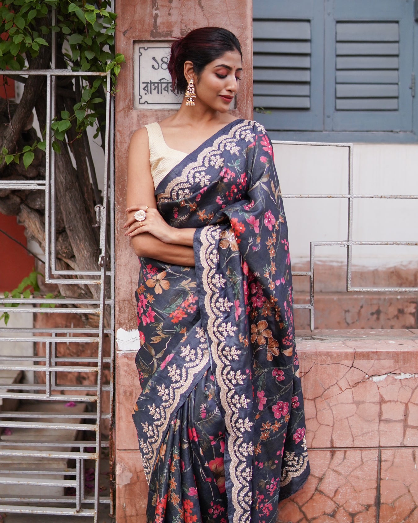 PRE ORDER- The saree will take 15-20 days for makingPattern and print:Â Indulge in the beauty of our saree adorned with floral embroidery. The intricate scallops zardosi border making the saree more elegant. The harmonious blend of two art forms creates an enchanting ensemble that exudes grace and charm. Step into a world of timeless elegance and modern appeal with this unique and captivating combination.Pack contains:Â 1 Saree, 1 BlouseCare instructions:Â Dry wash