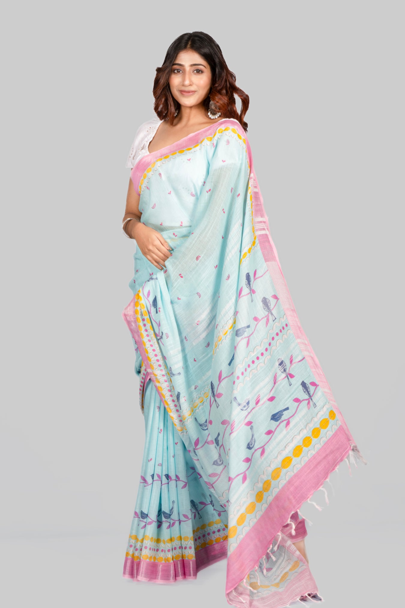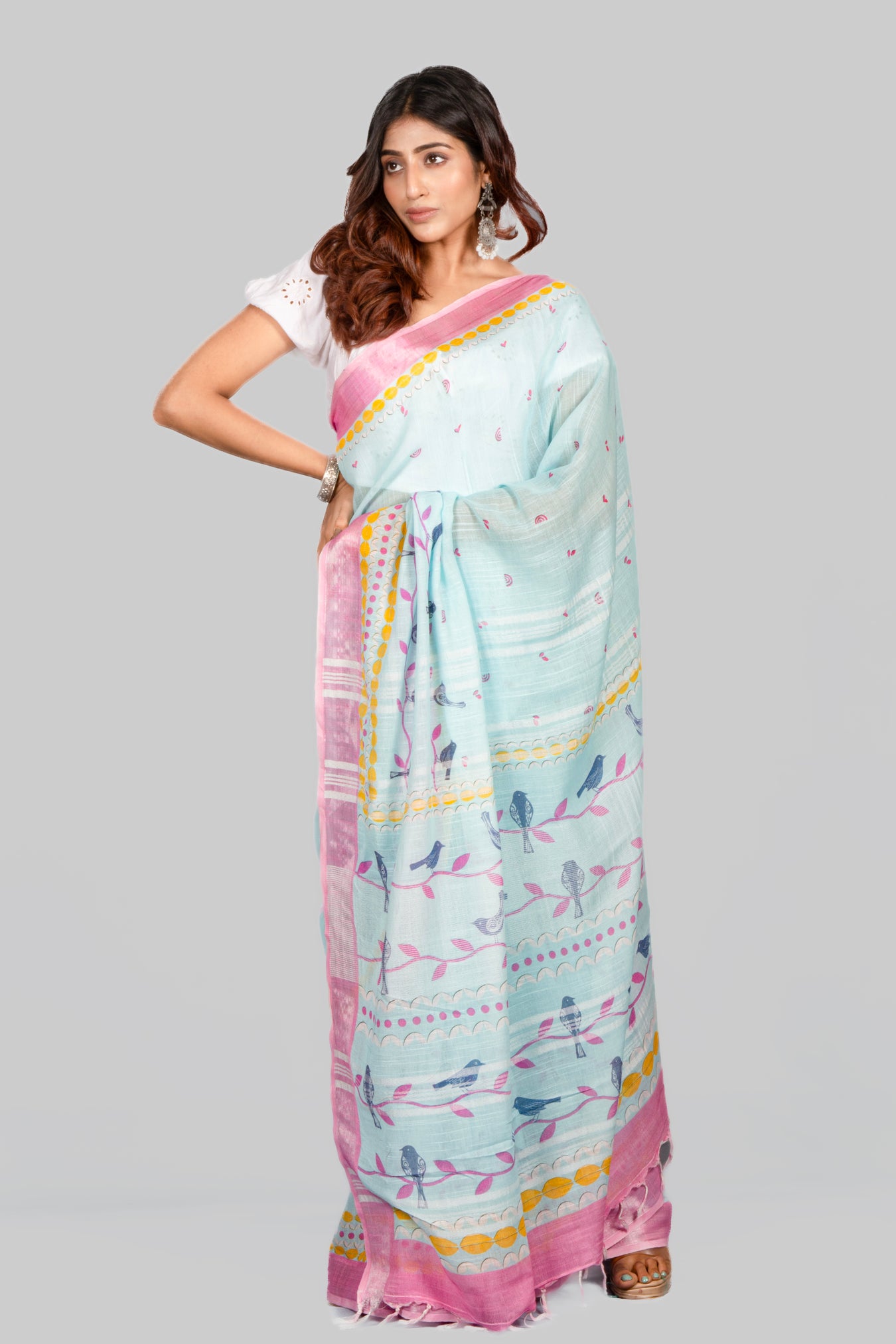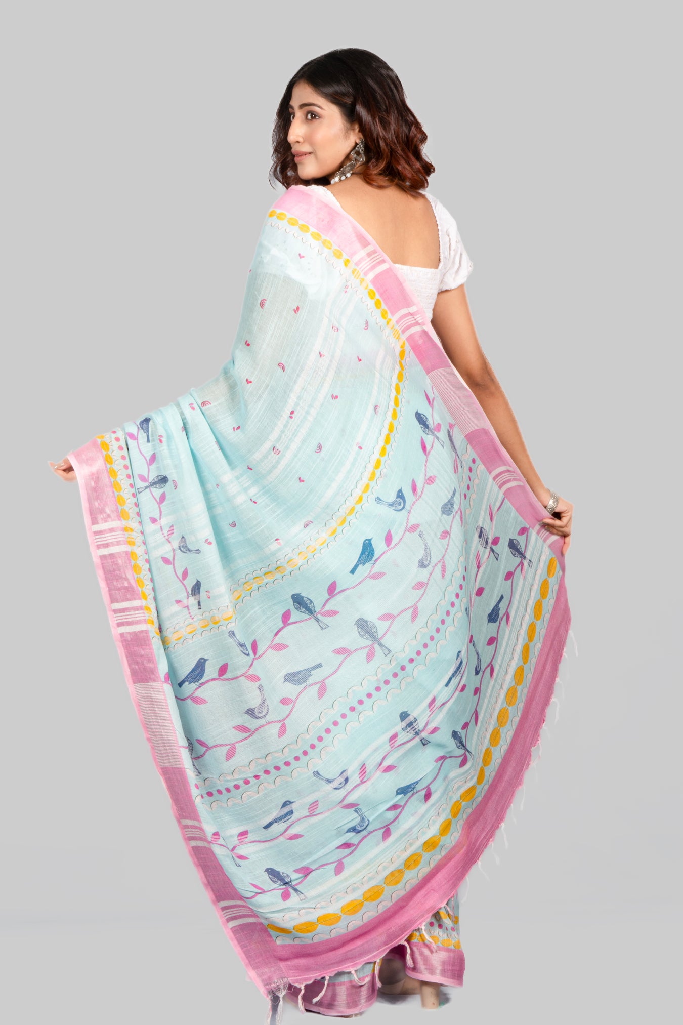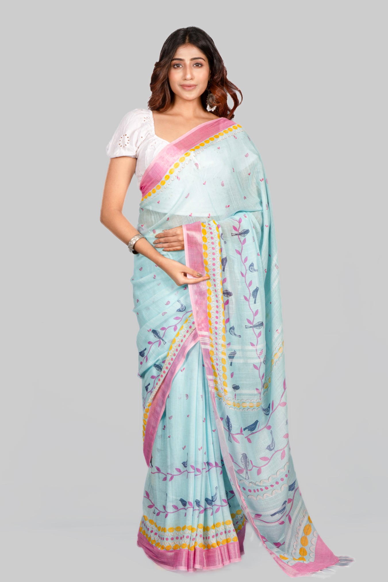 Size: 5.50Mtr B: 0.80MtrColor: TurquoiseFabric: COTTON LINENPattern and print: This light linen saree with a pink contrast border and digital print offers a delightful contrast, blending elegance with a touch of vibrancy. It's a charming choice for those seeking a refreshing yet classic look.Pack contains: 1 Saree, 1 BlouseCare instructions: Dry wash