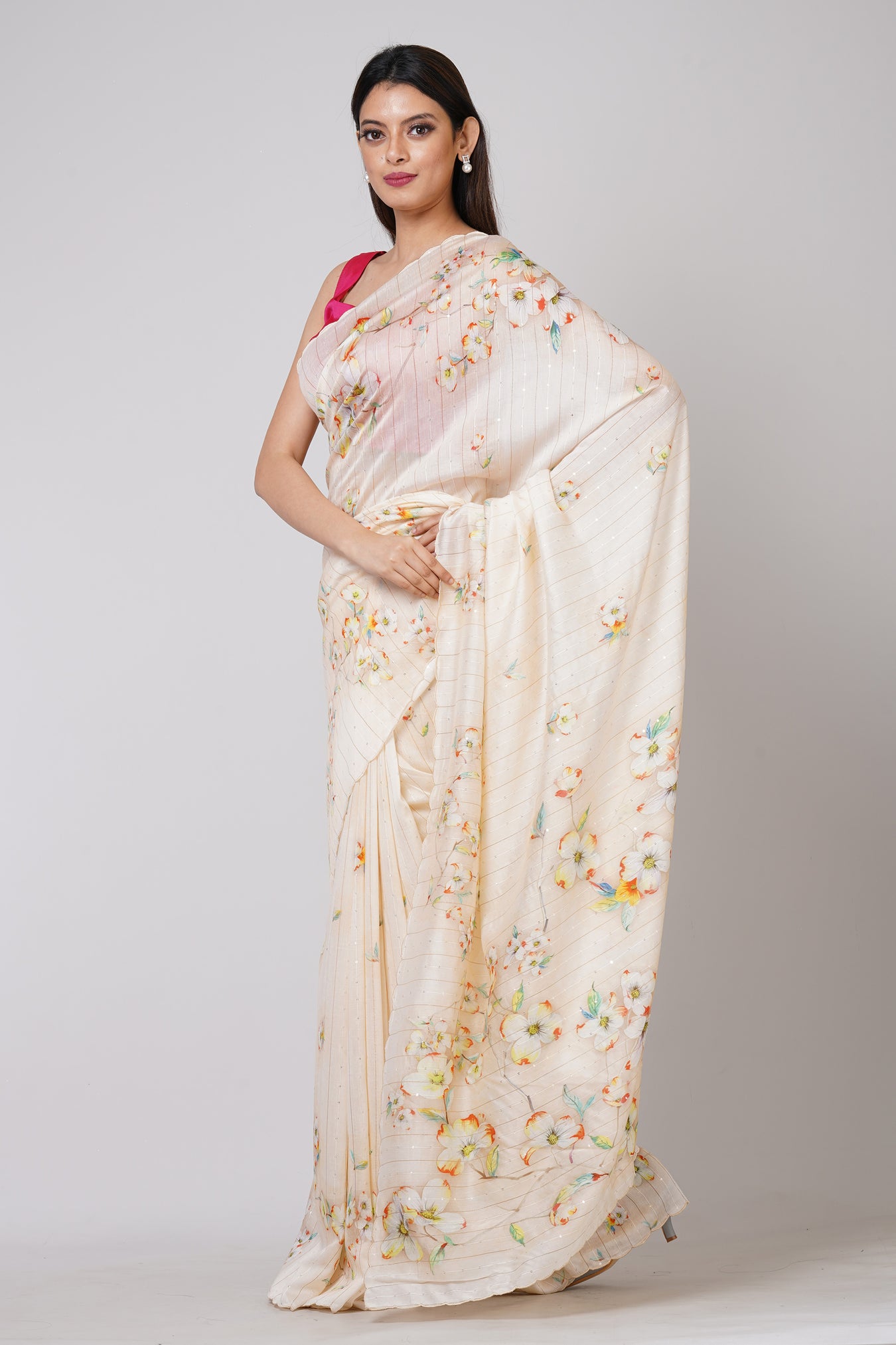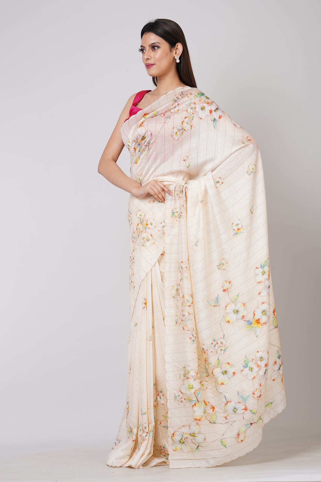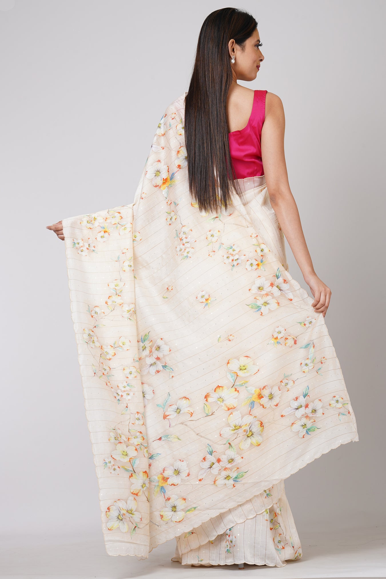 Size: S: 5.50Mtr B: 0.80MtrColour: whiteFabric: RAW SEQUENCEPattern and print: The White RAW SEQUENCE saree is a stunning piece that effortlessly commands attention. Its vibrant hue and intricate RAW SEQUENCE fabric create a captivating canvas for the colorful floral design adorning its entirety. Infused with vibrancy, this saree exudes elegance and charm, making it a stylish and eye-catching choice for any occasion.Purity: Natural fabricCare instructions: Dry wash