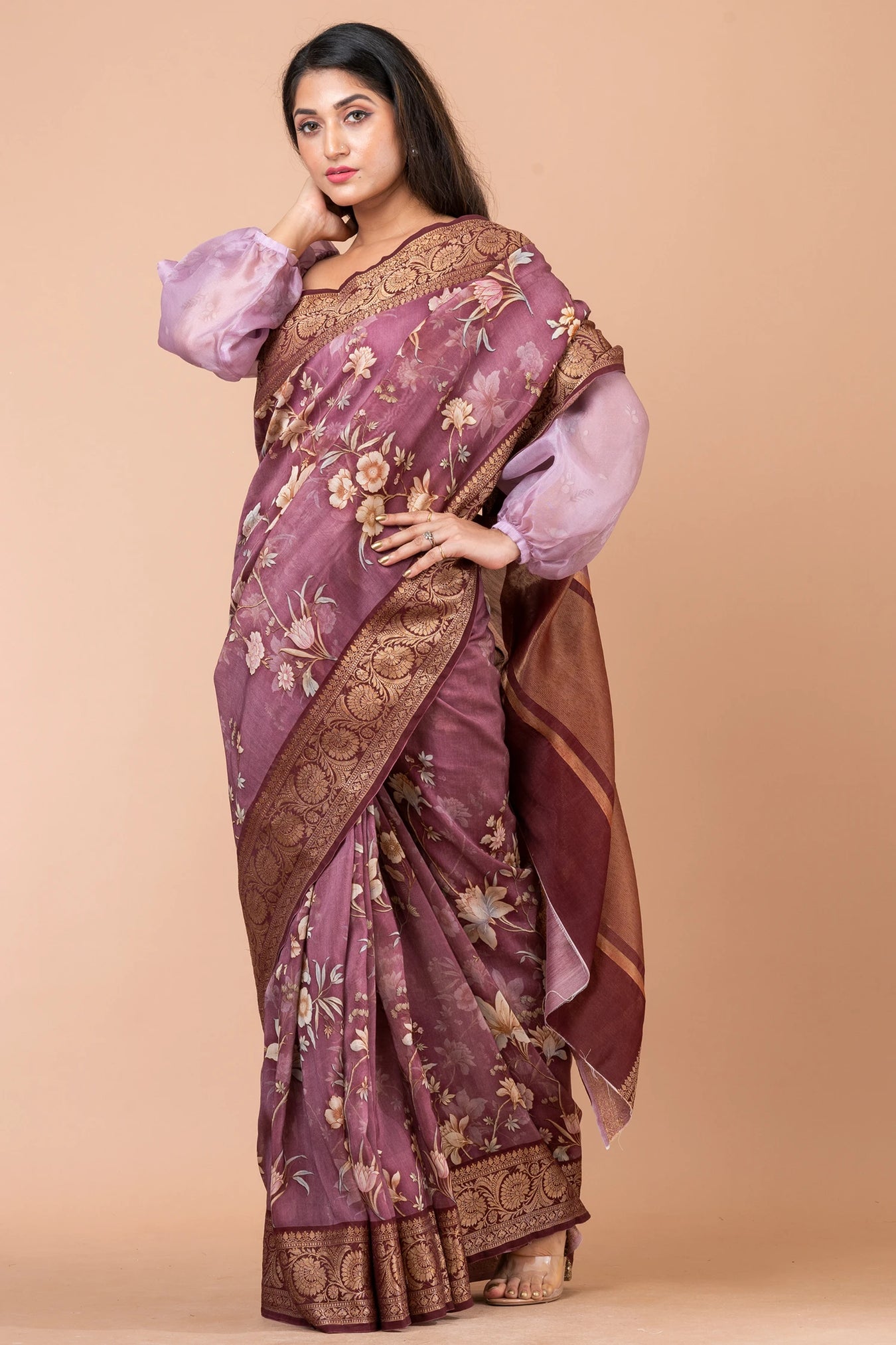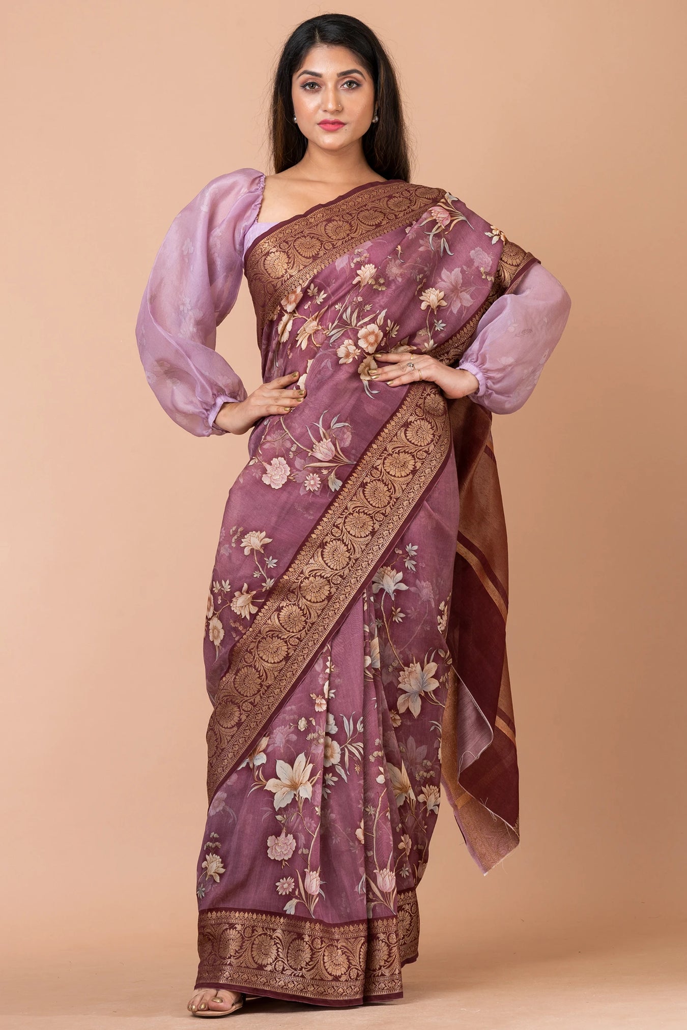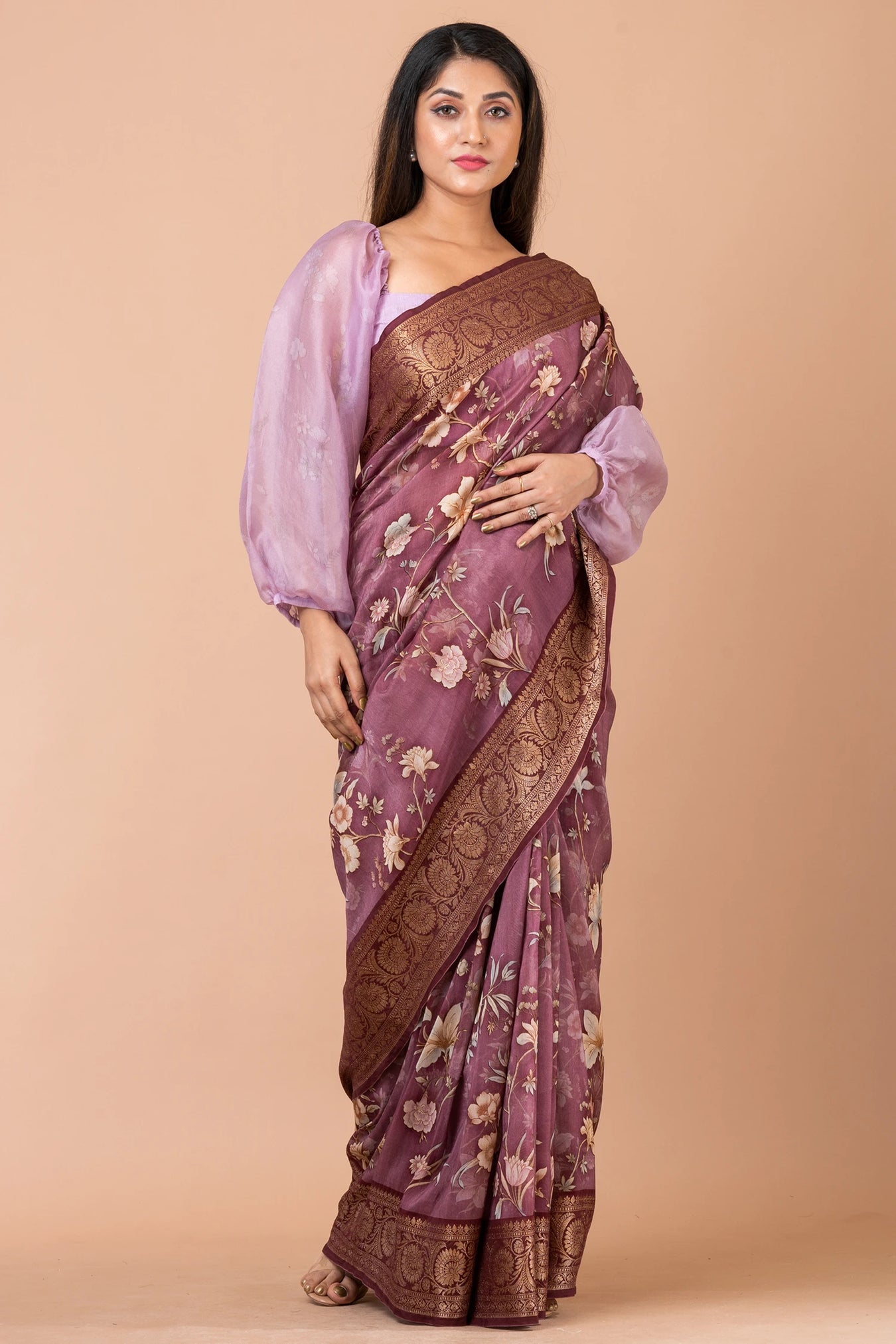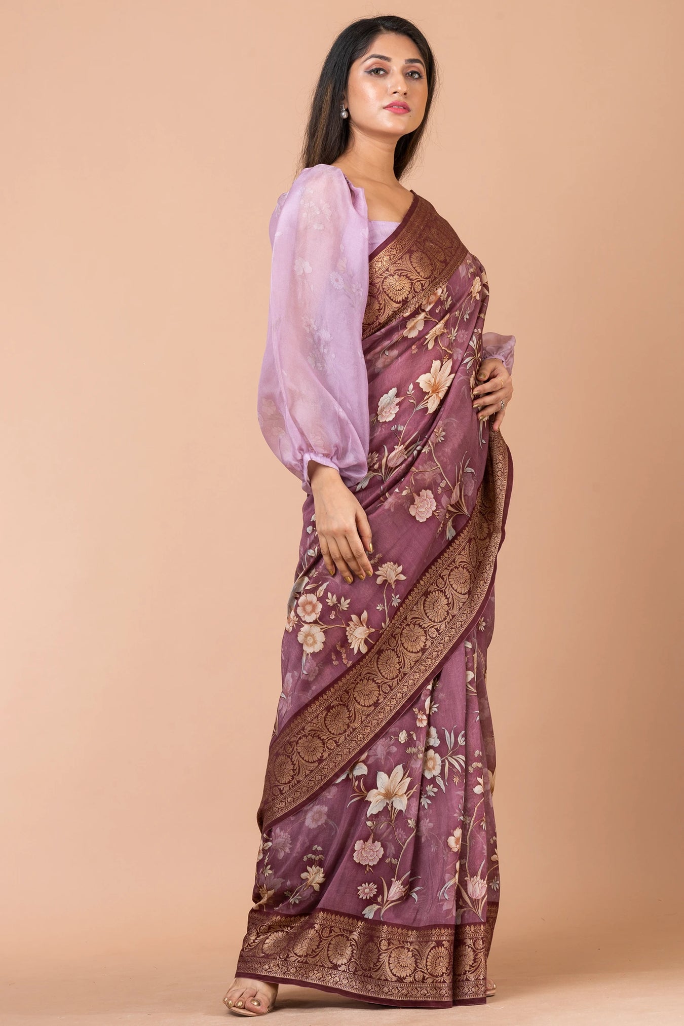 Size: S: 5.50Mtr B: 0.80MtrColour: Moderate purple with maroon zari borderFabric: Chanderi Zari Woven sareeAttributes: Pattern and print: Embrace the untamed beauty of our saree adorned with pink wild flowers, where the charm and grace of nature's blooms come alive in a captivating and enchanting ensemble that celebrates the vibrant allure of wild flora.Silk Purity: Pure ChanderiPack contains: 1 Saree, 1 BlouseCare instructions: Dry wash