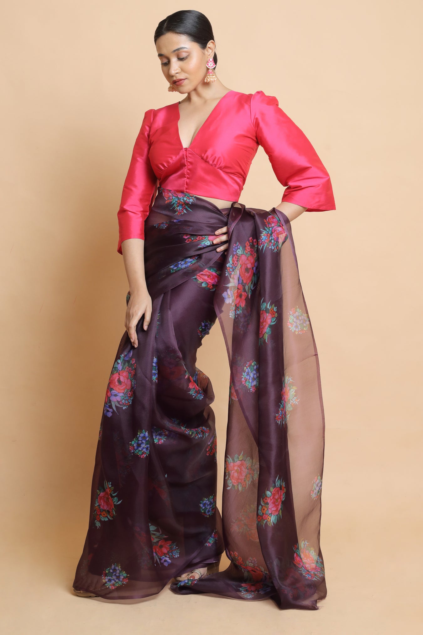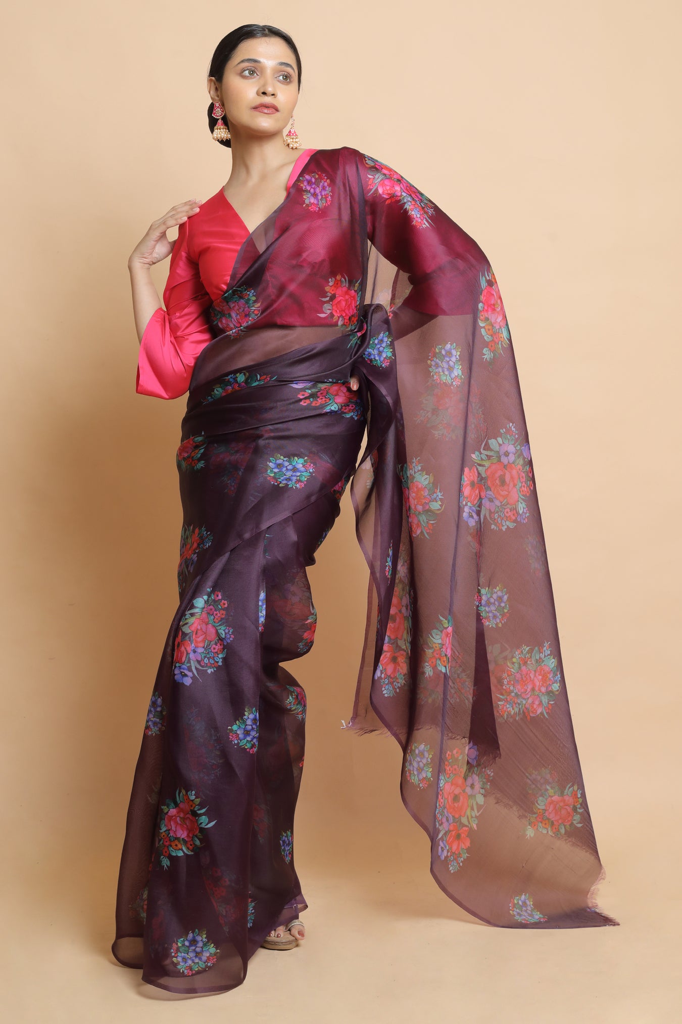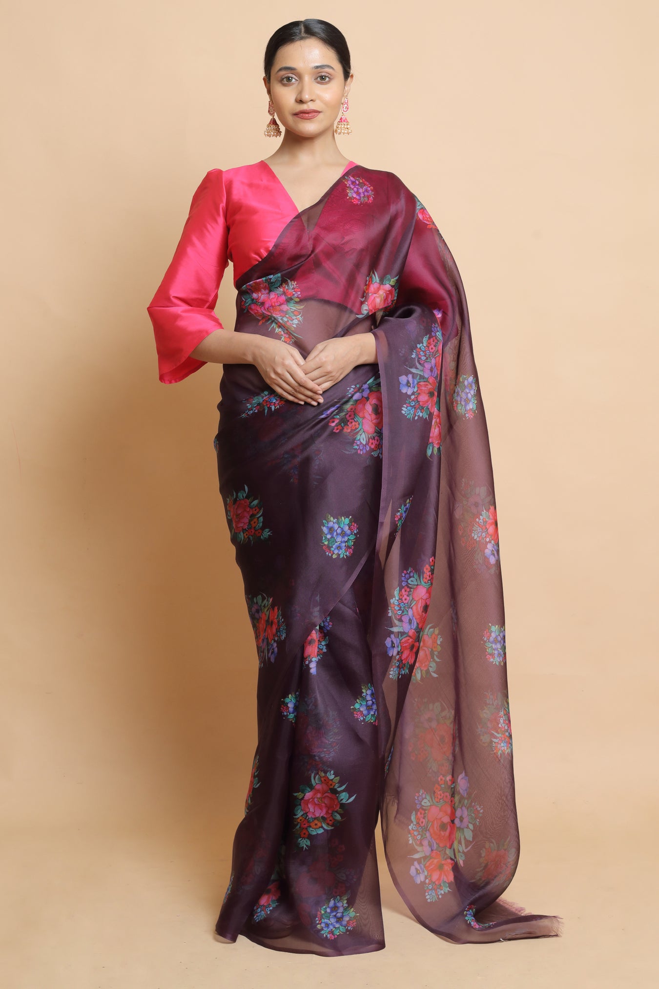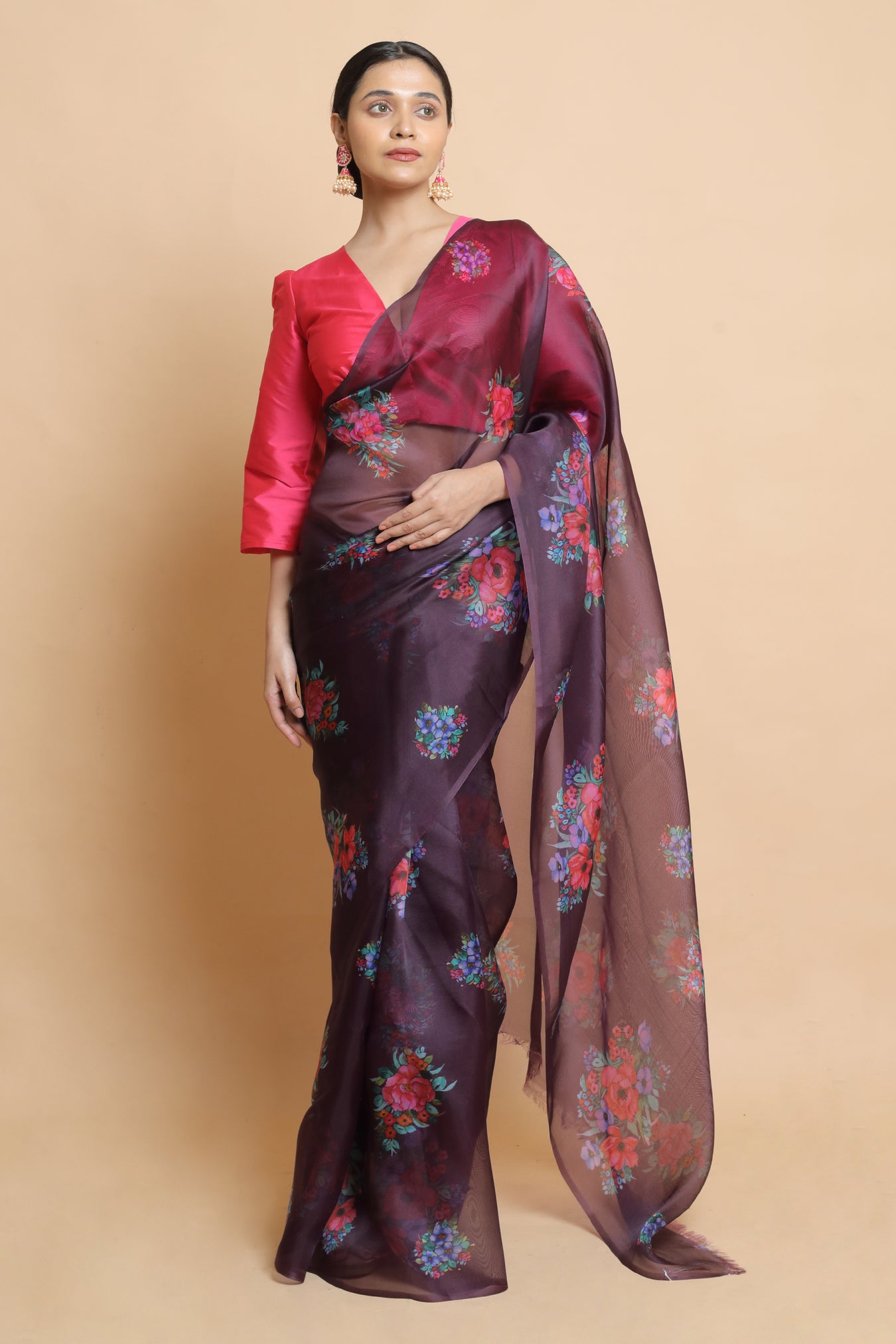 Size: 5.50Mtr B: 0.80MtrColour: VioletFabric: ORGANZAPattern and print: This half and half sari combines organza silk and satin crepe, draping smoothly around the body to enhance feminine curves. Its weightless pallu and soft hand-feel make it easy to wear. Adorned with vibrant hand-painted floral prints, the saree stands out with its bold design, bringing out your inner confidence effortlessly.