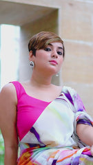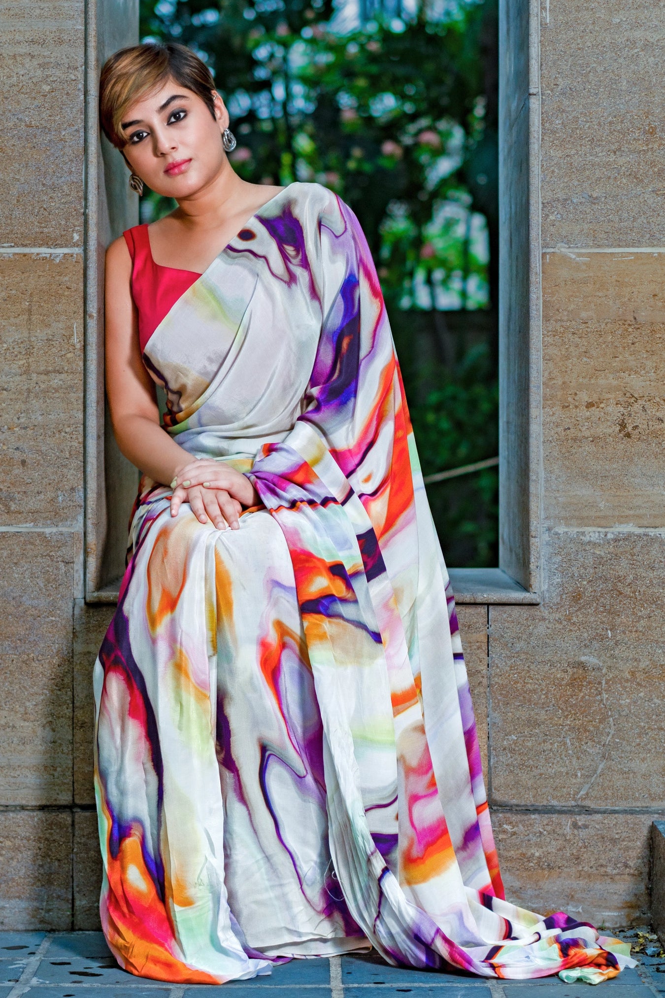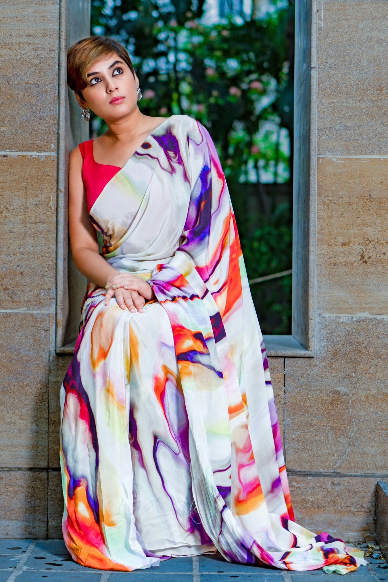 Size:Â S: 5.50Mtr B: 0.80MtrColour: WhiteFabric: LIVA CRAPEPattern and print: The white liva crape saree Marble design all over, creating a bold and elegant look. The contrast between the light background and the vibrant multi colour wave making it a standout piece for any occasion.Pack contains:Â 1 Saree, 1 BlouseCare instructions:Â Dry wash