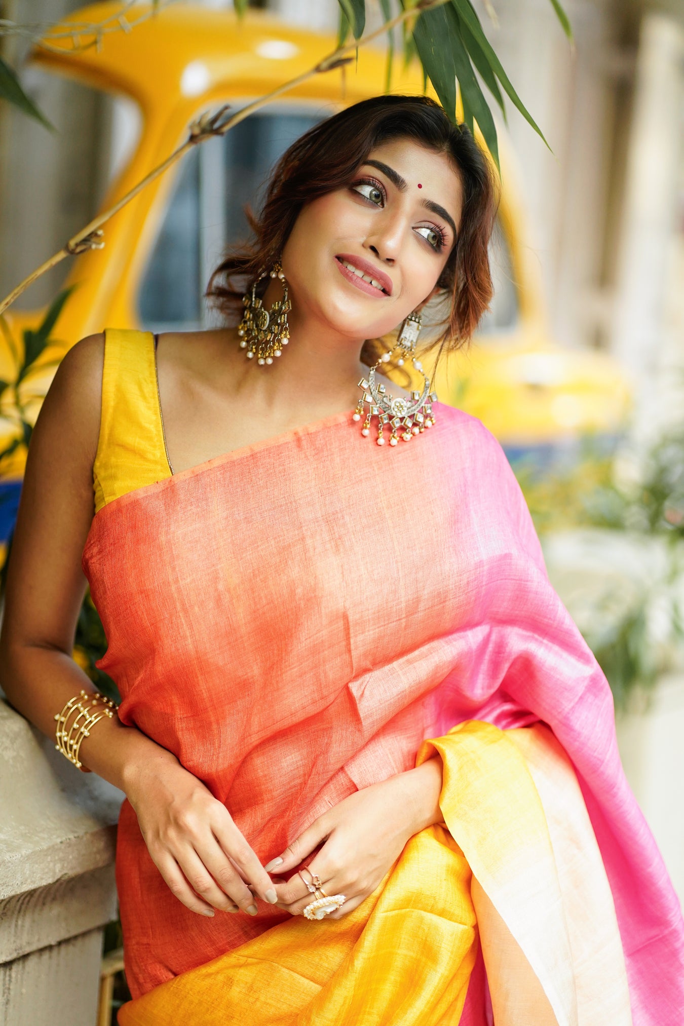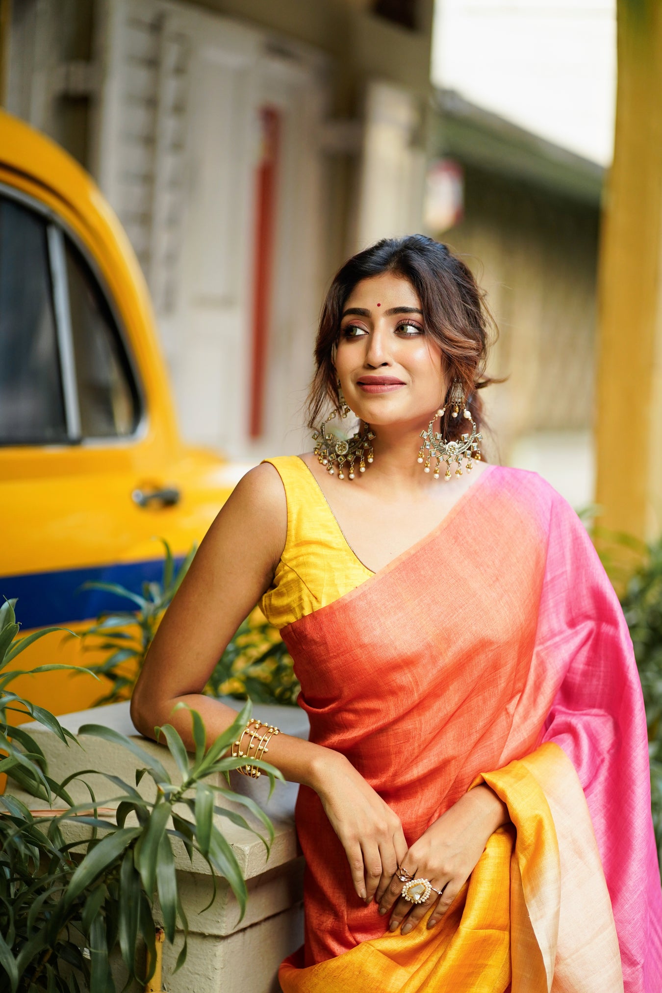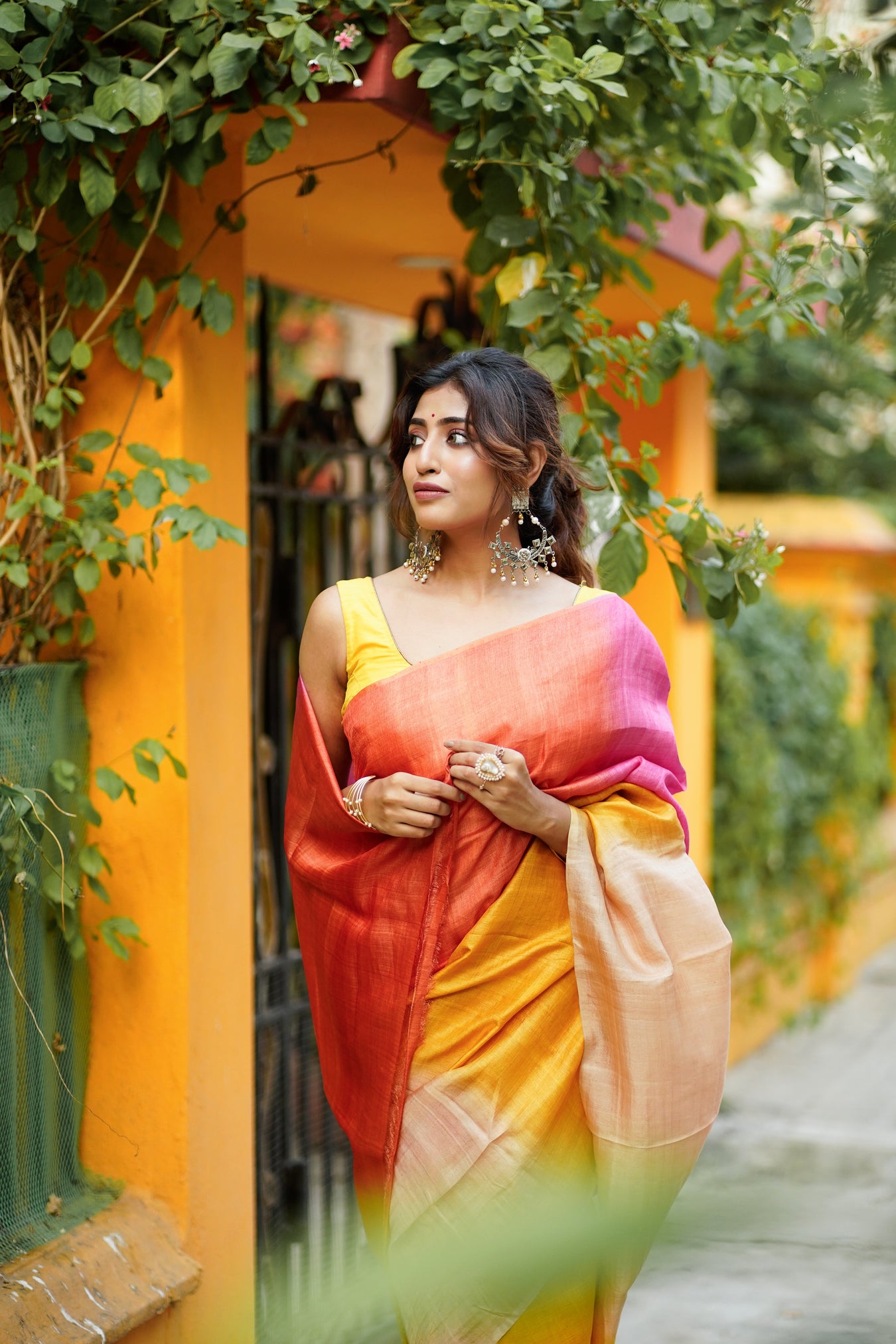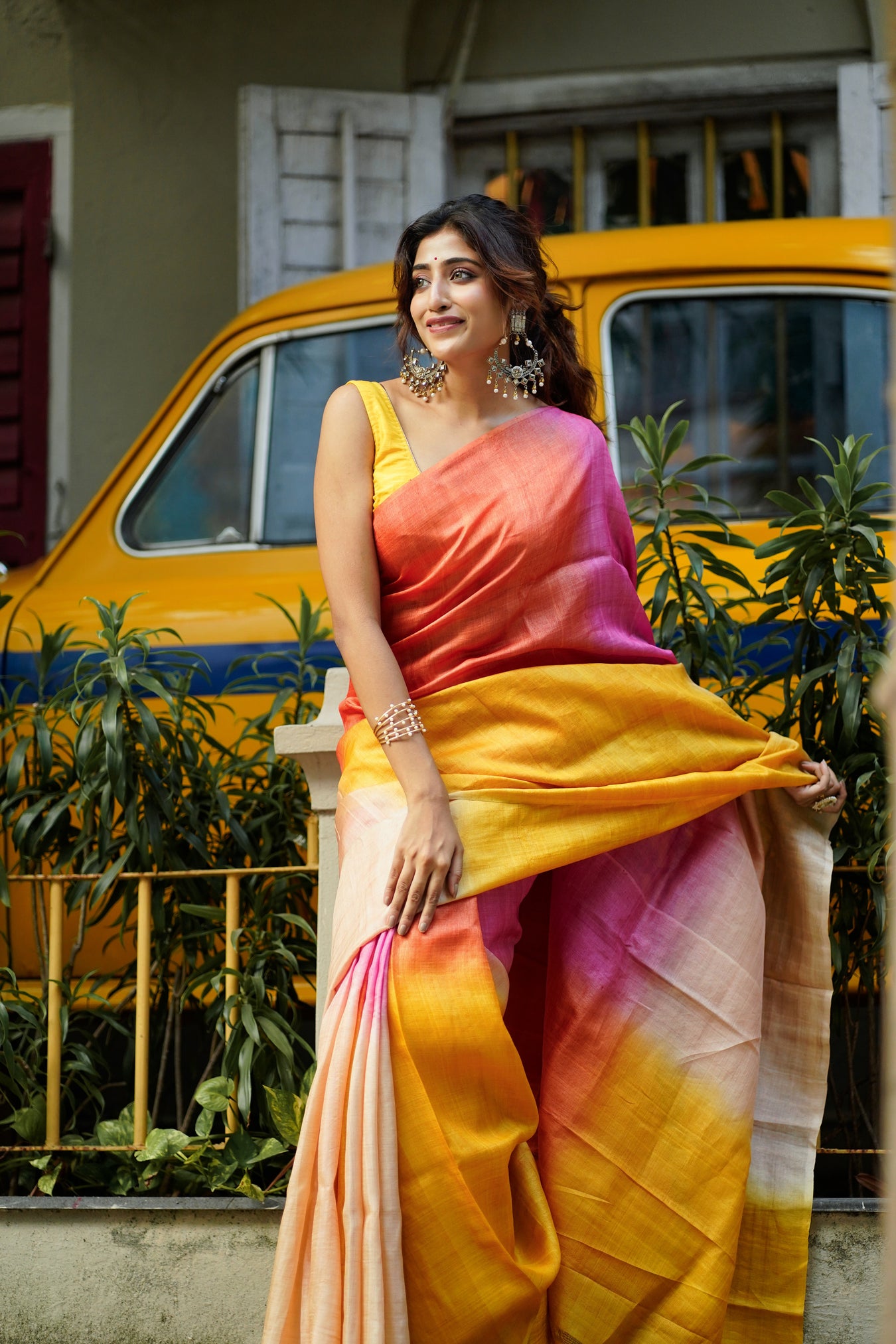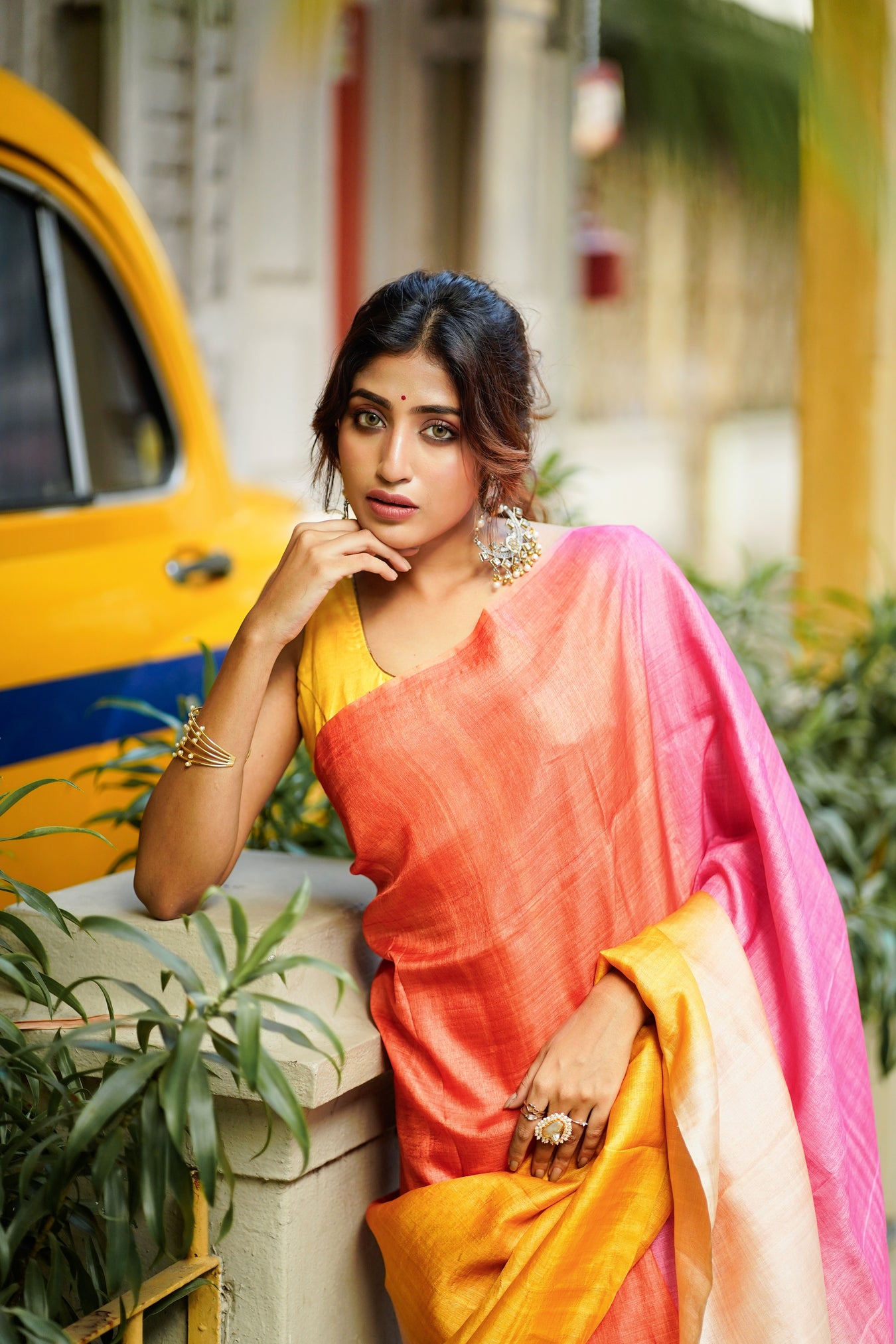 Pattern and print: Enhance your style with our captivating Plain Tussar saree, showcasing a vibrant orangish pink hue and adorned with yellow & beige color. The saree features an all-over geometric patterned print, adding a touch of elegance and uniqueness to your ensemble.Silk purity: Pure Tussar SilkPack contains: 1 Saree, 1 BlouseCare instructions: Dry wash