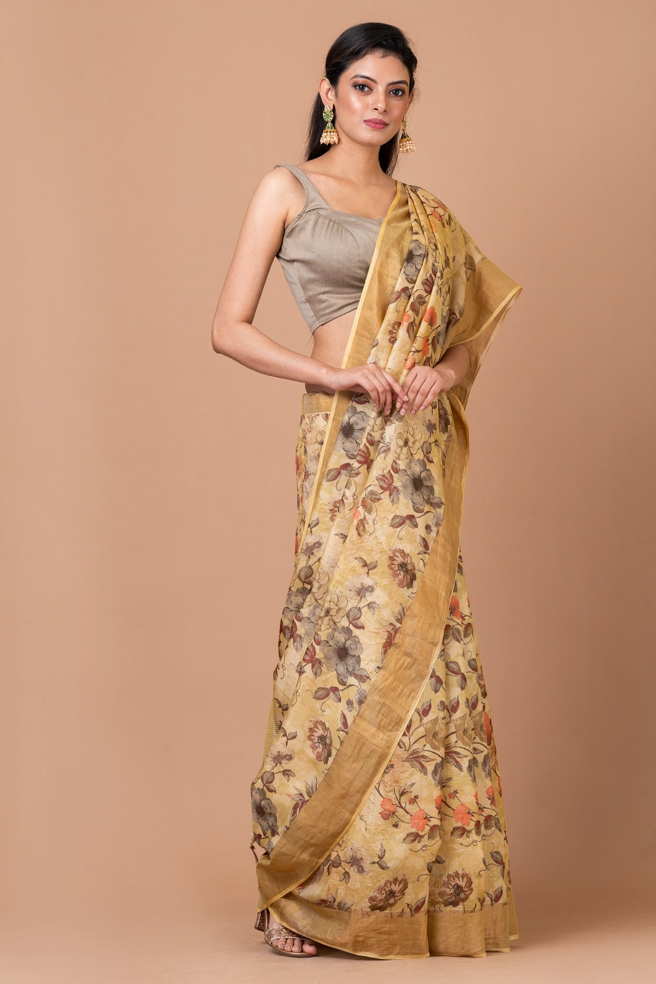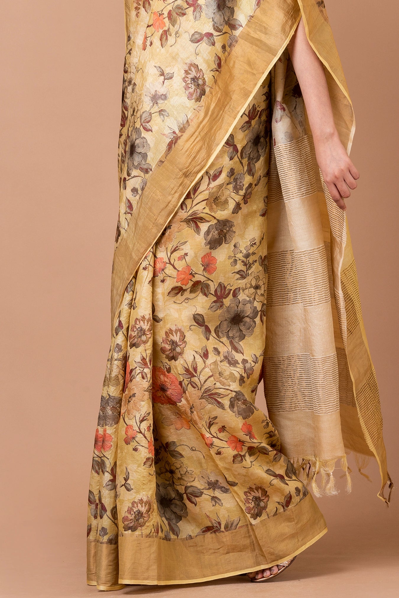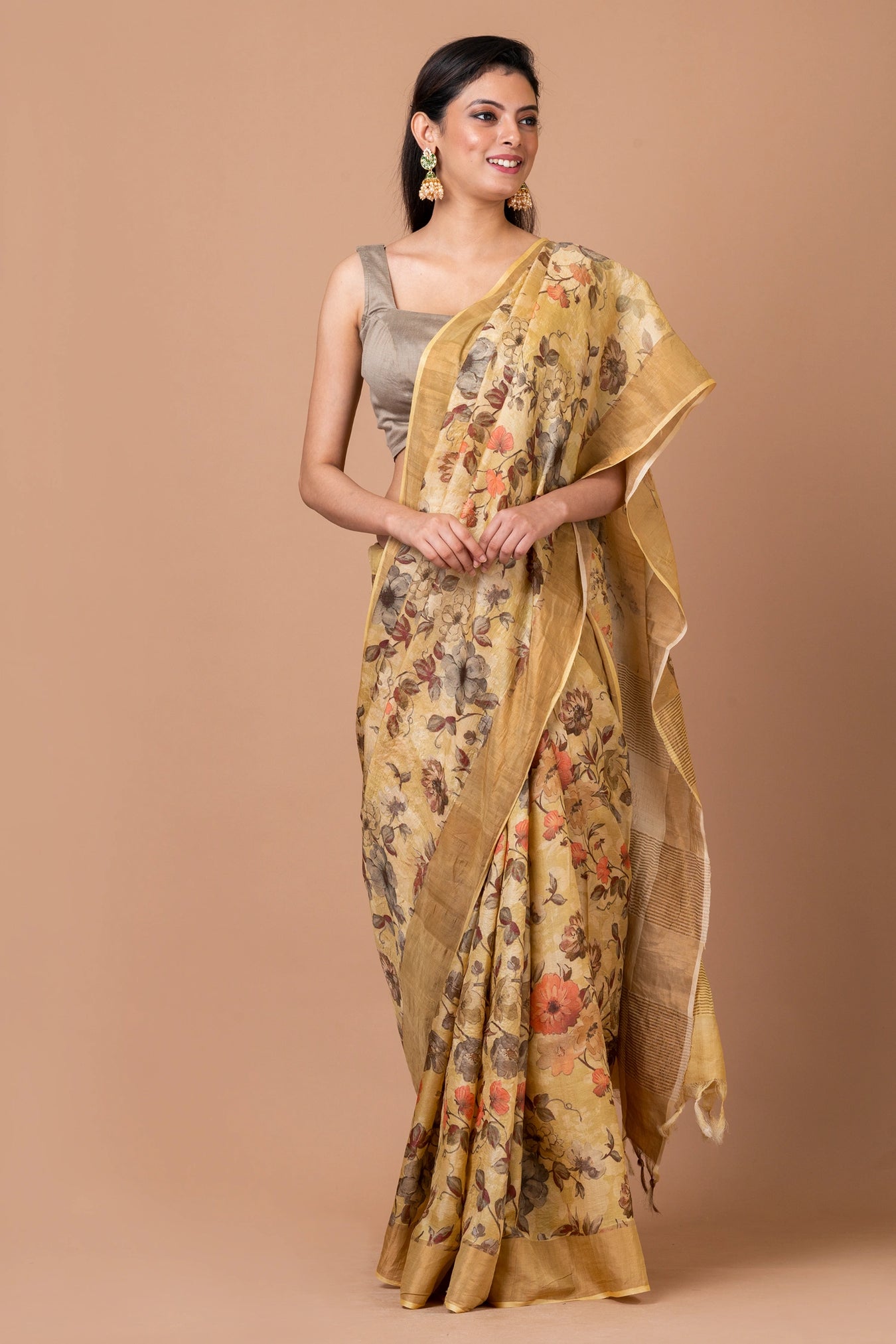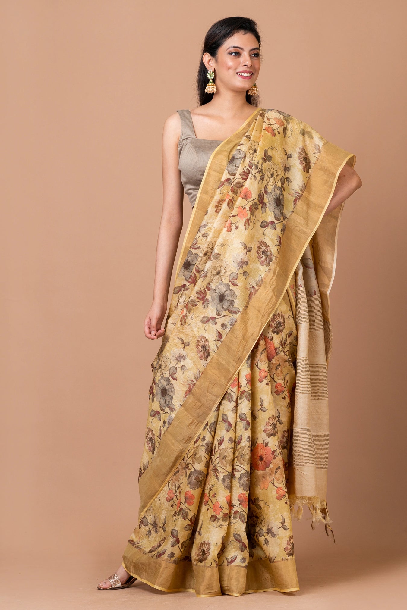 Size: S: 5.50Mtr B: 0.80MtrColour: BeigeFabric: Tussar silkPattern and print: Experience timeless elegance with our beige saree featuring a traditional floral print motif. Perfectly crafted for a blend of classic charm and modern sophistication.Silk purity: Pure Tasar SilkPack contains: 1 Saree, 1 BlouseCare instructions: Dry wash