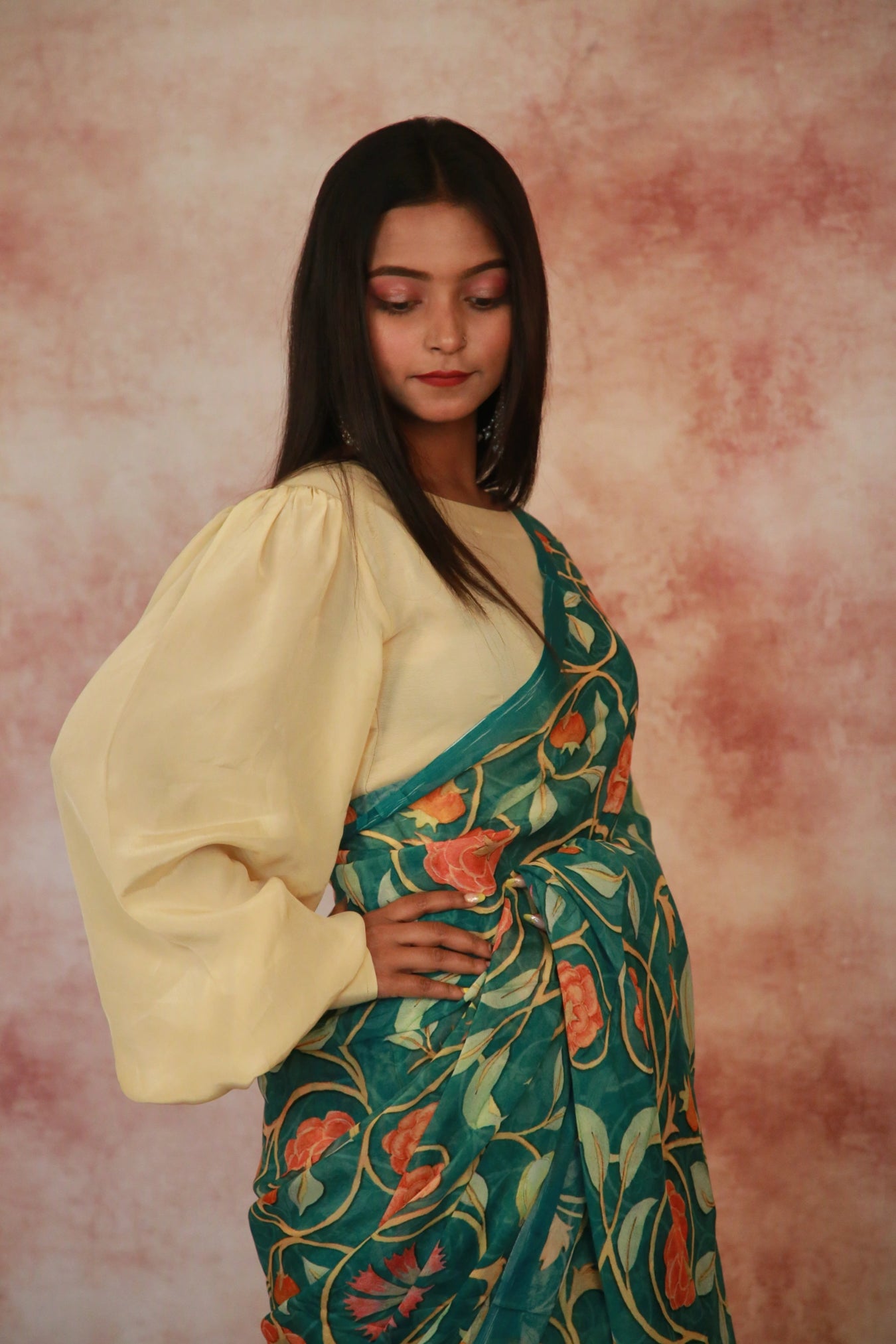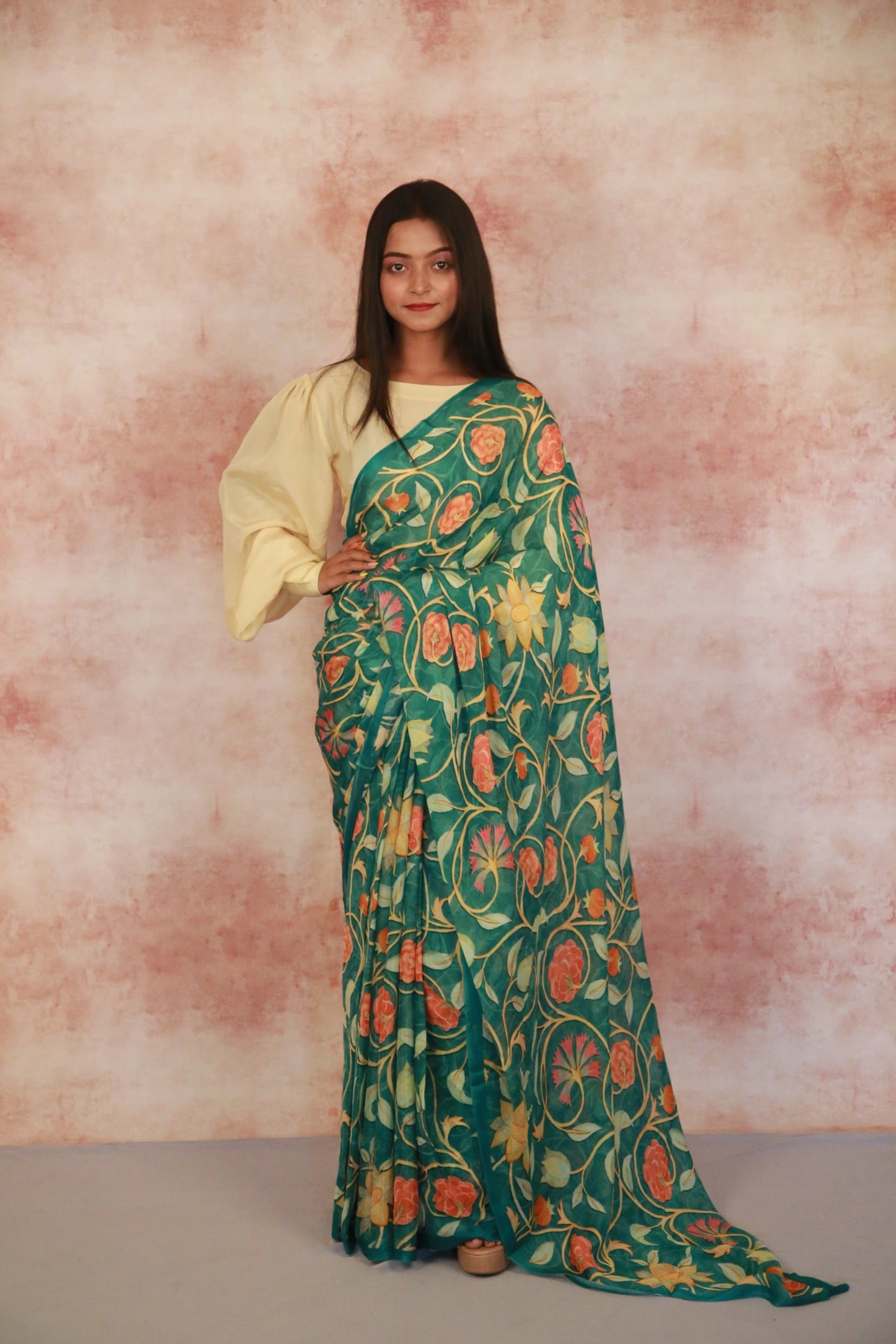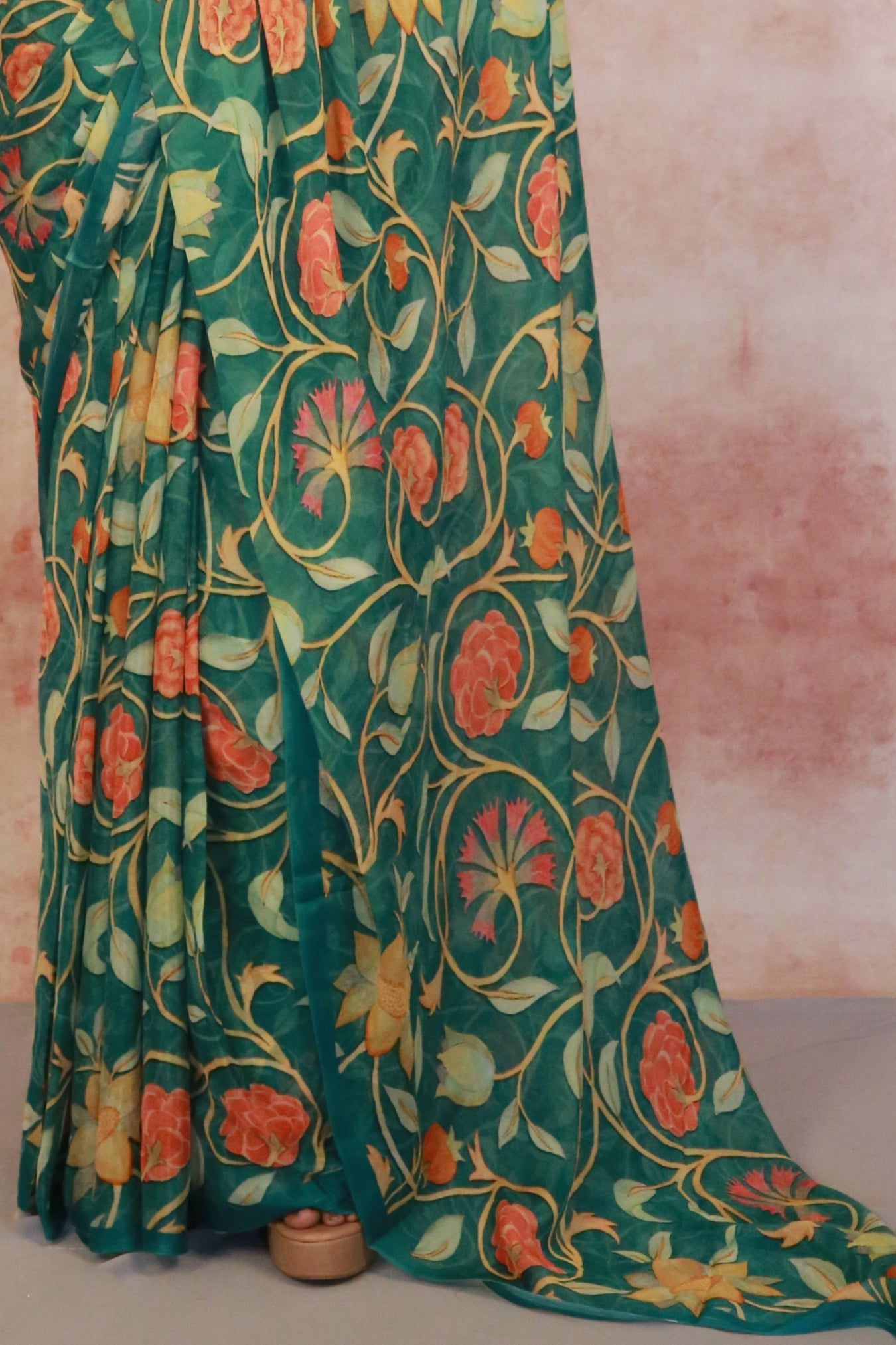 Size:Â S: 5.50Mtr B: 0.80MtrColour: Peacock greenFabric: GeorgetteAttributes:Â Pattern and print:The Peacock green georgette saree adorned with a captivating design featuring flower branches throughout the fabric. Georgette is a lightweight and sheer fabric known for its flowing and draping characteristics. It adds an ethereal and graceful quality to the saree, making it a popular choice for traditional wear.Purity:Pack contains:Â 1 Saree, 1 BlouseCare instructions: Cold hand wash