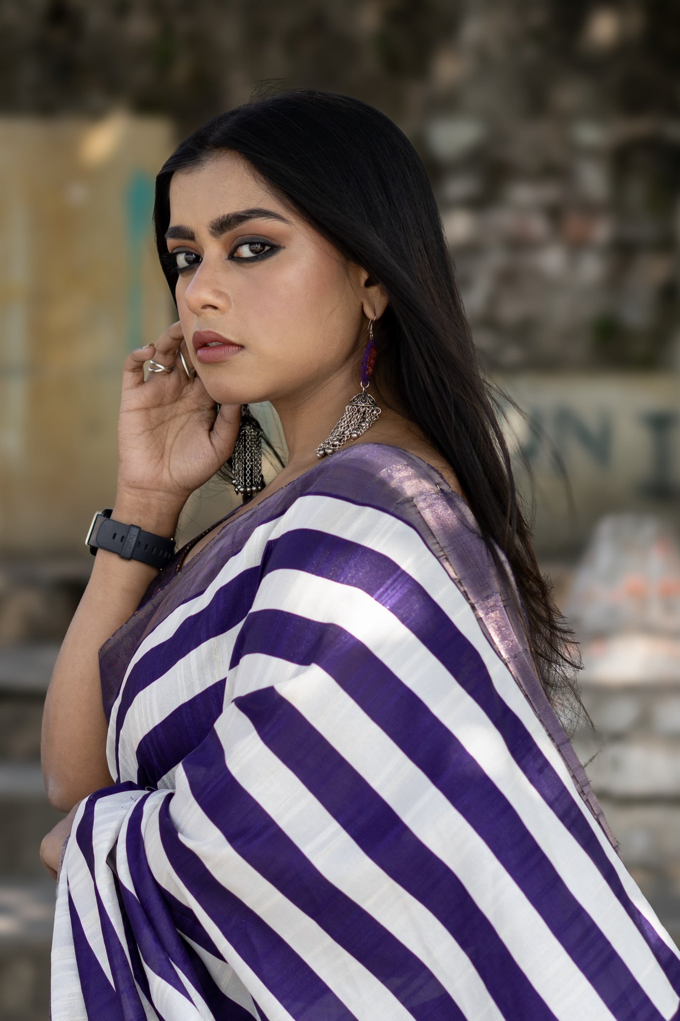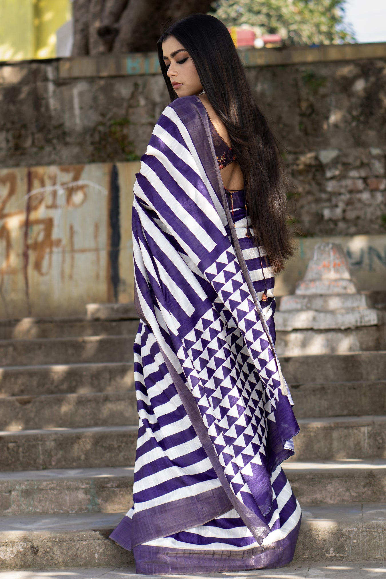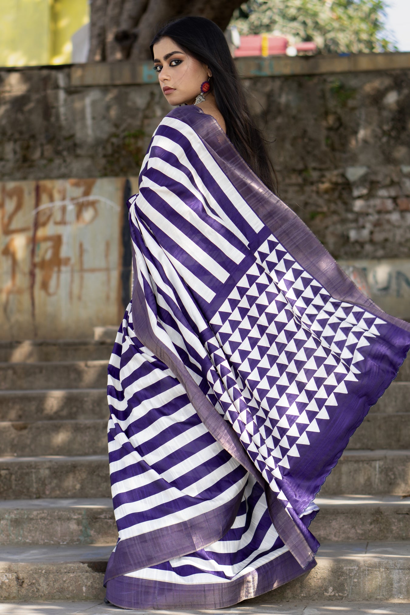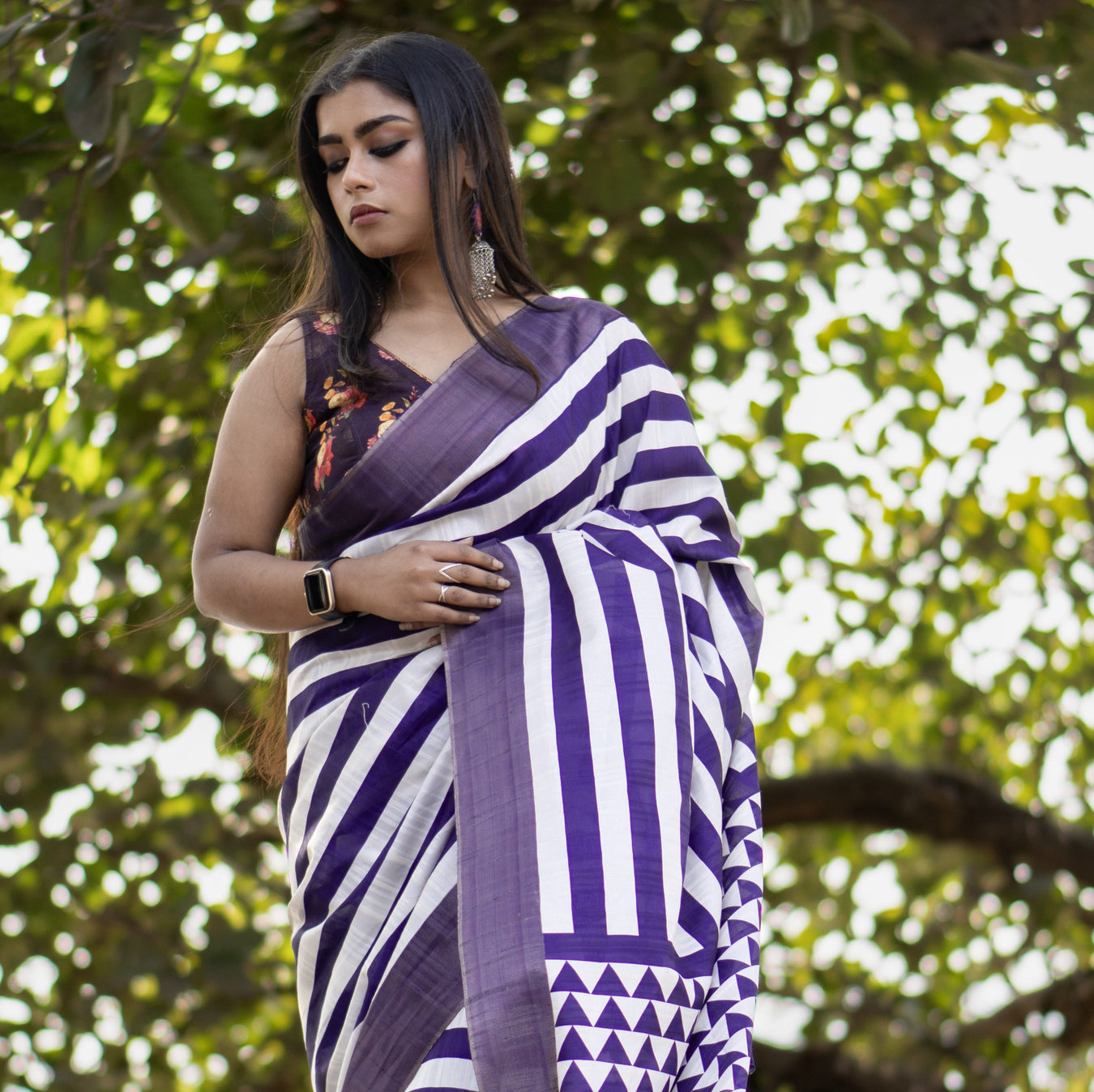 Size: 5.50Mtr B: 0.80MtrColour: BLUEFabric: Semi Tussar Zari Weave Pattern and print: The saree showcases blue and white lines arranged all over, crafting a captivating visual allure. Its modern touch is further elevated by multiple arrangements of triangle motifs on the pallu, culminating in a contemporary and stylish ensemble for any occasion.Pack contains: 1 Saree, 1 BlouseCare instructions: Dry wash