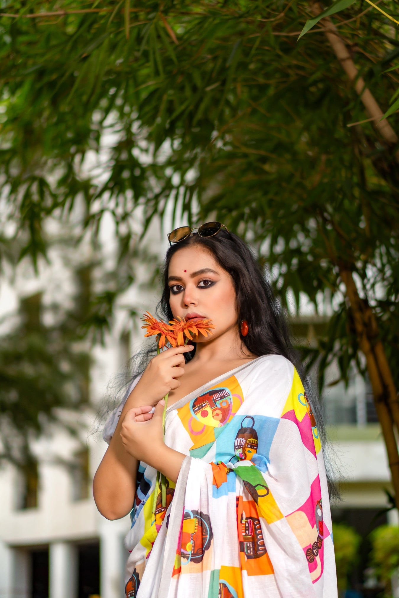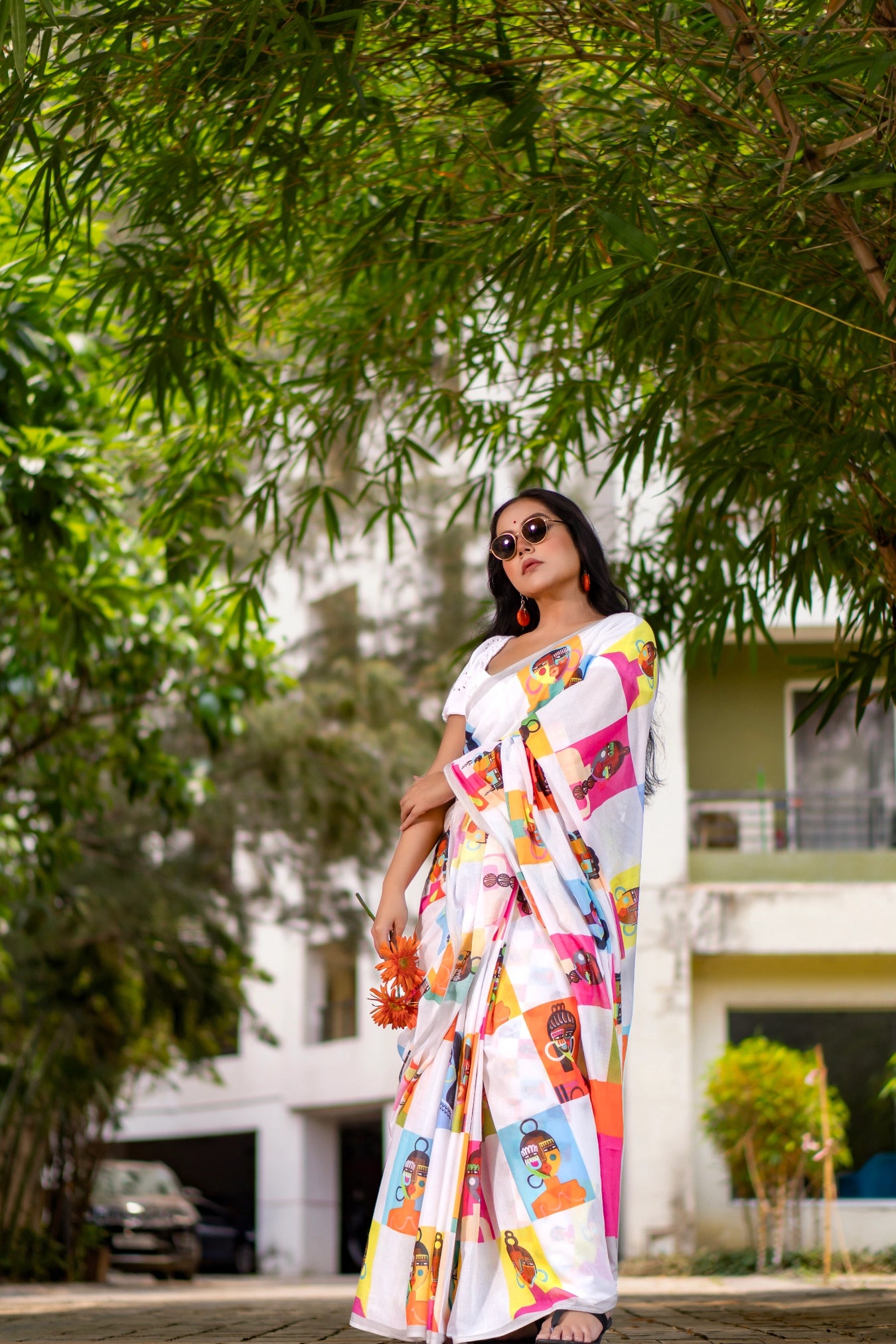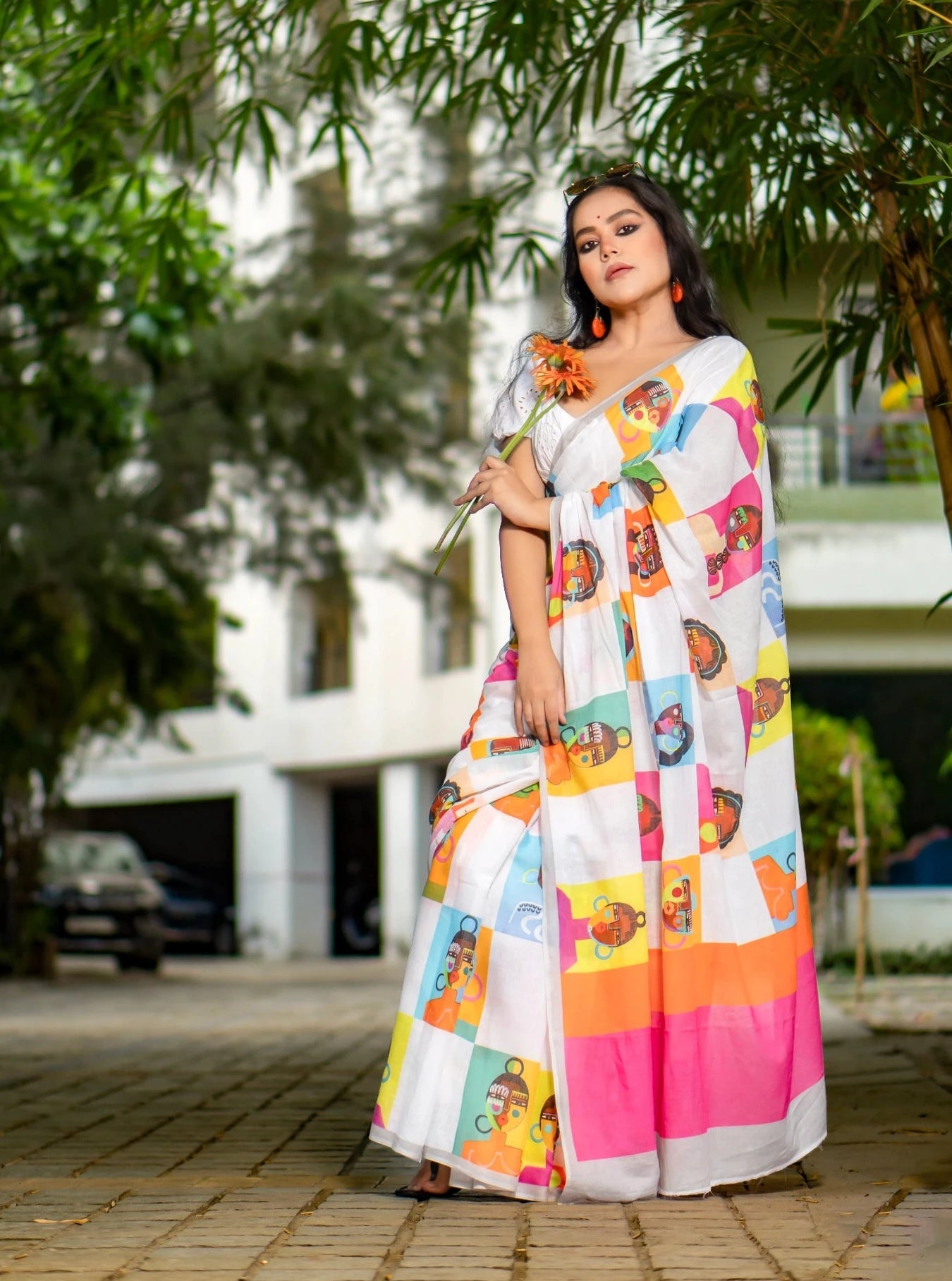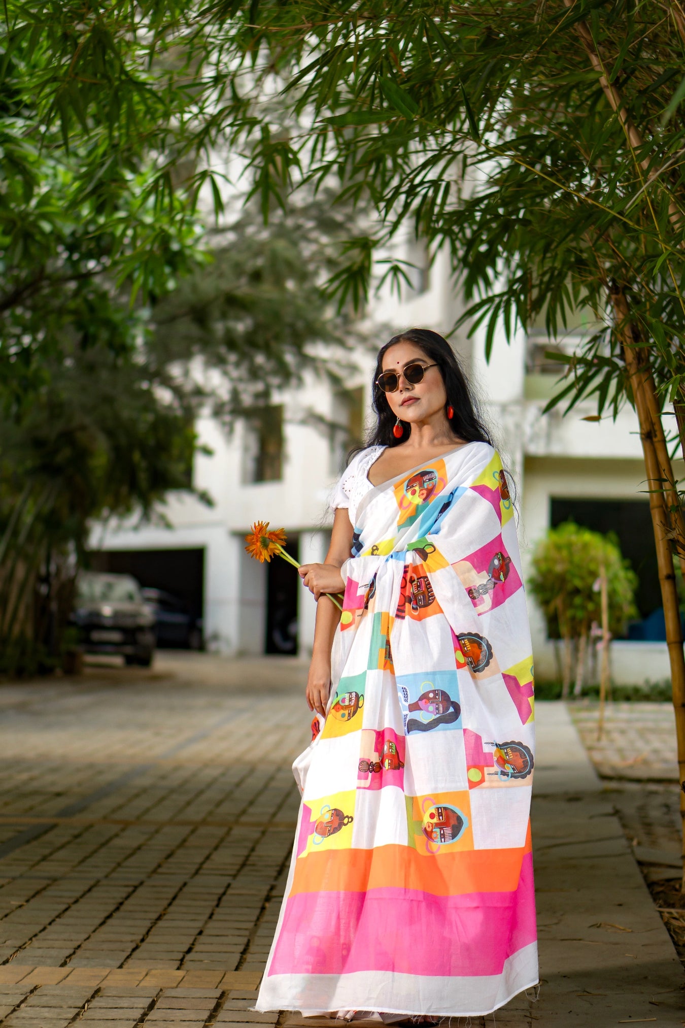 Colour: WhiteFabric: MulmulPattern and print:Â Abstract face motif on natural mulmul saree with an white base. The classic attire is one unique piece making it stand out among others. The saree brings out the softness from within and natural beauty, making it a statement look.