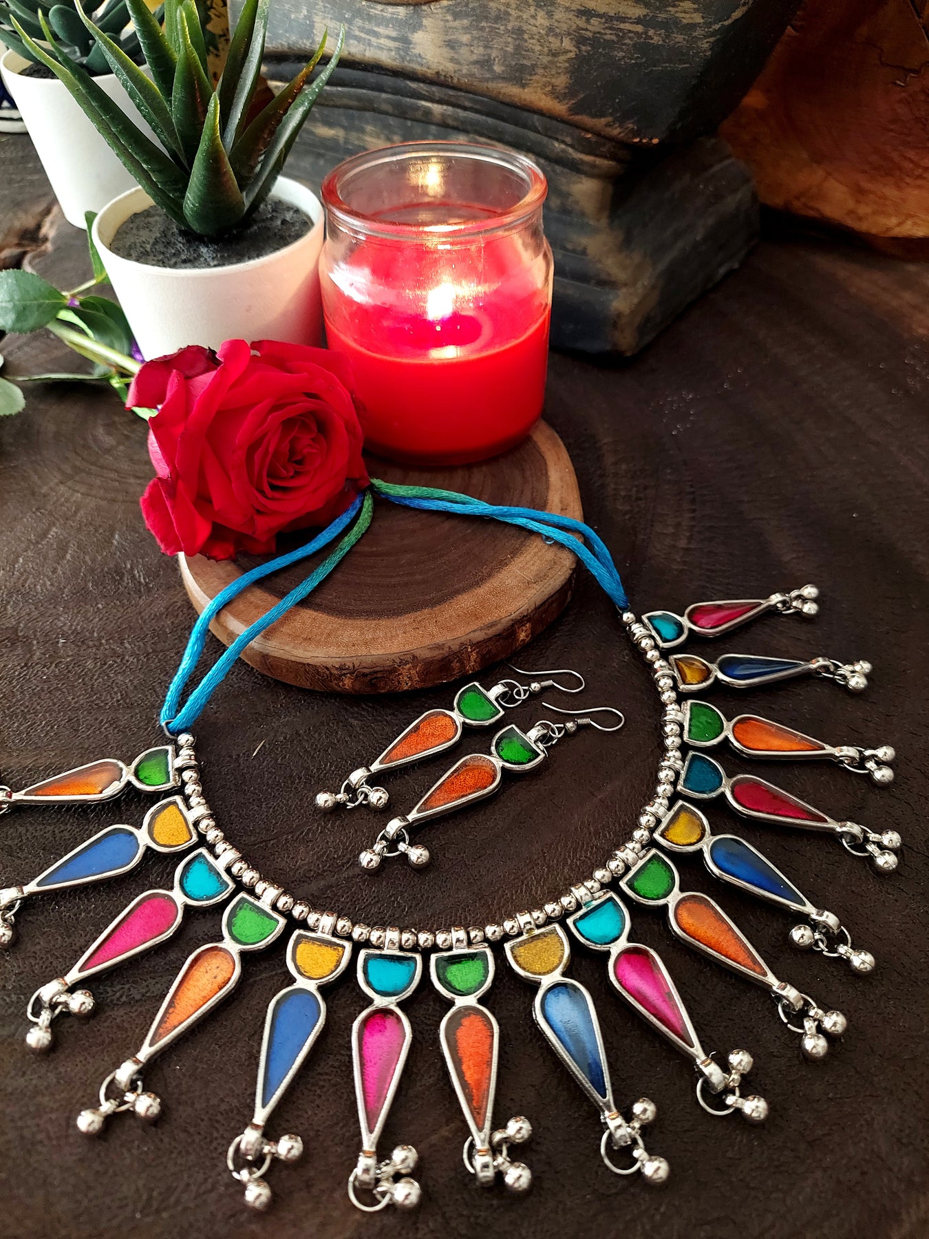 A multi-colored silver set with an antique finish is coupled with a circle neckpiece and a drop earring. The neck-piece is adorned with intricate embellishments, including a tribal design that runs along your delicate neck. Make a statement with this piece by pairing it with a garment.