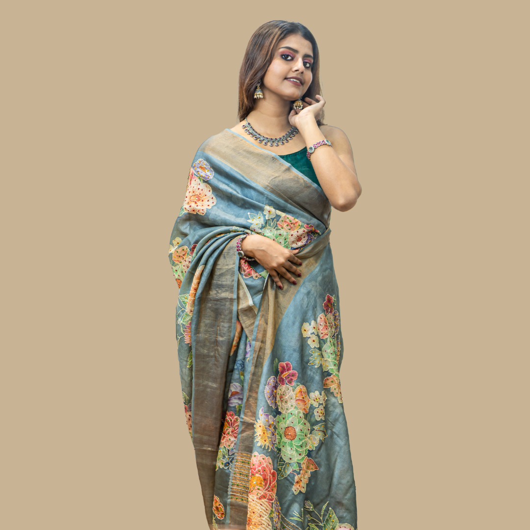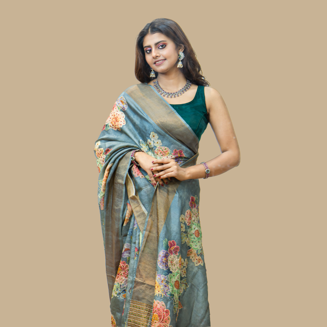 Size: S: 5.50Mtr B: 0.80MtrColour: light greyFabric: TUSSARPattern and print: A grey color tussar silk saree with a zari border sounds absolutely elegant! Adding colorful flower designs all over the saree would create a beautiful contrast against the grey base. Hand kantha and sequence embroidery highlights would add intricate detailing and texture to the saree, enhancing its overall appeal.Silk purity: Pack contains: 1 Saree, 1 BlouseCare instructions: Dry wash