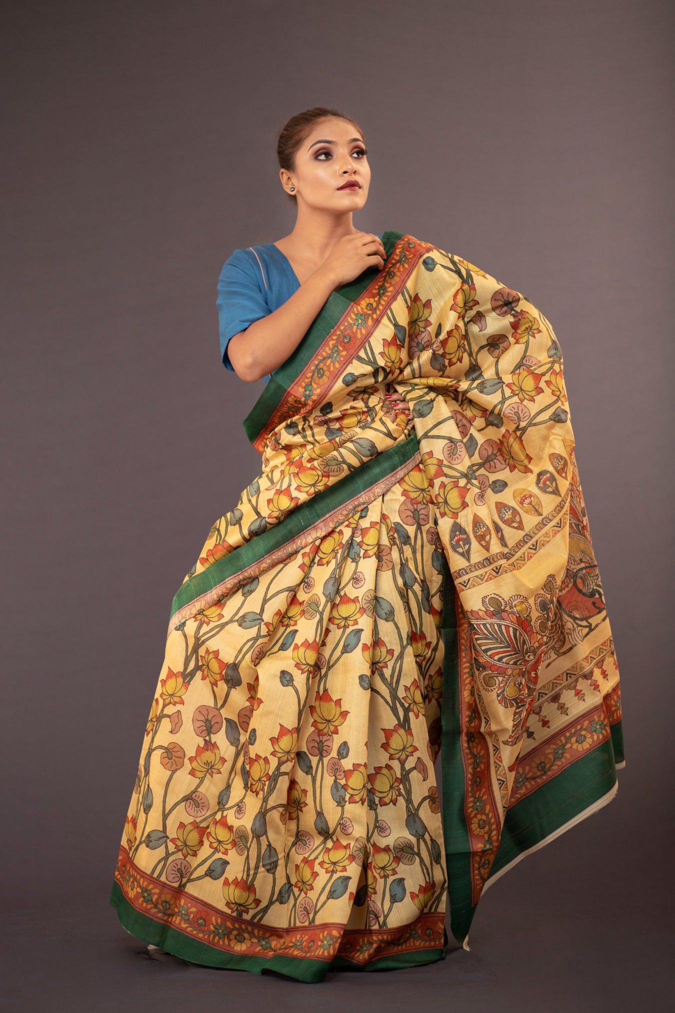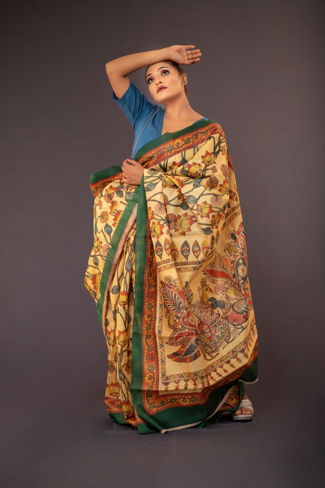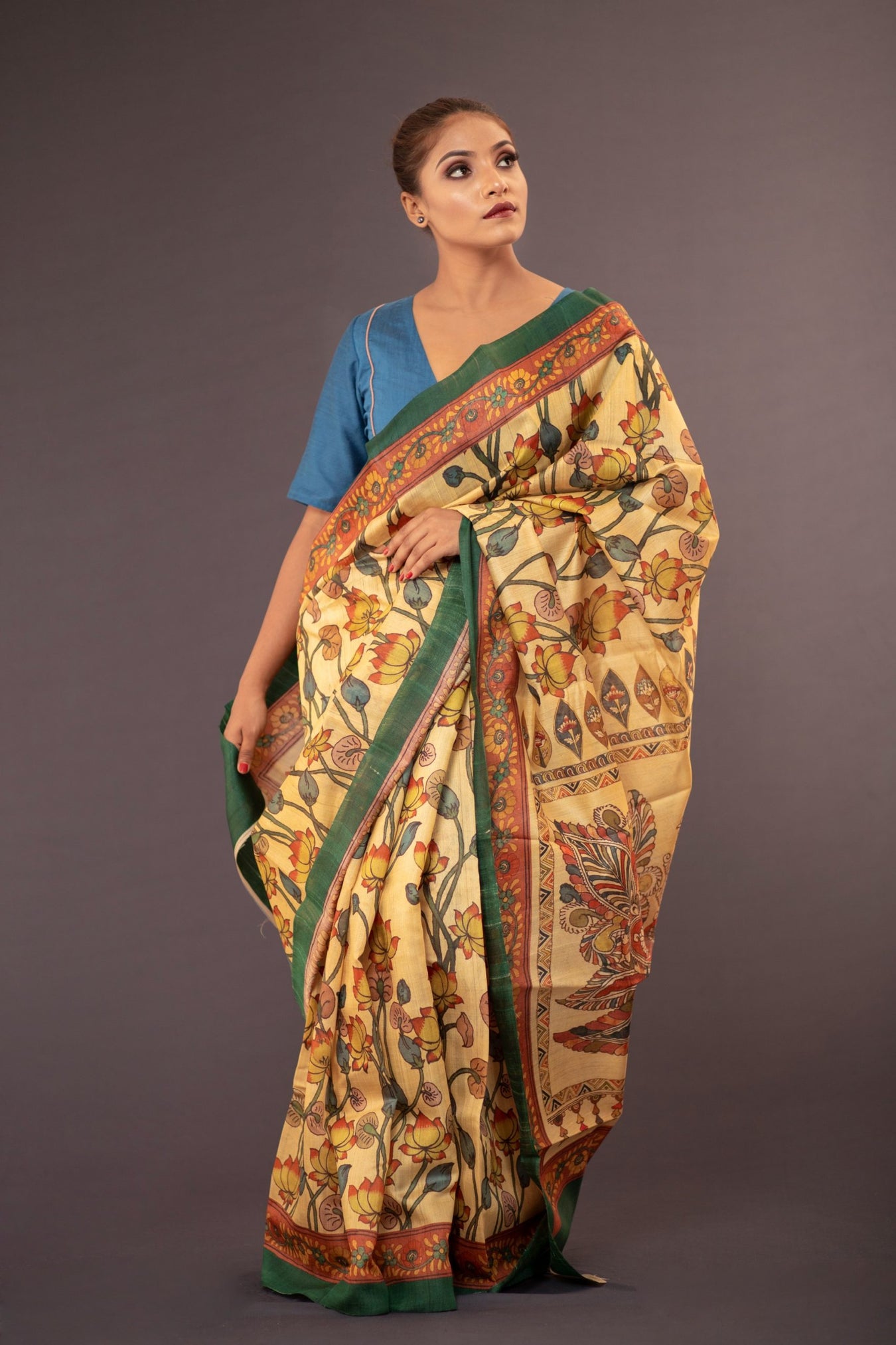 Size: S: 5.50Mtr B: 0.80MtrColour: YELLOWFabric: TUSSAR Pattern and print: Kalamkari jaal prints all over the body and intricate peacock prints on the pallu done on rich Tussar silk saree, highlights Indian tradition and craft to an extent of modern sophistication and style. Draping this richly decorated saree gives a sense of pride and beauty.