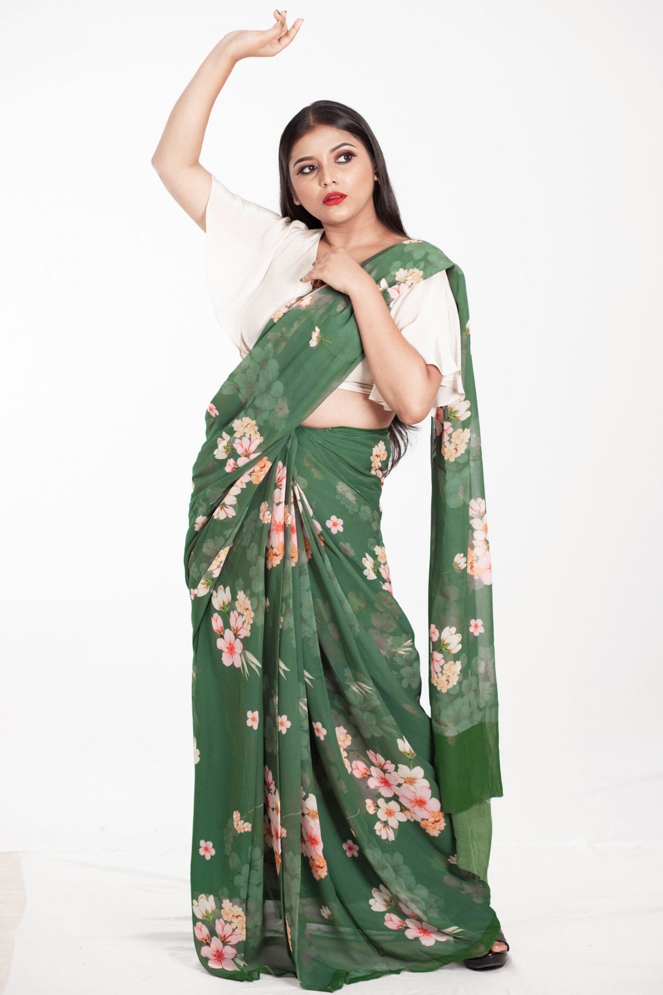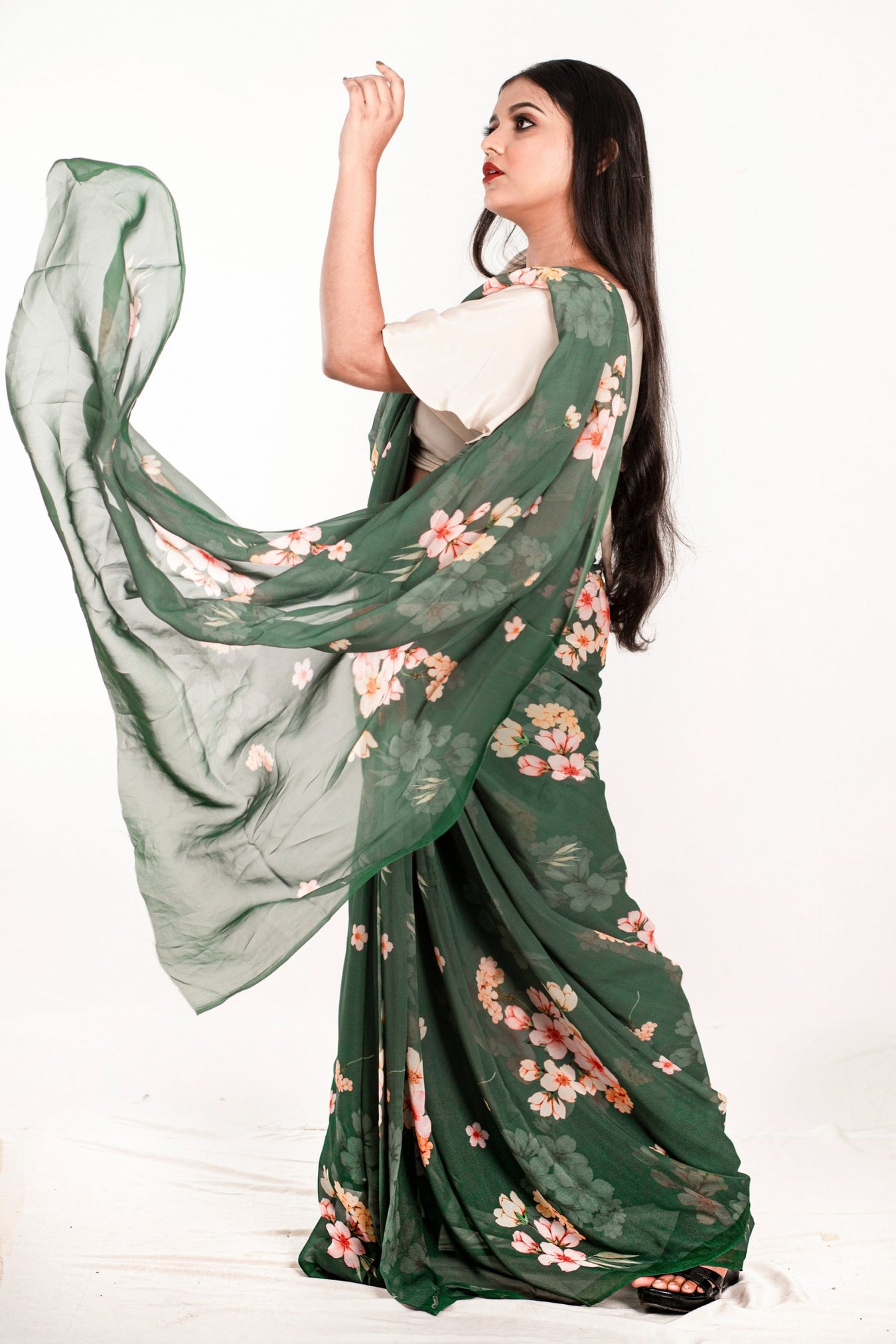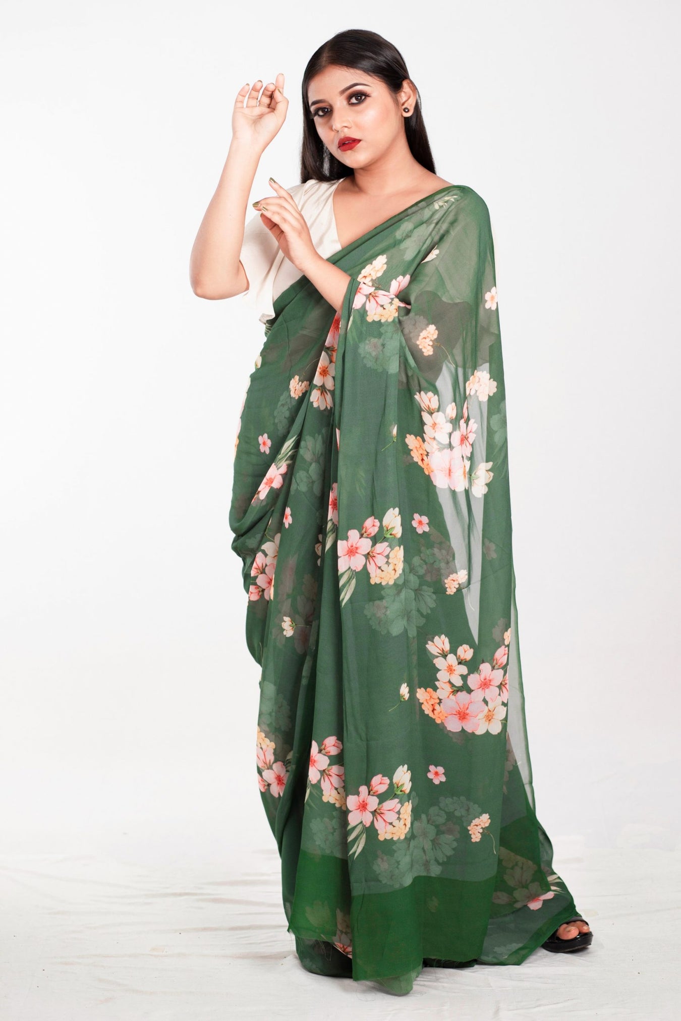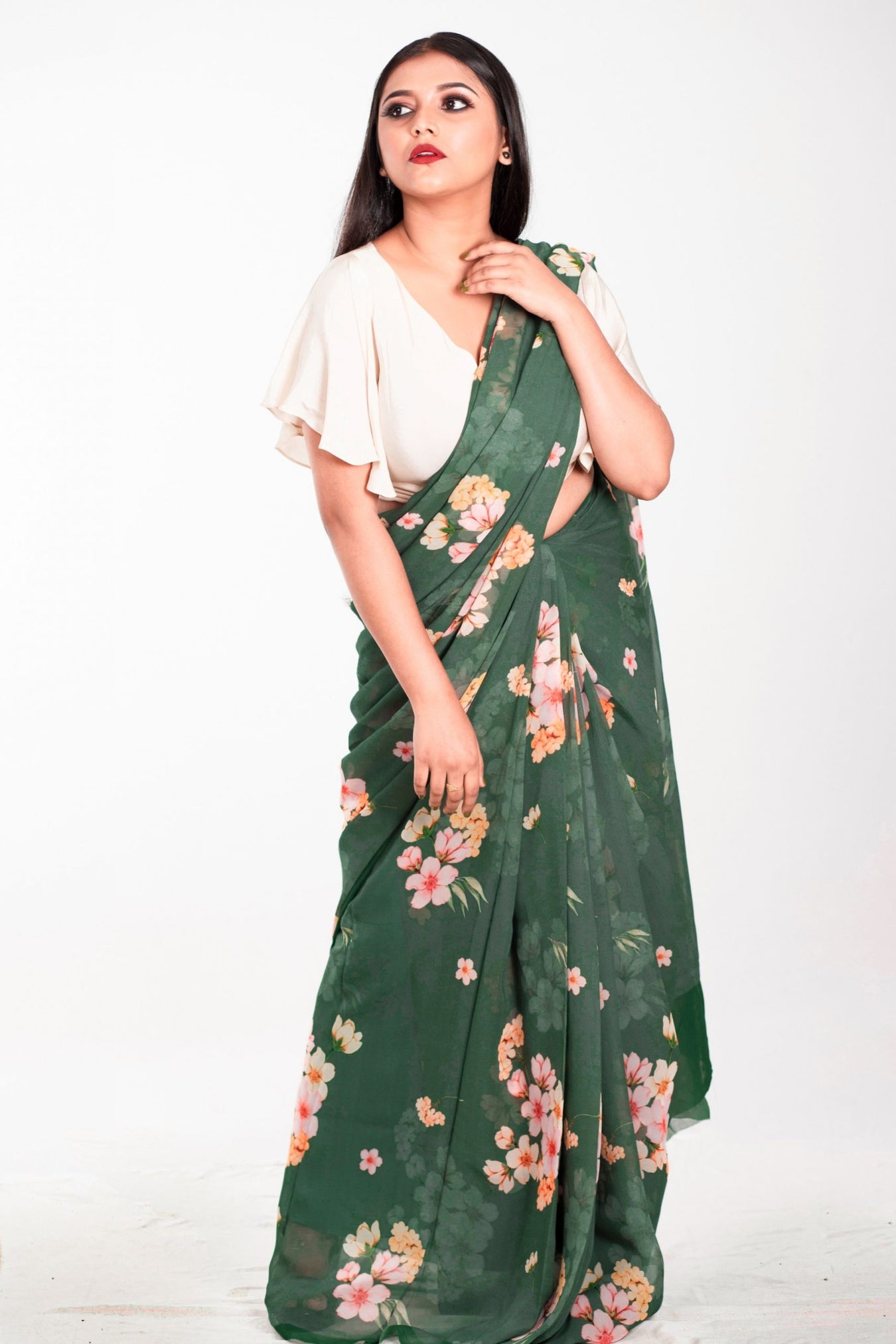 Colour: GreenFabric: GeorgettePattern and print: Flowery bunch printed on fresh bottle green serene Georgette saree, gives a smooth, soft to touch, flowy drape. A trendy piece, in terms of color, and prints, this saree is a "must have" piece in the wardrobe. The subtle beauty of the natural colors bring you close to the nature, and flaunt yourself with a freshness like that of the nature's breath.