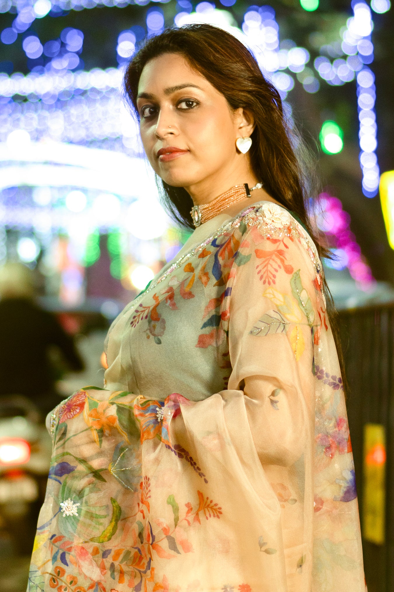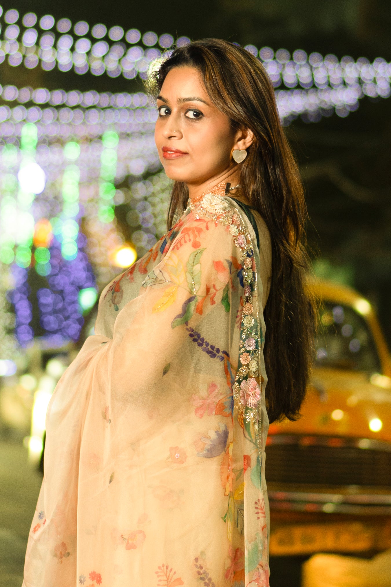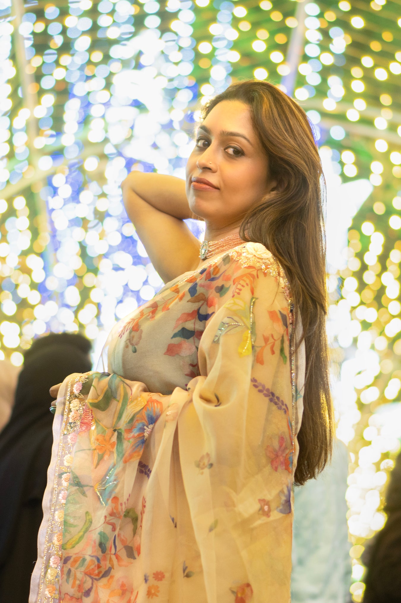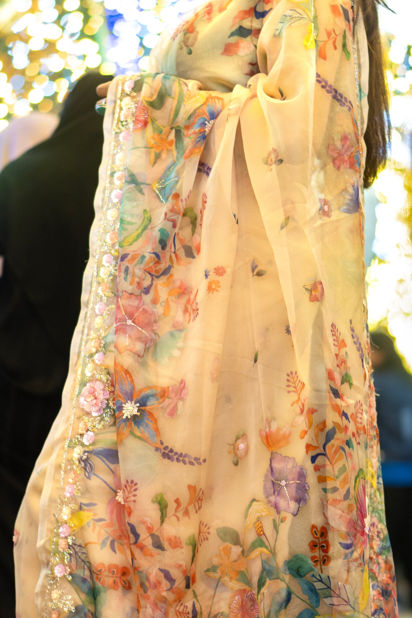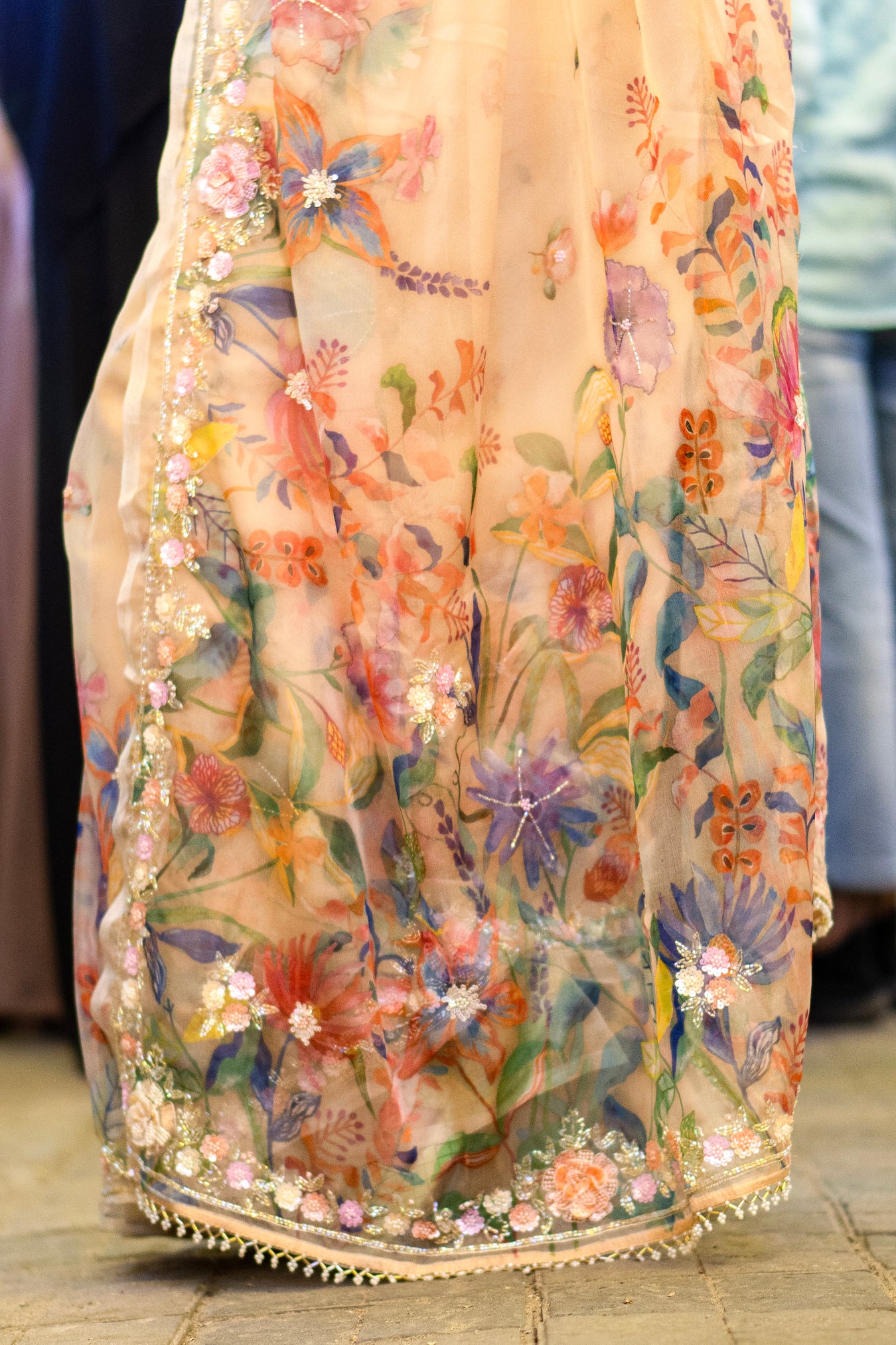 Size: 5.50Mtr B: 0.80MtrColor: Pastel PeachFabric: ORGANZAPattern and print: This Pastel shaded organza with multicolor floral digital print, embraces yourself in the most beautiful way. The Saree is highlighted with sequins and pearl work all over, pearl tassels attached making it look more elegant and pure. Care instructions: Dry wash