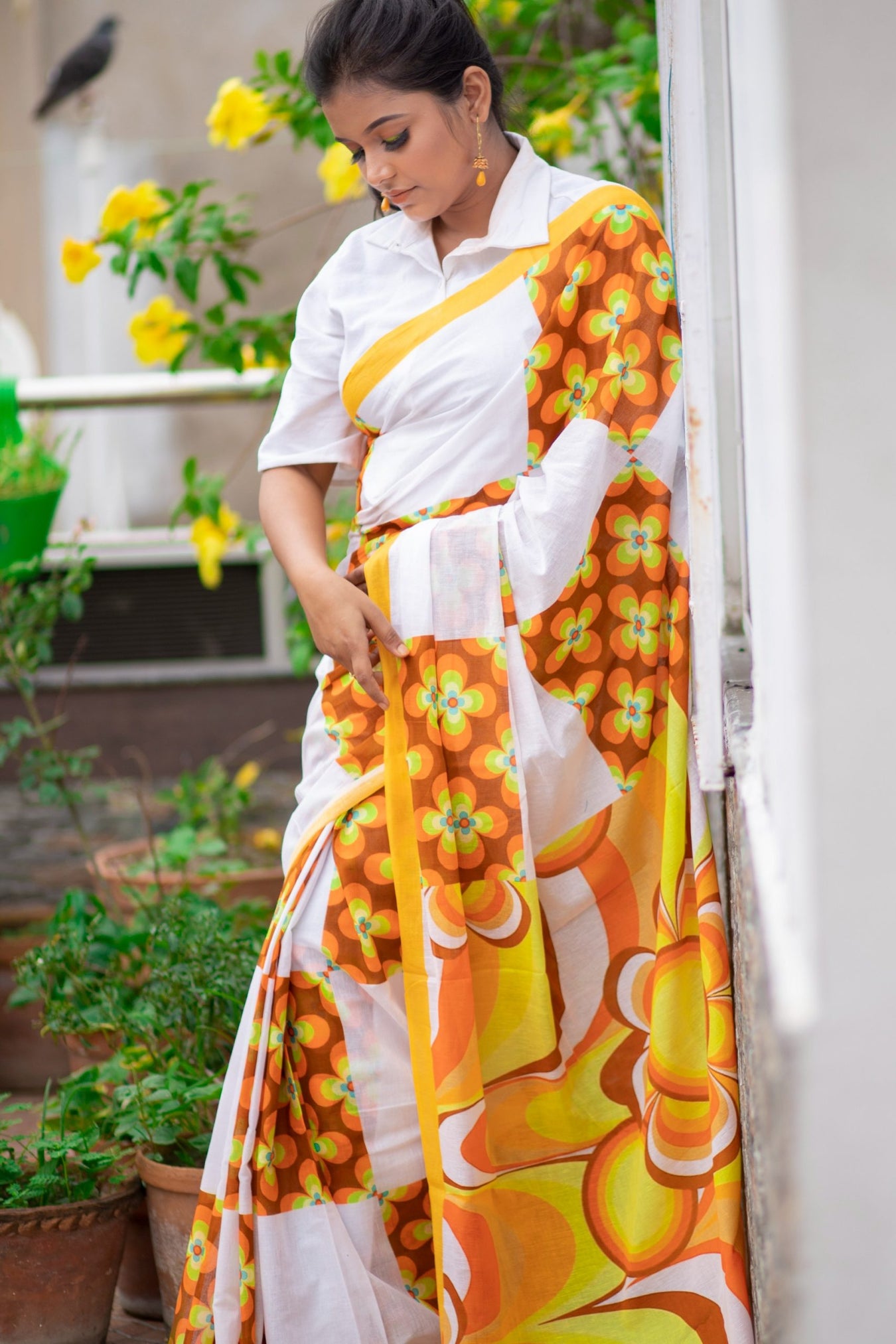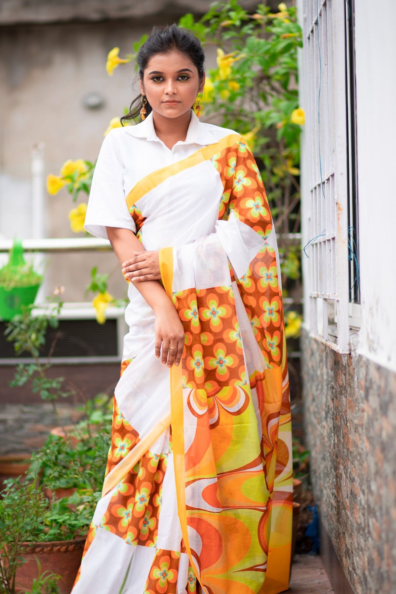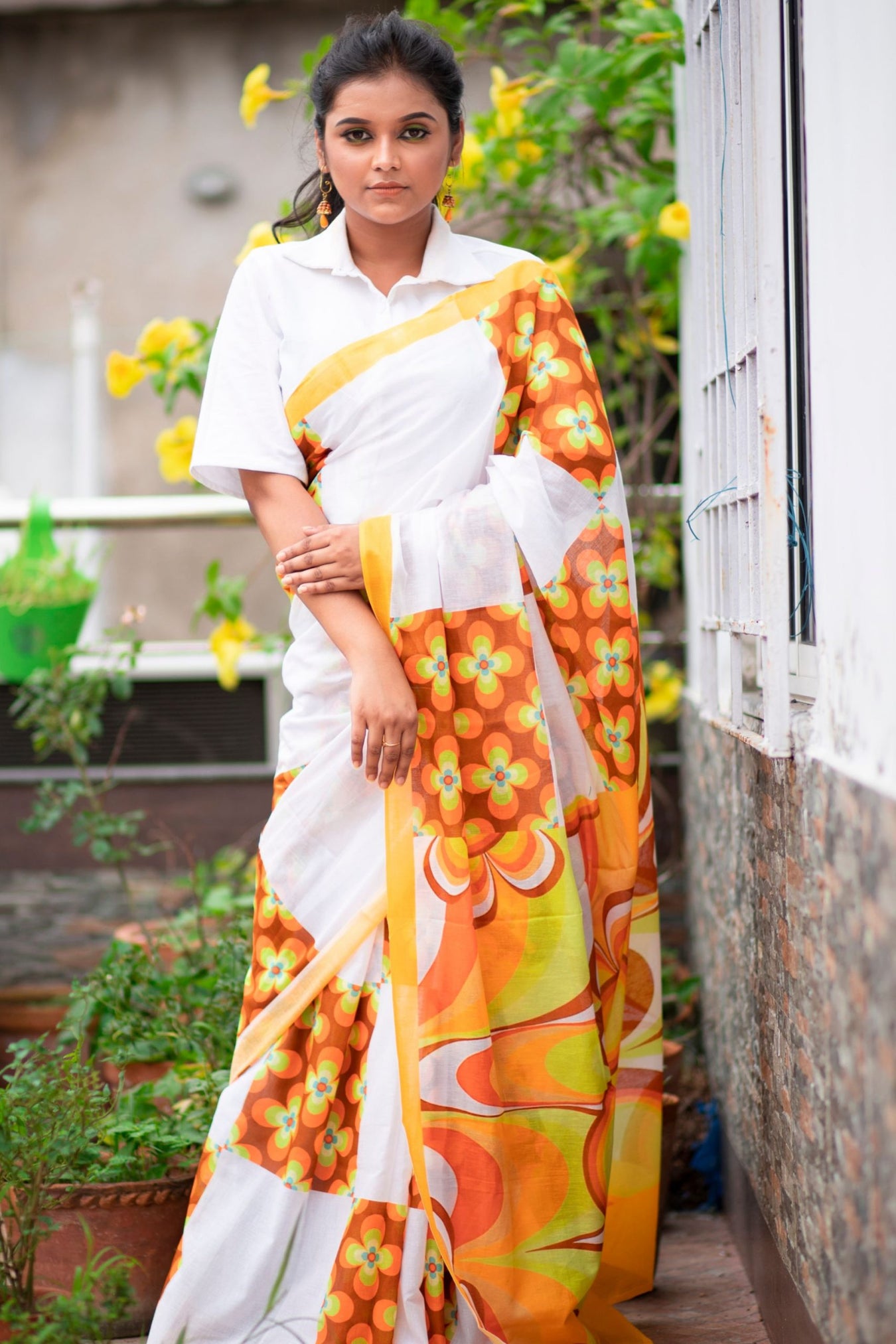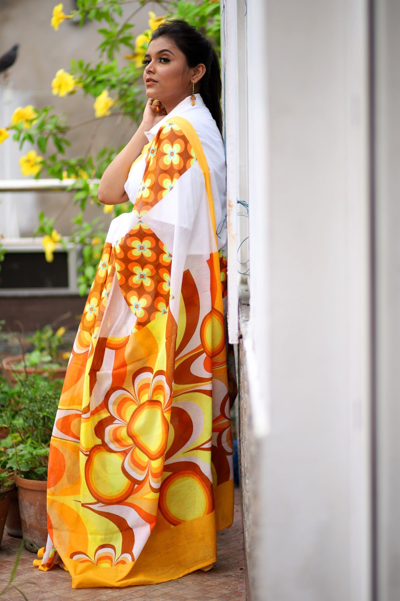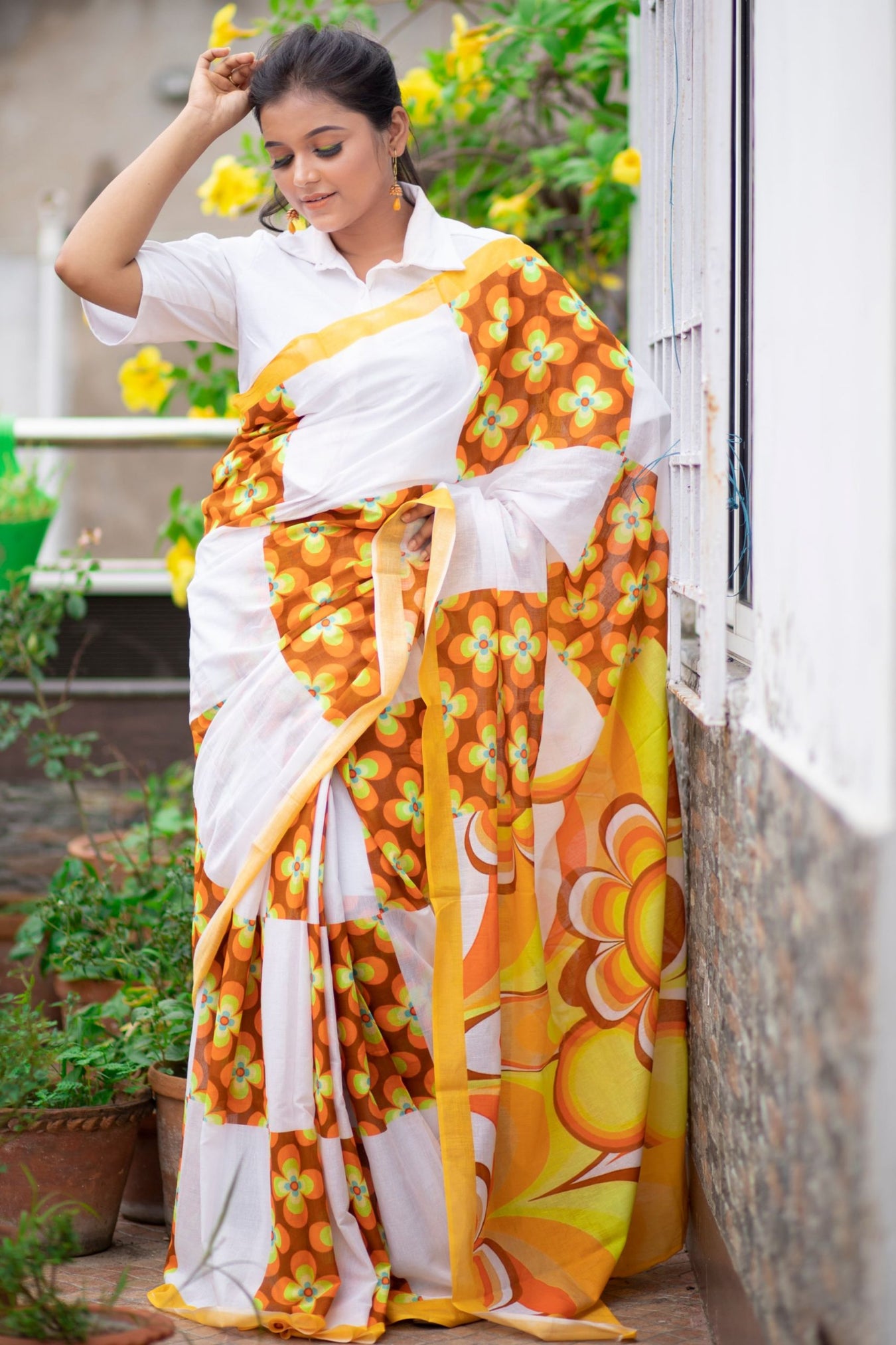 Colour: whiteFabric: MulmulPattern and print: Retro clubs printed on natural mulmul saree is a pop favorite in the section. Vibrant, hues of orange, yellow, browns, on an ivory white base makes it stand out in the wardrobe. Making this piece a statement for sophistication and class. The bright colors on the white subtle base makes an extravagant look with subtle sophistication and soft beauty.