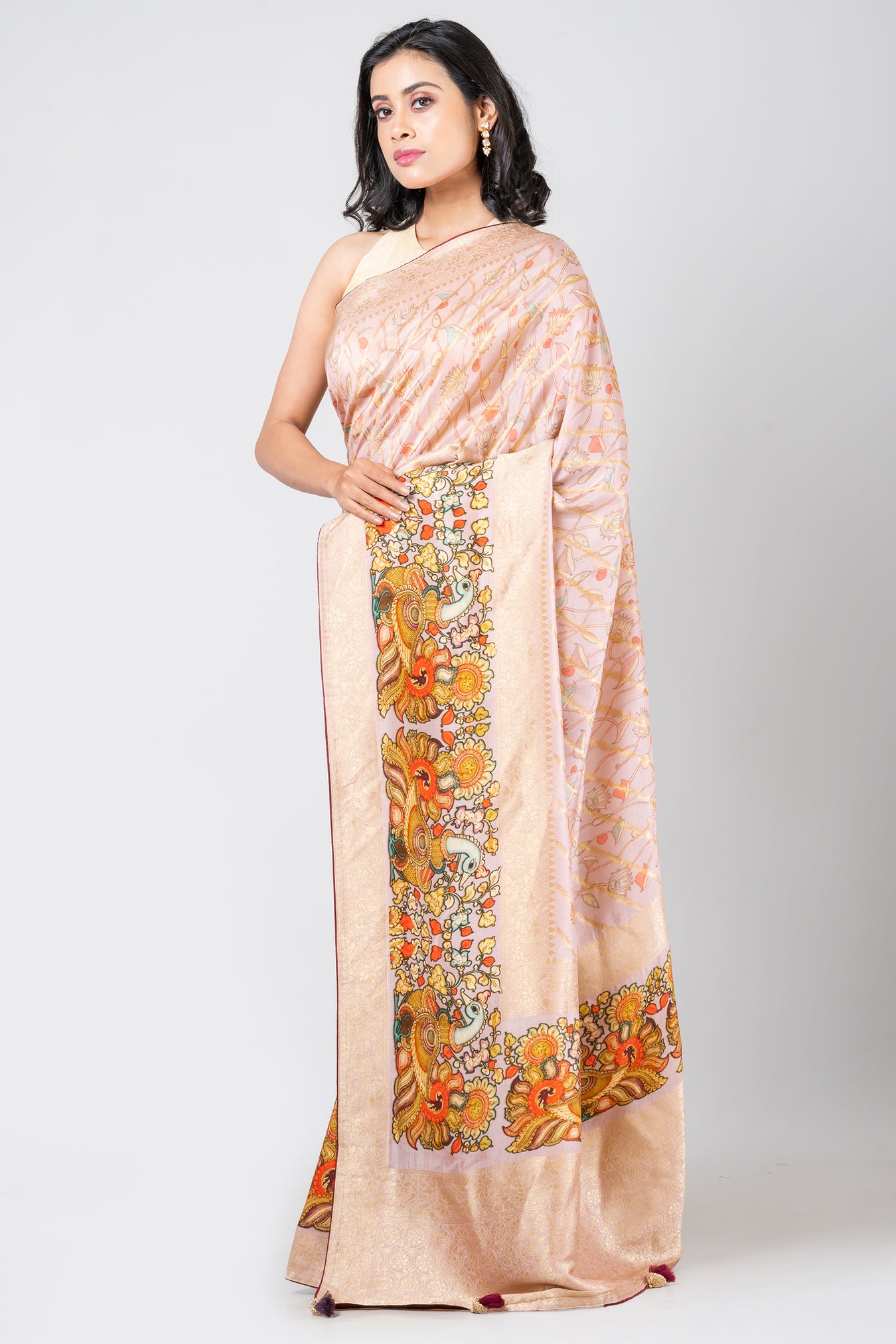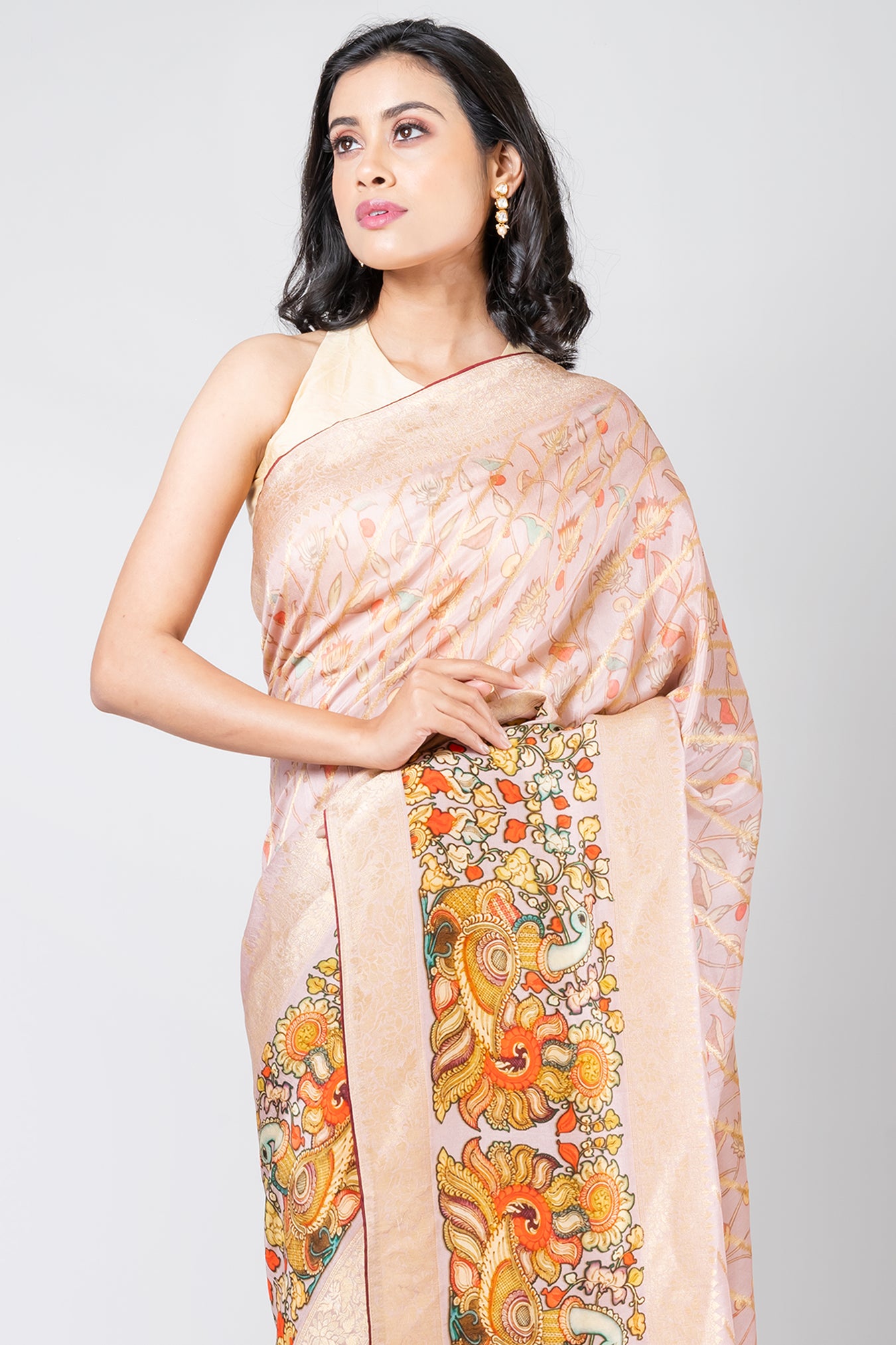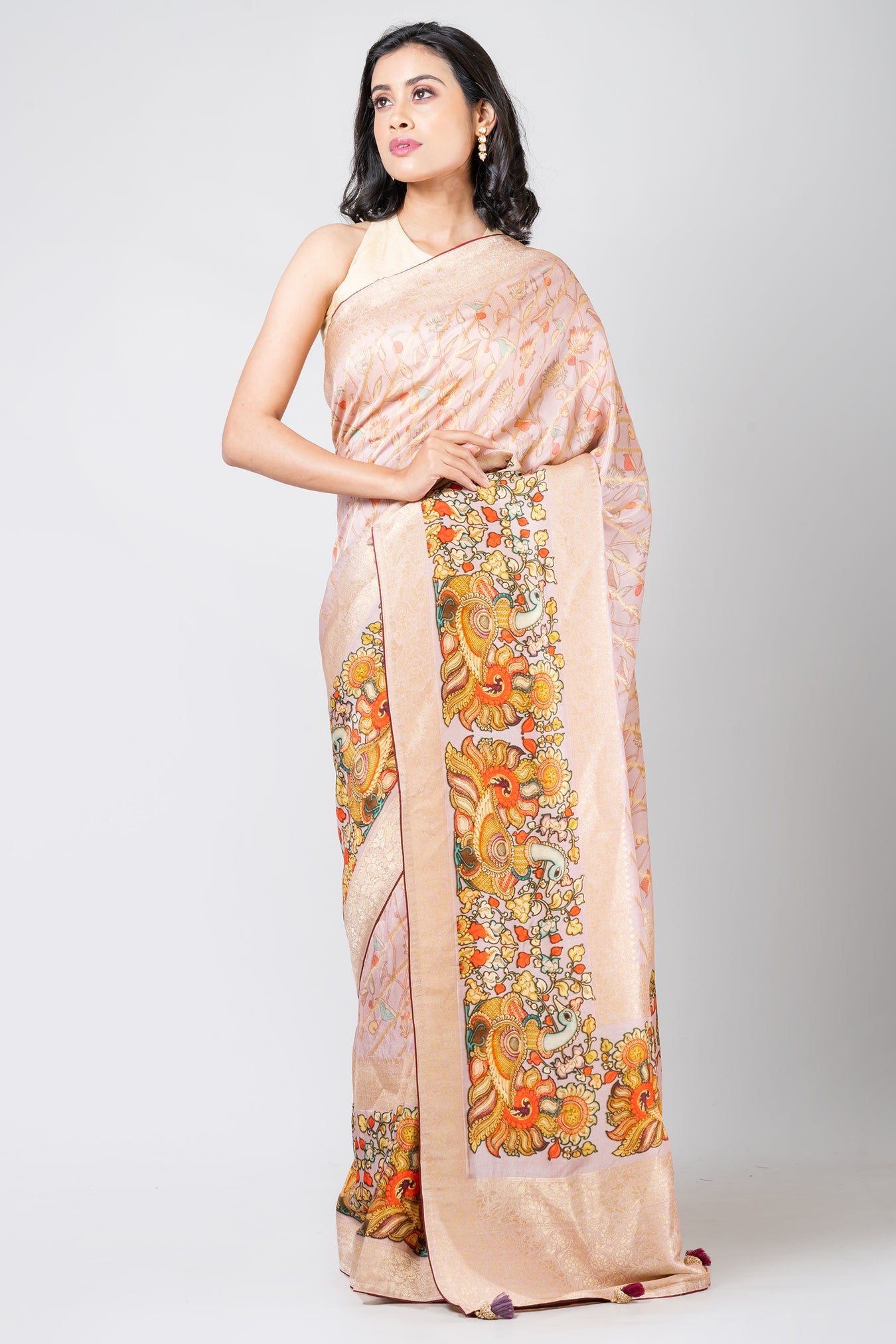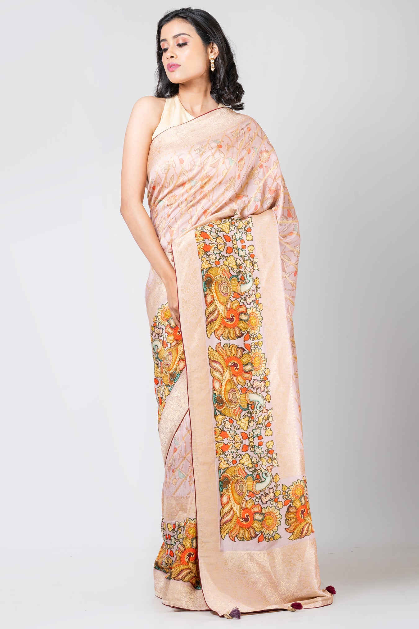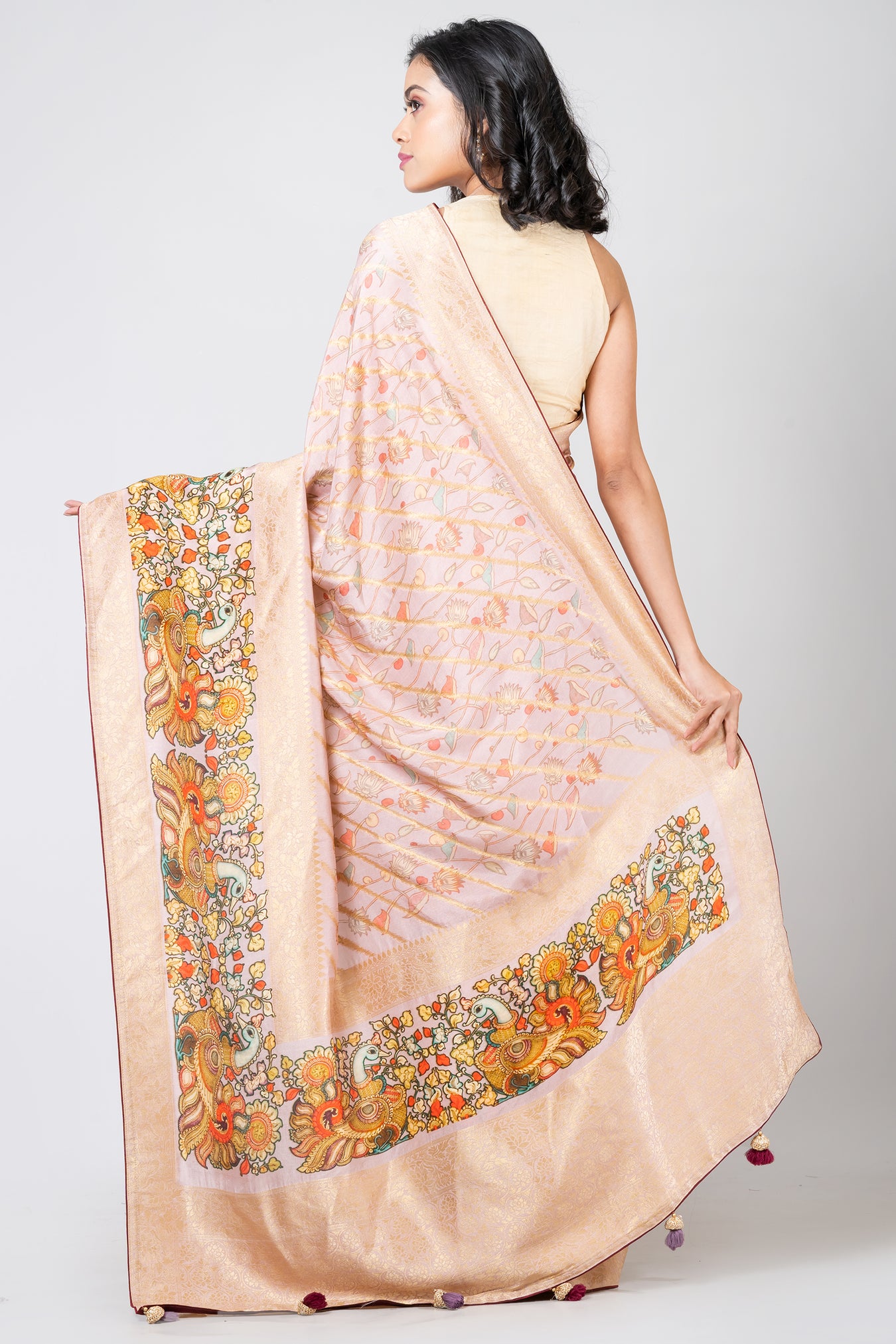 Size: S: 5.50Mtr B: 0.80MtrColour: CREAMFabric: DOLA LEHARIYAPattern and print: It features a heavy Kalamkari border, which adds a traditional touch, allover saree zari lahriya work, blending contemporary and traditional elements beautifully. Additionally, the heavy zeri border adds a touch of opulence and completes the look with eleganceSilk purity: Pack contains: 1 Saree, 1 BlouseCare instructions: Dry wash