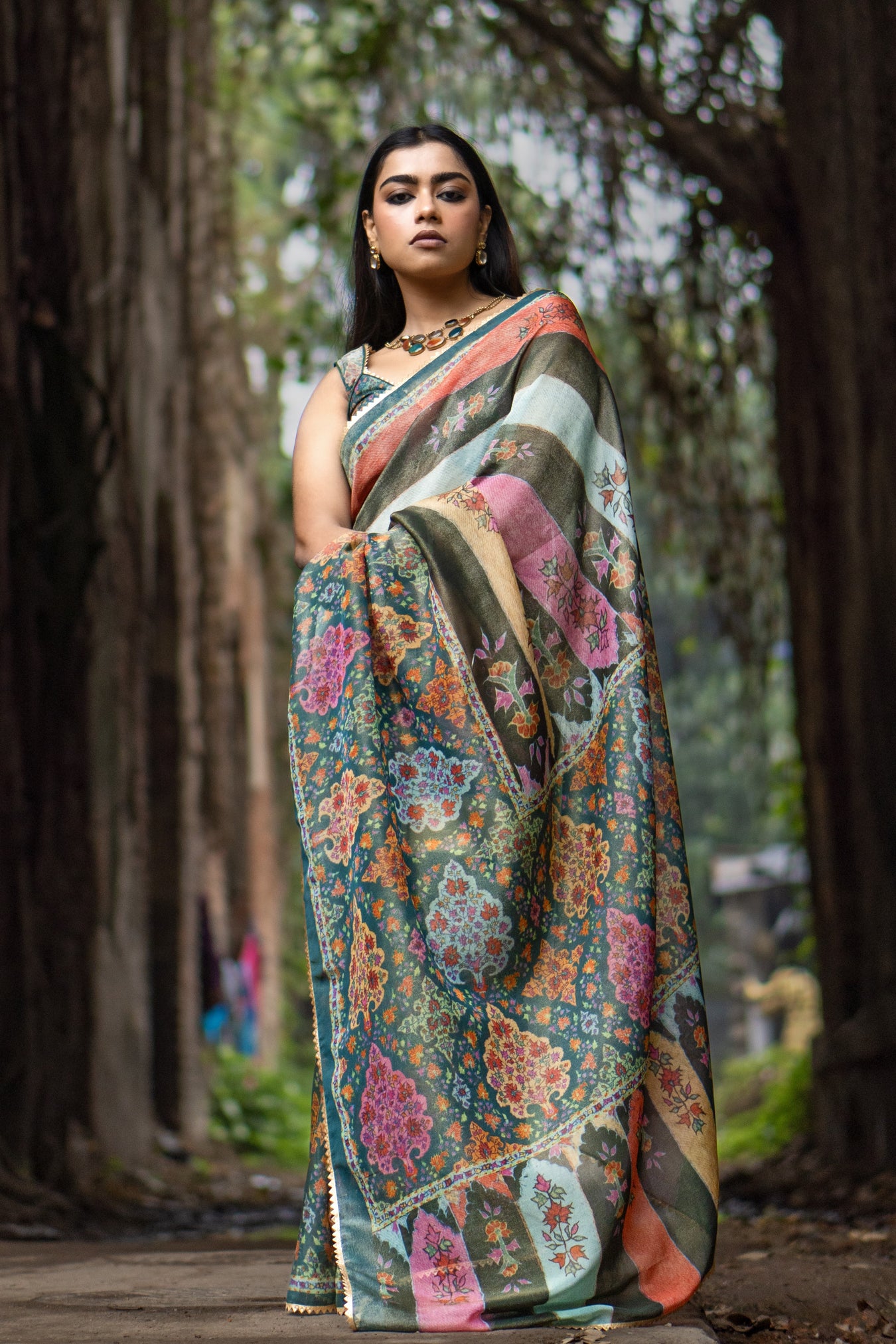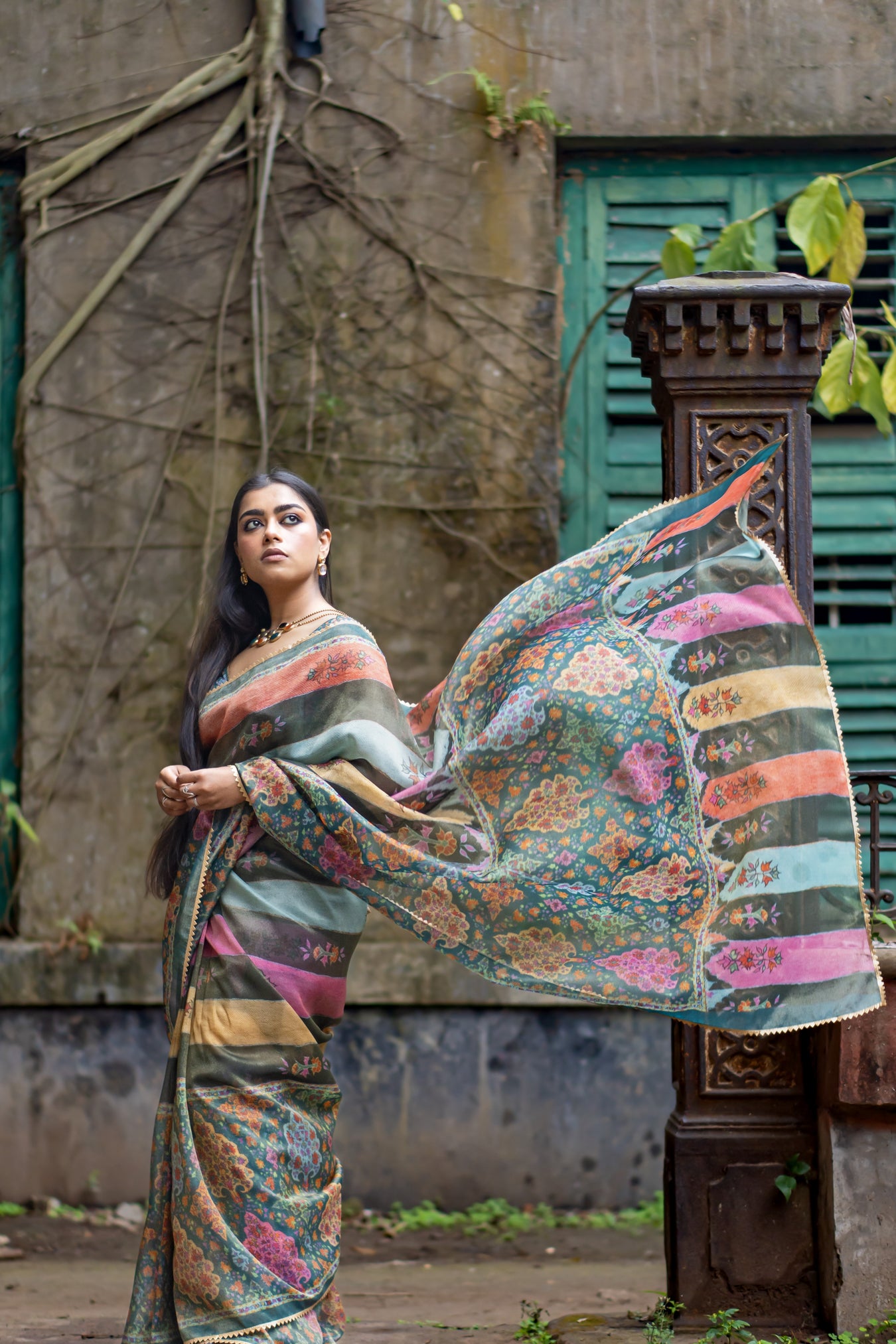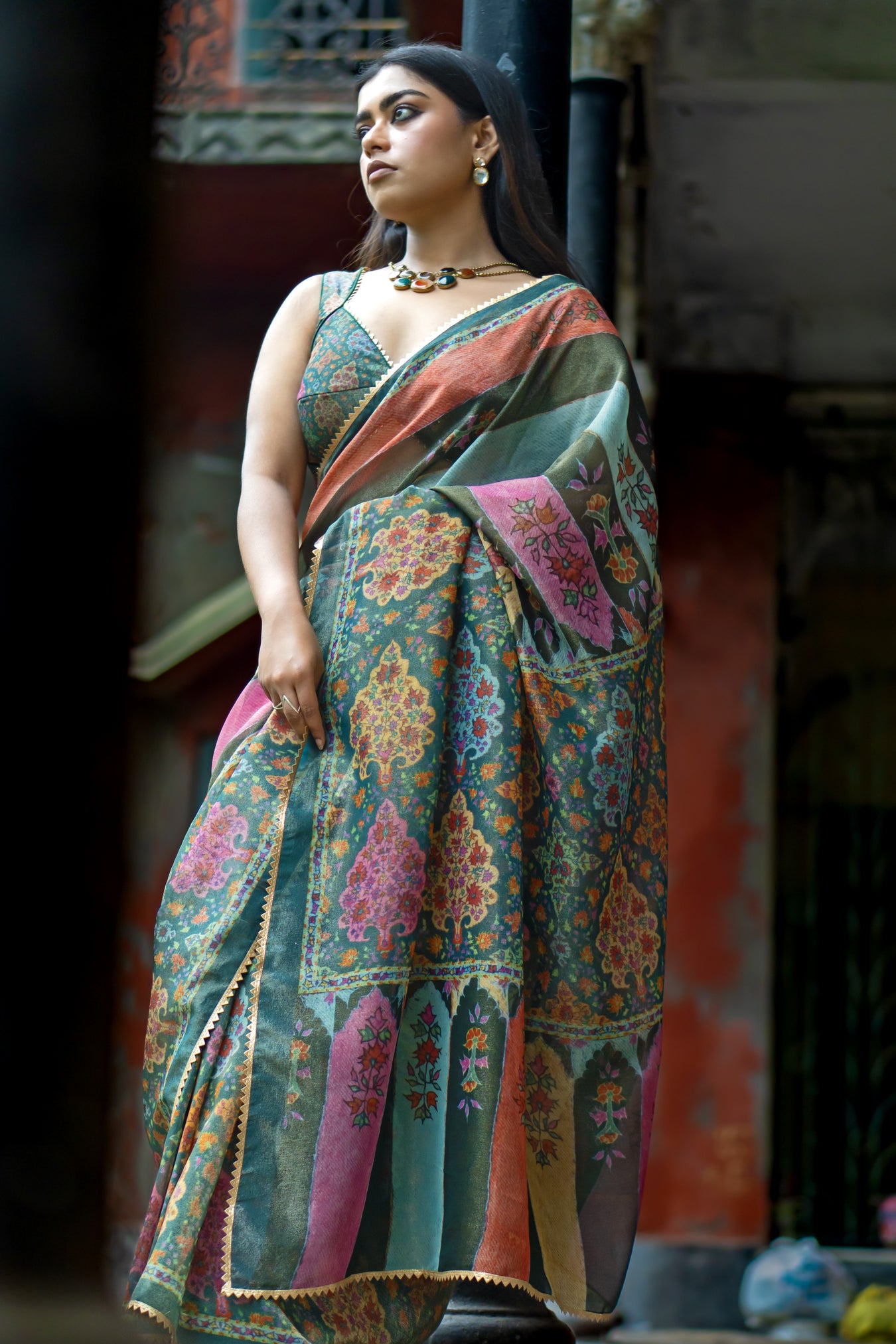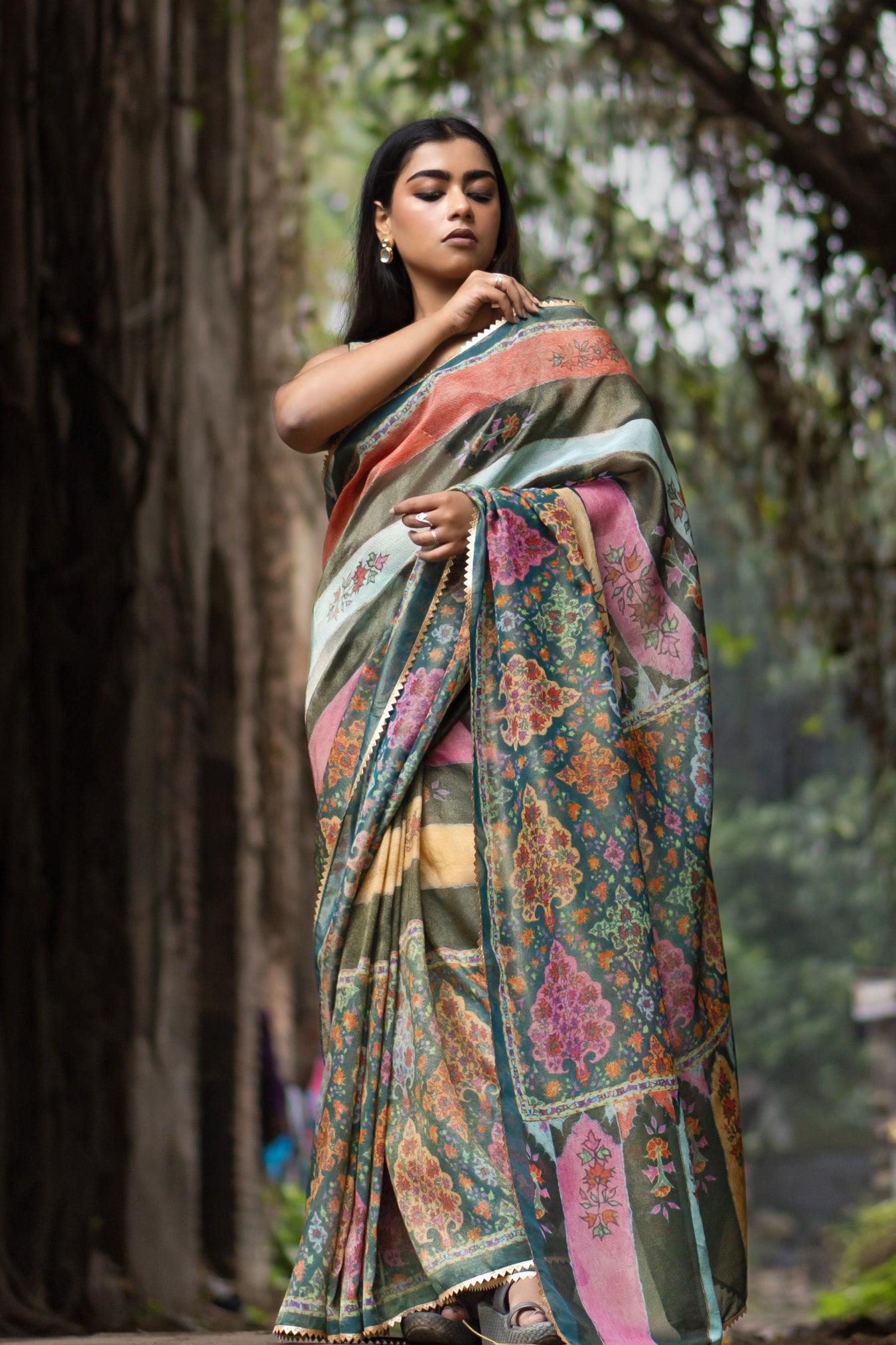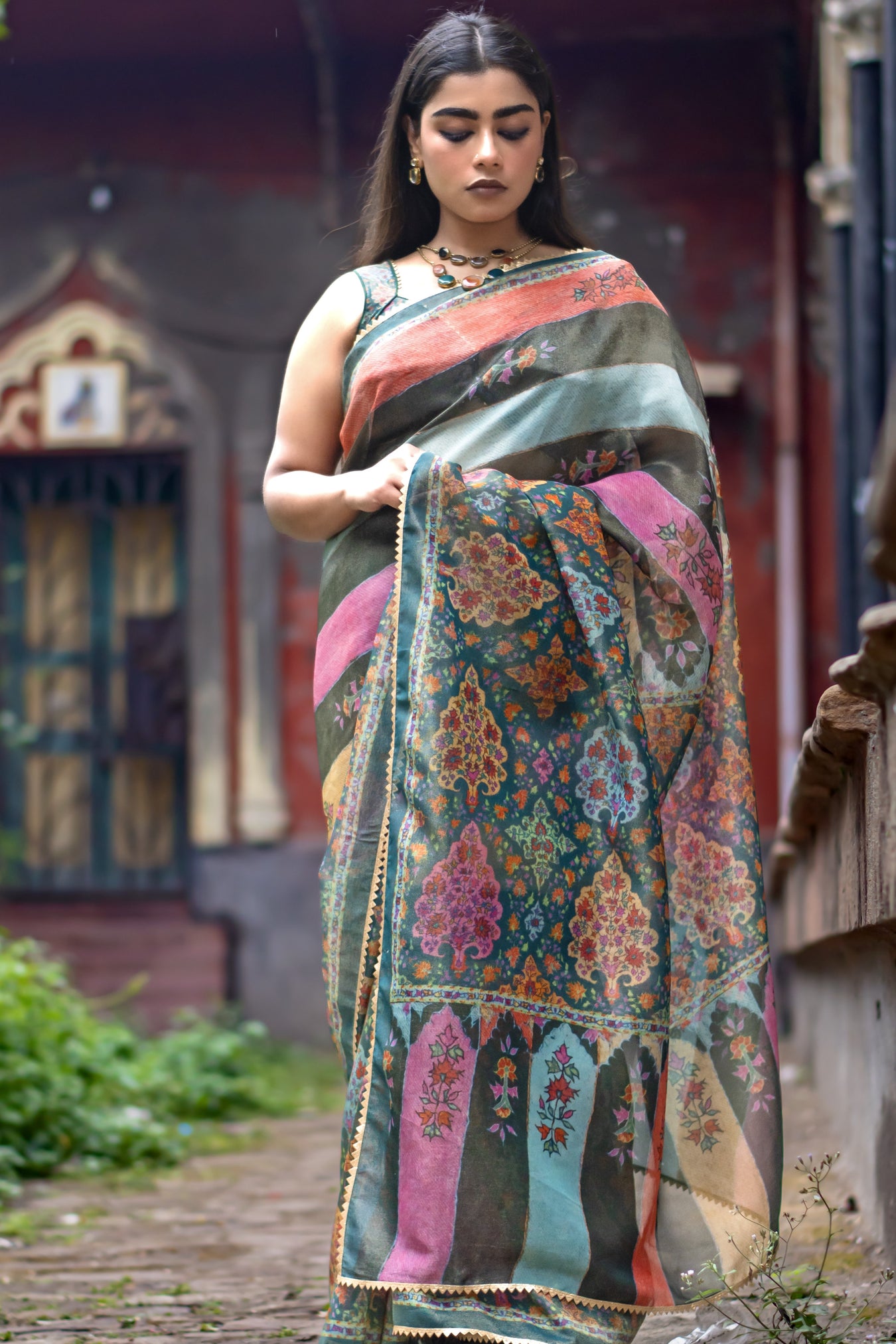 Pattern and print: Indulge in the simplicity and beauty of our half-and-half sari, where the luxurious feel of tissue silk meets the smoothness of tissue organza. This saree, in multi shade, is adorned with delicate Kani Embroidery digital prints, embodying the essence of pure femininity.