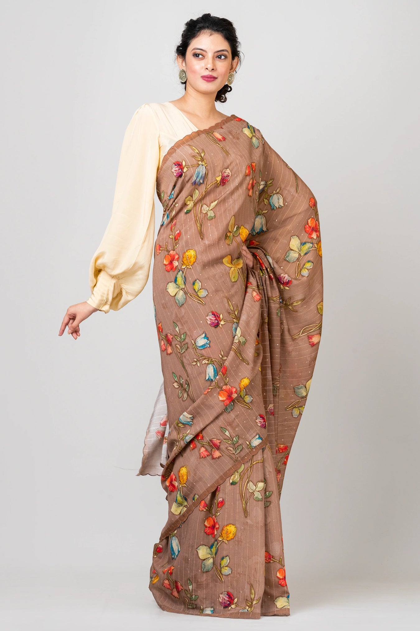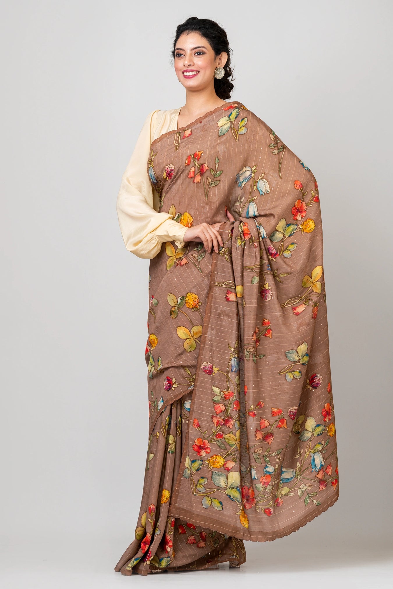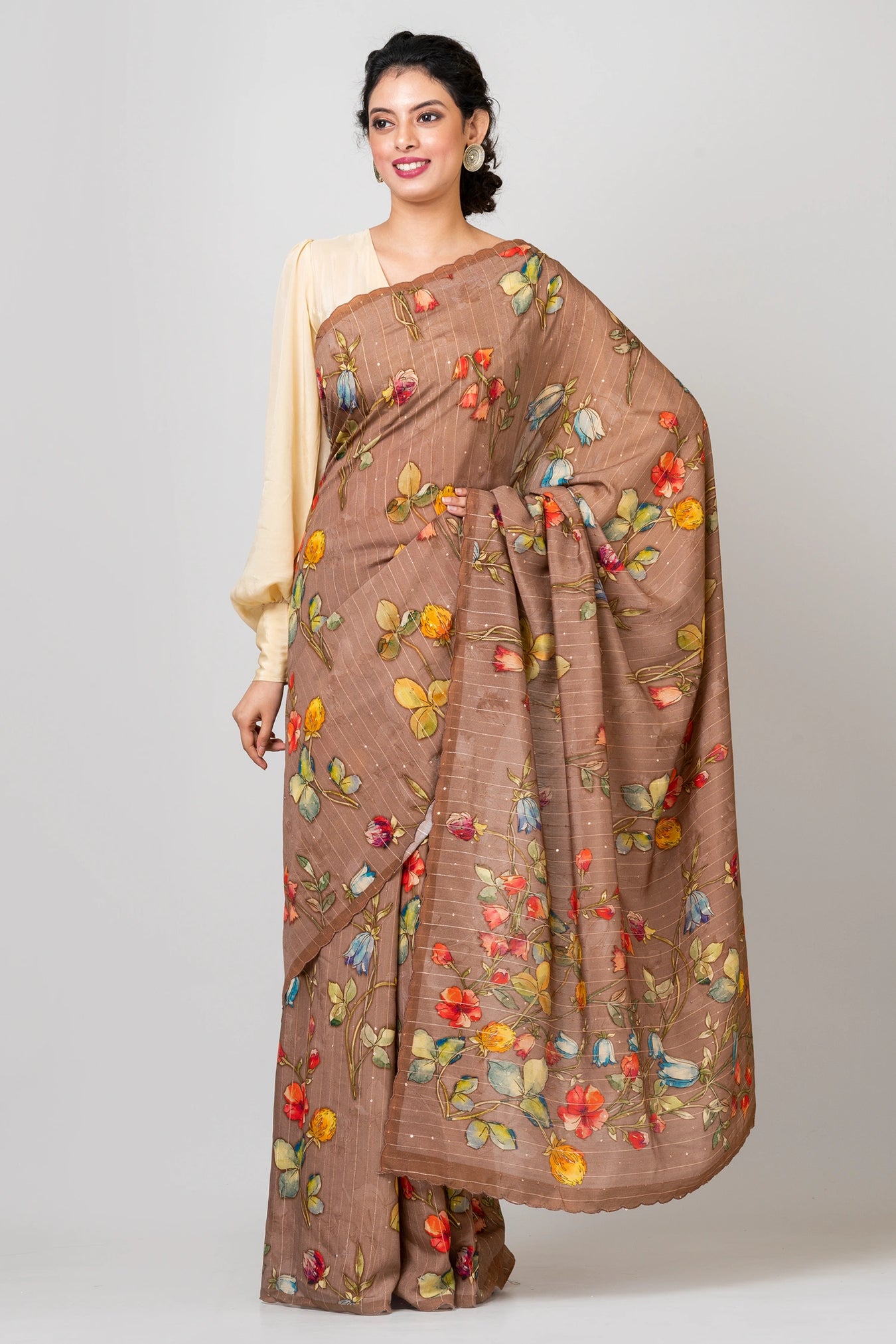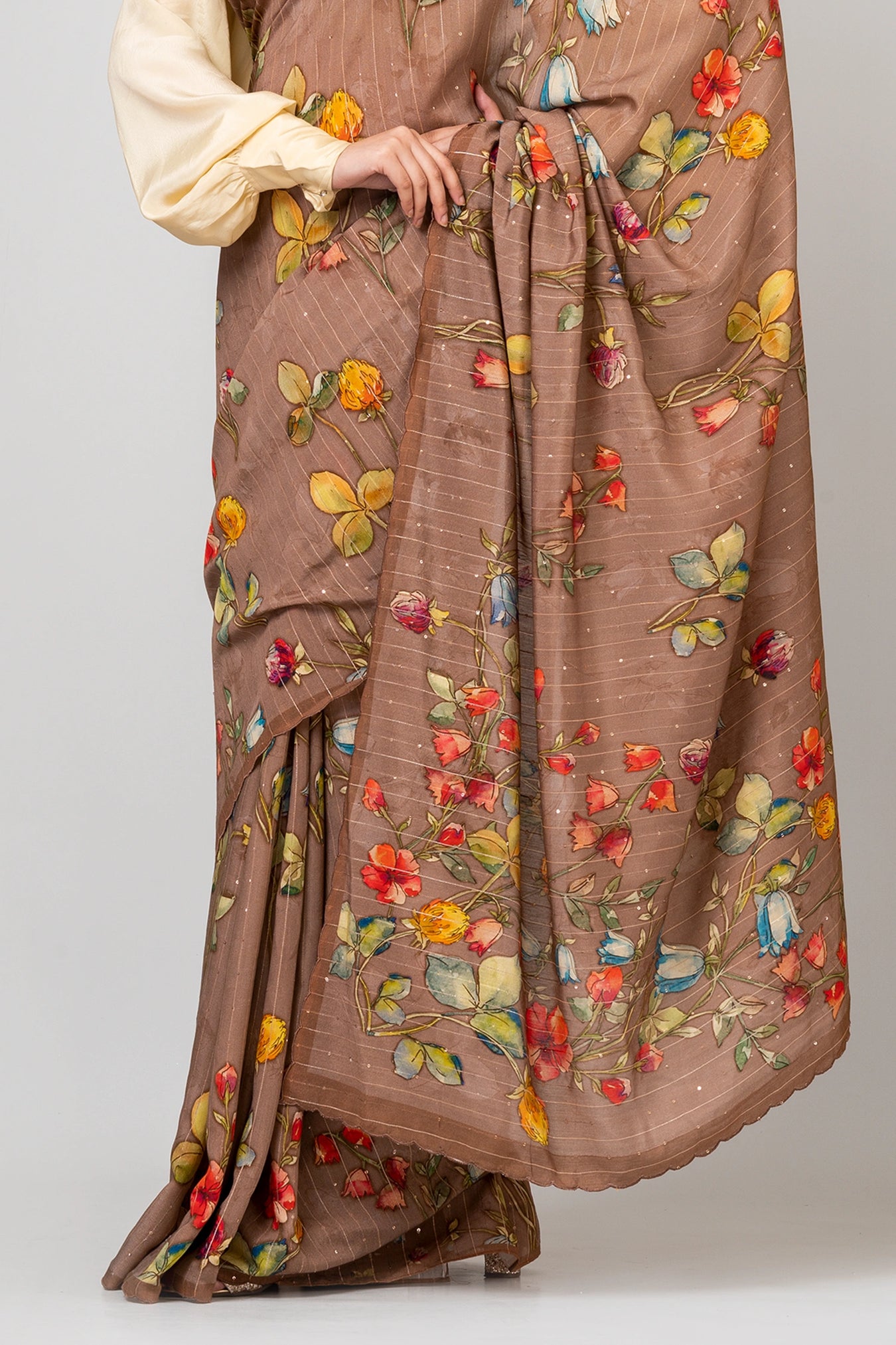 Size: S: 5.50Mtr B: 0.80MtrColour: BrownFabric: Woven Sequence CrepePattern and print: Step into the untamed beauty of our wild floral print saree, embellished with woven sequins. The bold and dynamic floral patterns exude a sense of freedom and liveliness, while the woven sequins add a touch of dazzling allure. Embrace the spirit of nature and style with this captivating ensemble, perfect for making a statement and celebrating your unique individuality.Purity: Natural fabricCare instructions: Dry wash