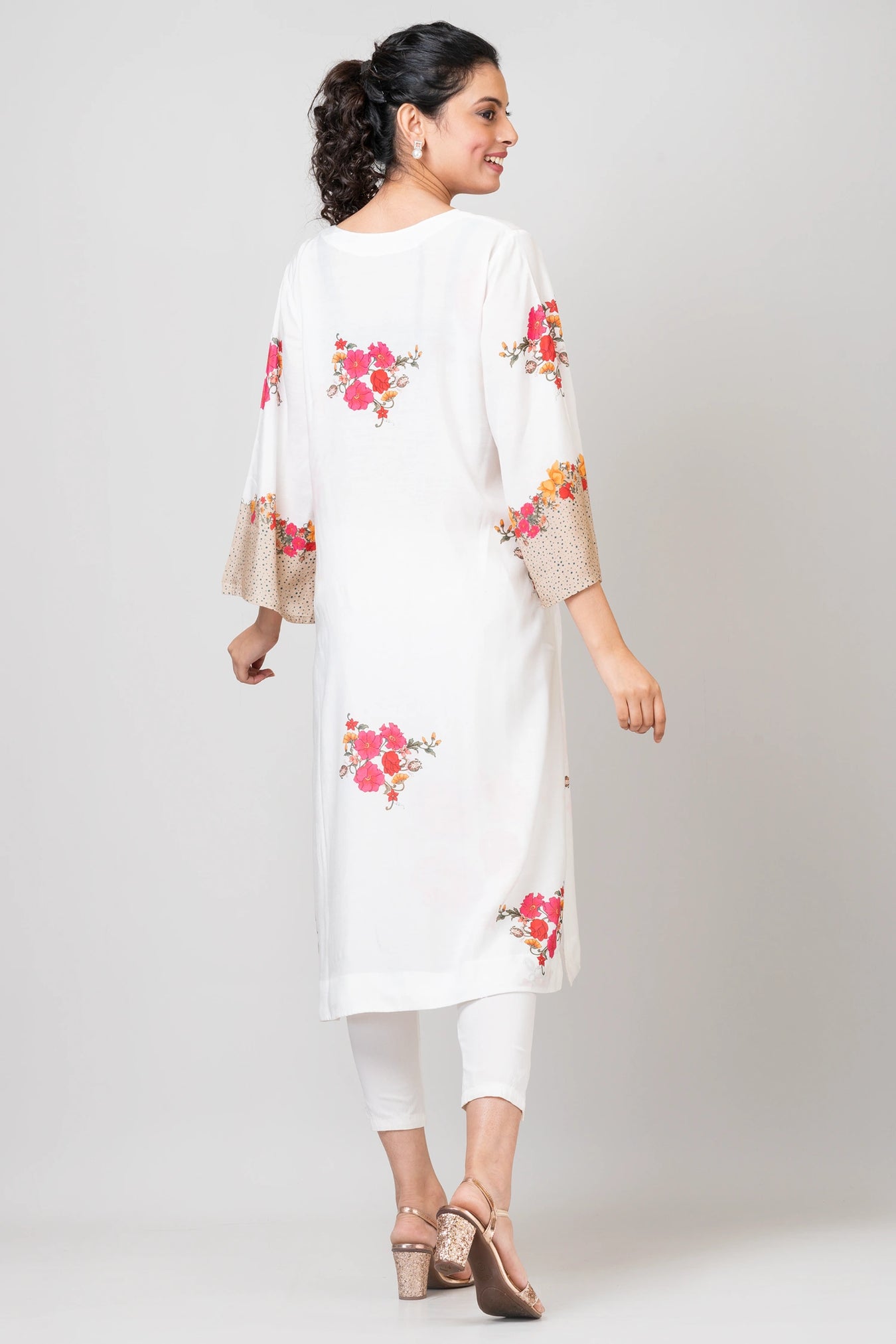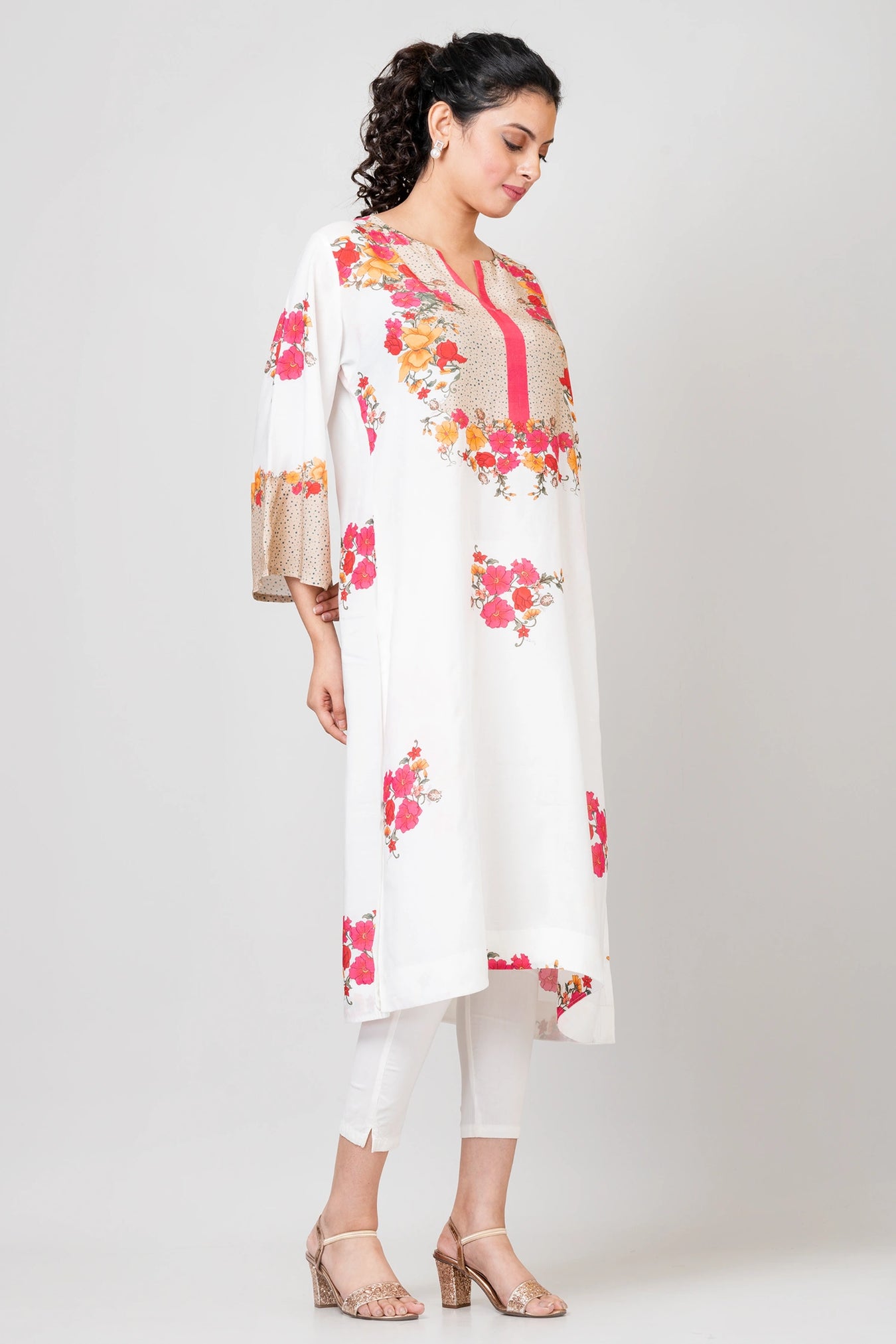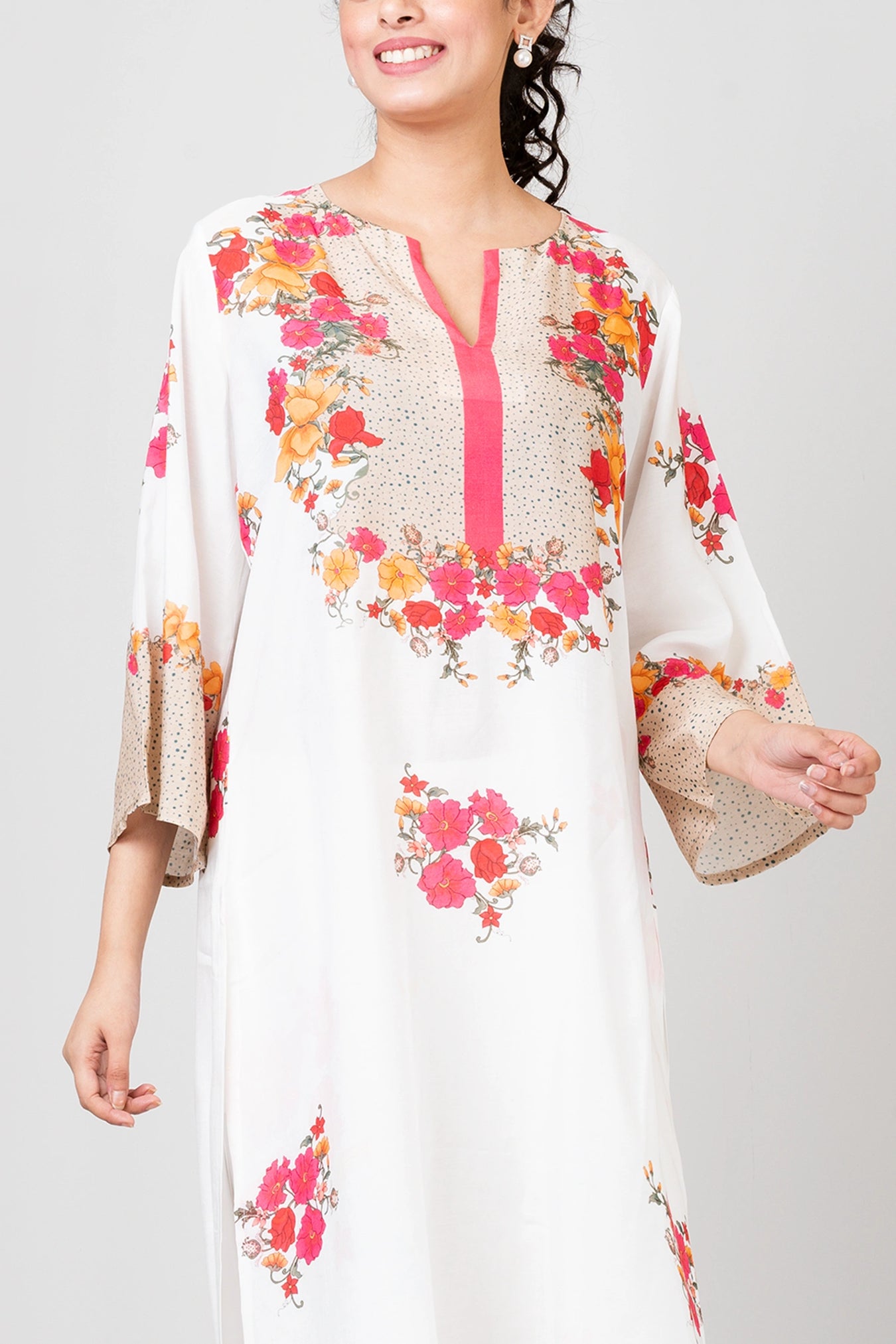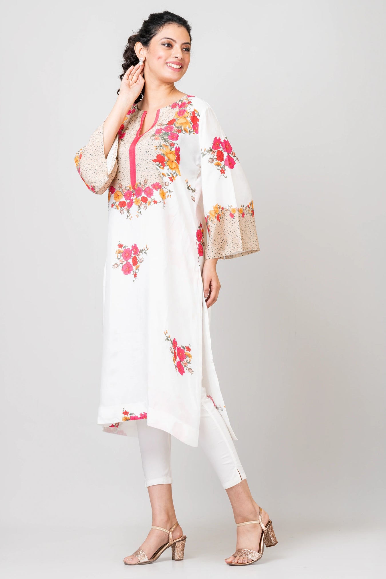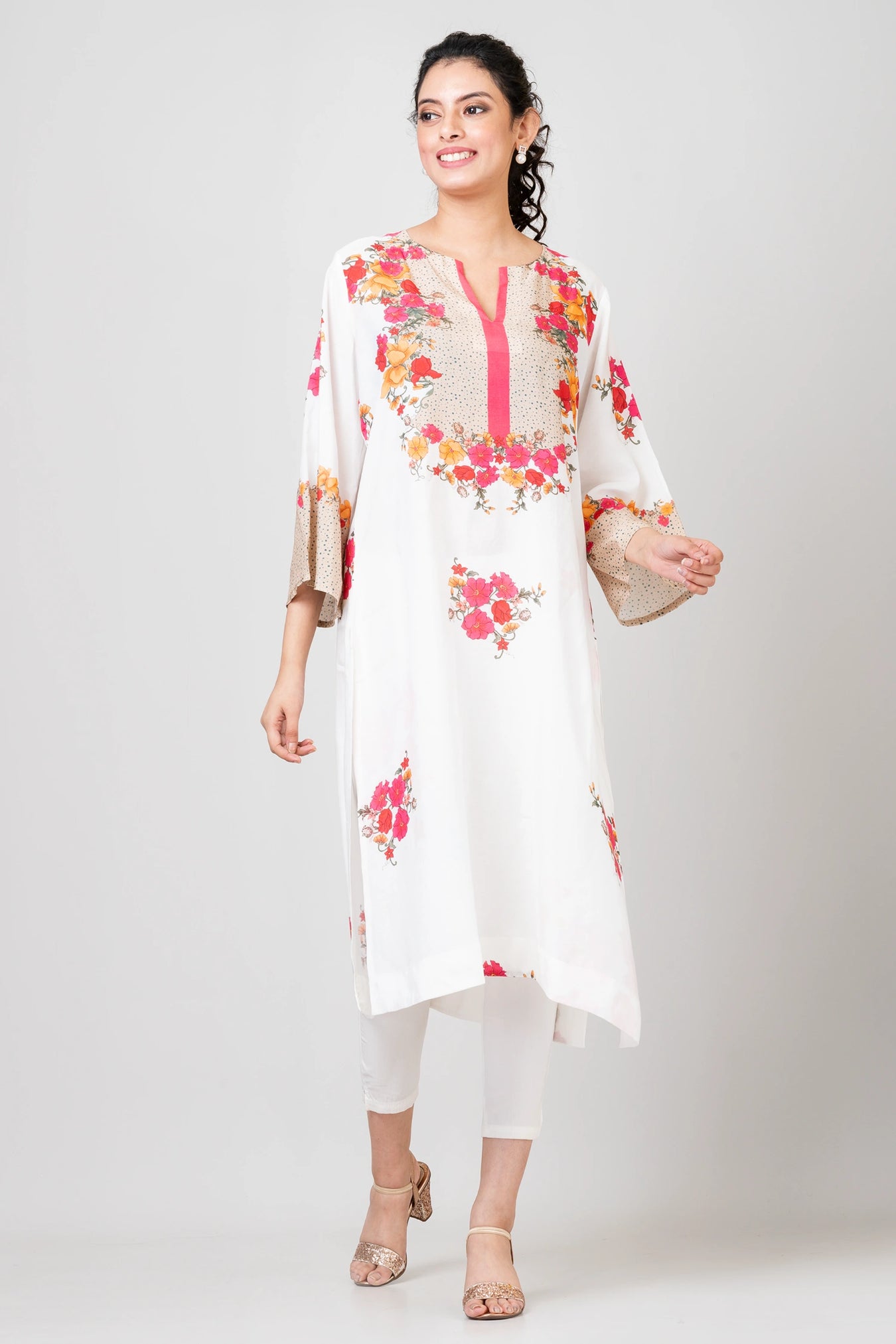 Colour: WhiteFabric: Chanderi Kurti, Chanderi PantsAttribute: Pattern and print: Indulge in the beauty of our floral print kurta, where intricate blooms add a touch of timeless elegance to your style.Purity: Natural FabricPack Contains: 1 Kurti, 1 PantCare instructions: Hand wash