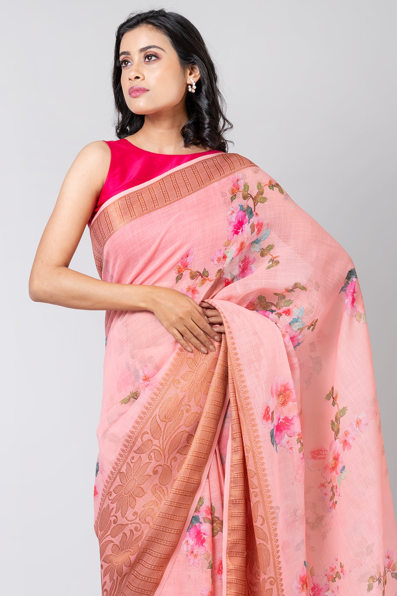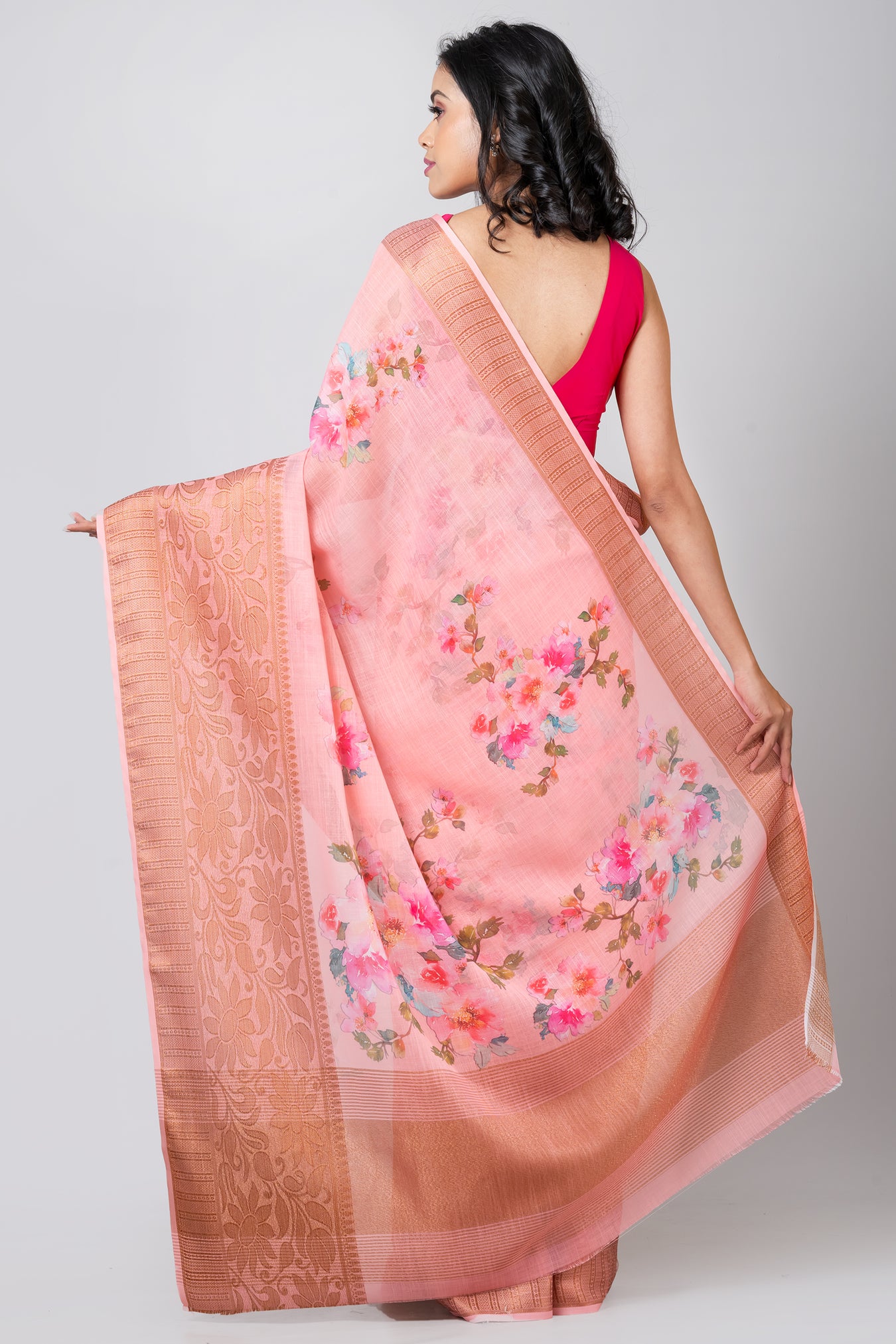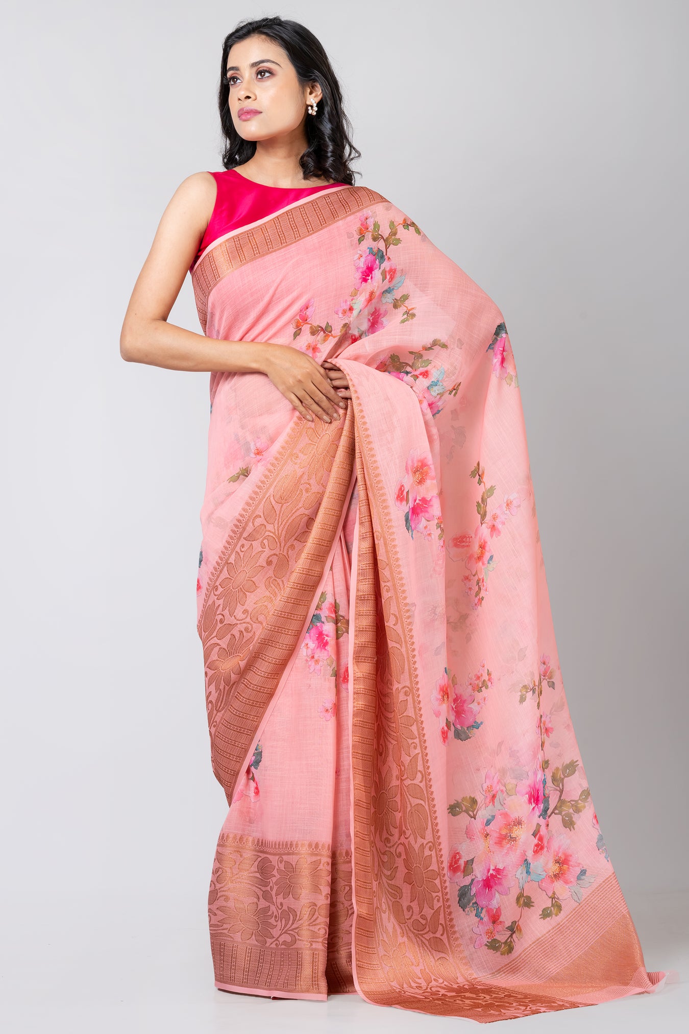 Size: S: 5.50Mtr B: 0.80MtrColor: Baby PinkFabric: LINENPattern and print: the peach color saree with a bold elegant zari border and floral print offers a delightful contrast, blending elegance with a touch of vibrancy. It's a charming choice for those seeking a refreshing yet classic look.Pack contains: 1 Saree, 1 BlouseCare instructions: Dry wash