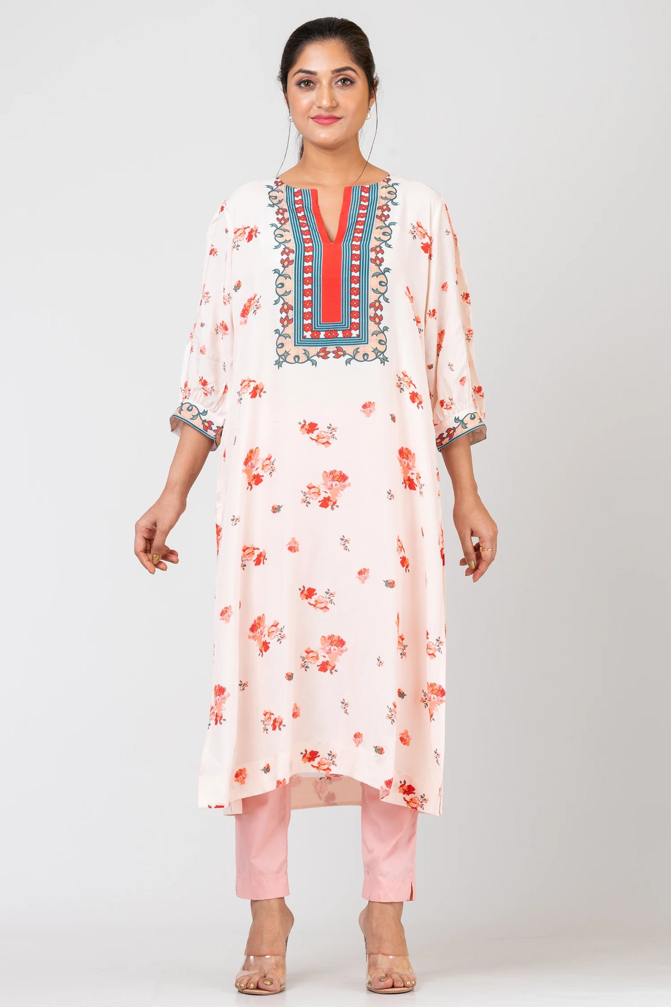 Colour: PeachFabric: Chanderi Kurti, Raw Silk Pants, Chifon DuppattaAttribute: Pattern and print: Step into the world of cultural elegance with our kurti featuring a Pichwai lotus floral print, where the intricate artistry and traditional motifs create a captivating and enchanting ensemble, perfect for celebrating the rich heritage of Indian craftsmanship and adding a touch of grace and sophistication to your style.Purity: Natural FabricPack Contains: 1 Kurti, 1 Pant with 1 DupattaCare instructions: Hand wash