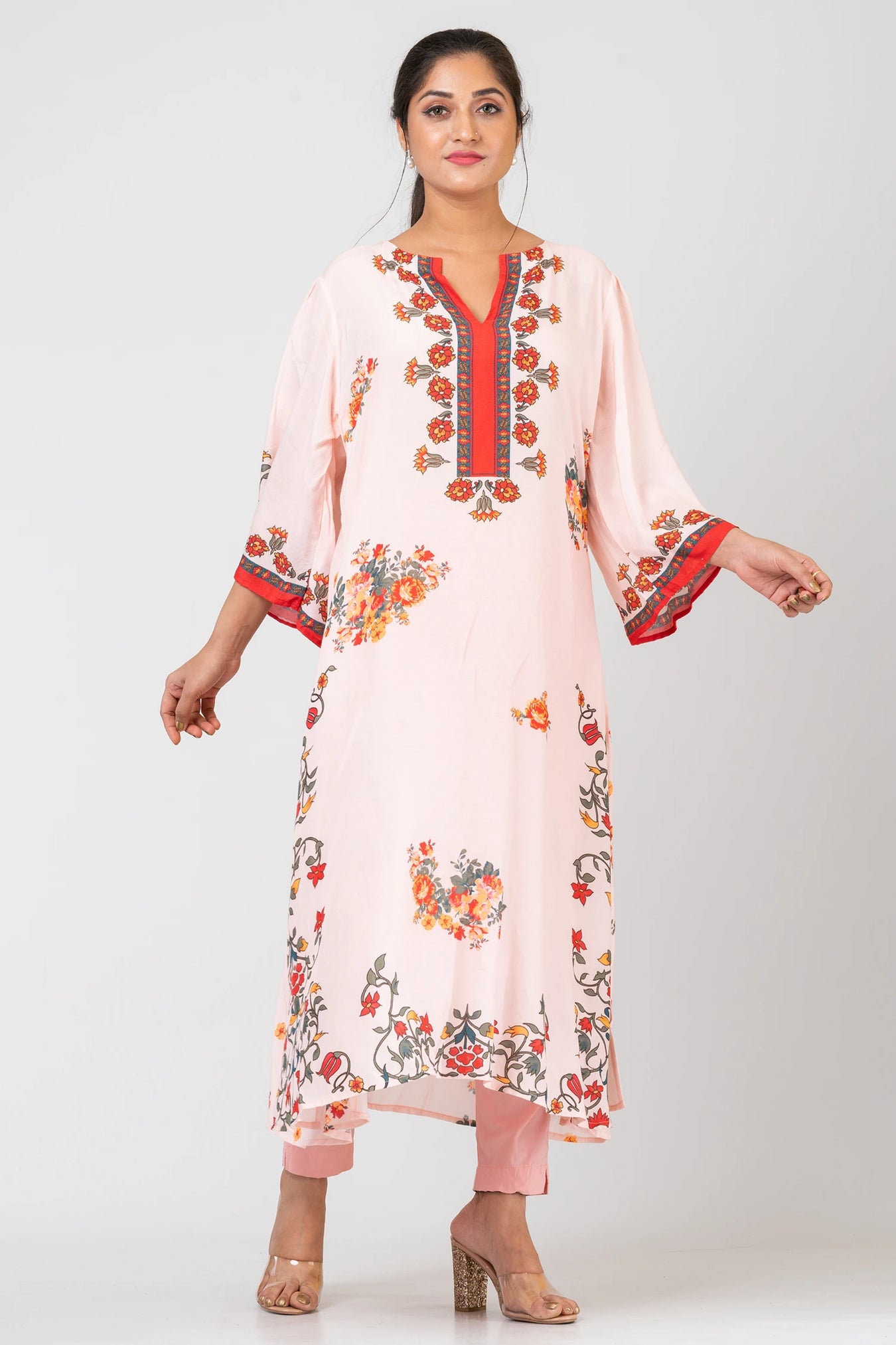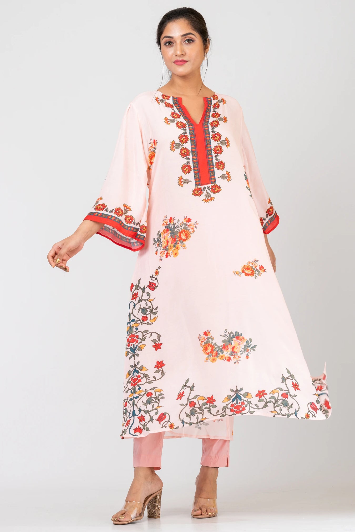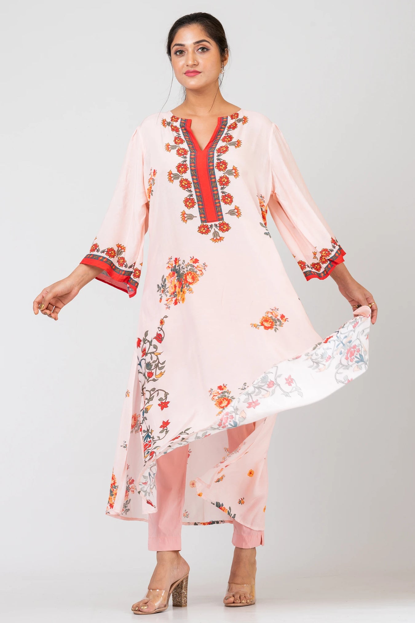 Colour: Light PinkFabric: Chanderi Kurti, Raw Silk PantsAttribute: Pattern and print: Embrace the beauty of artistry with our kurti featuring realistic floral prints, where delicate blooms come alive with breathtaking realism, creating a captivating and enchanting ensemble that celebrates the grace and elegance of nature's finest creations in a mesmerizing design.Purity: Natural FabricPack Contains: 1 Kurti, 1 PantCare instructions: Hand wash