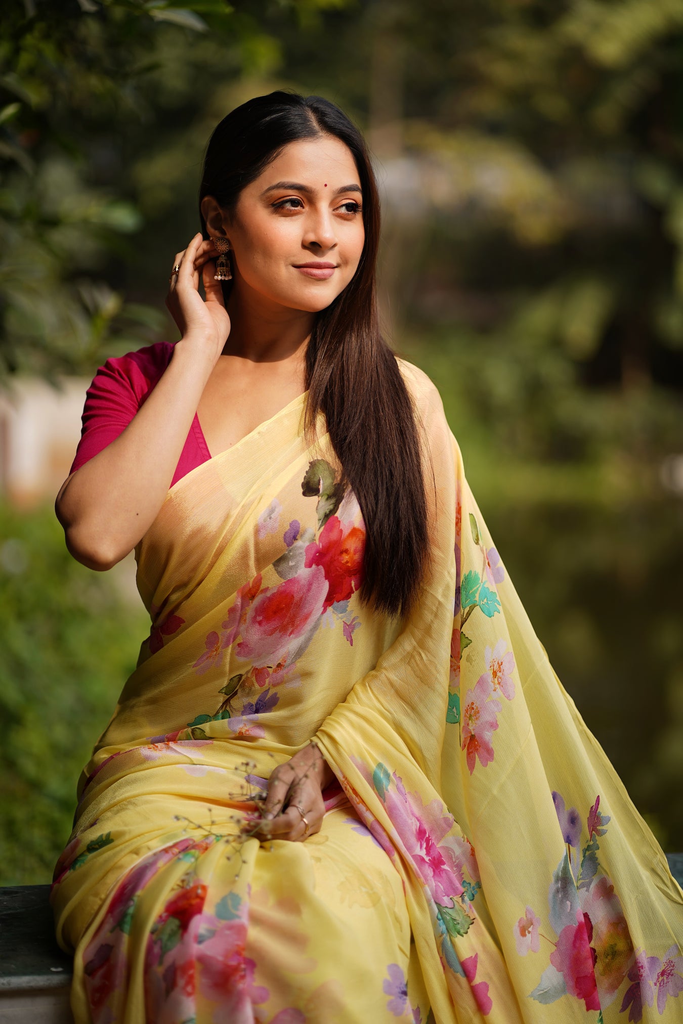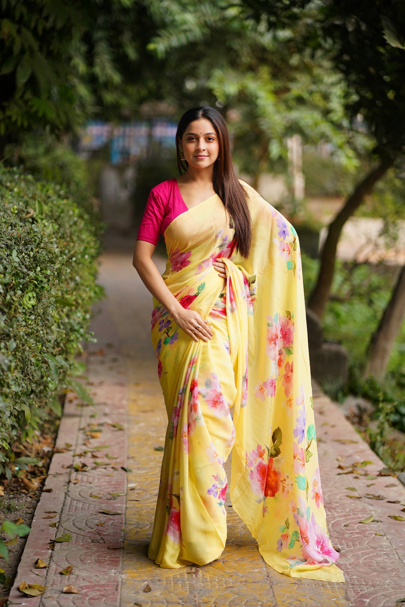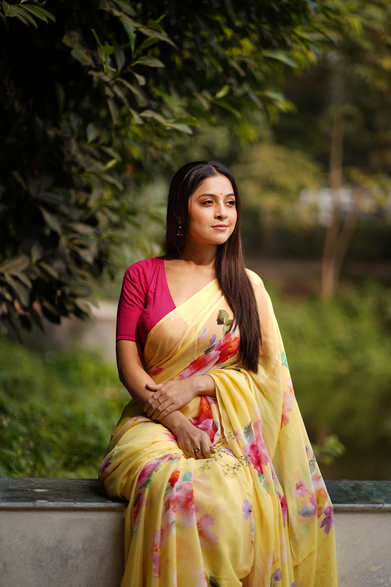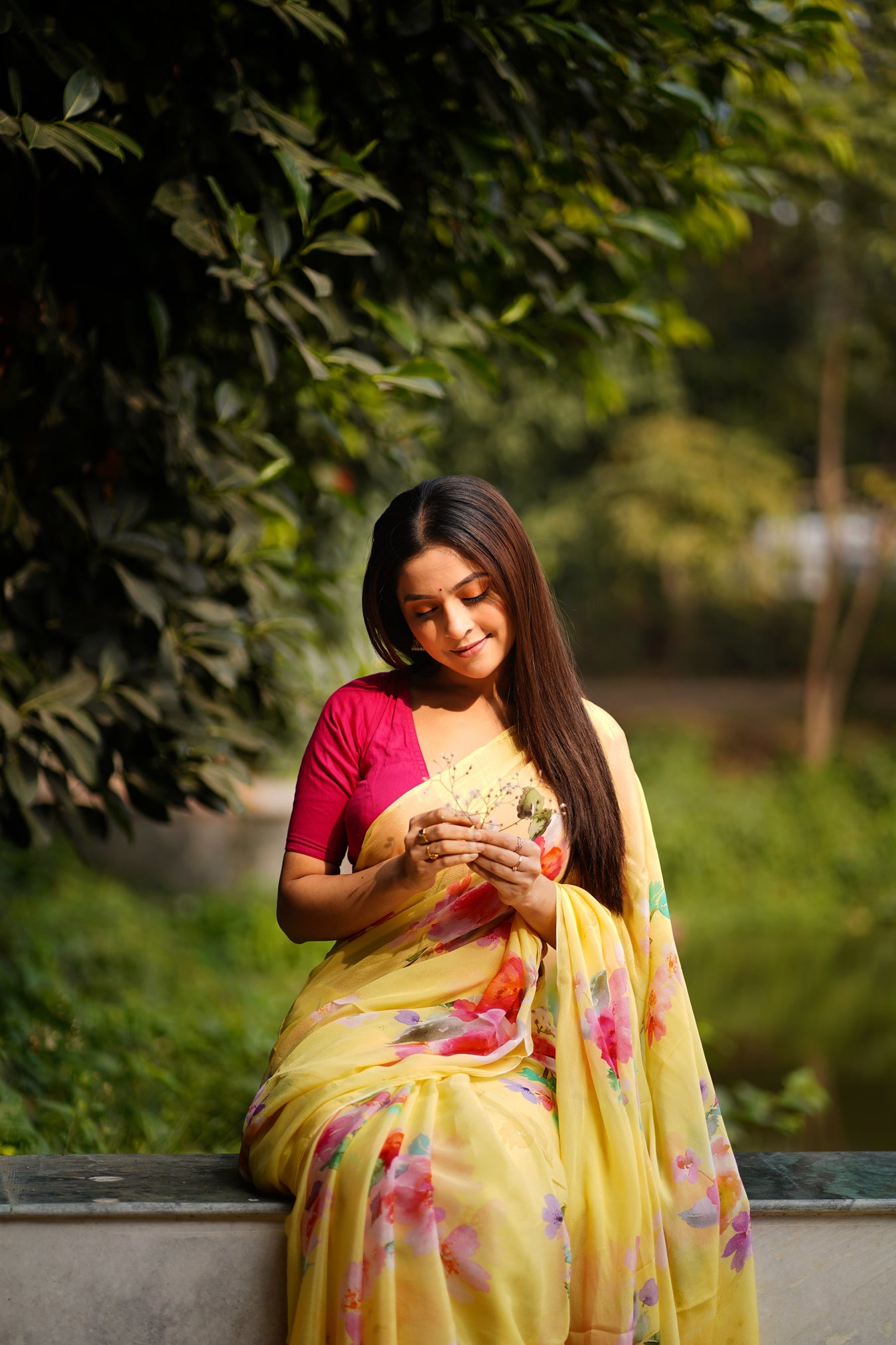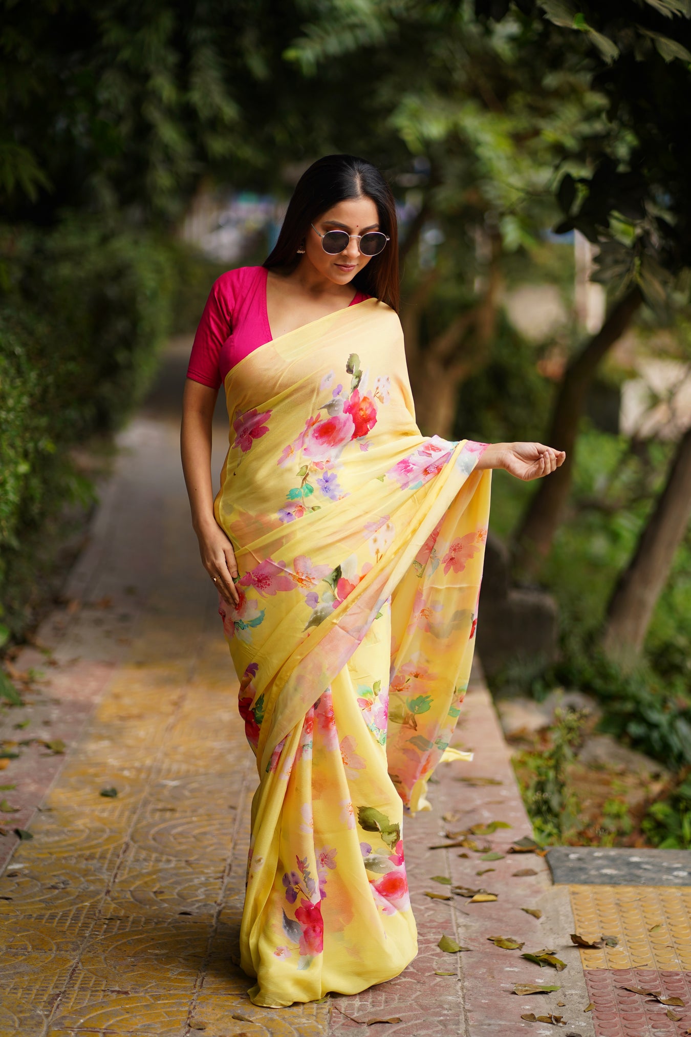 Size:Â 5.50Mtr B: 0.80MtrColor: yellowFabric: GeorgettePattern and print: The yellow georgette saree adorned with a captivating design featuring red and pink flower branches throughout the fabric. The georgette material lends a lightweight and flowing quality to the saree, making it both elegant and comfortable to wear. The vibrant yellow color serves as a cheerful backdrop, while the intricate floral pattern adds a touch of femininity and grace.Care instructions:Â Dry wash