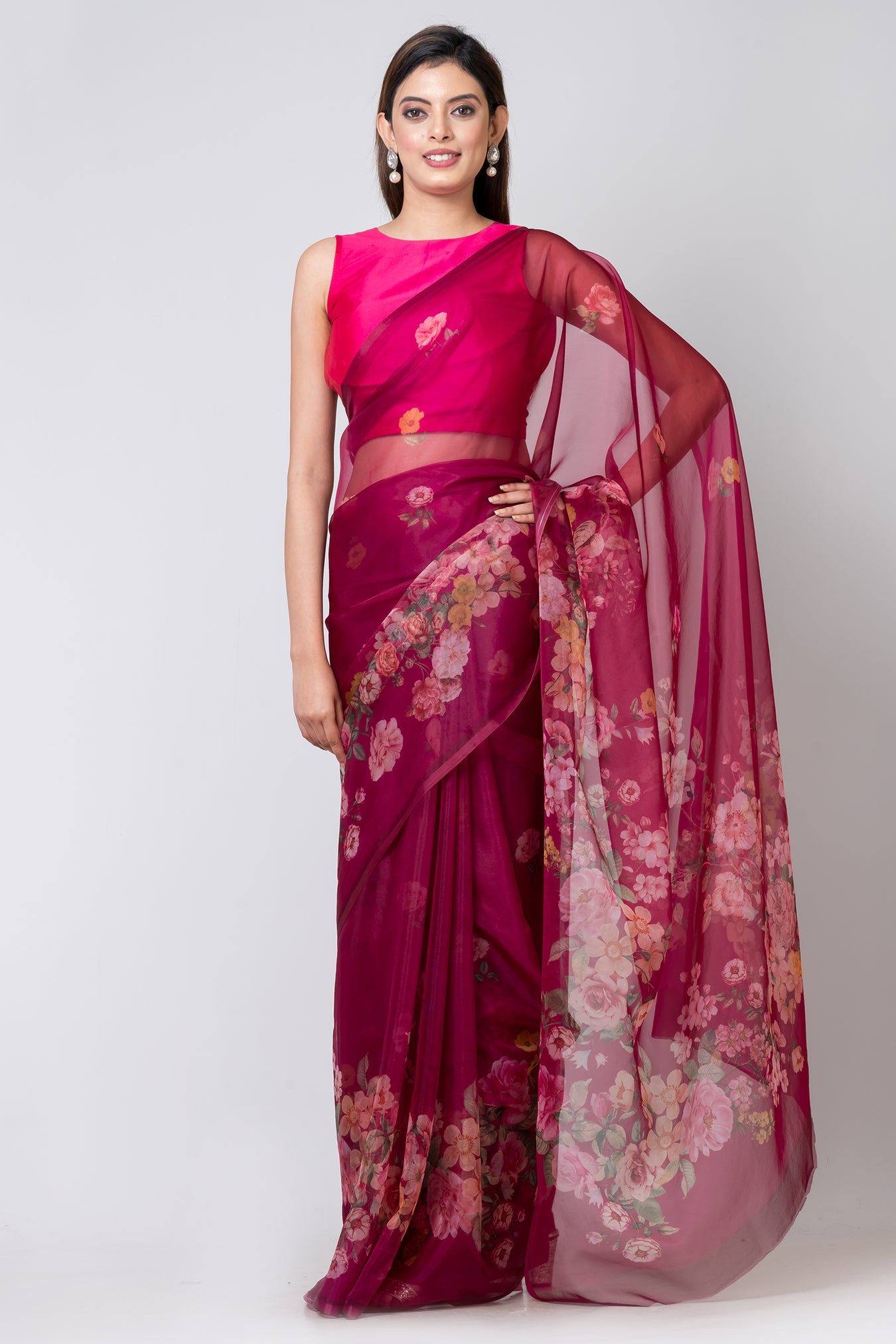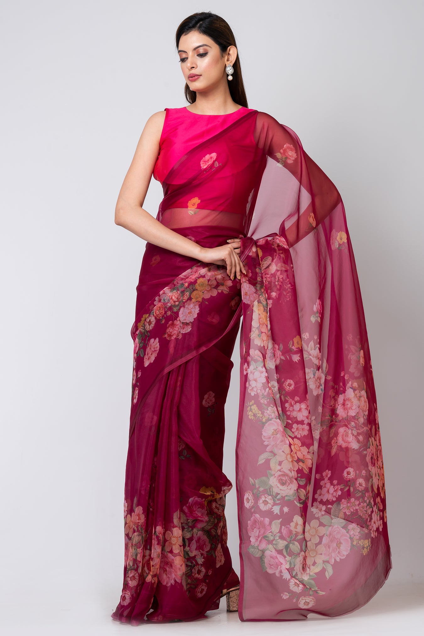 Size: 5.50Mtr B: 0.80MtrColour: RedFabric: OrganzaPattern and print: The Red organza saree is made of a delicate, lightweight fabric that drapes elegantly. Its calming color is enhanced by a lively colorful floral design.Pack contains:Â 1 Saree, 1 BlouseCare instructions:Â Dry wash
