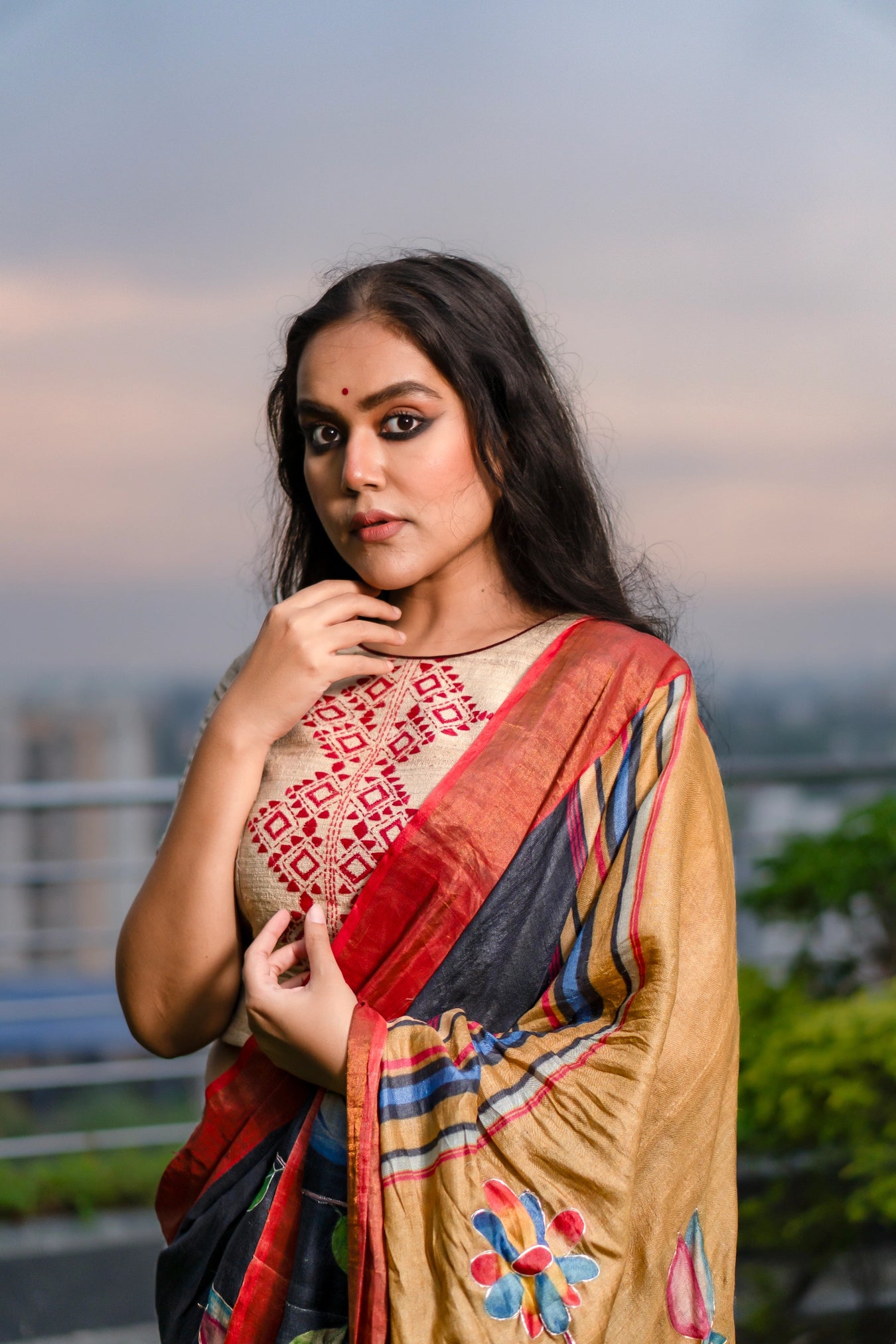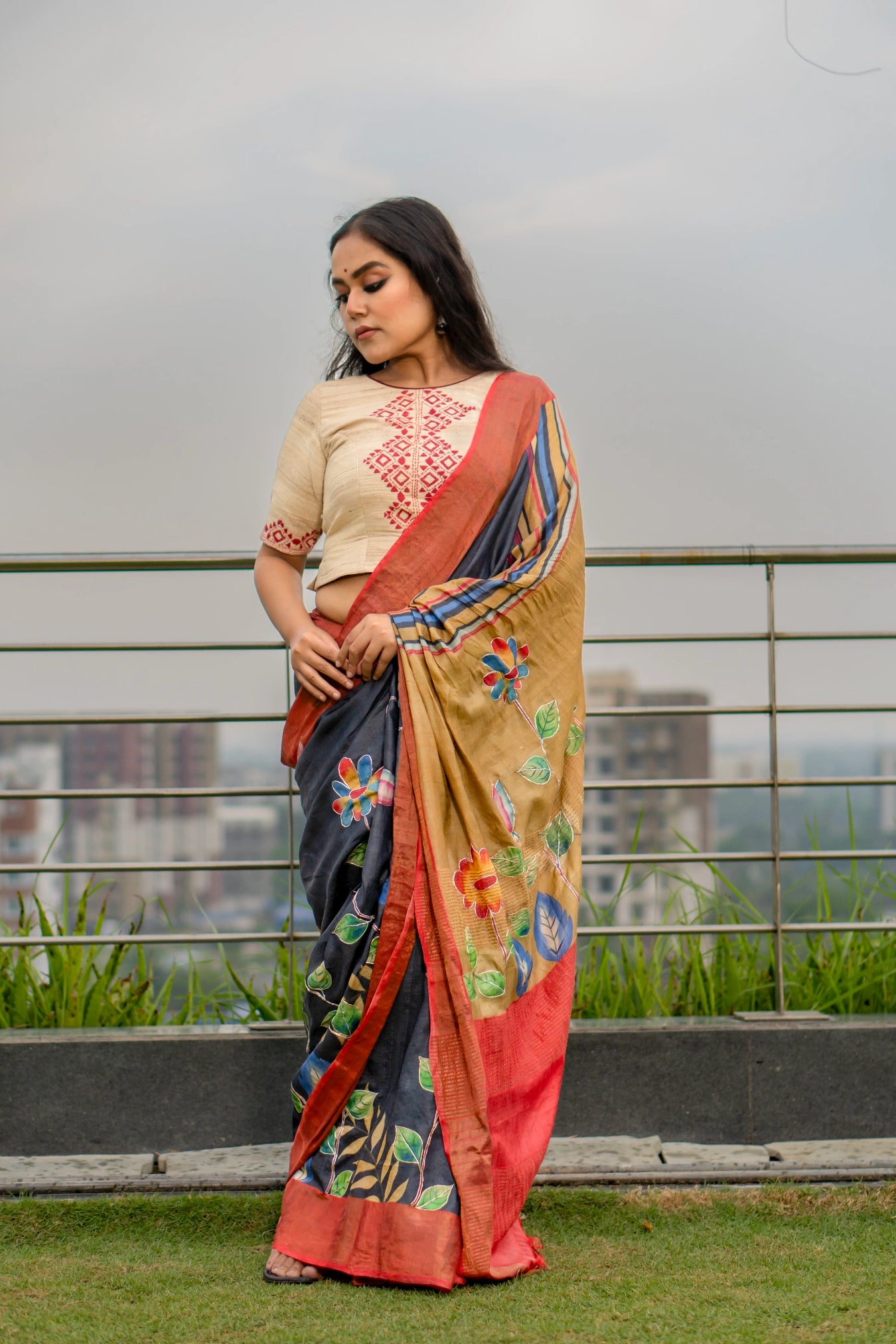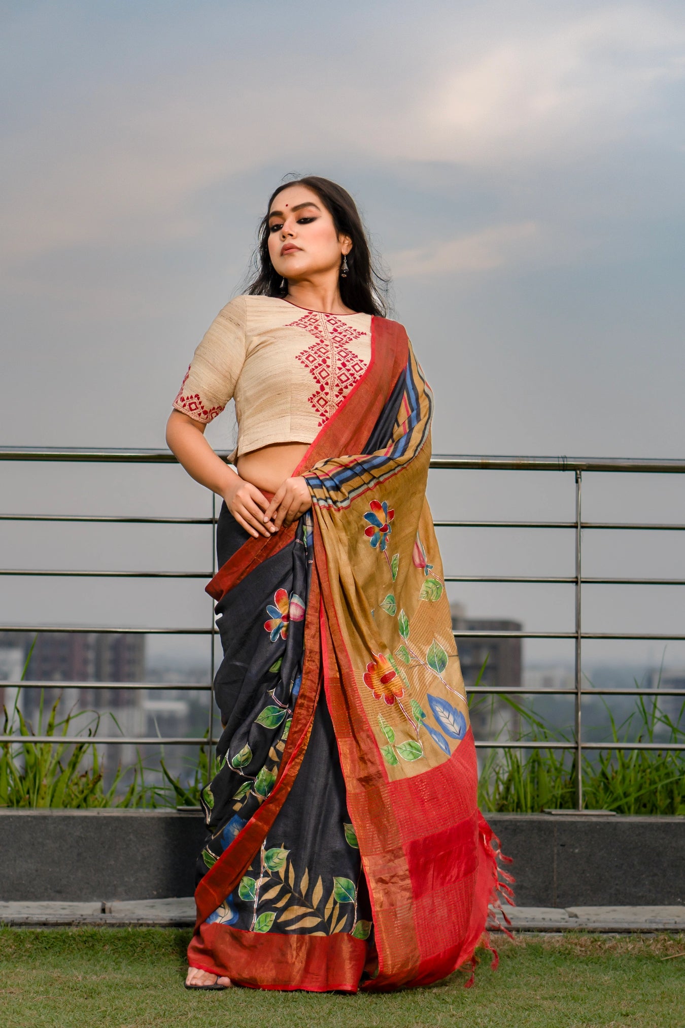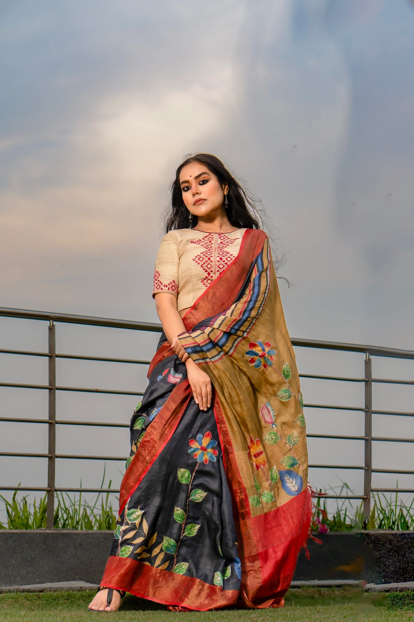 Size: S: 5.50Mtr B: 0.80MtrColour: BlackFabric: TUSSAR SILKPattern and print: Make a Black tussar saree hand pented digital flower print throughout. This eye-catching ensemble effortlessly combines tradition with contemporary flairPurity: Natural fabricCare instructions: Dry wash