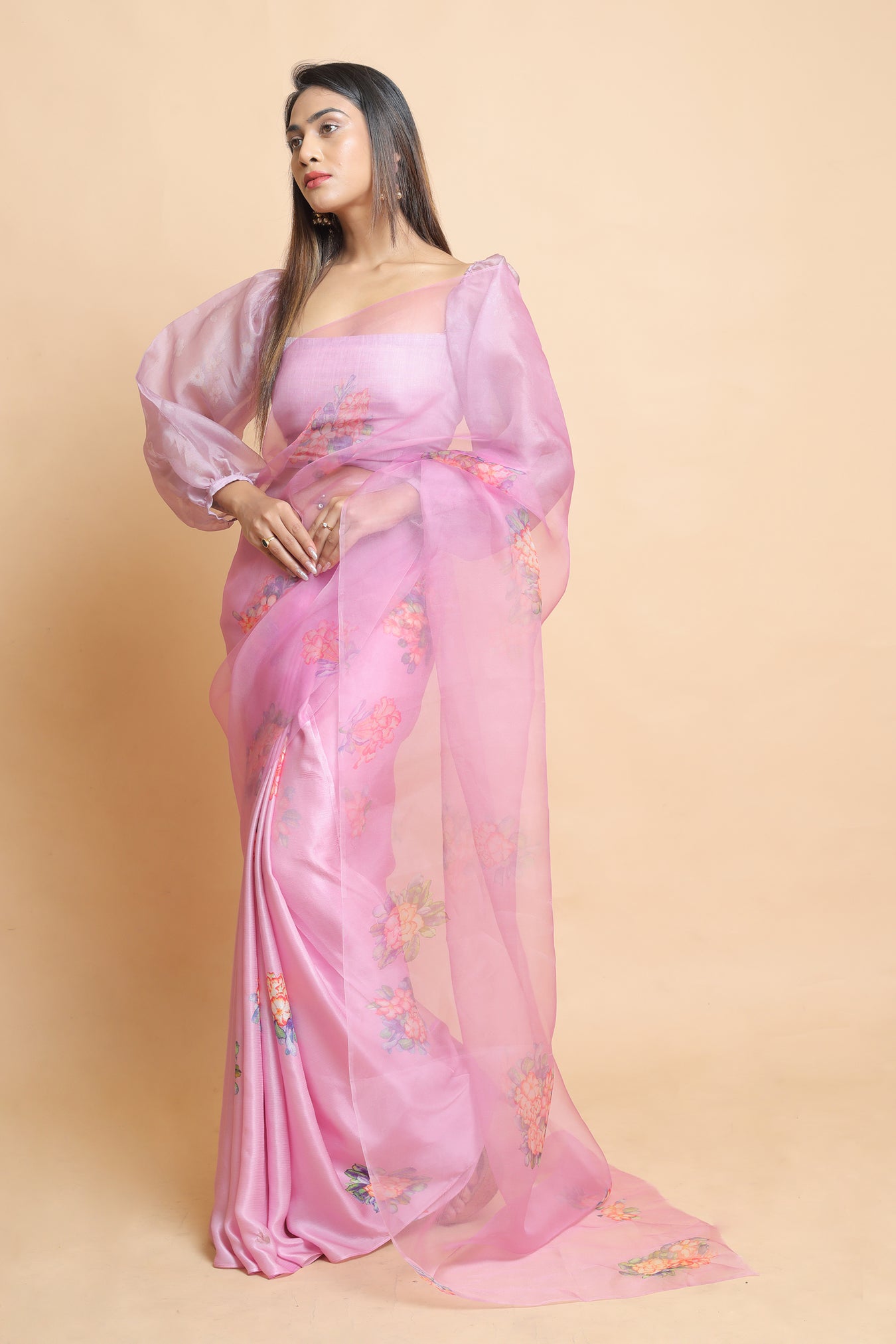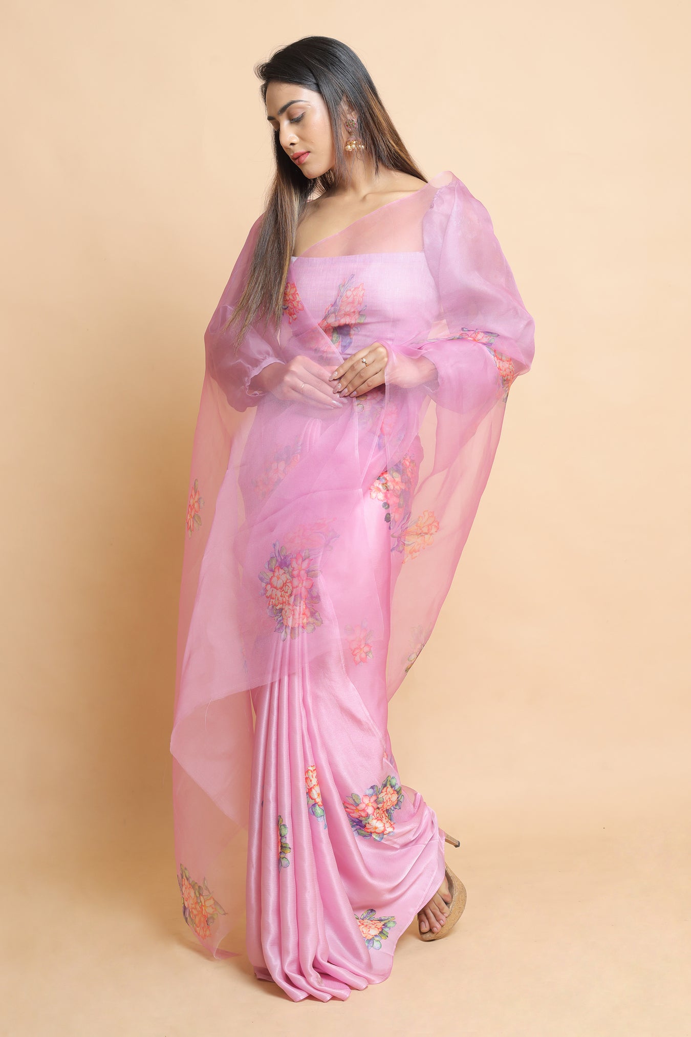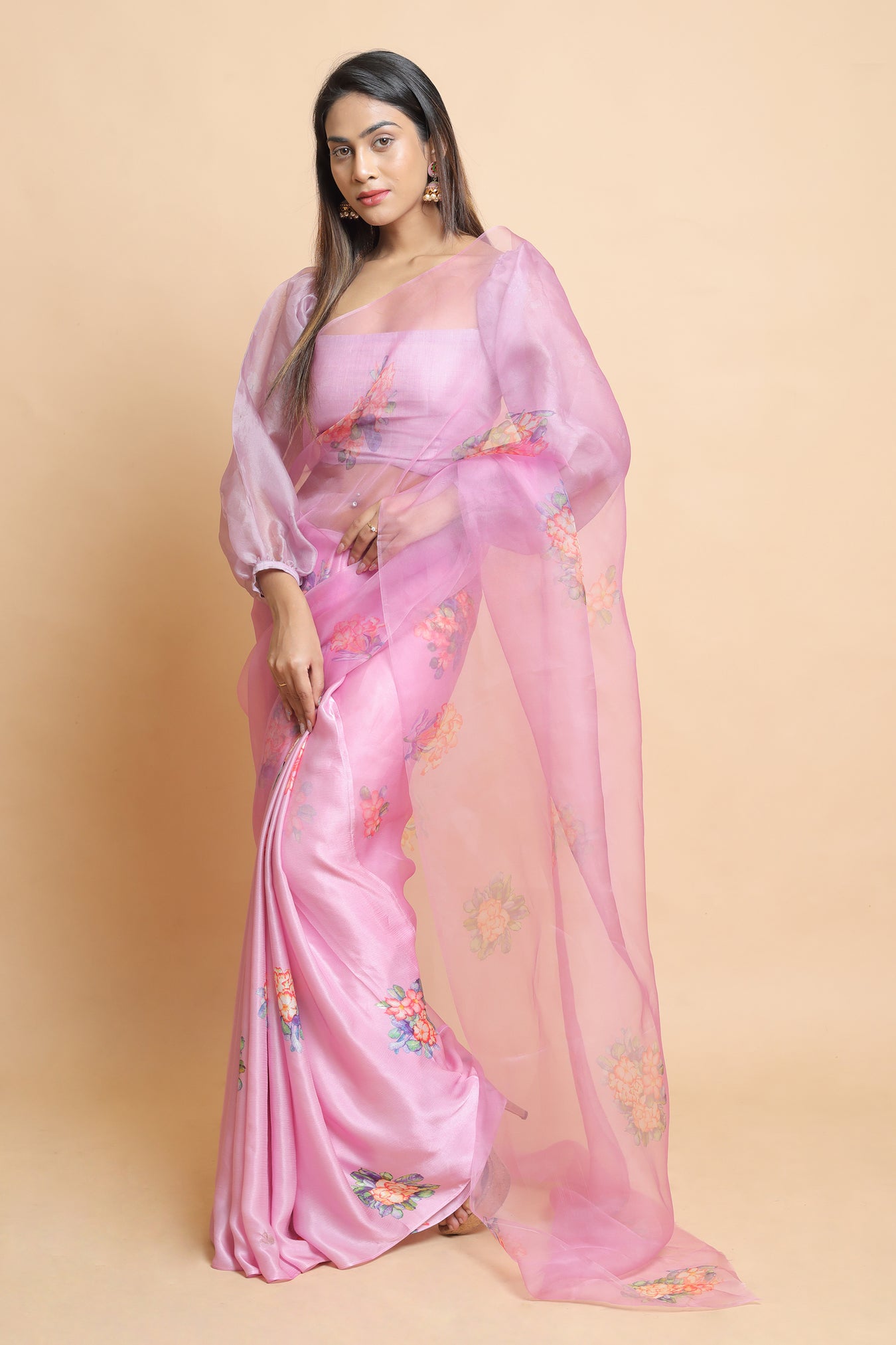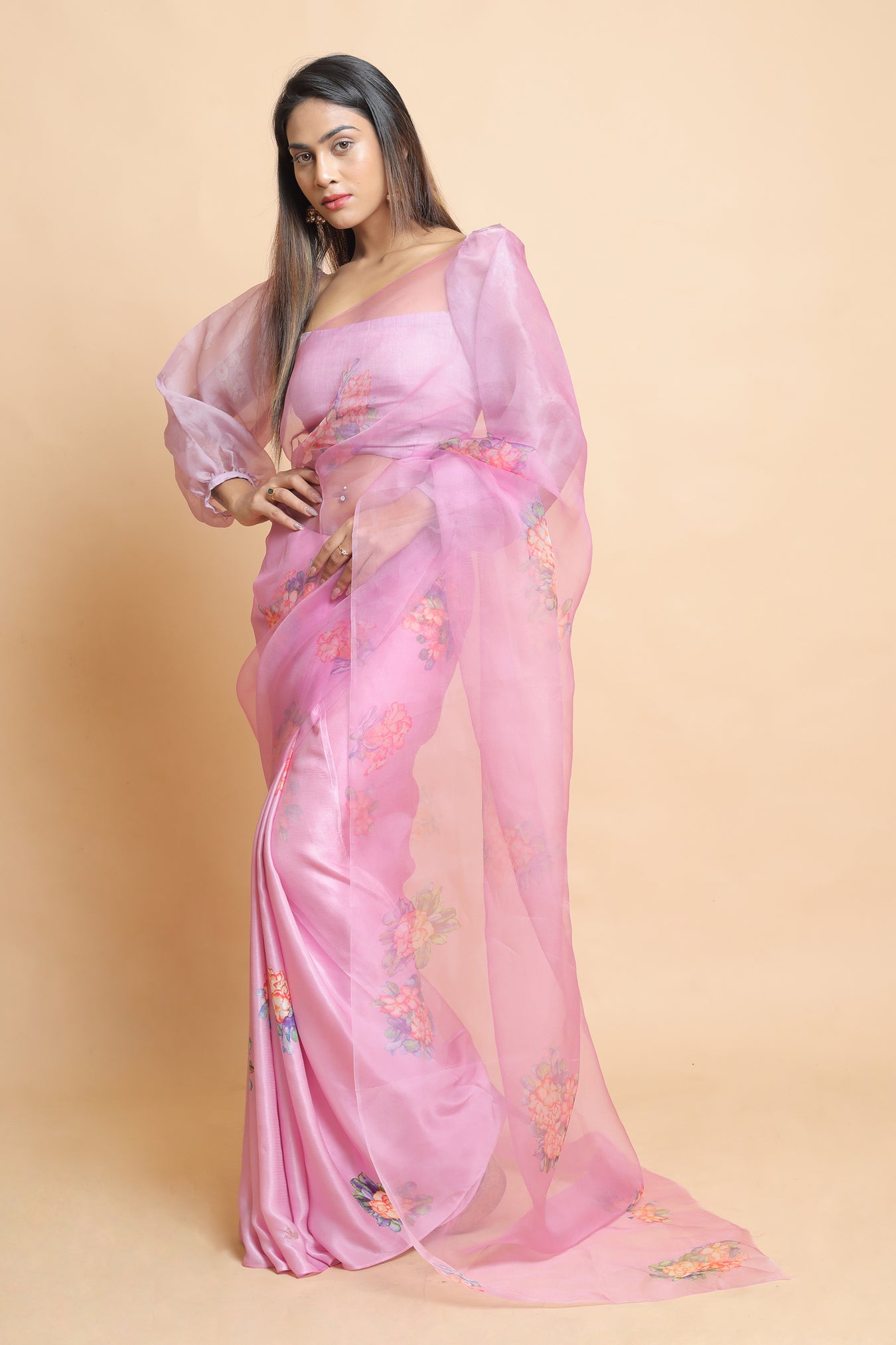 Pattern and print:Â Indulge in the simplicity and beauty of our half-and-half sari, where the luxurious feel of organza silk meets the smoothness of satin crepe. This saree, in a soft light pink shade, is adorned with delicate hand-painted floral digital prints, embodying the essence of pure femininity.