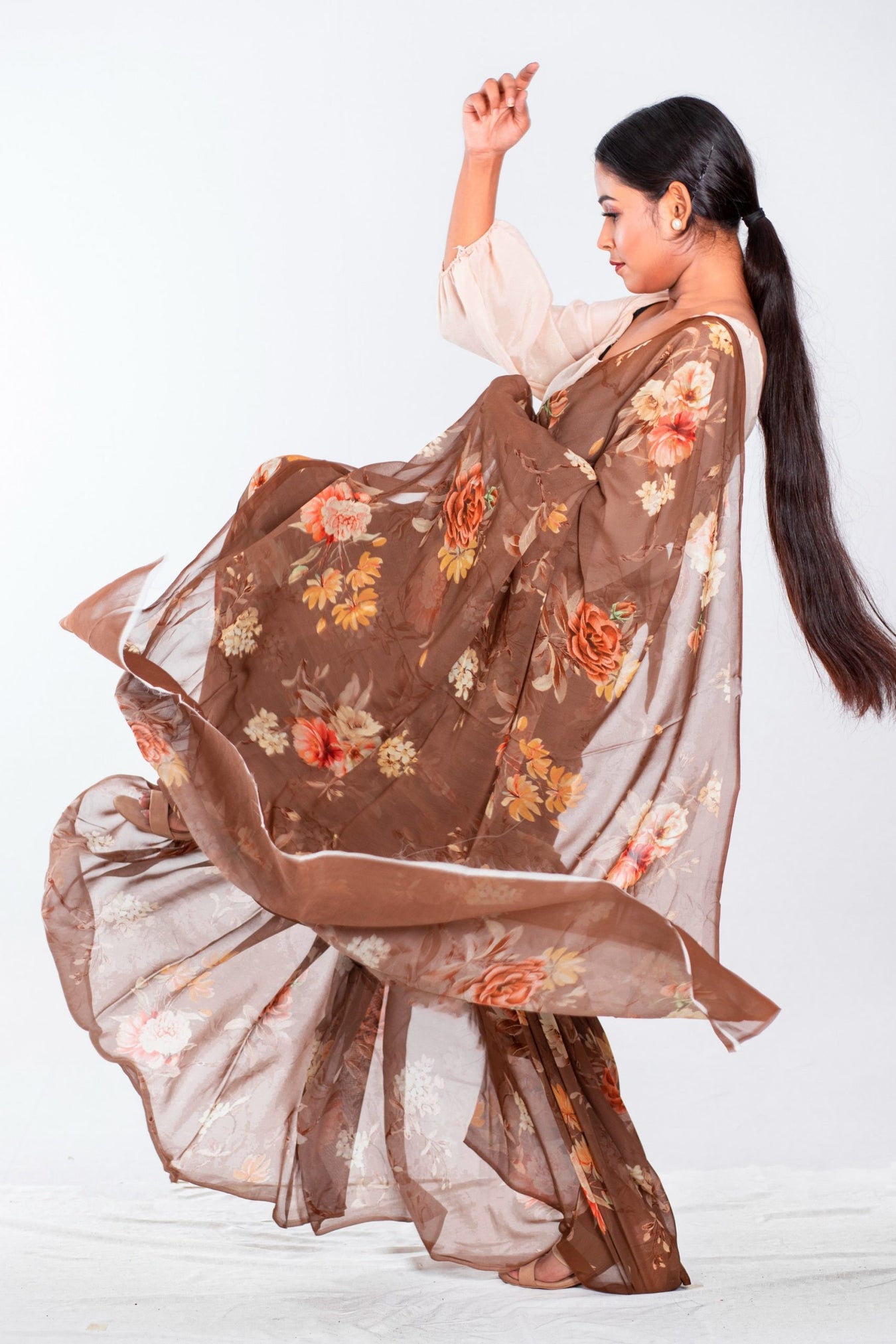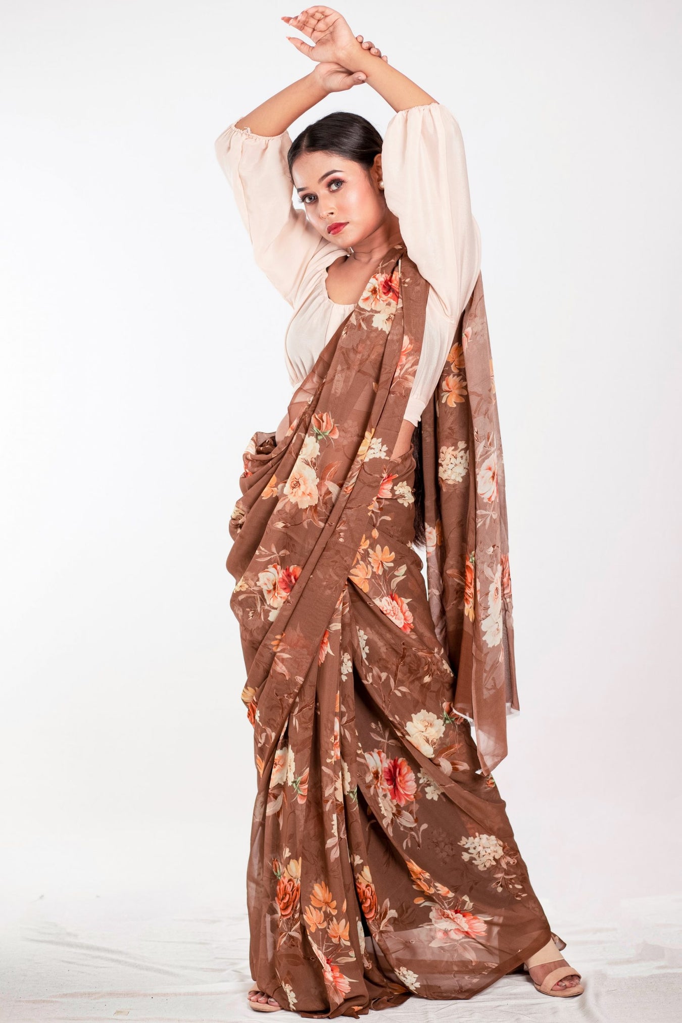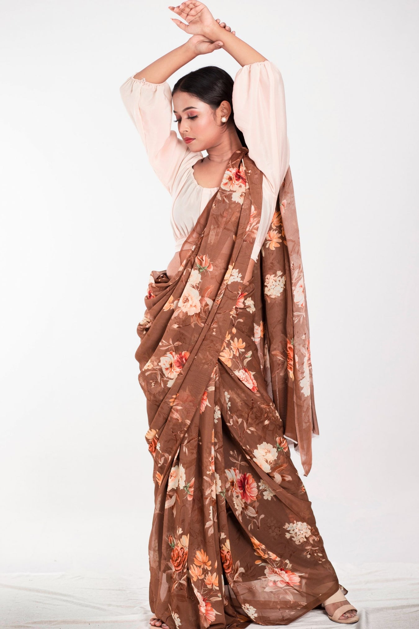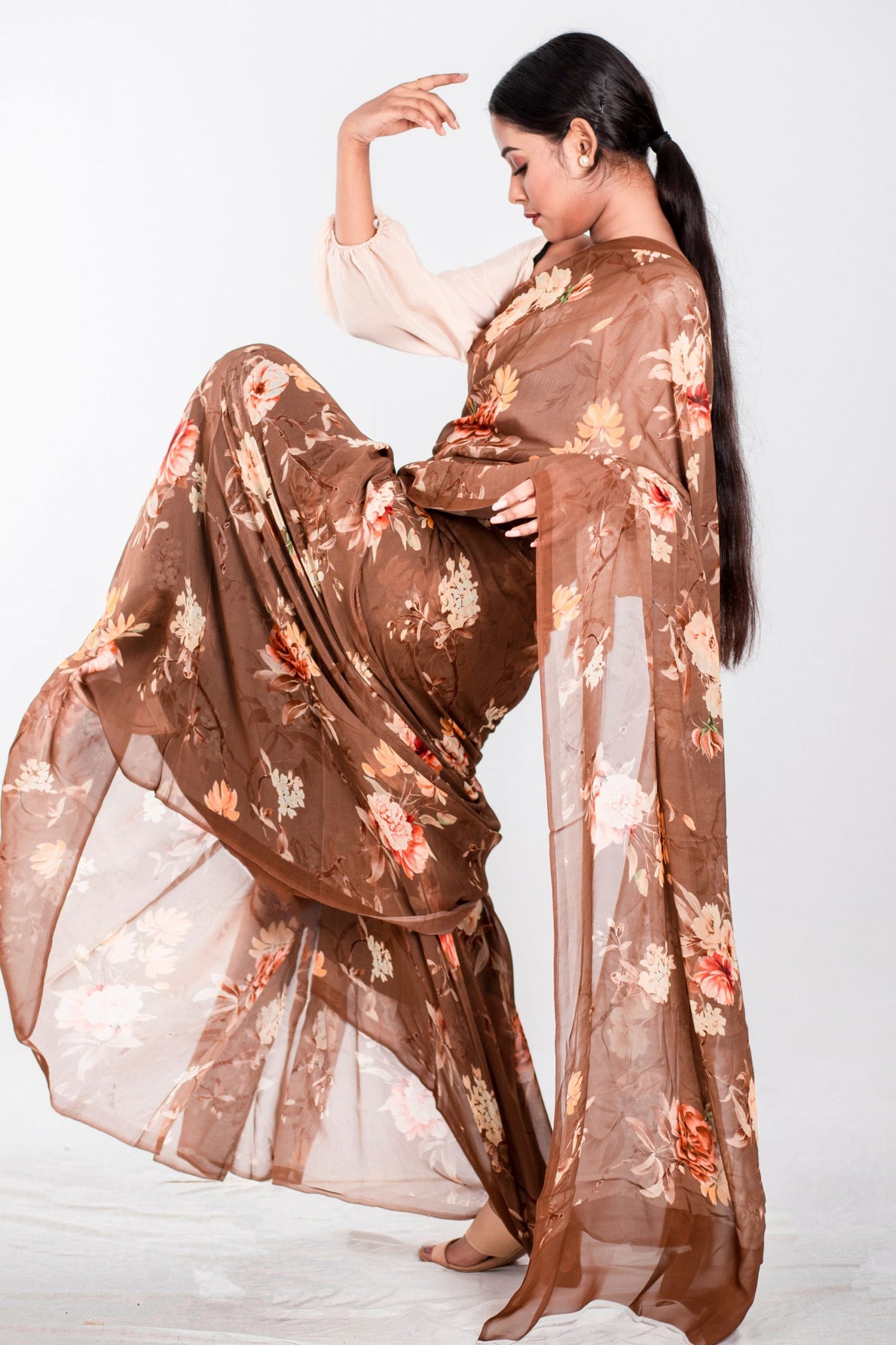 Colour: BrownFabric: GeorgettePattern and print: Botanical floral printed fashionably all over eclectic Georgette saree. The soothing, earthy color of the saree with subdued botanical prints have a calming effect to the whole attire, making it light and comfortable to look and wear.Care instructions:Â Dry wash