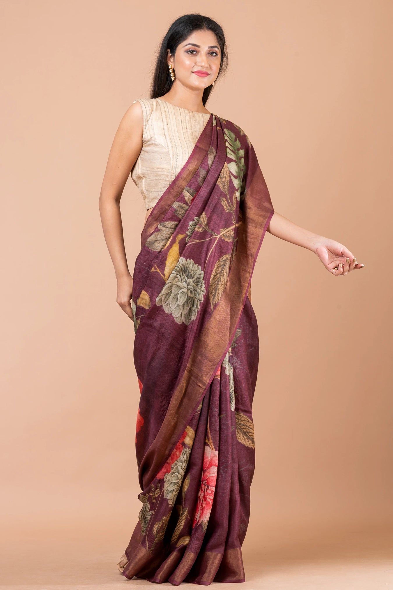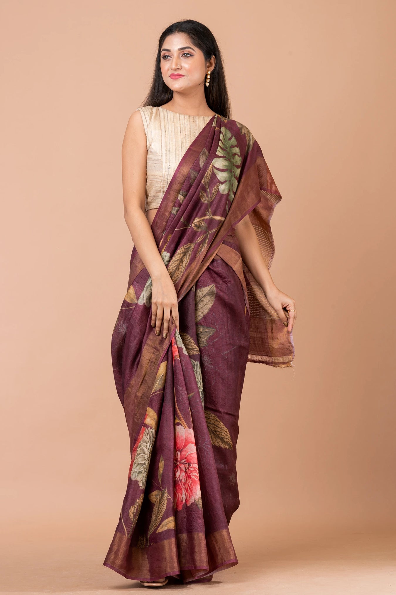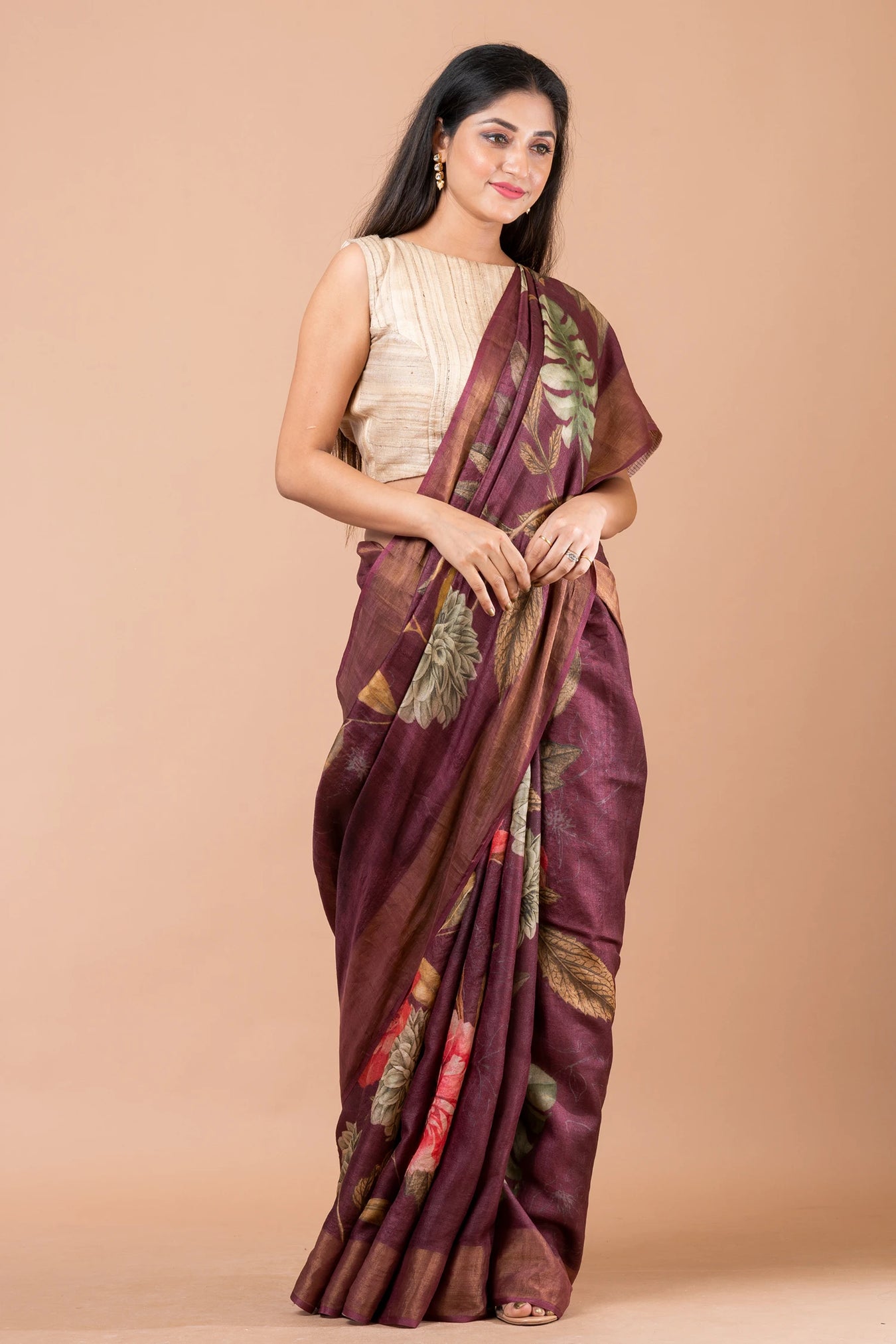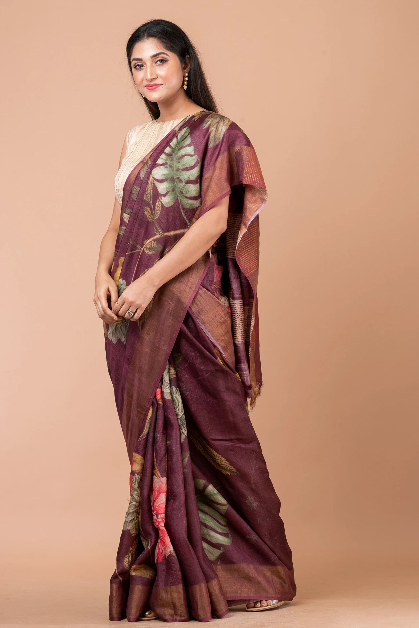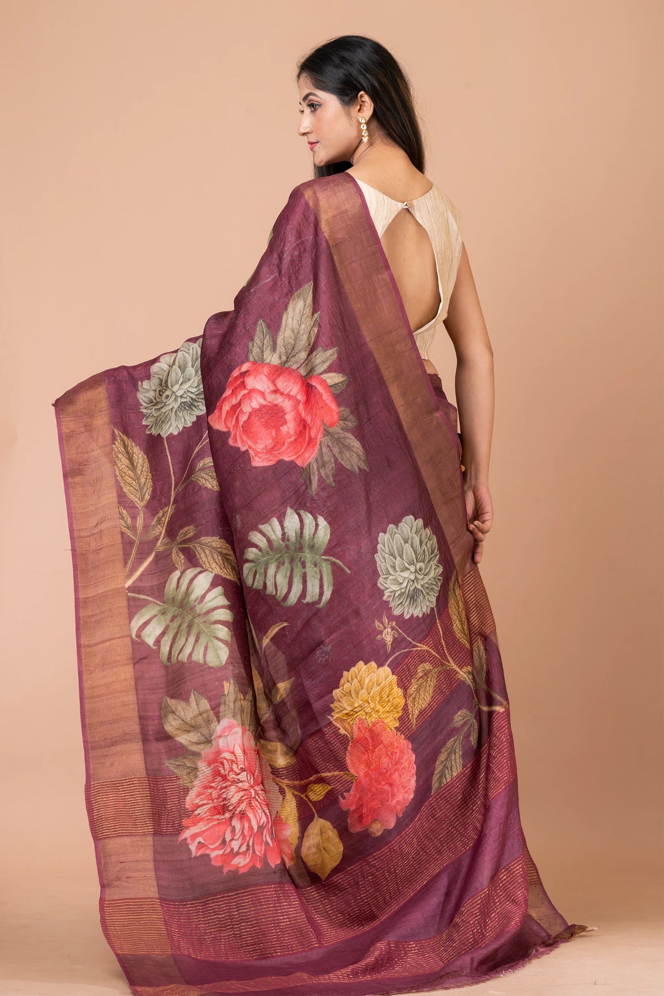 Size: S: 5.50Mtr B: 0.80MtrColour: Purple Fabric: Tussar silkPattern and print: Immerse yourself in the beauty of nature with this stunning Tussar saree adorned with tropical leaves and wild flower watercolor motifs. The graceful combination of lush green leaves and vibrant blooms adds a touch of tropical charm to your ensemble. Crafted with Tussar silk, this saree ensures a luxurious drape, making it the perfect choice for making a statement at weddings, parties, or any special event, exuding elegance and sophistication with every wear.Silk purity: Pure Tussar SilkPack contains: 1 Saree, 1 BlouseCare instructions: Dry wash