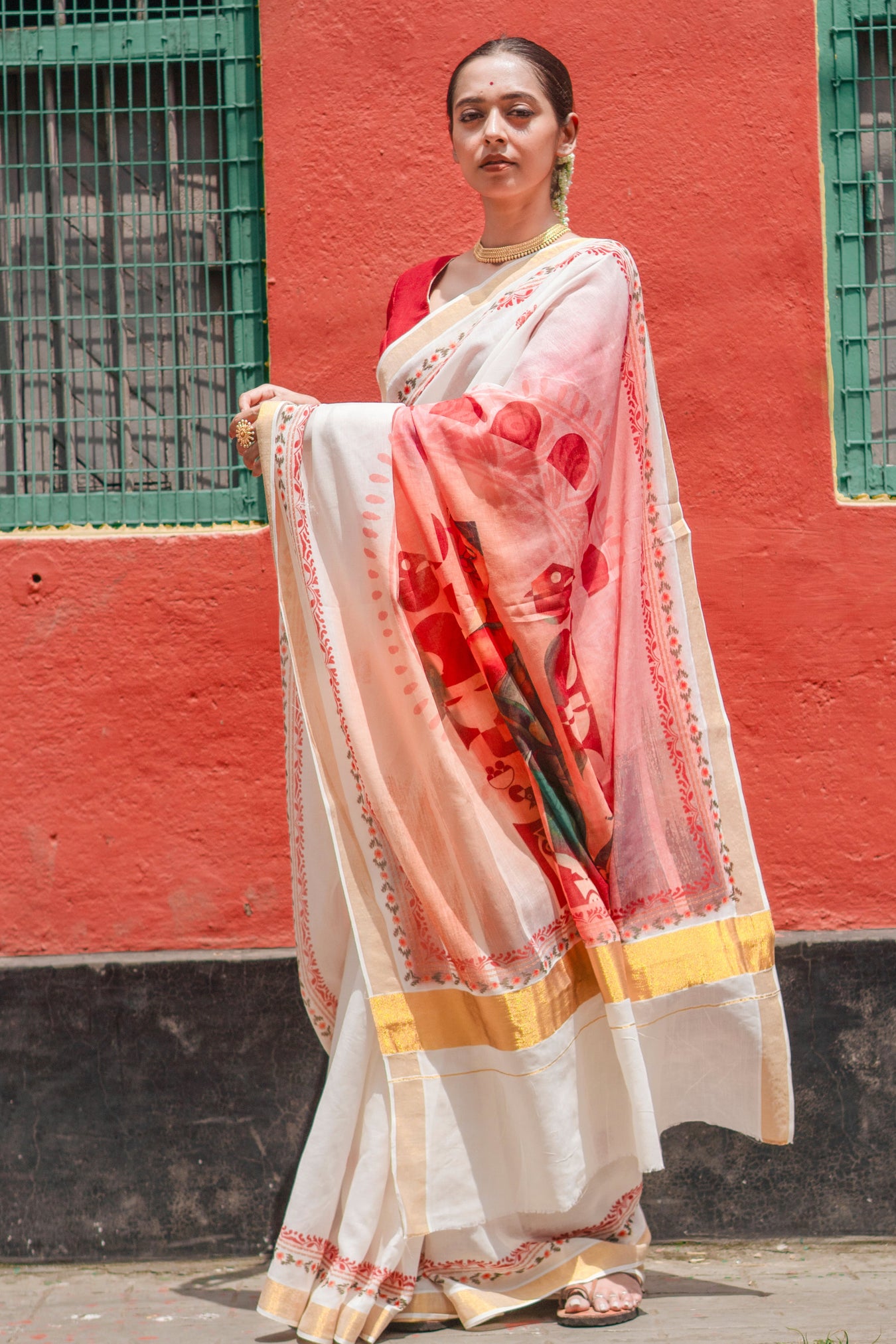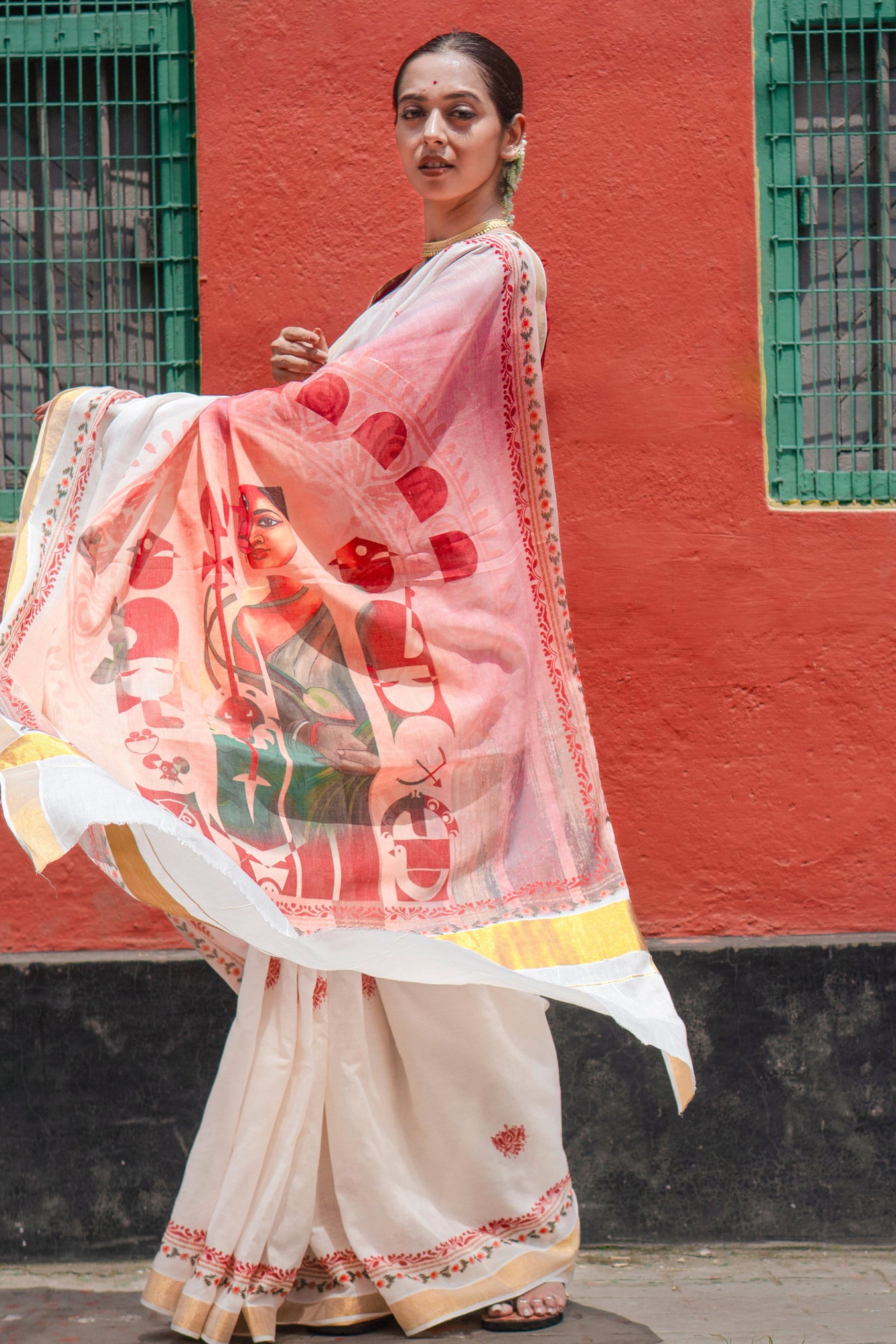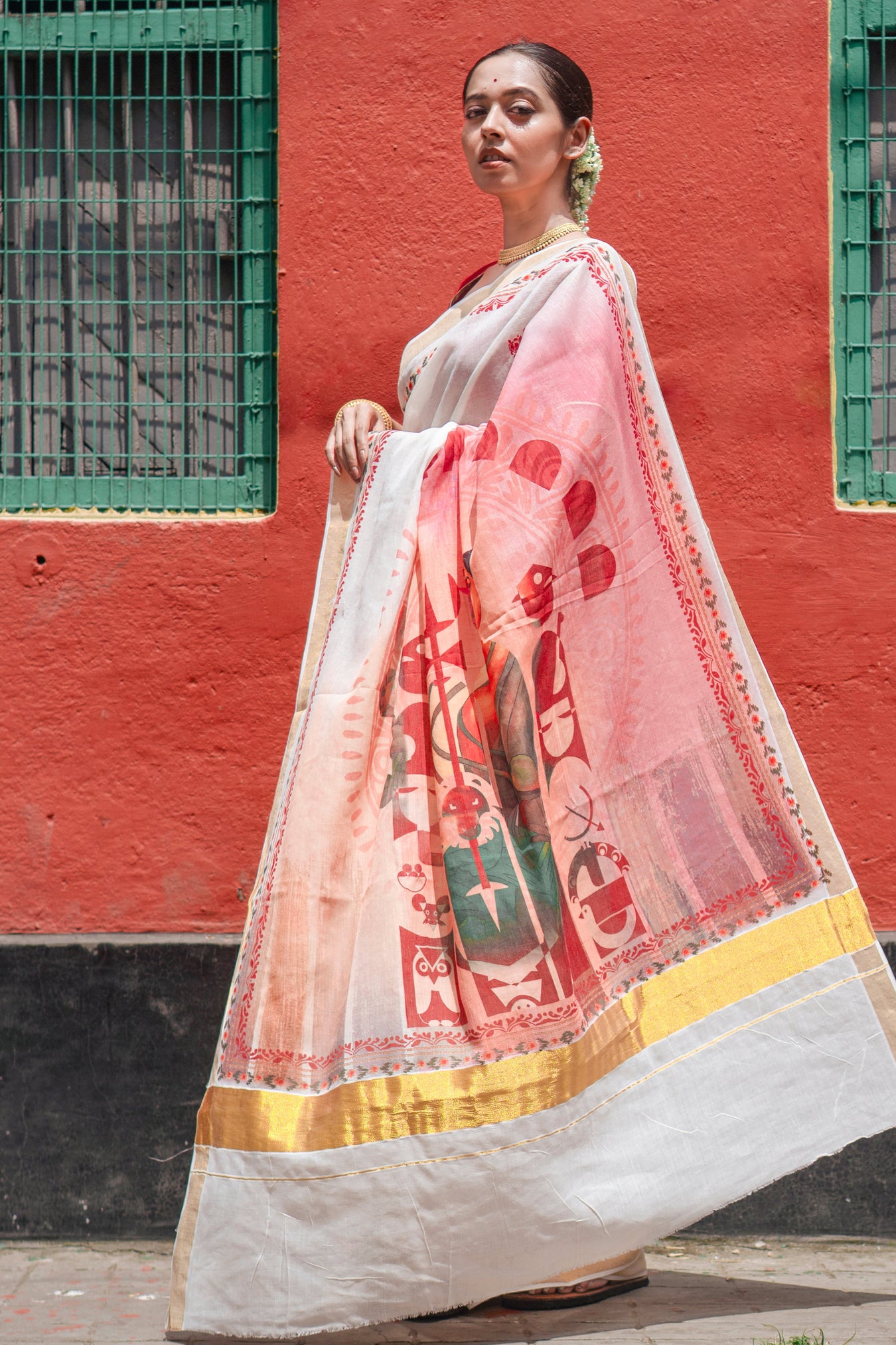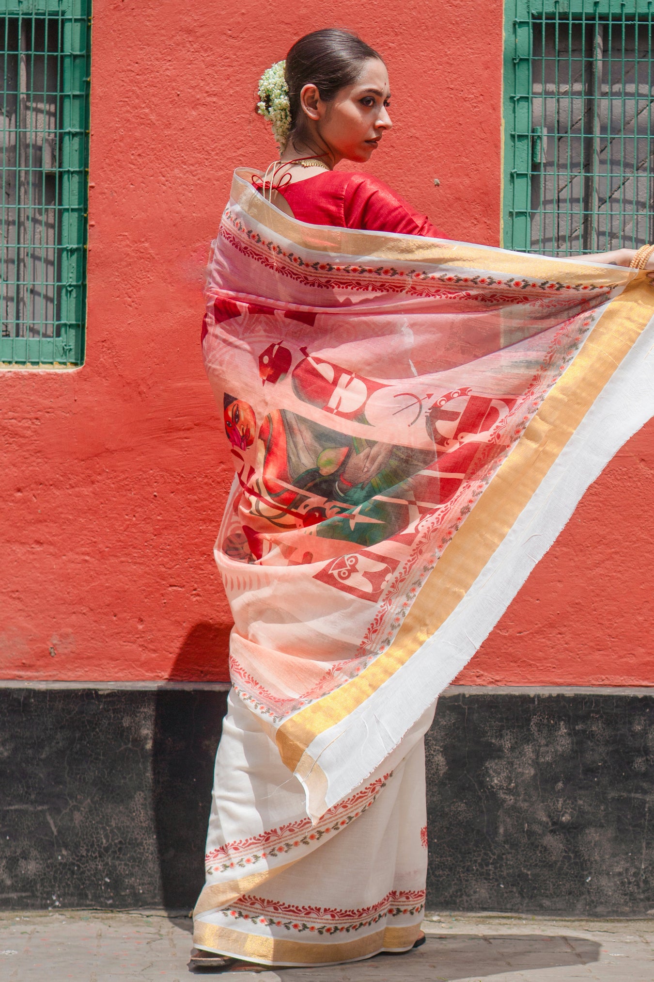 Pattern and print: This saree is a traditional white base handloom piece featuring script-style motifs in a deep red maroon tone across the body and pallu. The print resembles ancient manuscript text and artistic line drawings, giving it a heritage look. The saree is bordered with a slim golden zari edge and highlighted with yellow detailing on the pallu, adding a touch of vibrancy. The overall pattern combines cultural storytelling through script prints with minimalistic elegance, making it perfect for festive and traditional occasions.