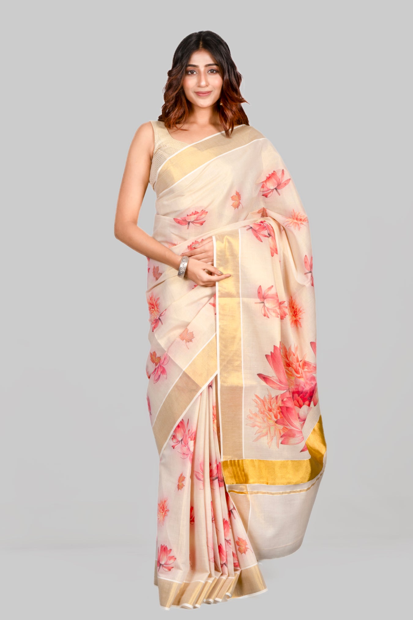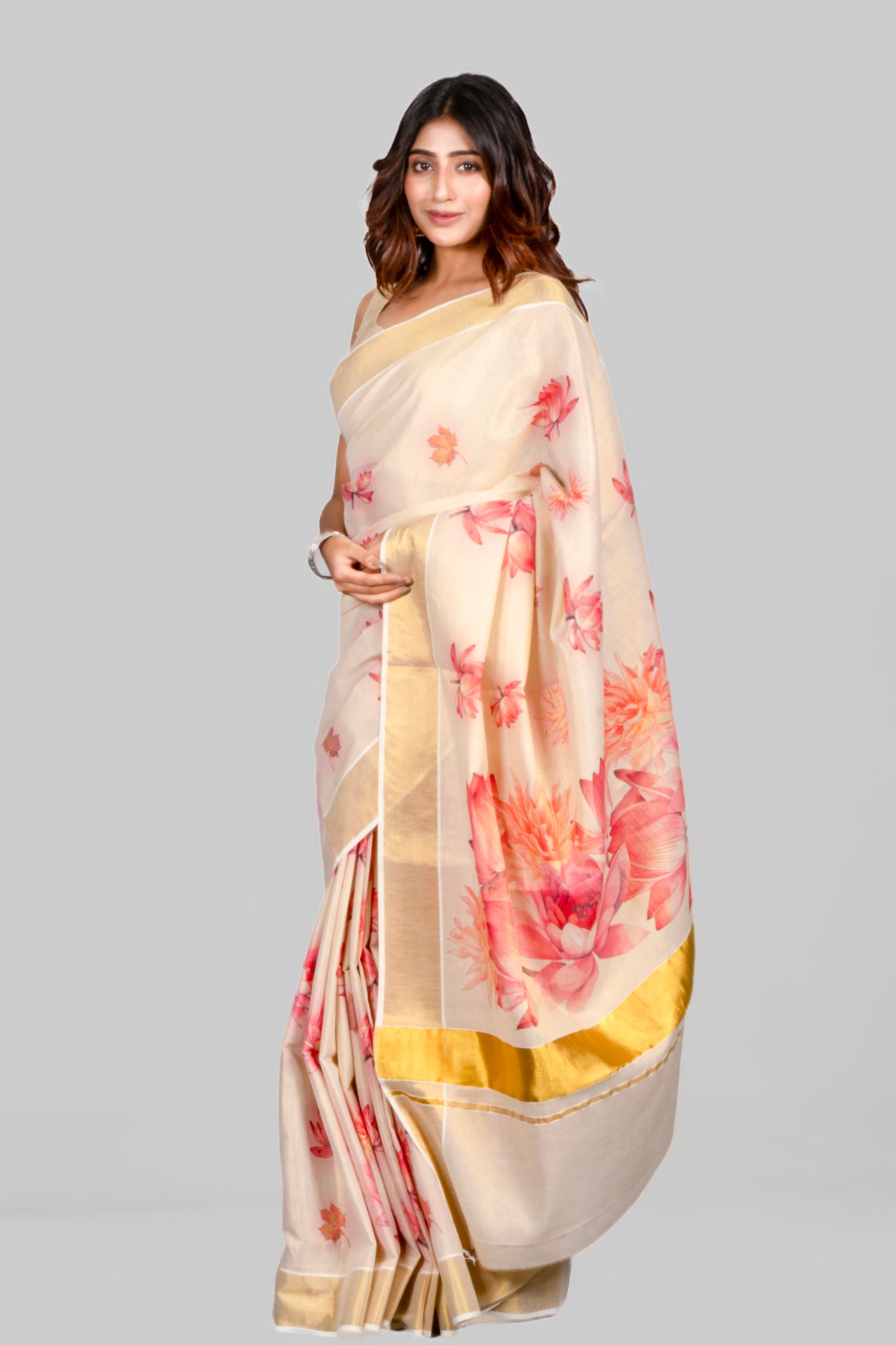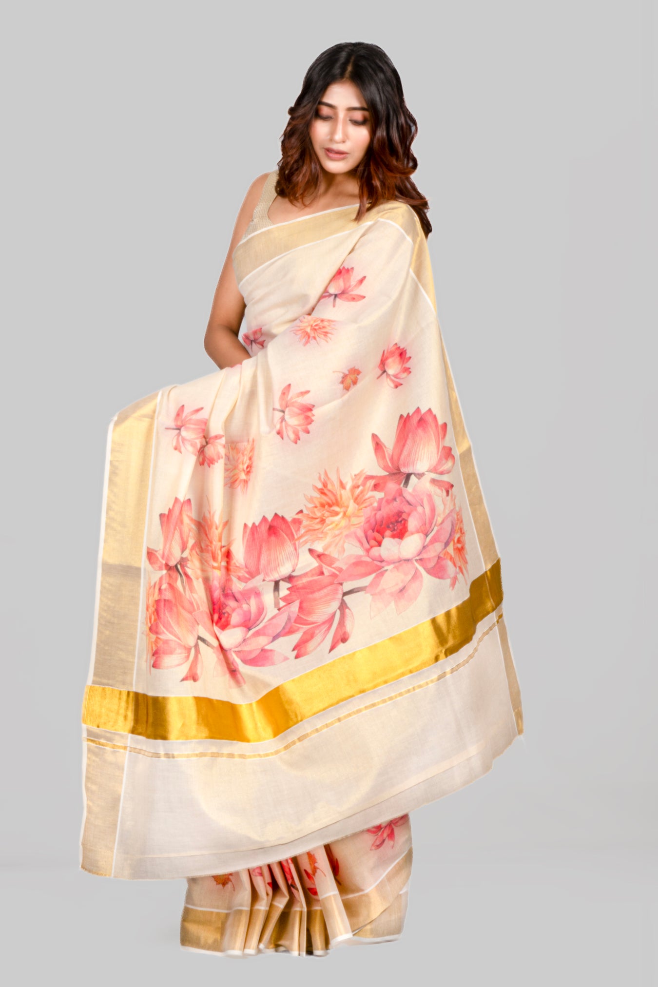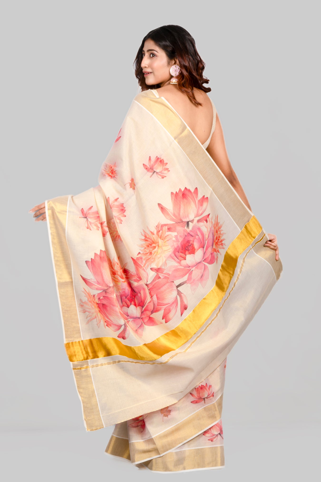 Size: 5.50Mtr B: 0.80MtrColor: Off WhiteFabric: Kasavu Cotton Pattern and print: A lotus motif that features vibrant and vivid watercolor-style illustrations of flowers. Watercolor is a painting technique that uses translucent pigments, creating a soft and fluid appearance, typically associated with a sense of delicacy and artistic expression. Pack contains: 1 Saree, 1 BlouseCare instructions: Dry wash