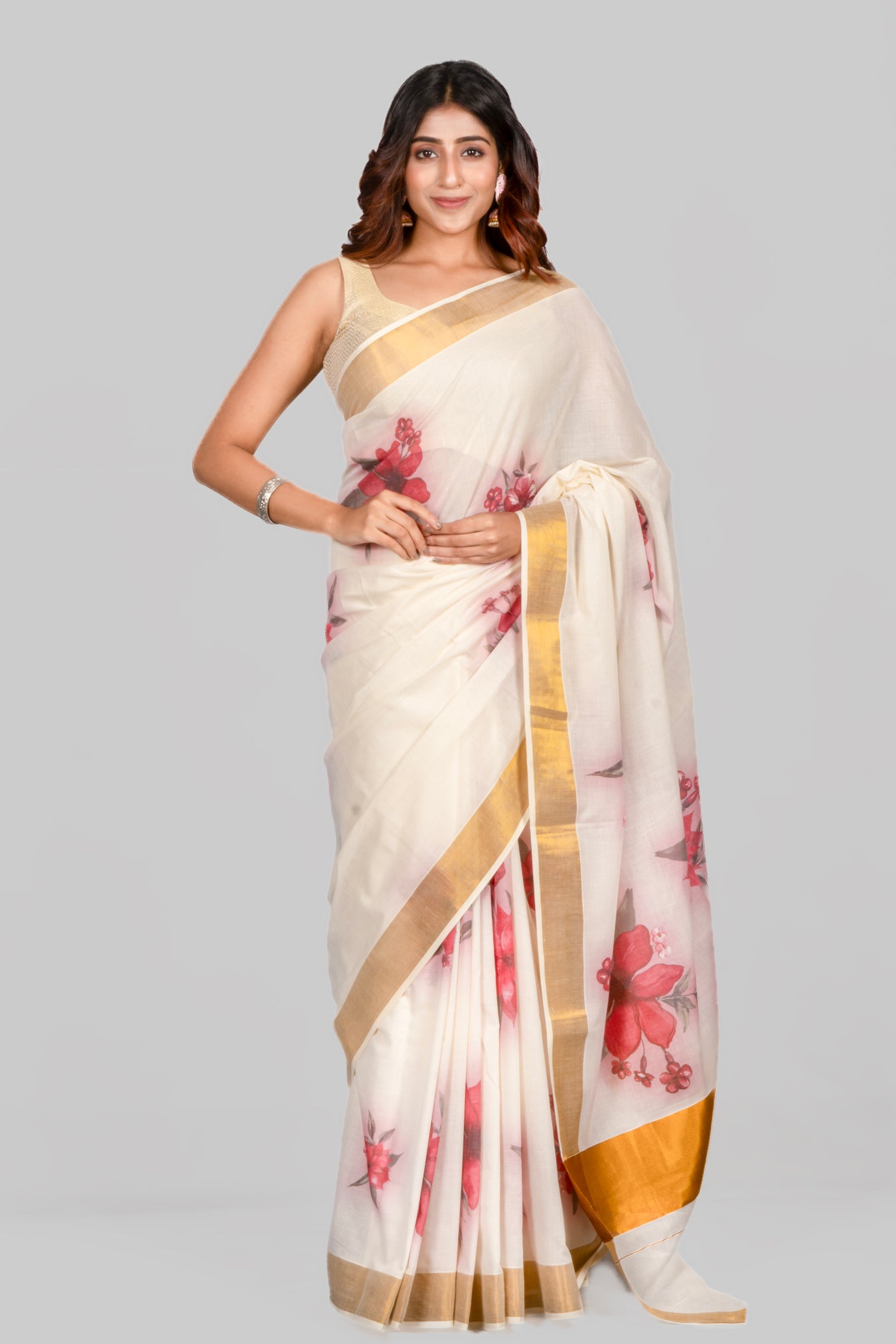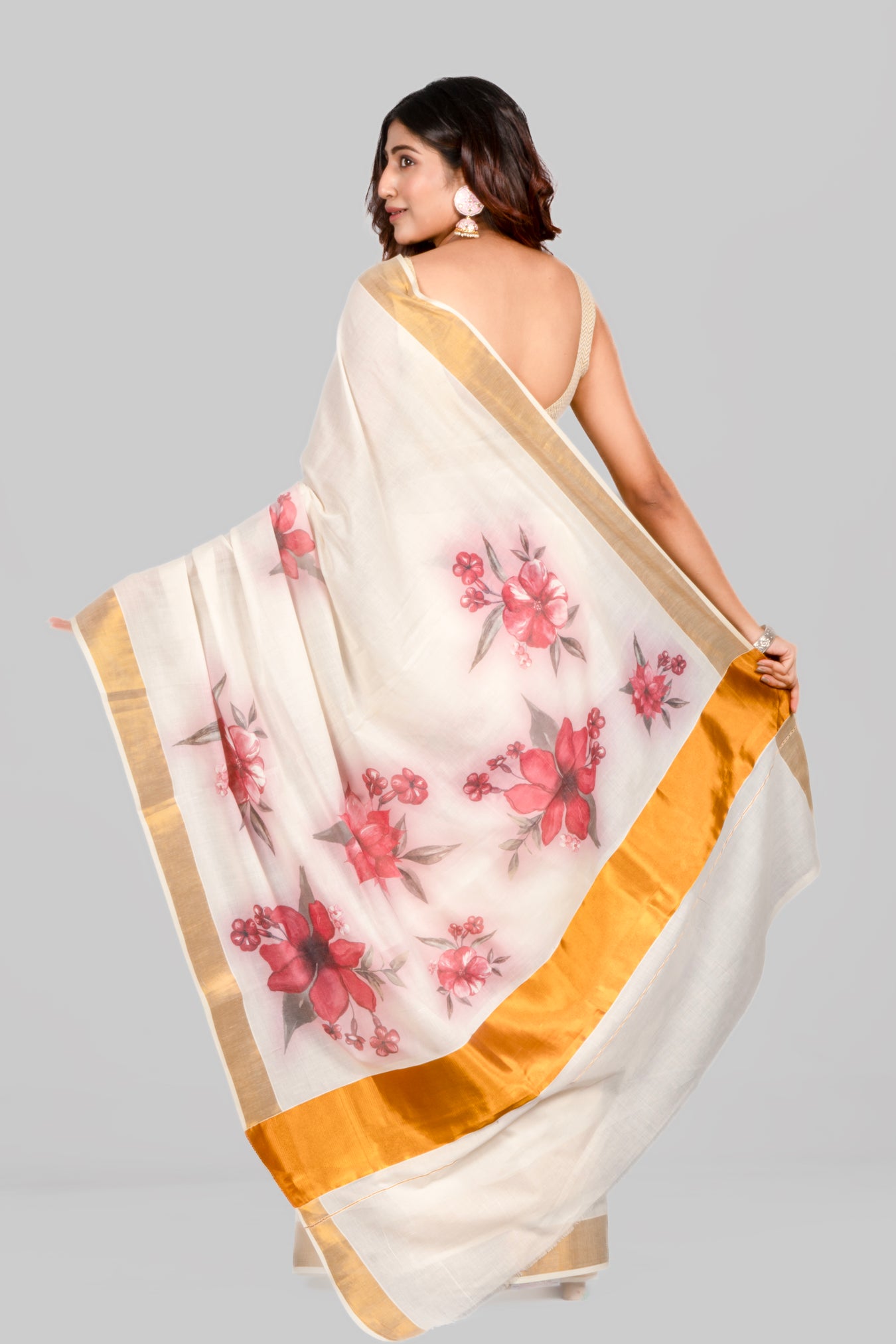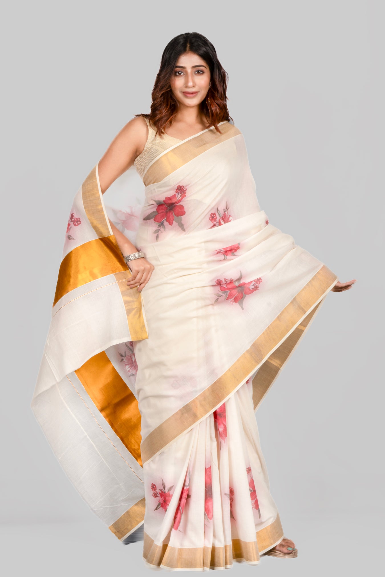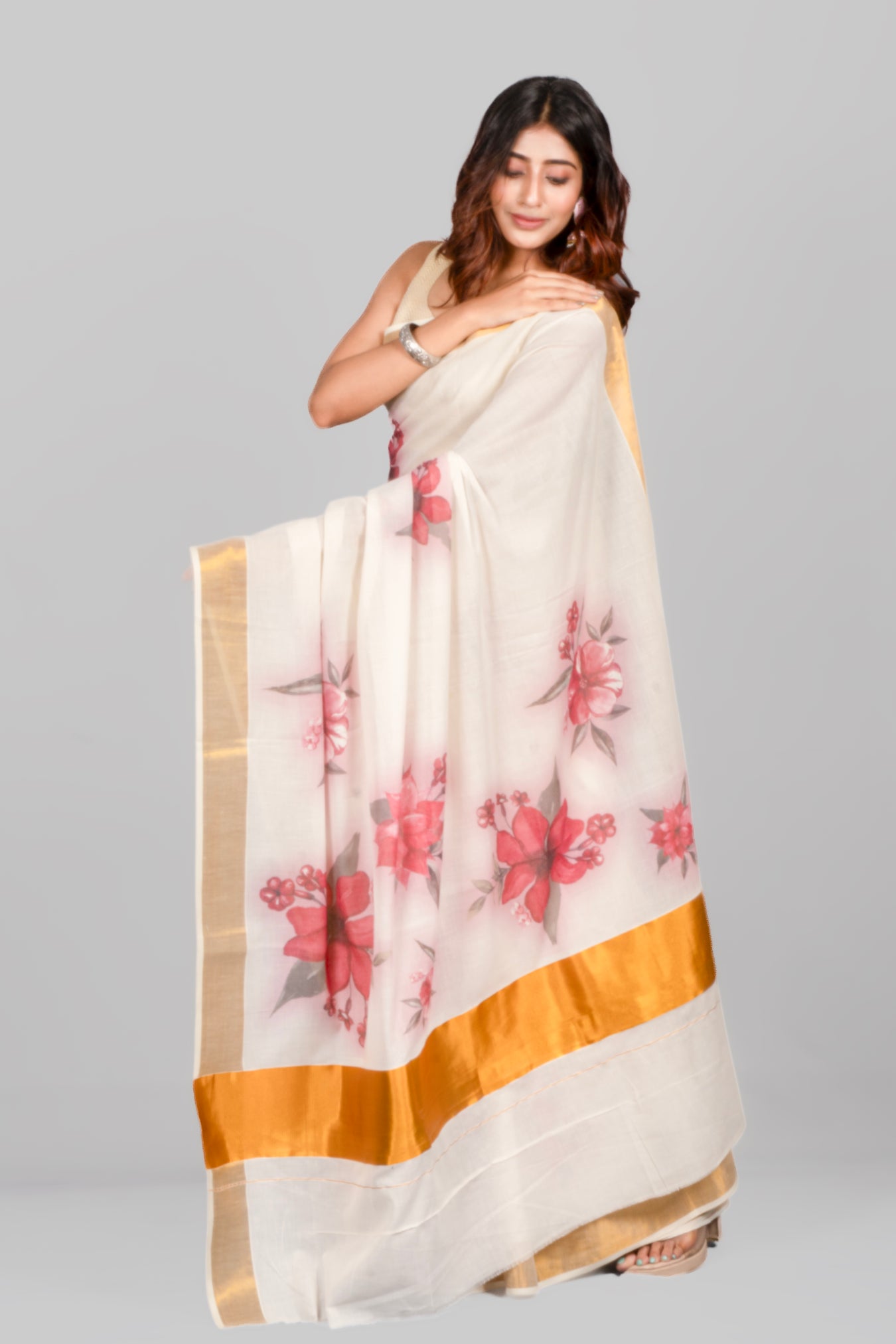 Size: 5.50Mtr BP: 0.80MtrColor: Off WhiteFabric: Kasavu Cotton Pattern and print: A Hibiscus motif that features vibrant and vivid watercolor-style illustrations of flowers. Watercolor is a painting technique that uses translucent pigments, creating a soft and fluid appearance, typically associated with a sense of delicacy and artistic expression. Pack contains: 1 Saree, 1 BlouseCare instructions: Dry wash