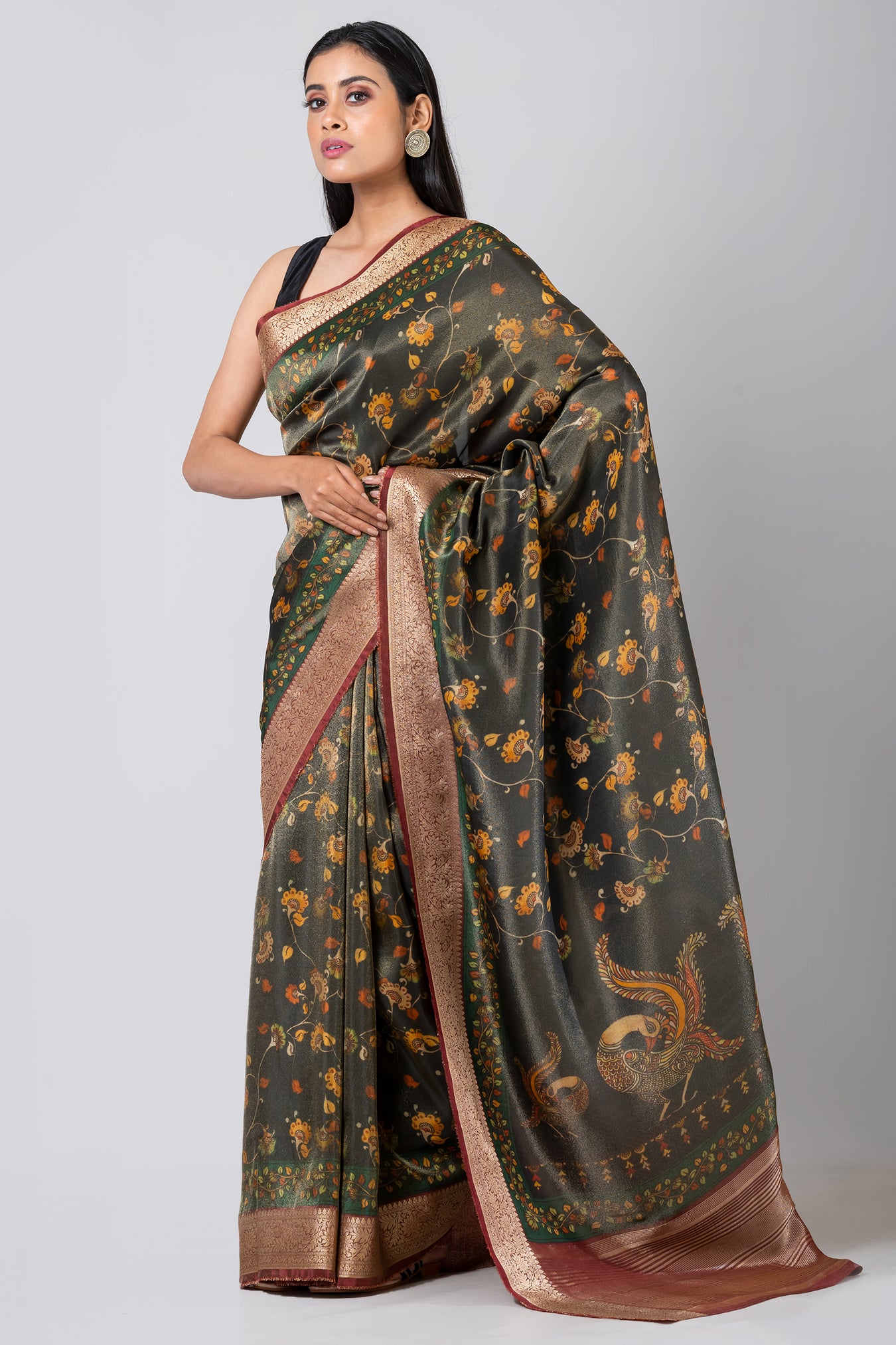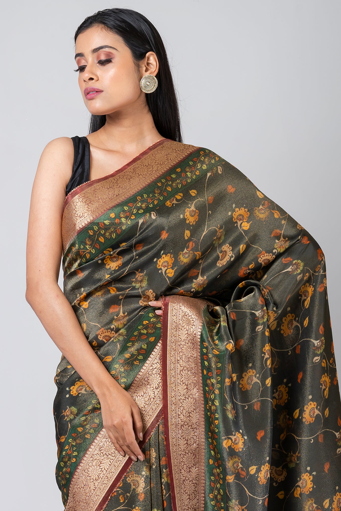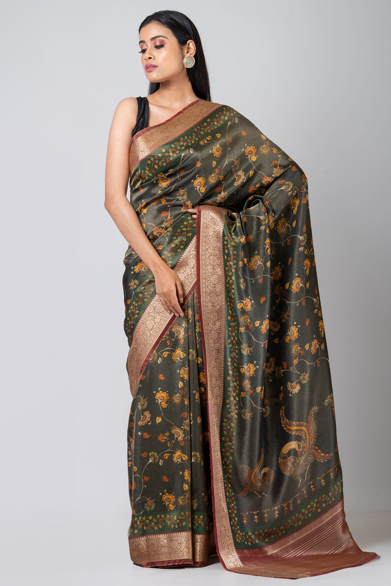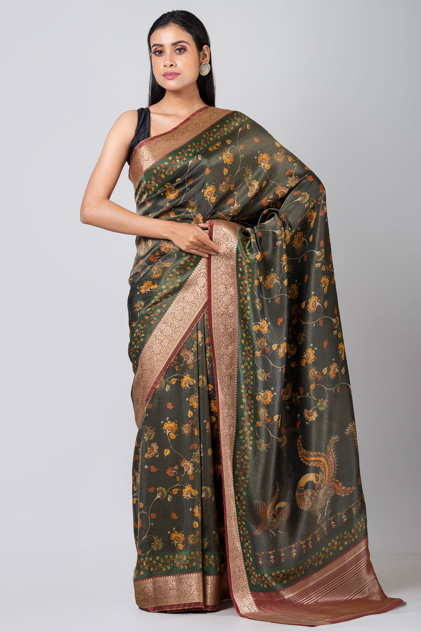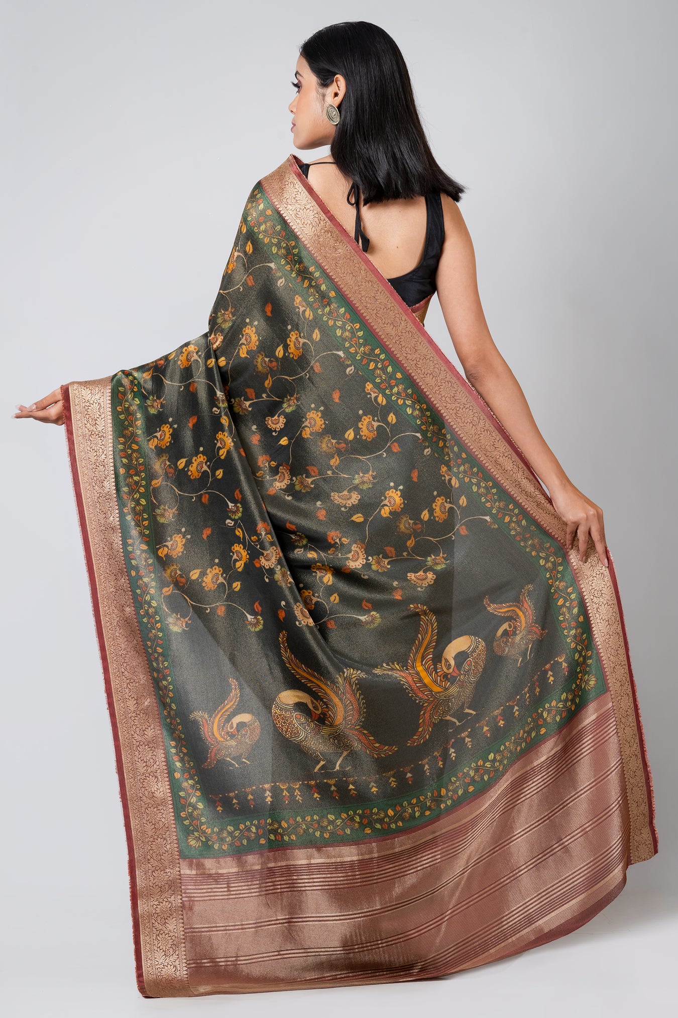 Size: S: 5.50Mtr B: 0.80MtrColour: DARK GREENFabric: ORGANZA TISSUE ZARIPattern and print: The dark green colour organza tissue zari saree exudes sophistication with its subtle color and elegant zari border. Adorned with a traditional Kalamkari design, it radiates vibrancy and effortlessly draws attention.Silk purity: Pack contains: 1 Saree, 1 BlouseCare instructions: Dry wash
