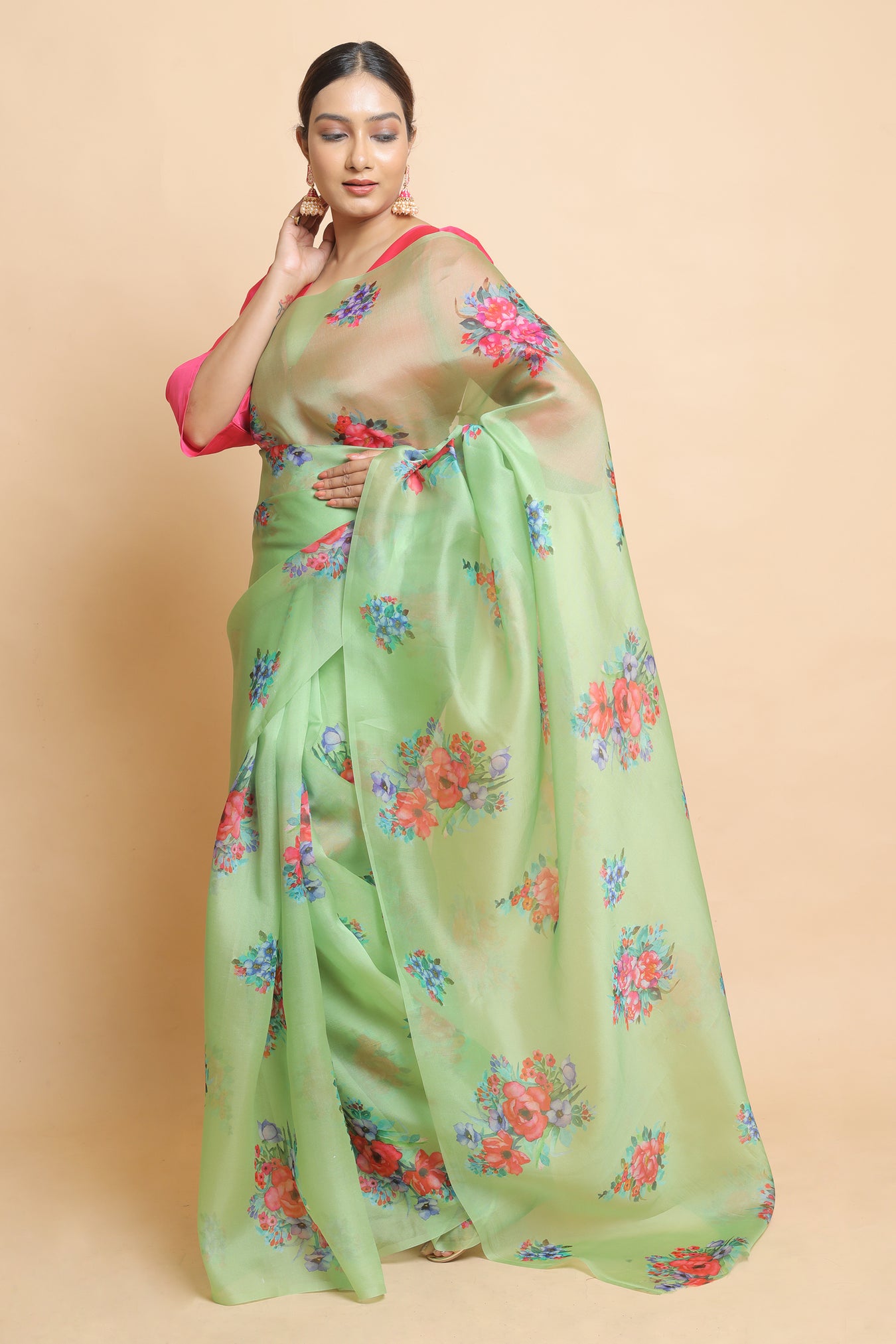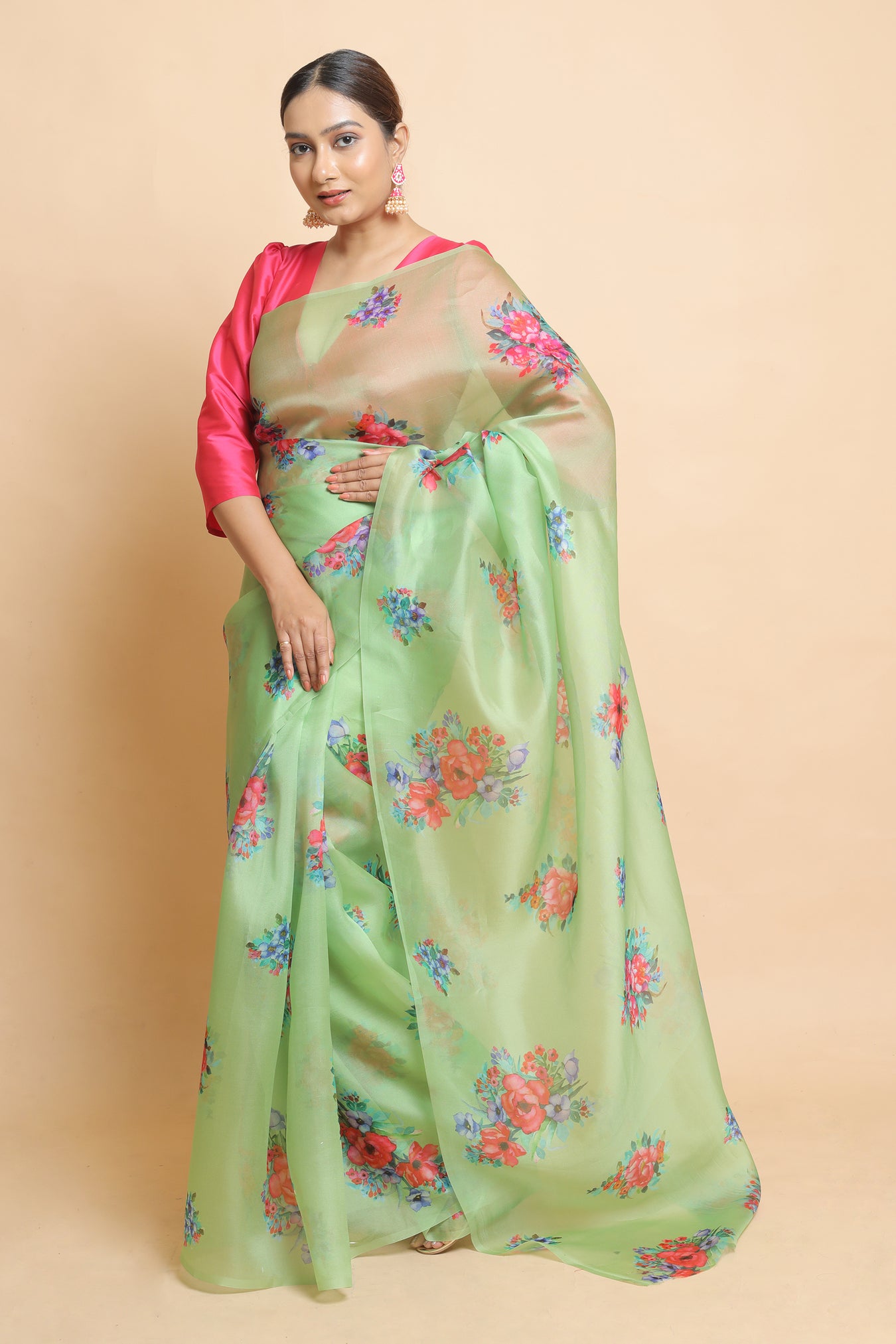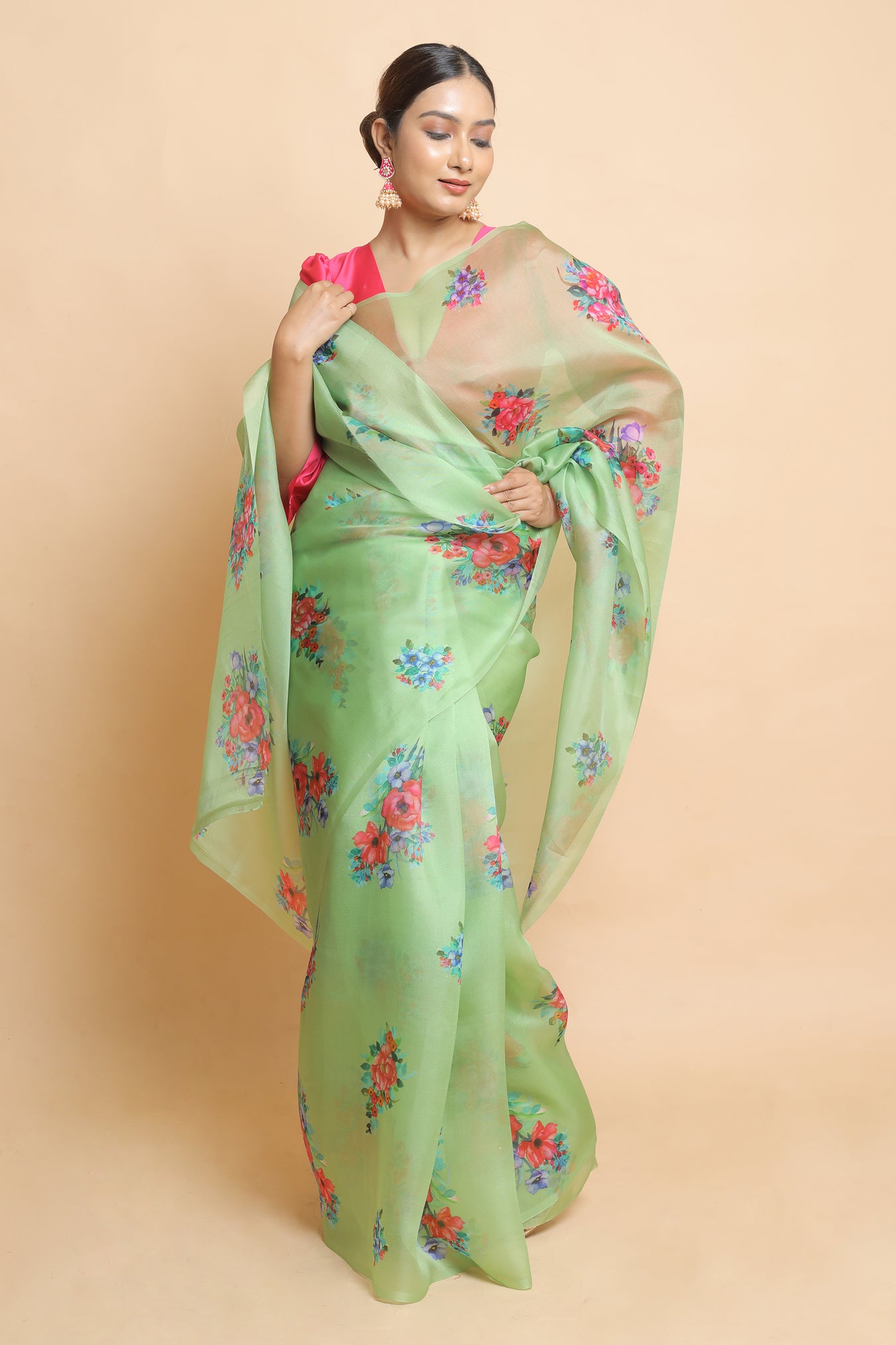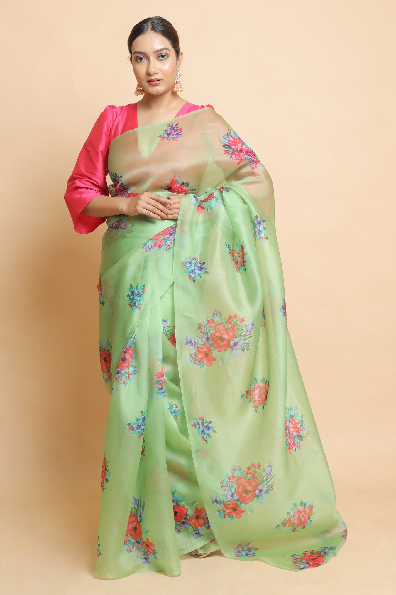 Pattern and print: Indulge in the simplicity and beauty of our half-and-half sari, where the luxurious feel of organza silk meets the smoothness of satin crepe. This saree, in a soft light green shade, is adorned with delicate hand-painted floral digital prints, embodying the essence of pure femininity.