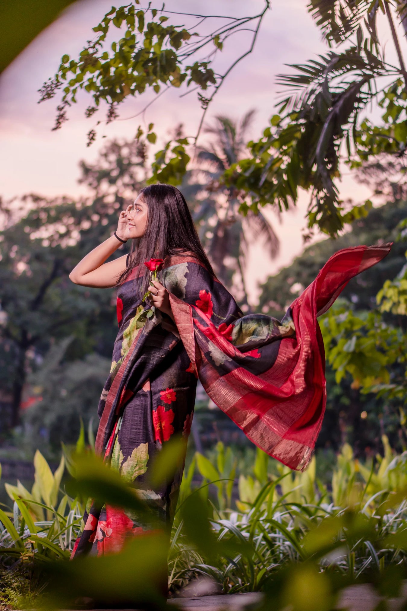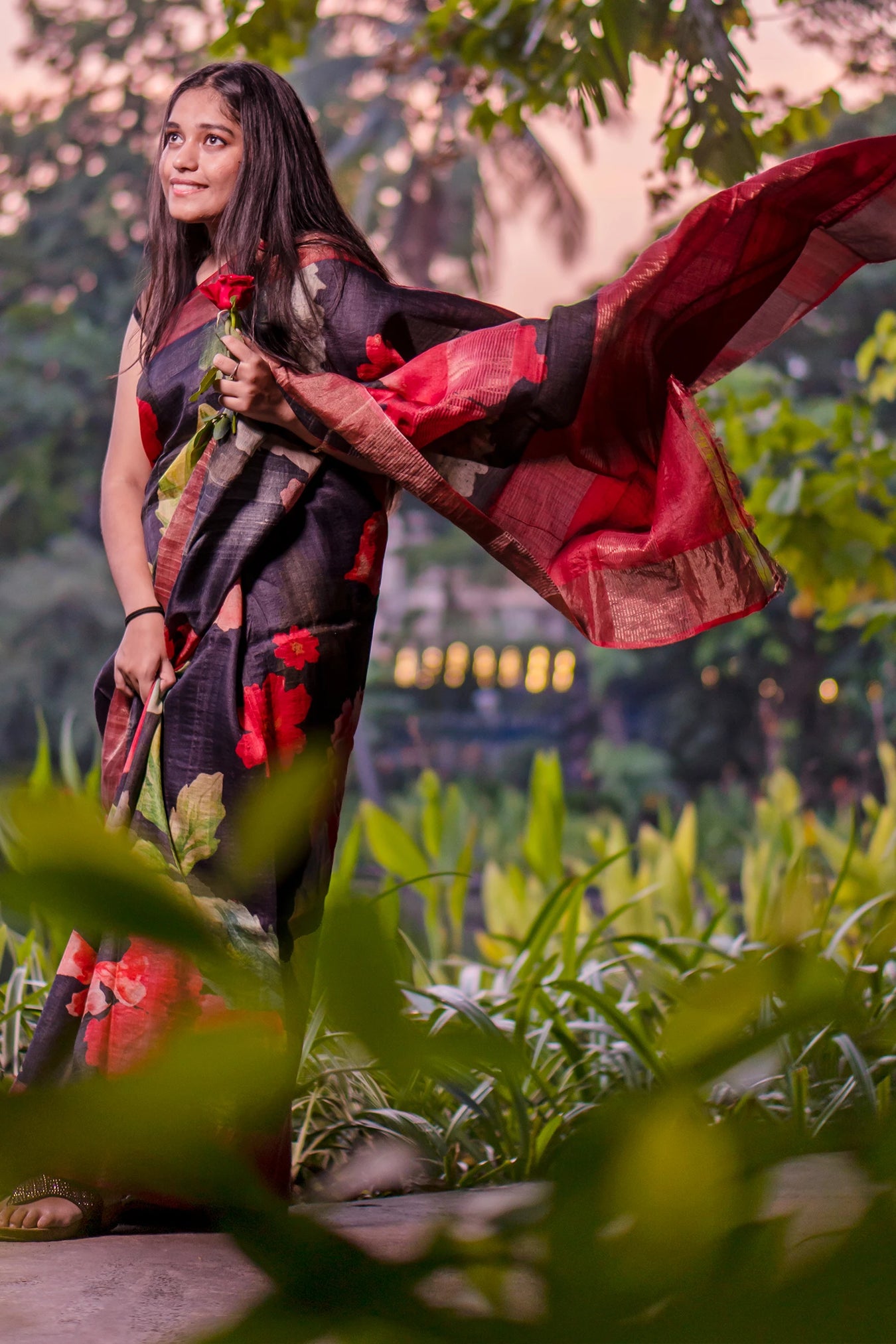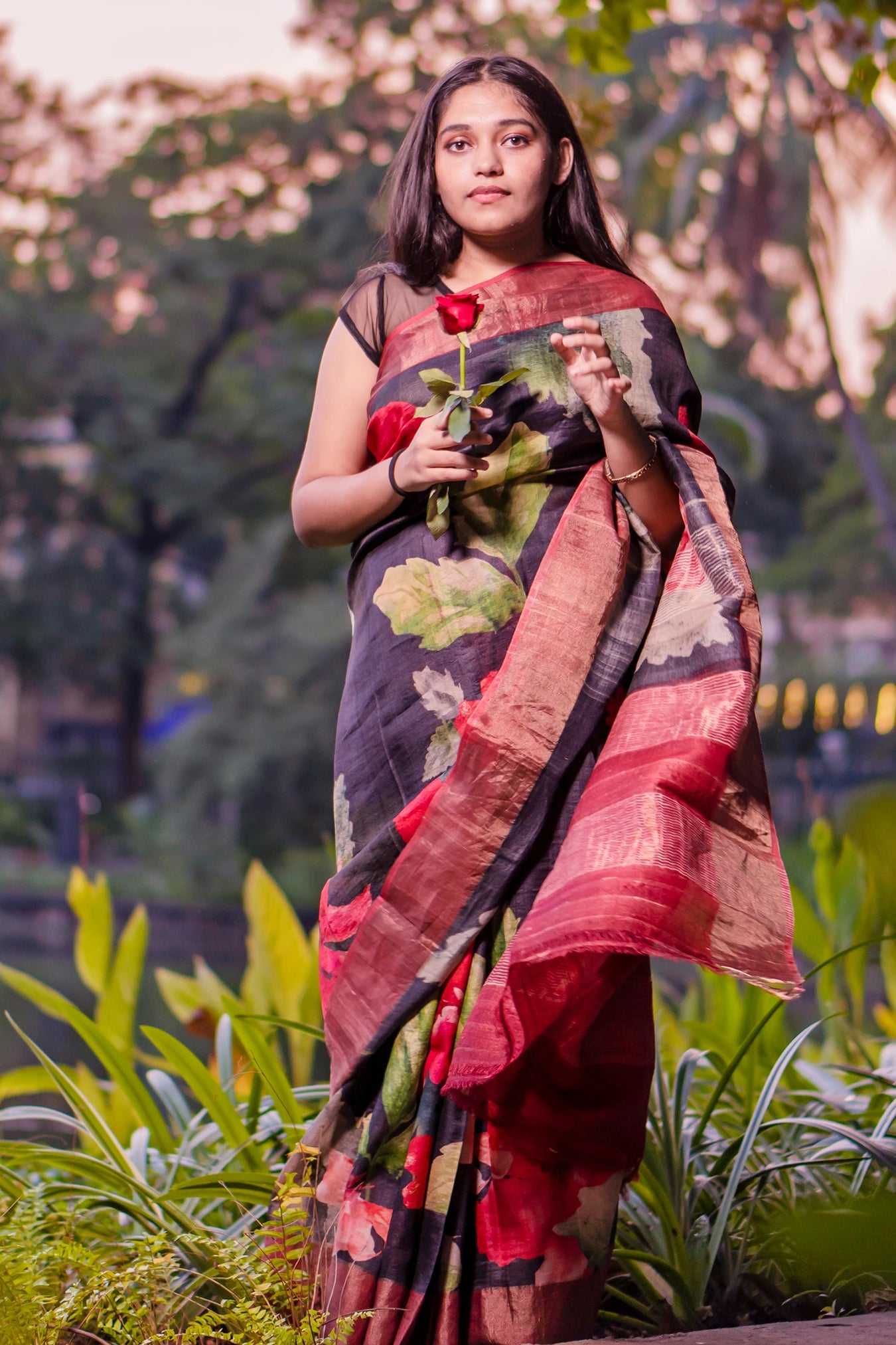 Size: S: 5.50Mtr B: 0.80MtrColour: BlackFabric: TUSSAR ZARIPattern and print: Make a bold statement with our black color saree showcasing a rich red zari border and captivating big digital flower print throughout. This eye-catching ensemble effortlessly combines tradition with contemporary flair."Silk purity: Pack contains: 1 Saree, 1 BlouseCare instructions: Dry wash