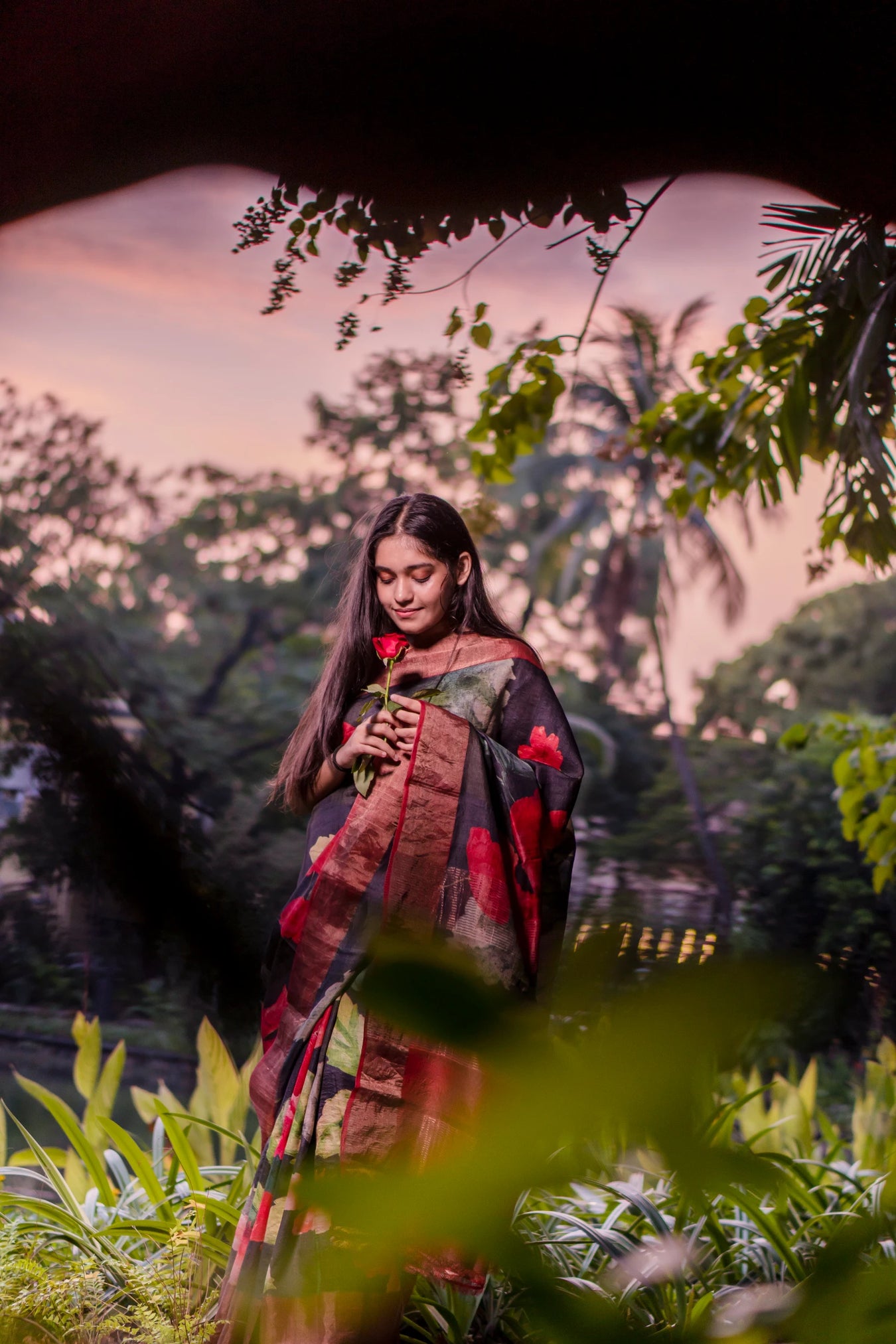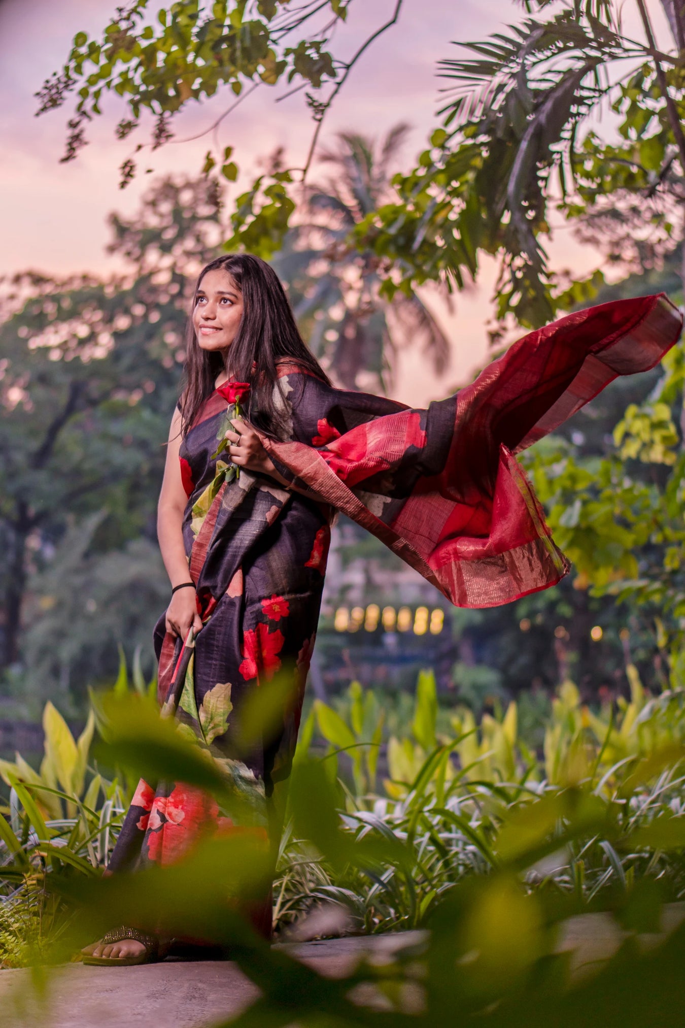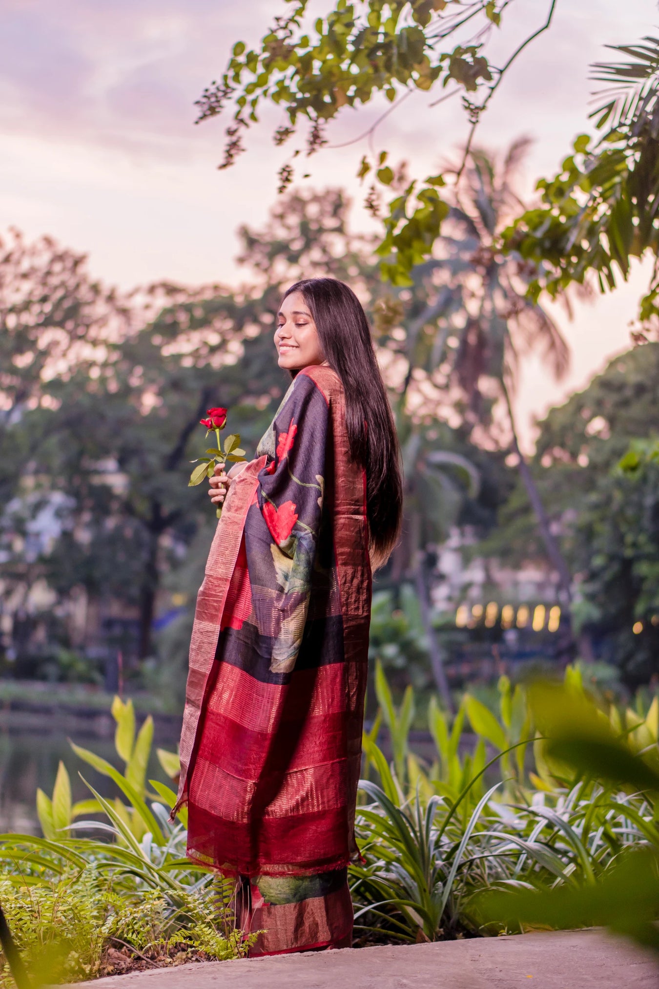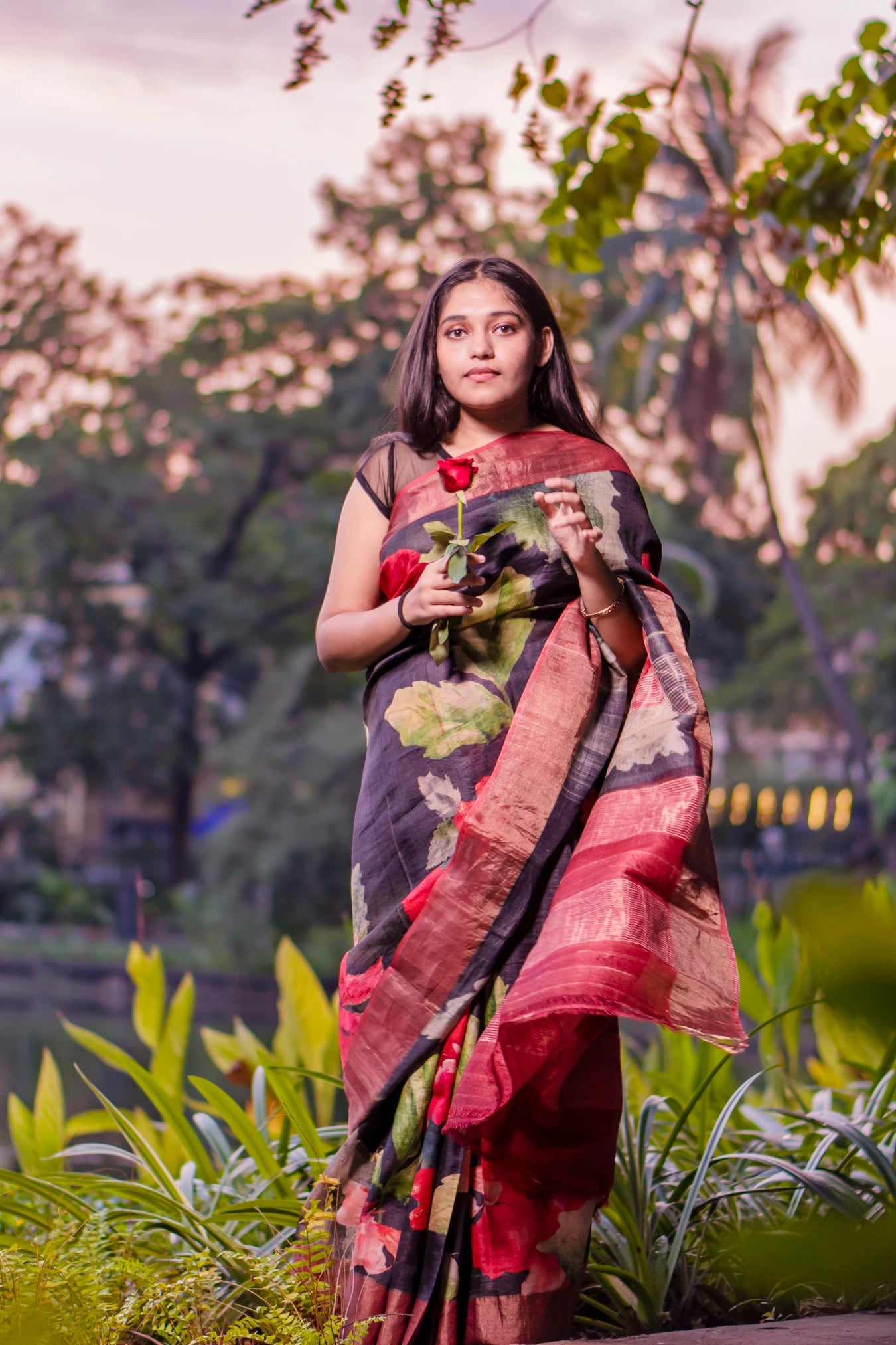 Size: S: 5.50Mtr B: 0.80MtrColour: BlackFabric: TUSSAR ZARIPattern and print: Make a bold statement with our black color saree showcasing a rich red zari border and captivating big digital flower print throughout. This eye-catching ensemble effortlessly combines tradition with contemporary flair."Silk purity: Pack contains: 1 Saree, 1 BlouseCare instructions: Dry wash