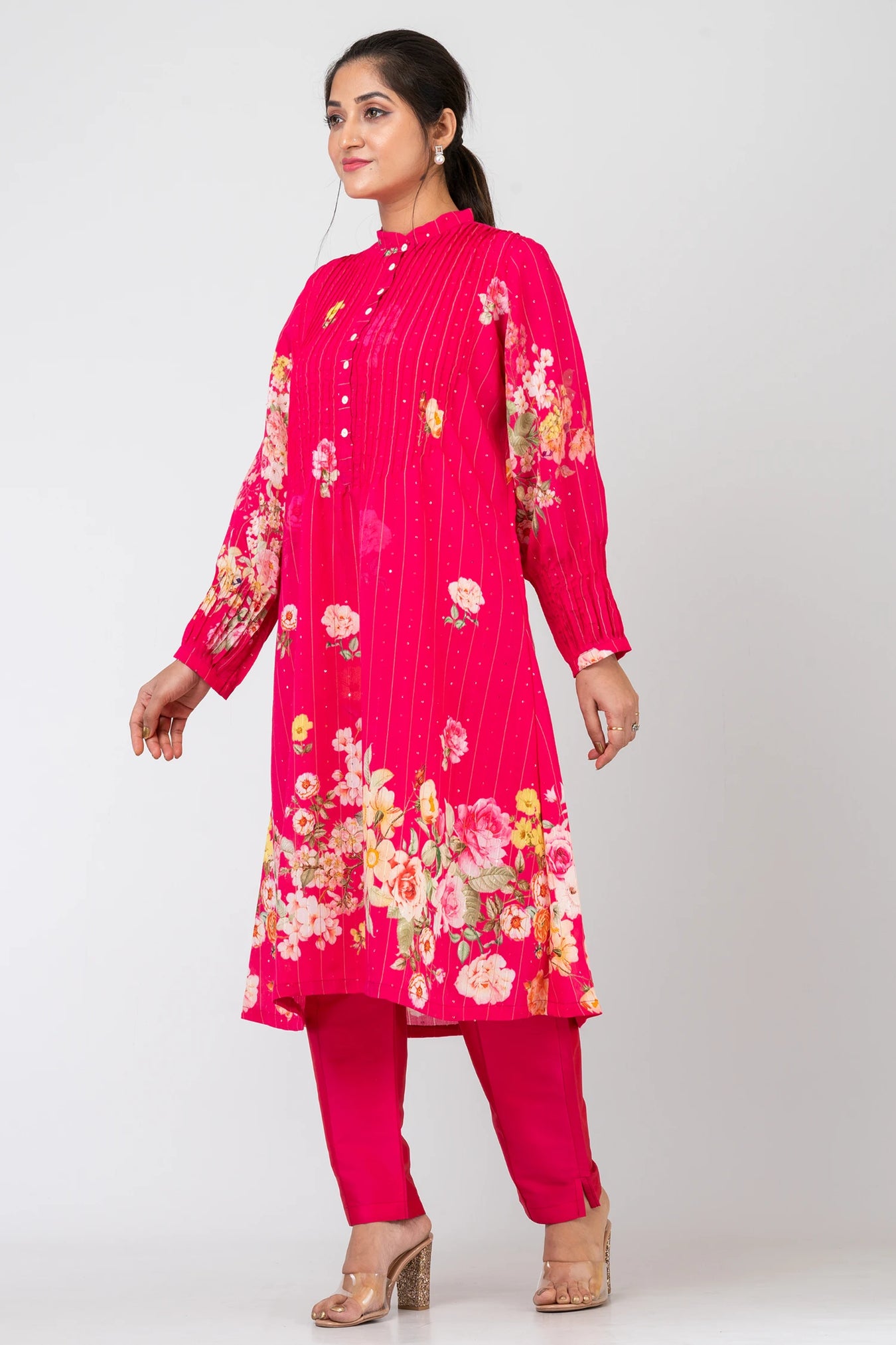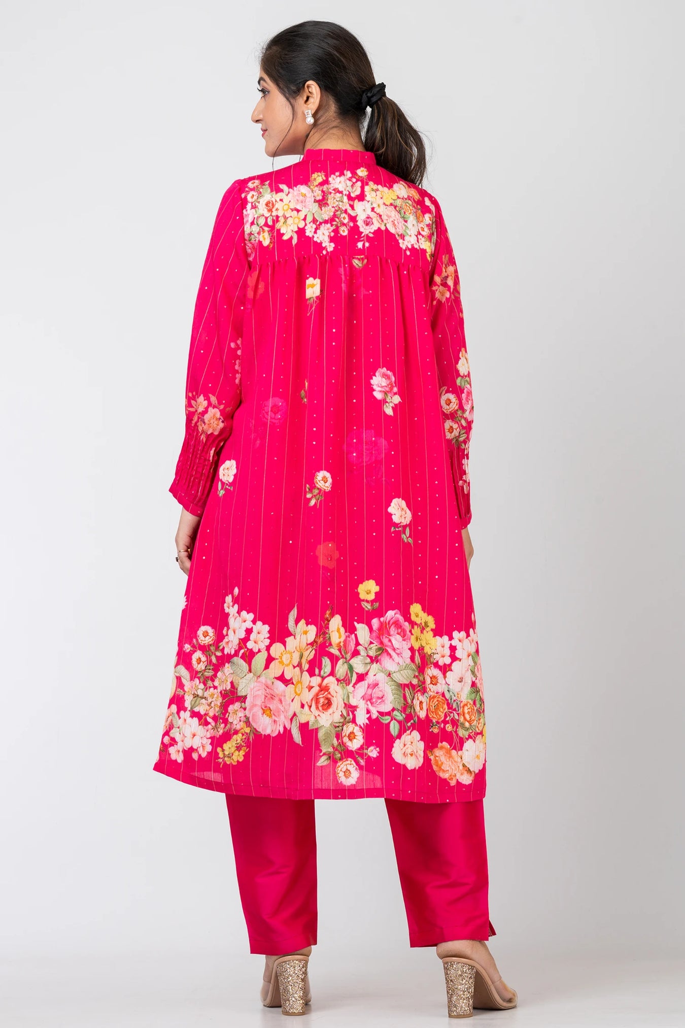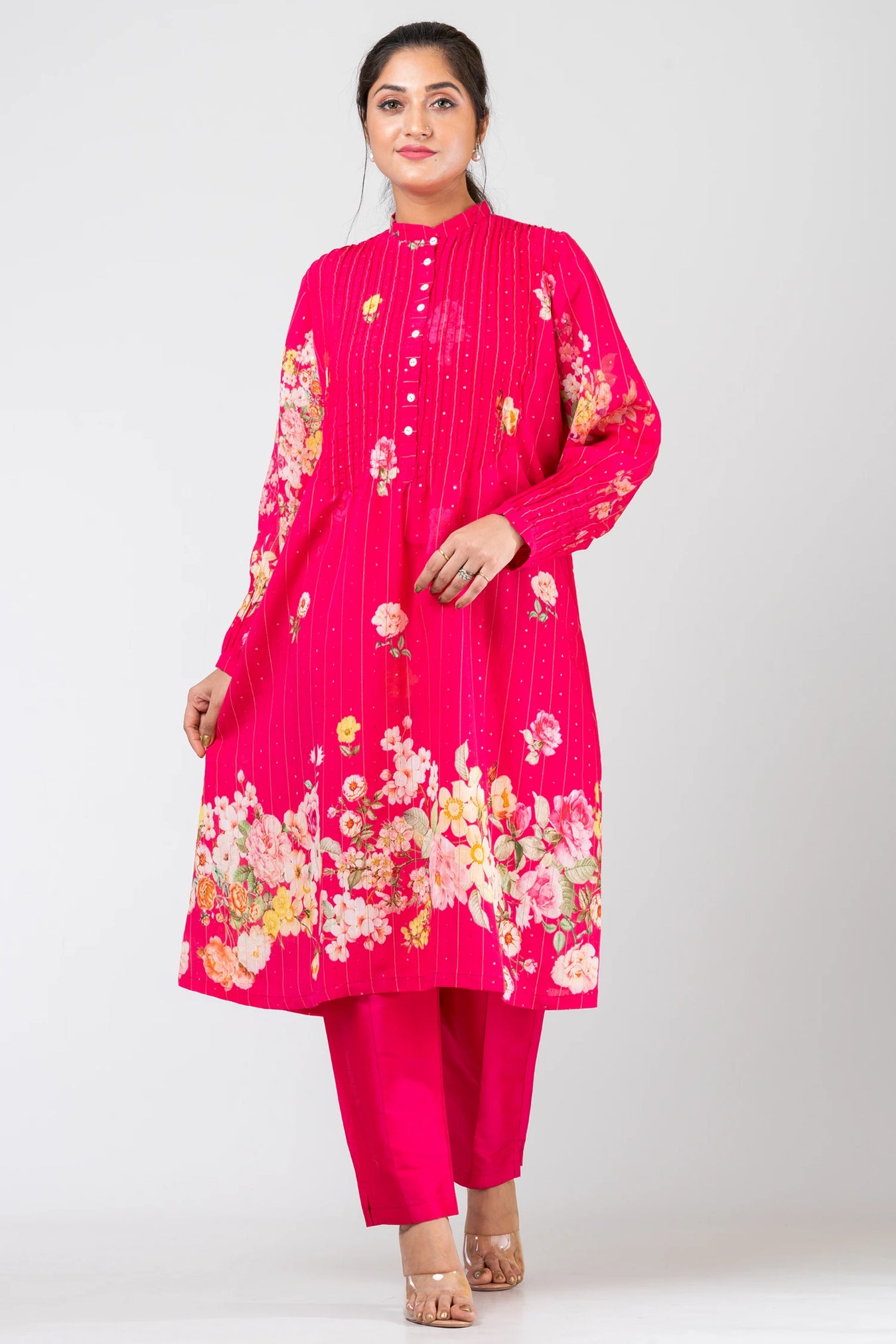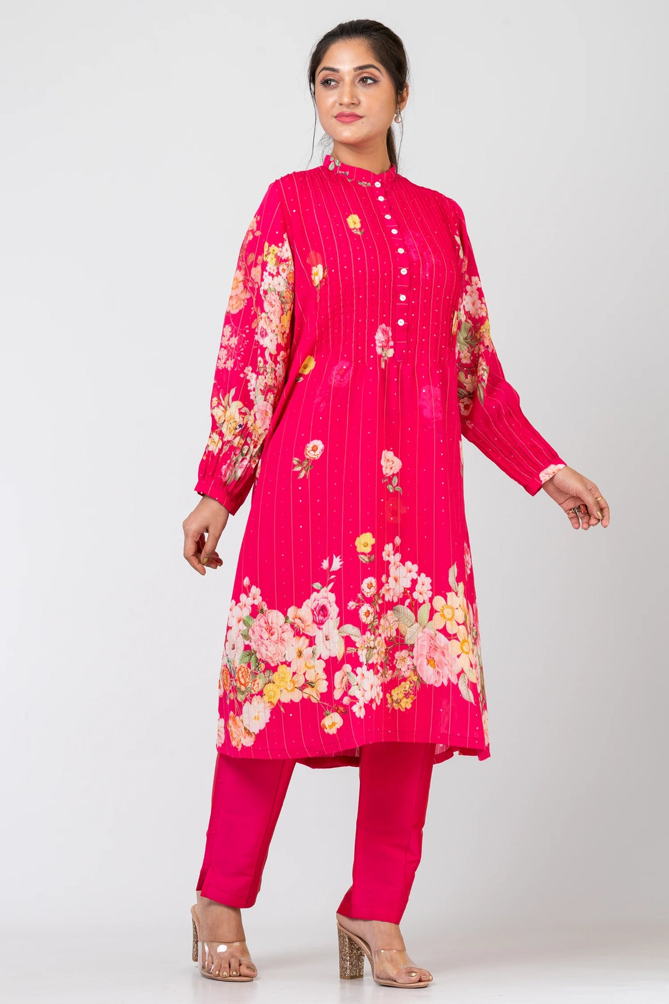 Colour:Â PinkFabric:Â Sequence Woven Russian crepe, Raw Silk BottomsAttribute:Â Woven sequencePattern and print:Â Elevate your style with our kurti featuring a wild flower bouquet and delicate woven sequence, where the untamed beauty of nature's blooms meets elegant embellishments, creating a captivating and enchanting ensemble that exudes grace and charm.Purity:Â Natural FabricPack Contains:Â 1 Kurti, 1 PantCare instructions:Â Hand wash
