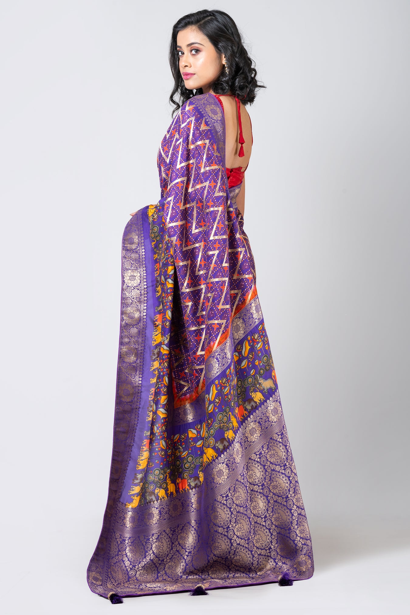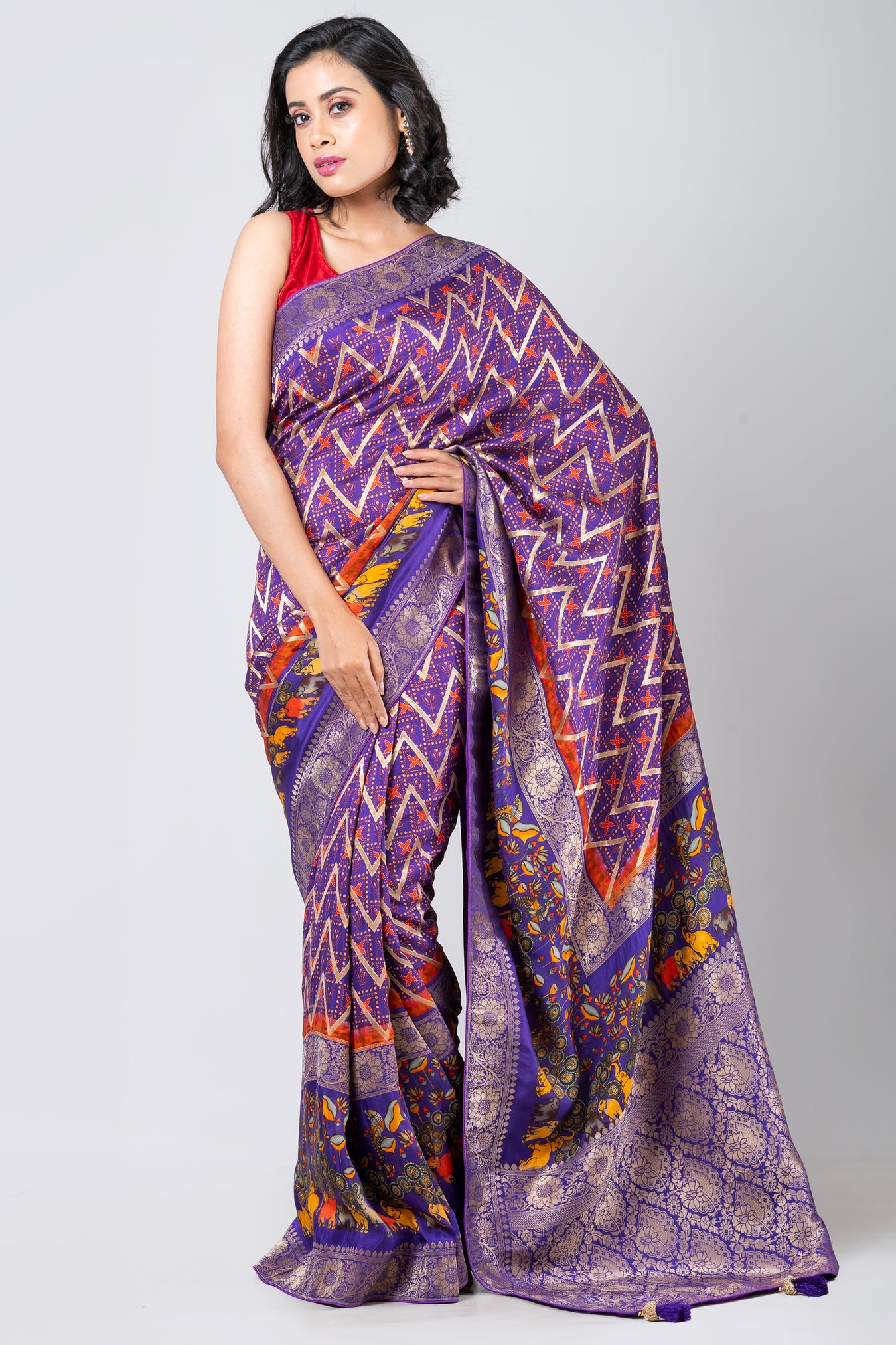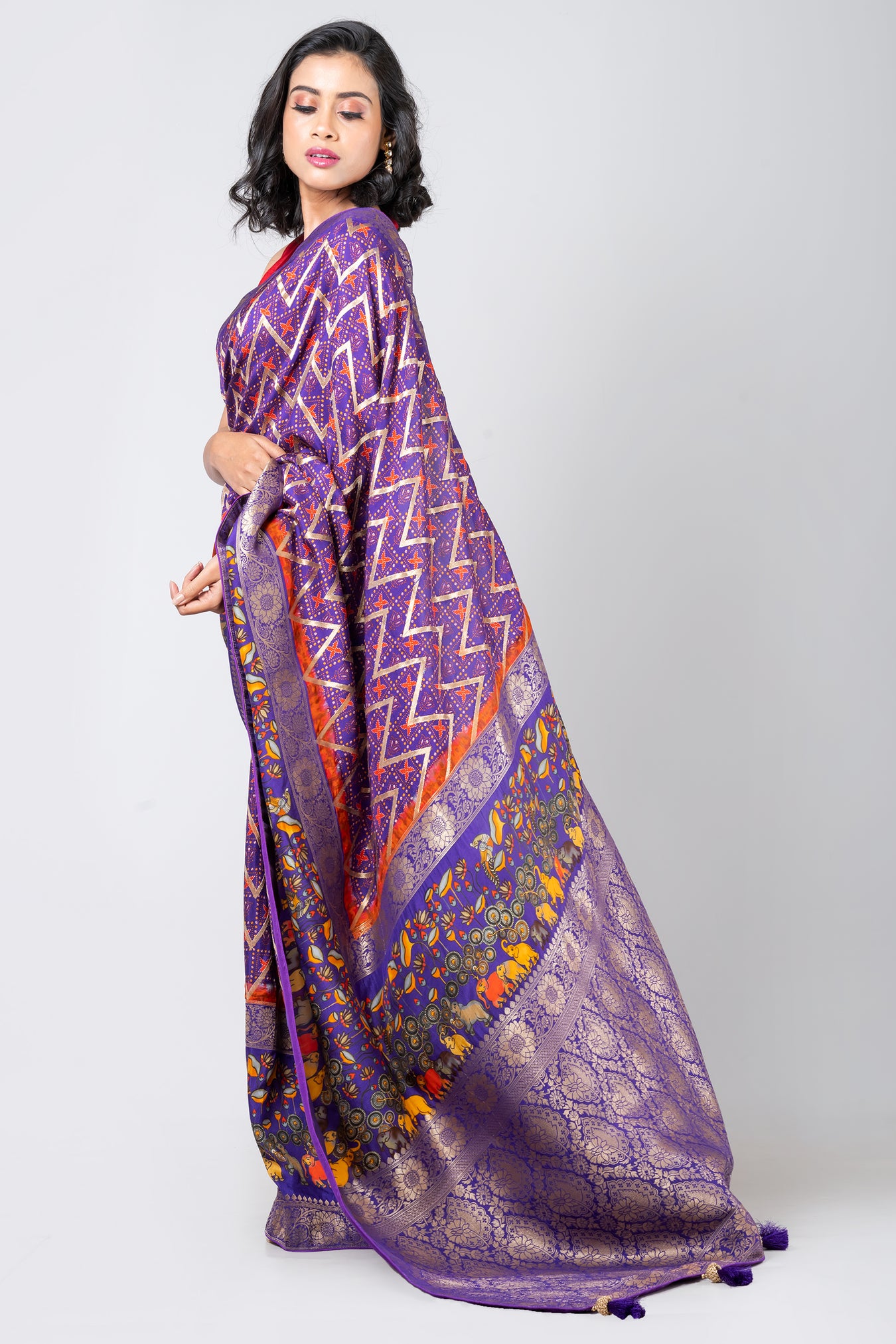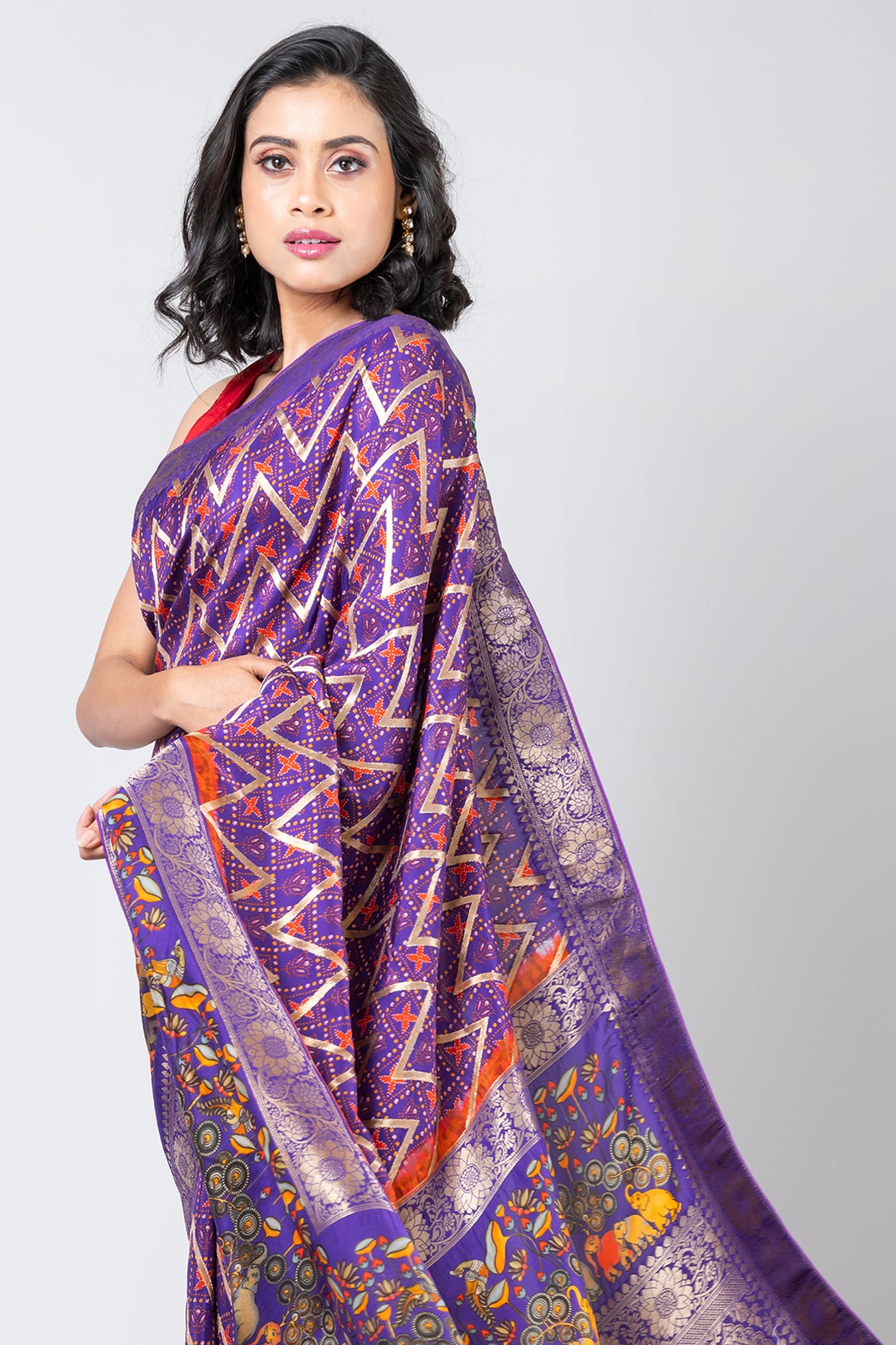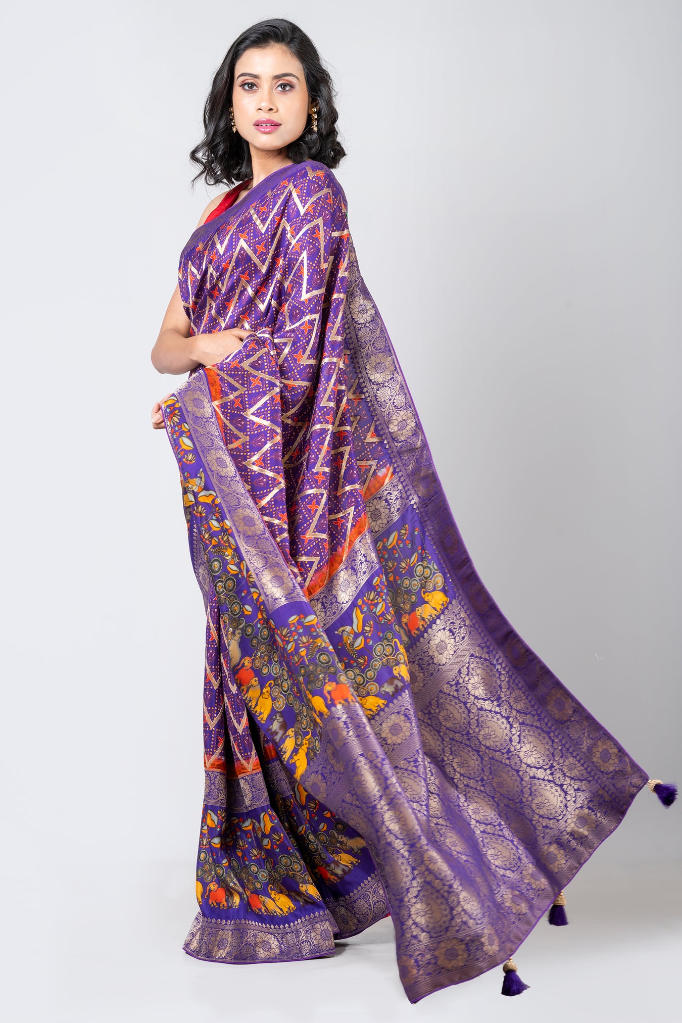 Size: S: 5.50Mtr B: 0.80MtrColour: VIOLETFabric: DOLA LEHARIYAPattern and print: The combination of violet color saree, kalamkari border, zari lahria all over work and a heavy jari border really creates a beautiful blend of contemporary and traditional elements in this saree.Silk purity: Pack contains: 1 Saree, 1 BlouseCare instructions: Dry wash