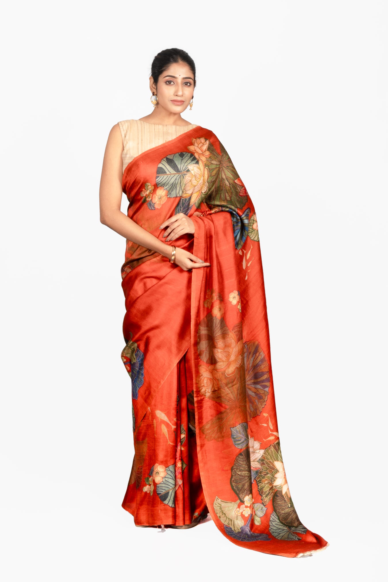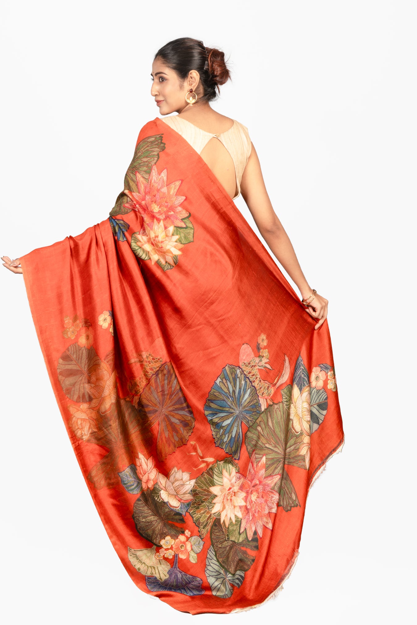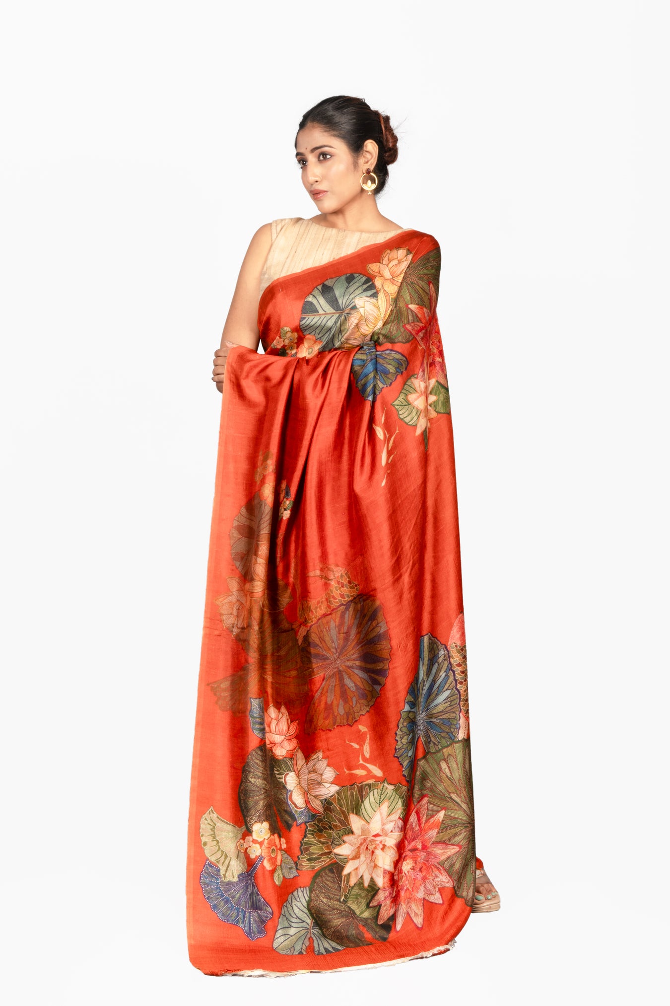 Size: 5.50Mtr B: 0.80MtrColor: WhiteFabric: Mulberry SilkPattern and print: A stunning rust-orange saree adorned with bold lotus and foliage motifs, blending traditional elegance with artistic charm for a statement-worthy look. Purity: Natural fabricCare instructions: Dry wash