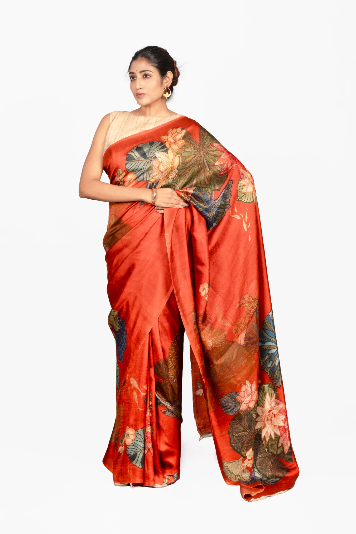 Bold rust-orange saree with artistic lotus motifs, perfect for a rich and elegant statement.