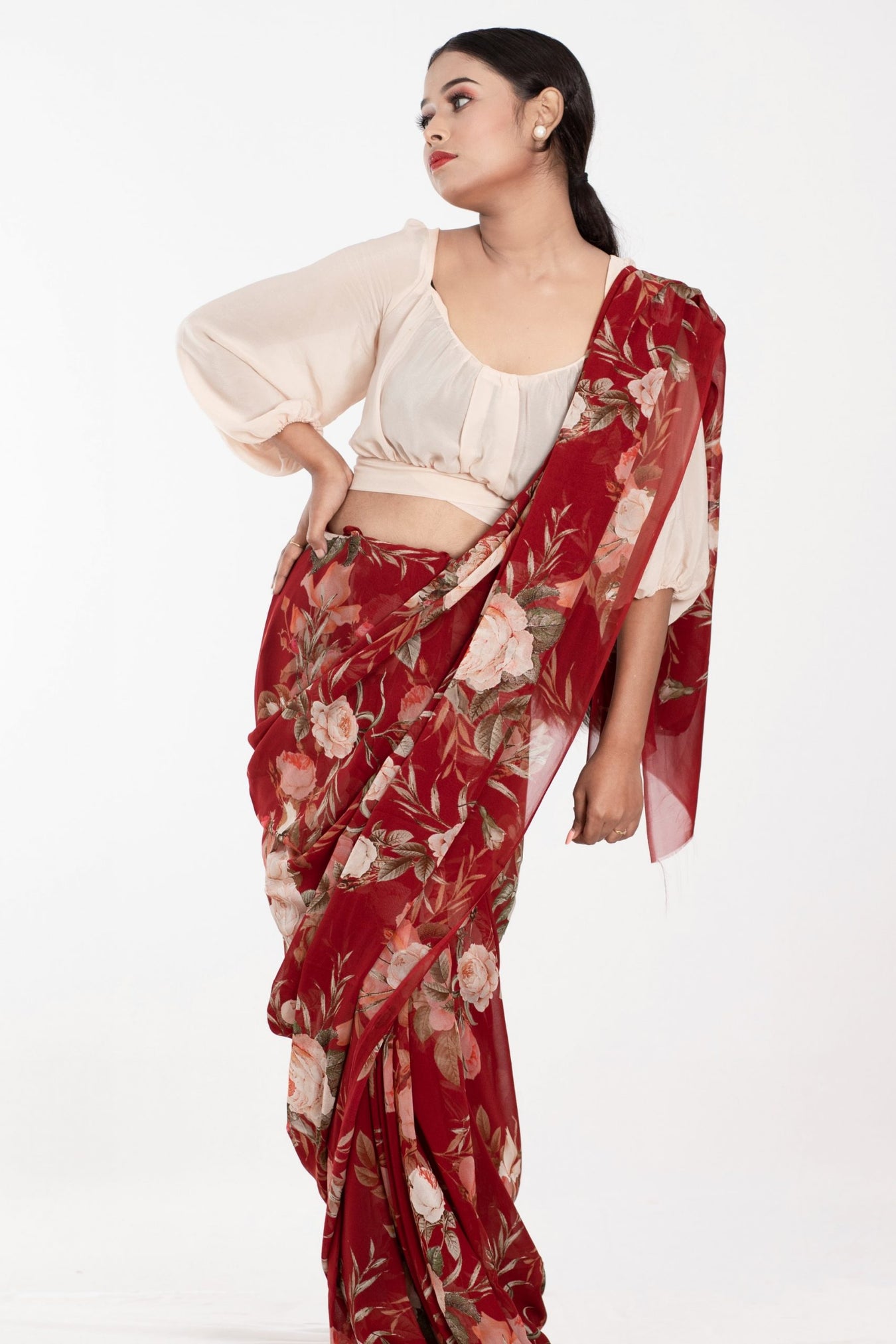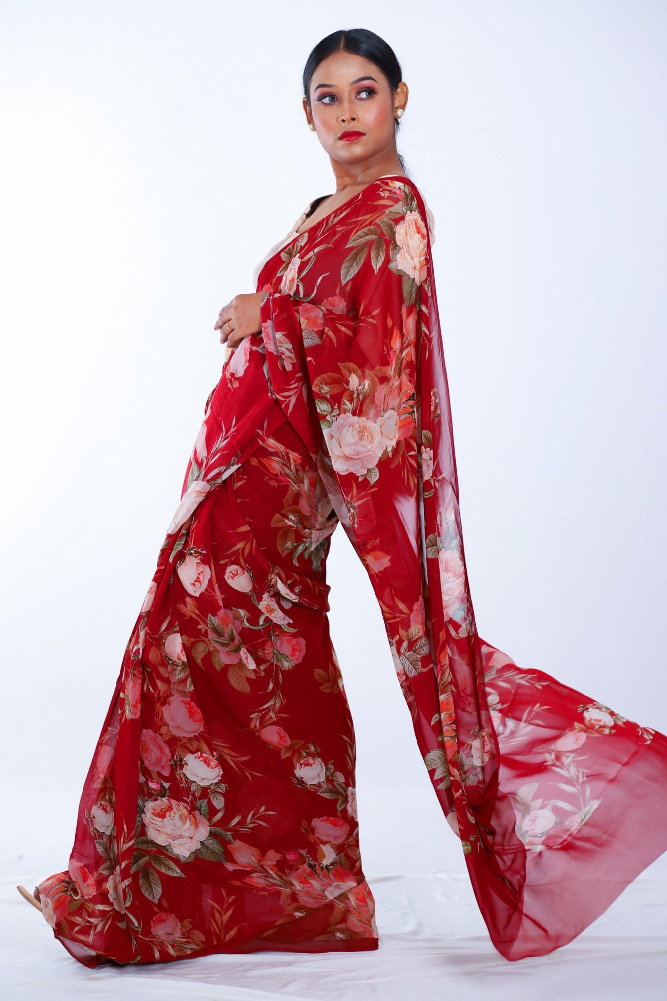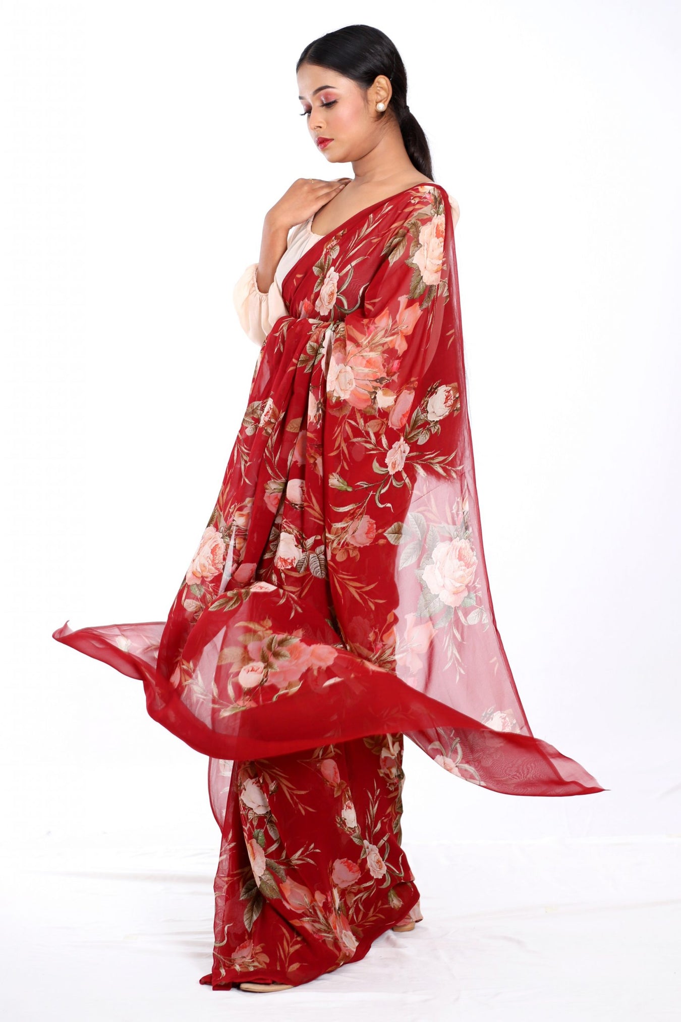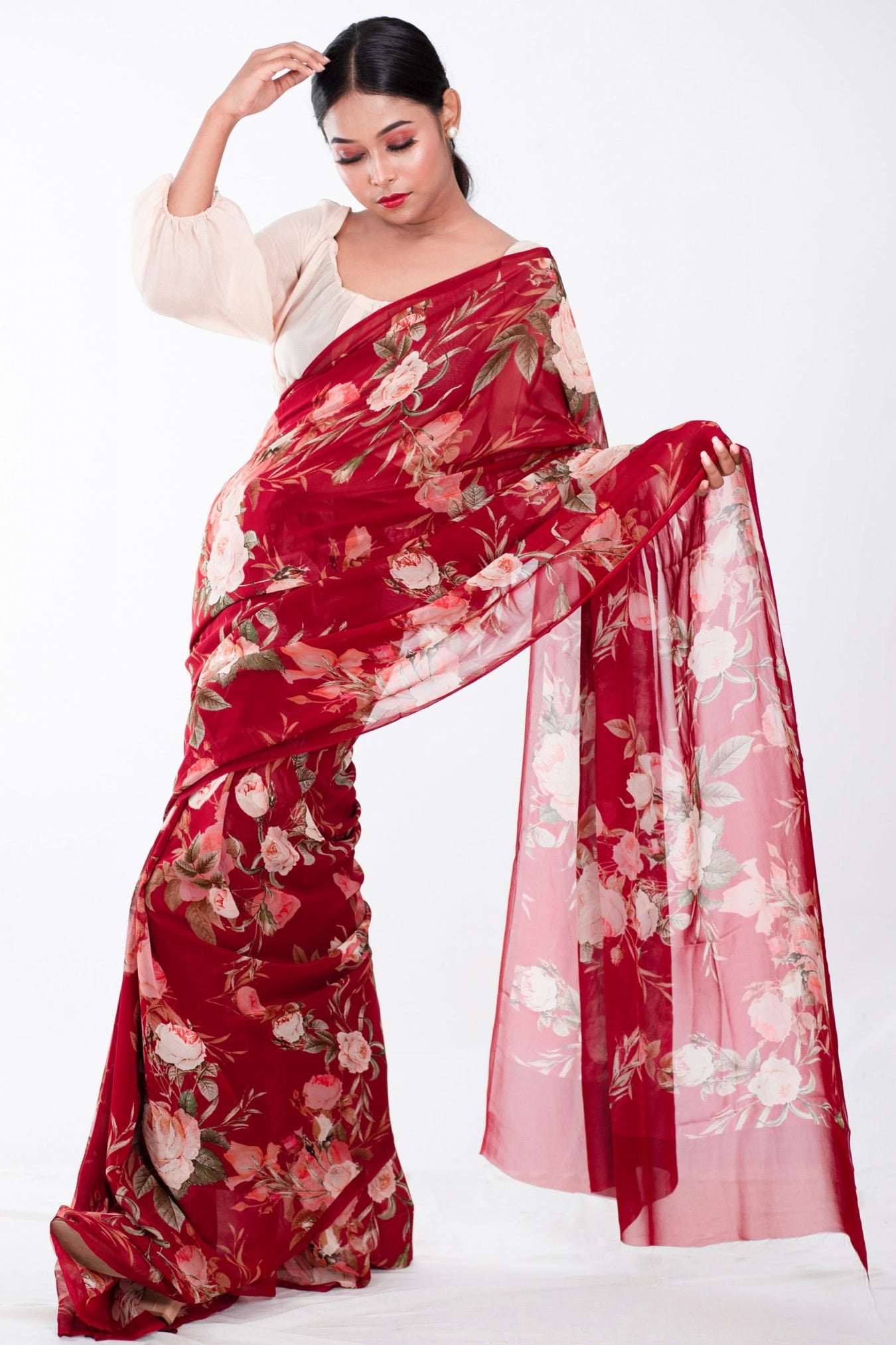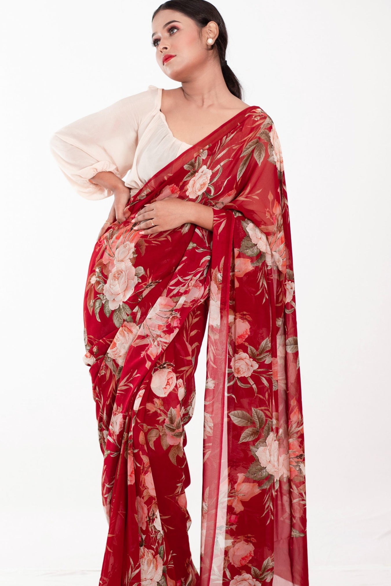 Size:Â S: 5.50Mtr B: 0.80MtrColour: RedFabric: GeorgettePattern and print: Ivory Roses printed all over maroon flowing Georgette saree draped fashionably making a serene, feminine, bold look, catching everyone's attention. The red rose color brings out a beauty to be flaunted. The piece makes the statement making it center of attraction.Care instructions:Â Dry wash